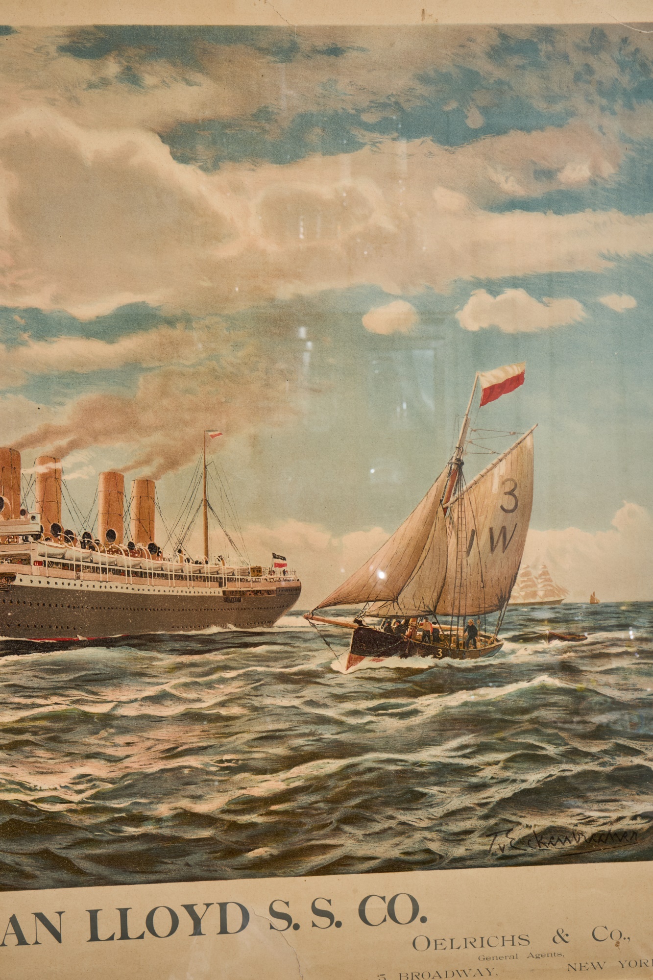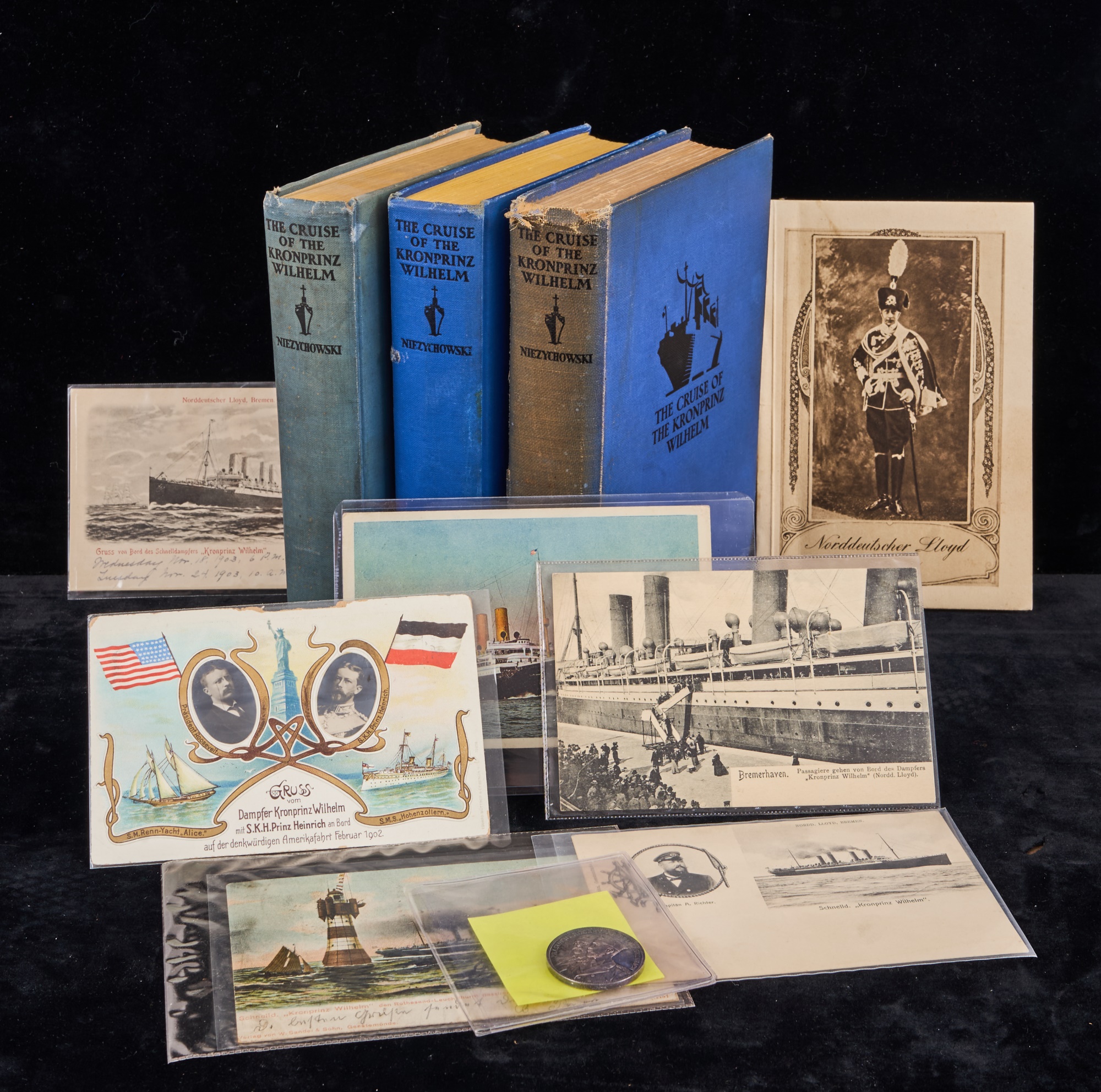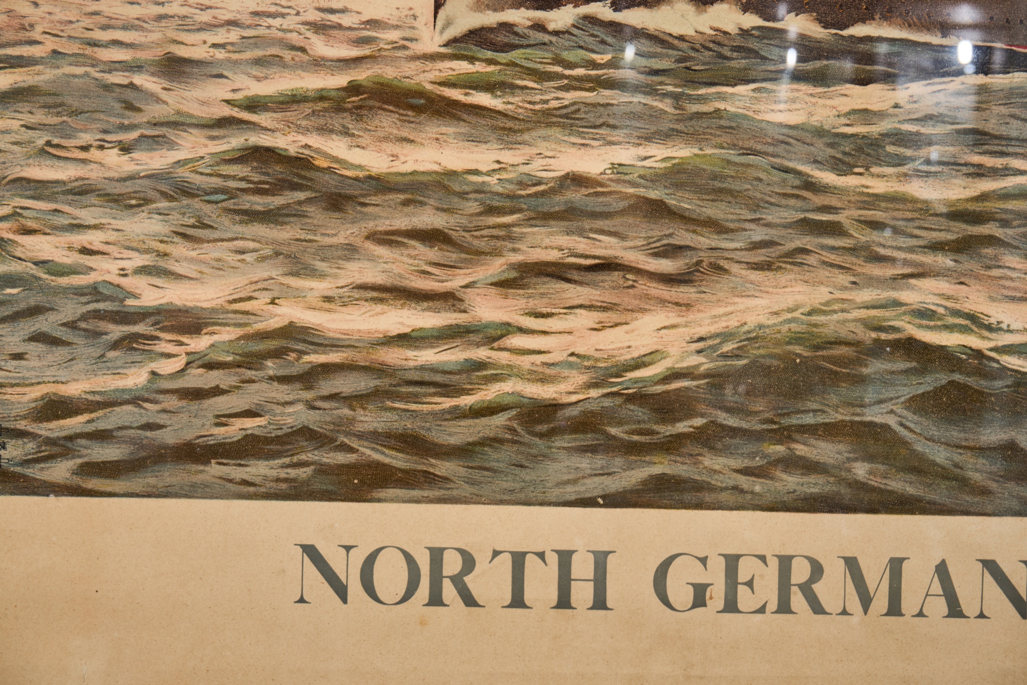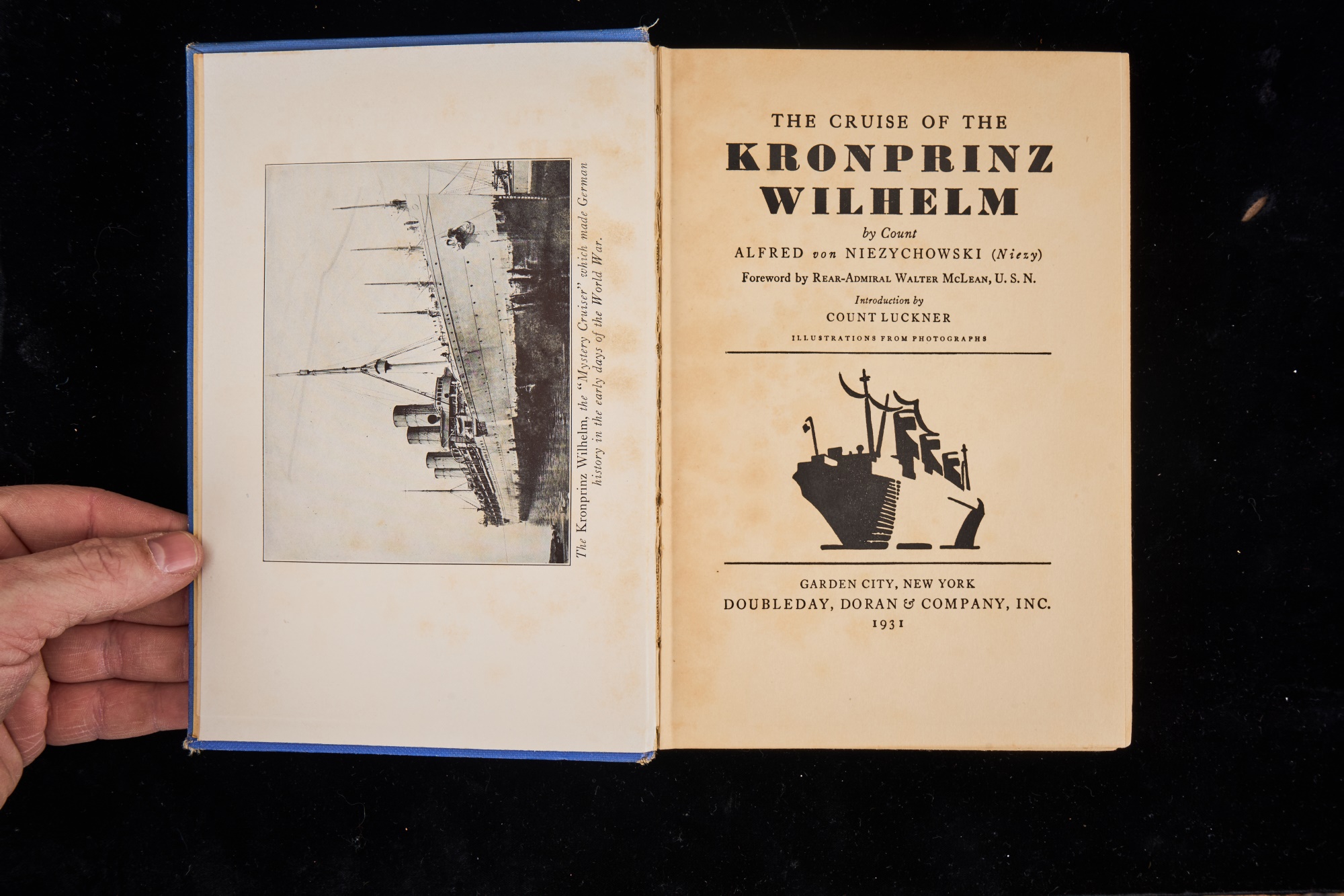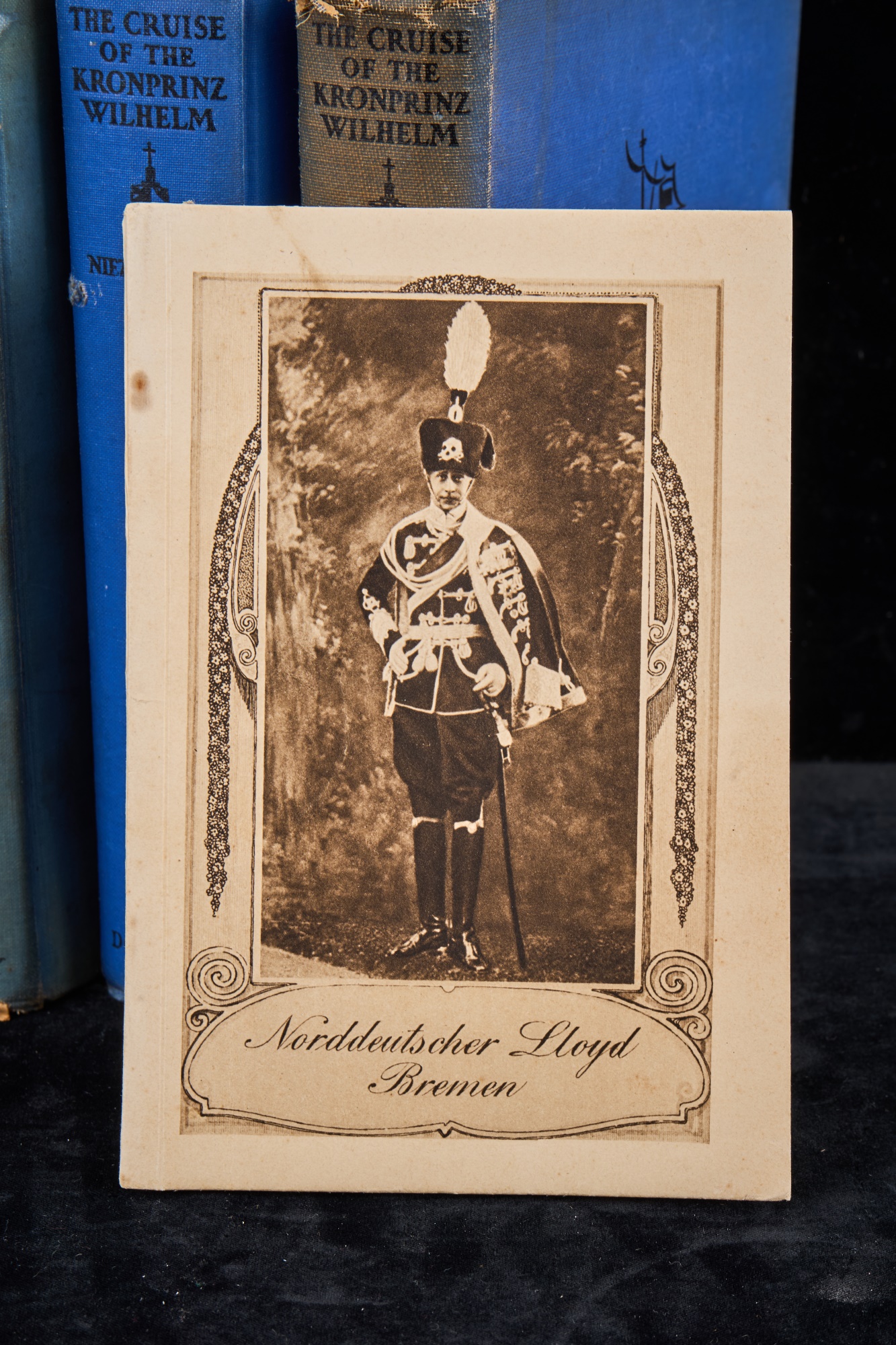 North German Lloyd Steam Ship Co. lithograph by Wilh Jontzen, Breman. 34 x 44 inches (overall including frame). Together with (3) Copies of The Cruise of the Kronprinz Wilhelm by Alfred von Niezychowski, Doubleday 1929 hardcover clothbound.