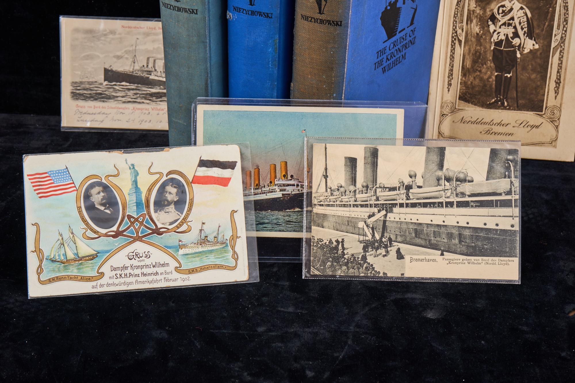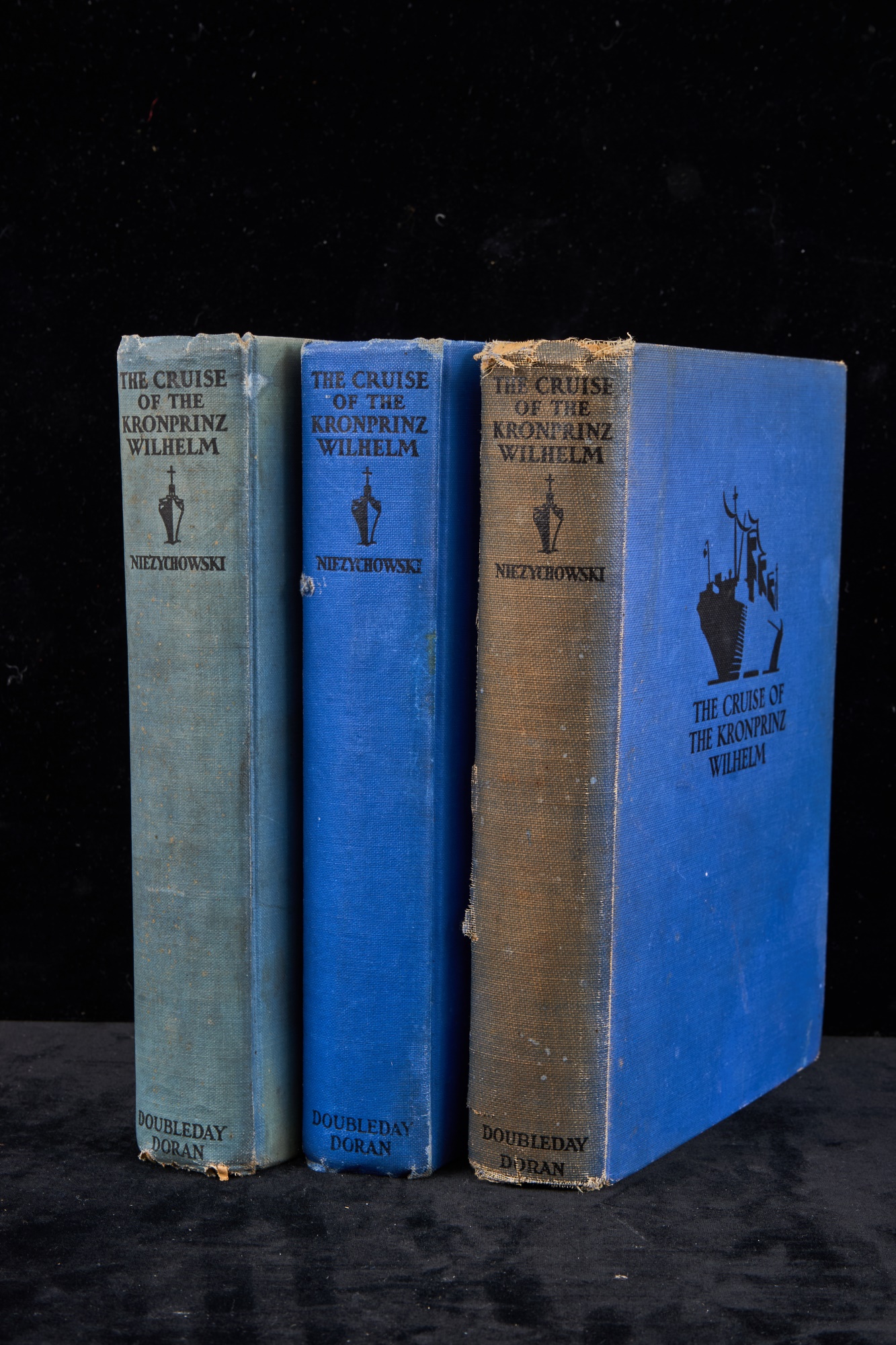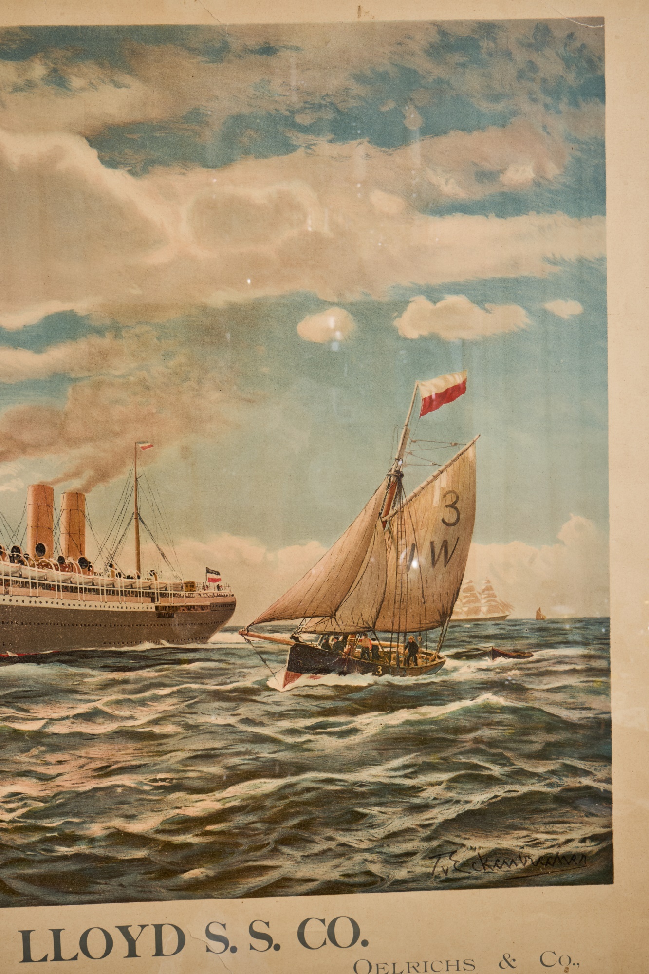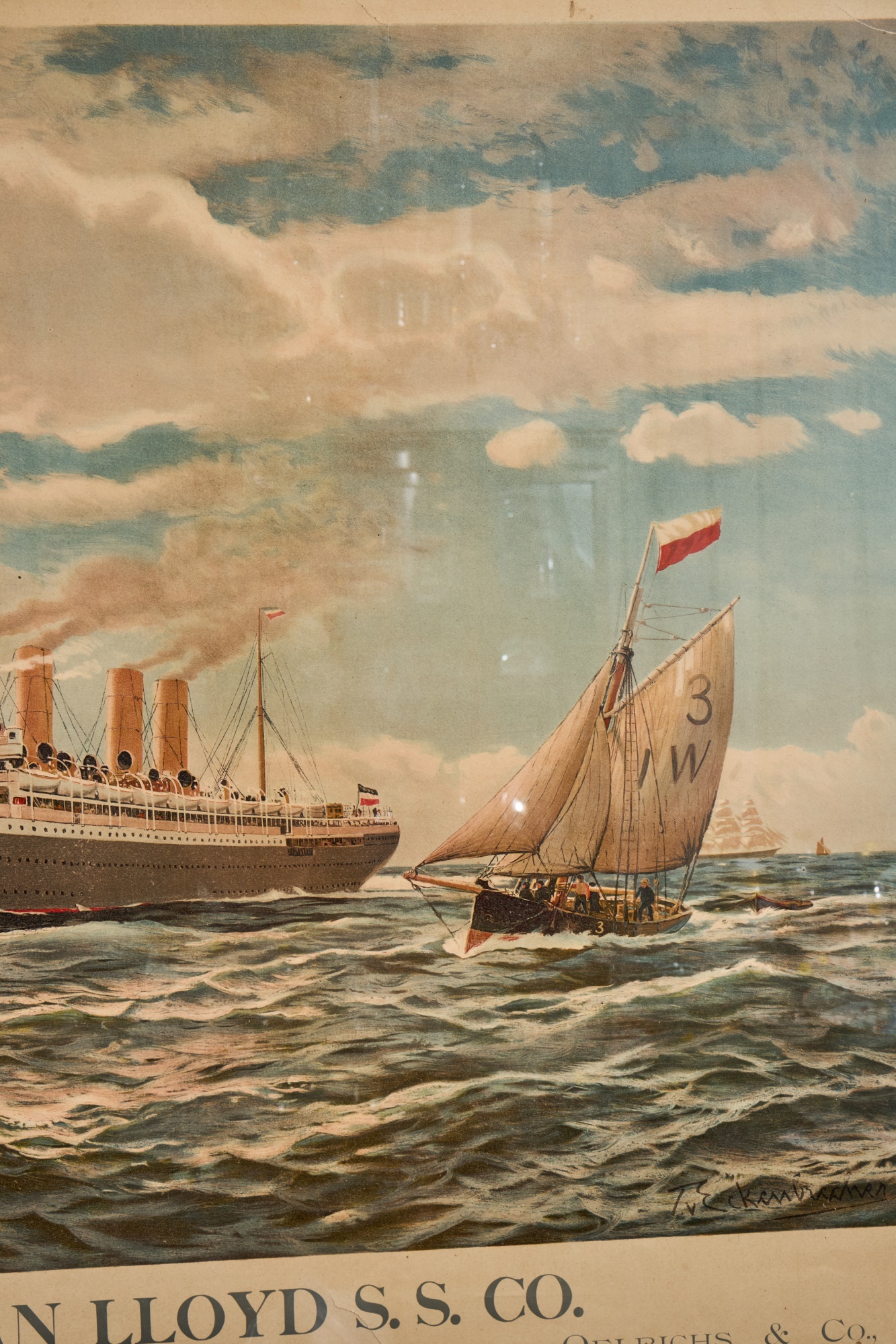 North German Lloyd Steam Ship Co. lithograph by Wilh Jontzen, Breman. 34 x 44 inches (overall including frame). Together with (3) Copies of The Cruise of the Kronprinz Wilhelm by Alfred von Niezychowski, Doubleday 1929 hardcover clothbound.