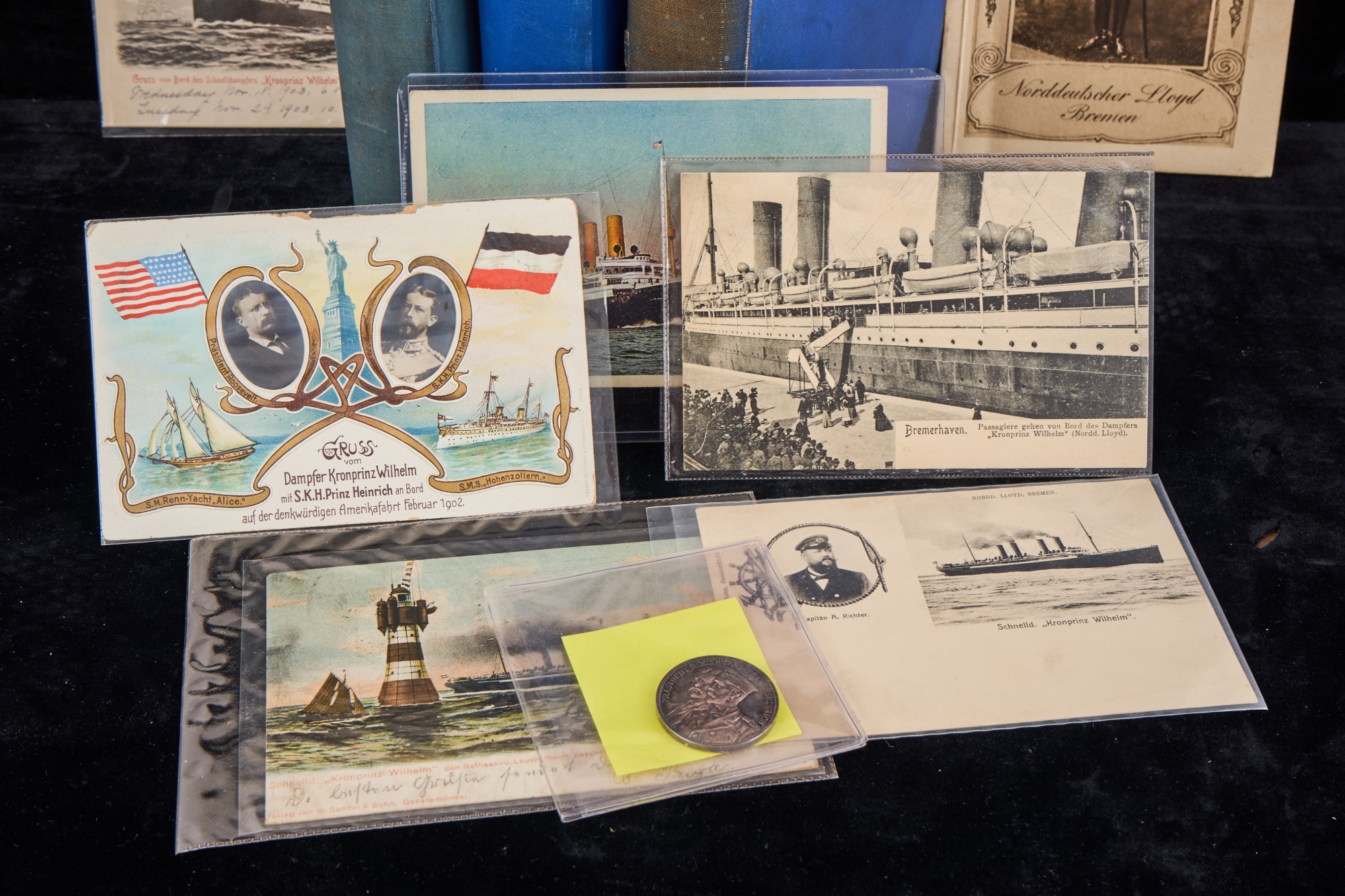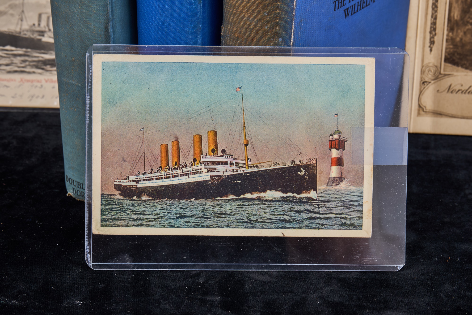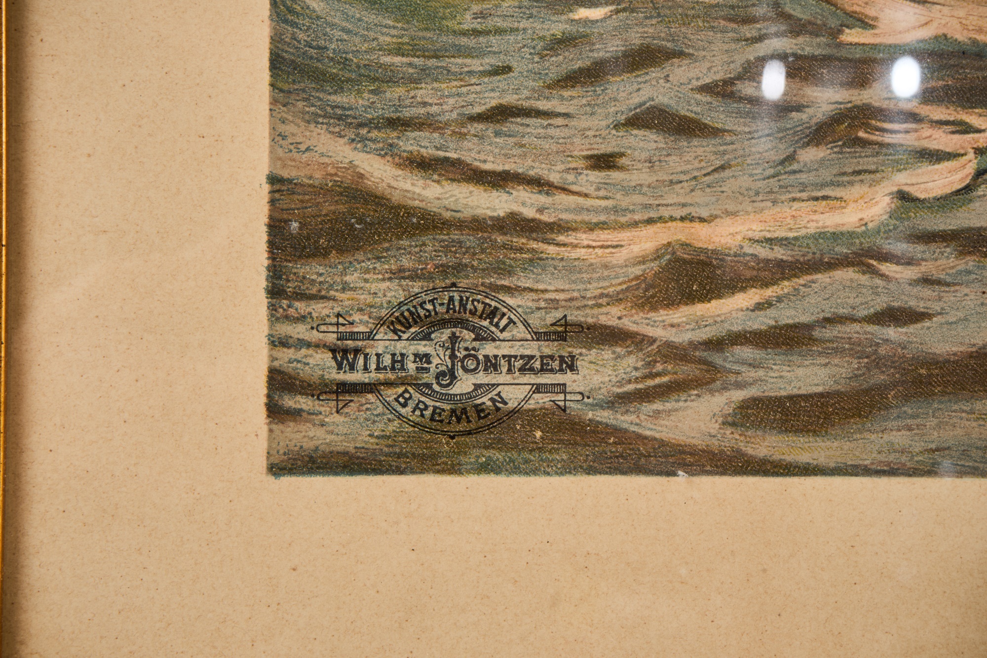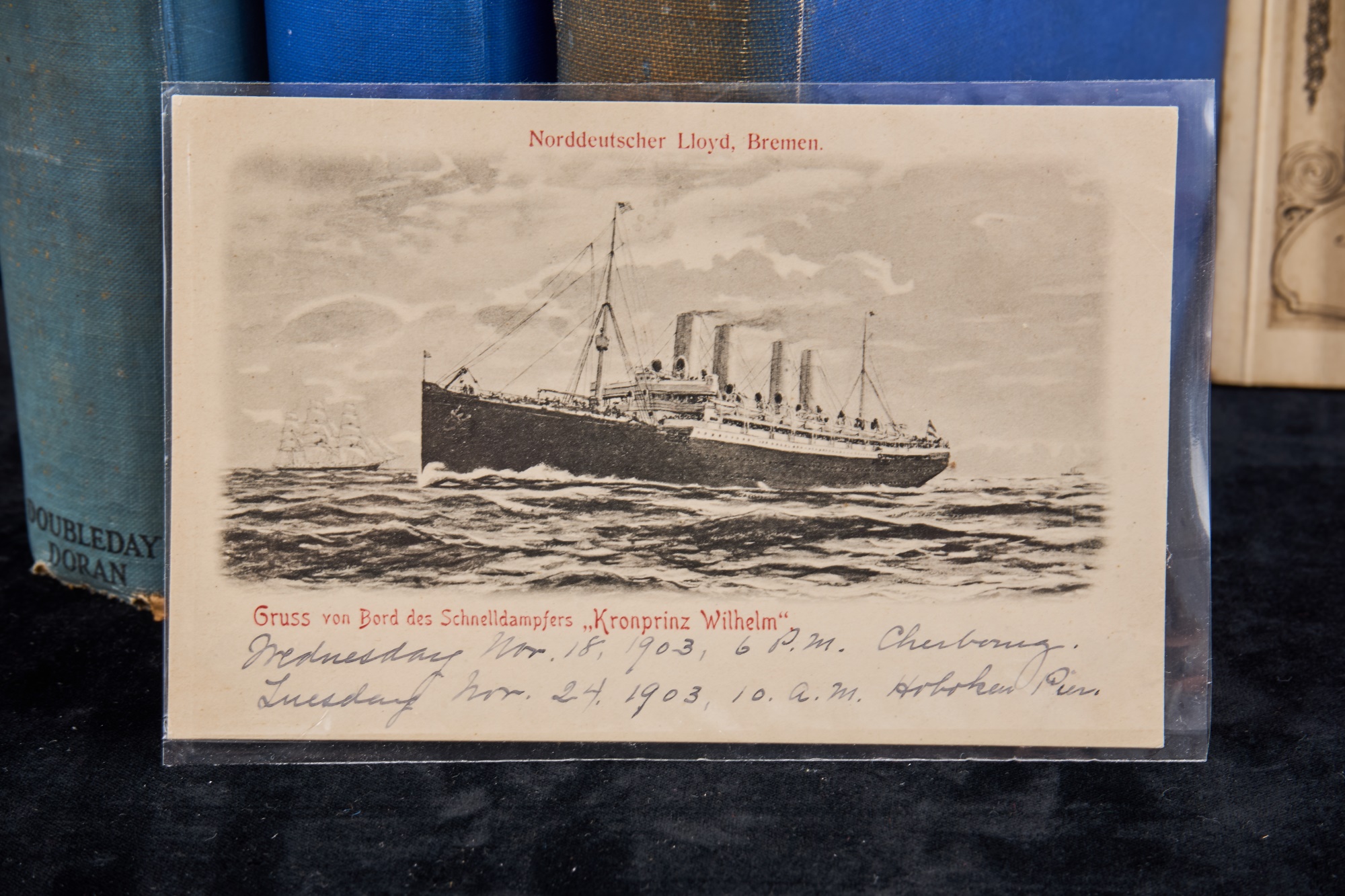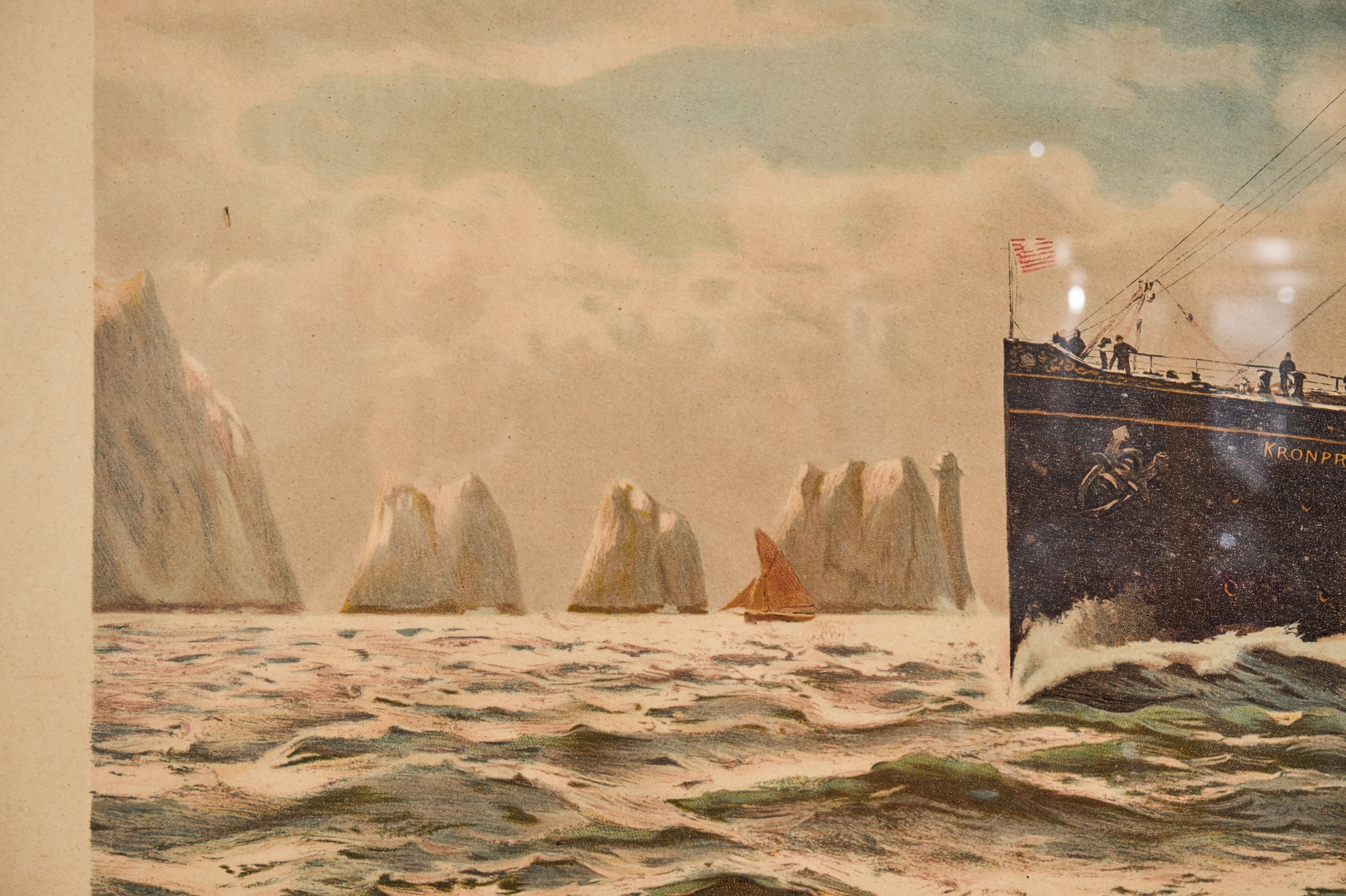 North German Lloyd Steam Ship Co. lithograph by Wilh Jontzen, Breman. 34 x 44 inches (overall including frame). Together with (3) Copies of The Cruise of the Kronprinz Wilhelm by Alfred von Niezychowski, Doubleday 1929 hardcover clothbound.
