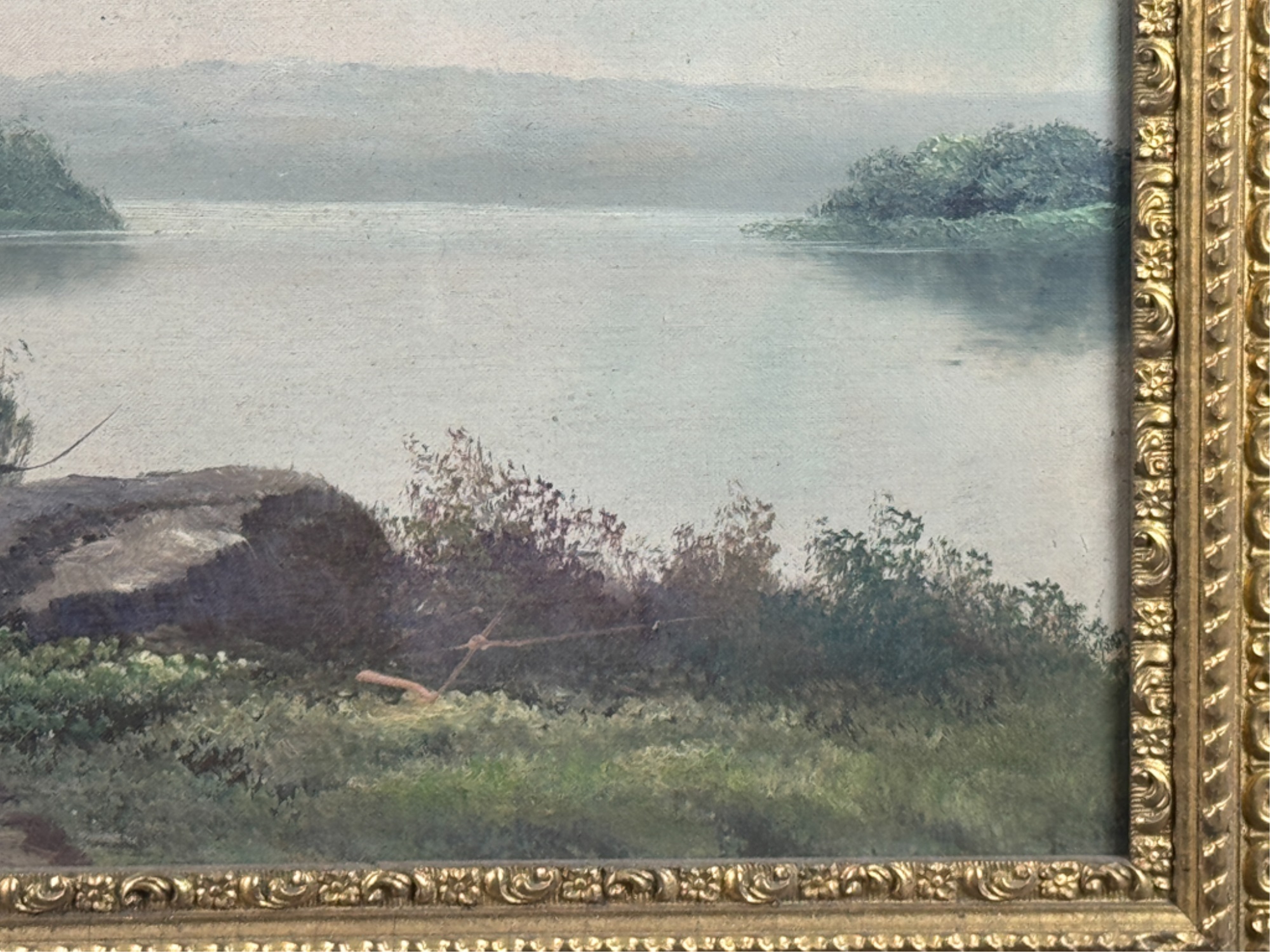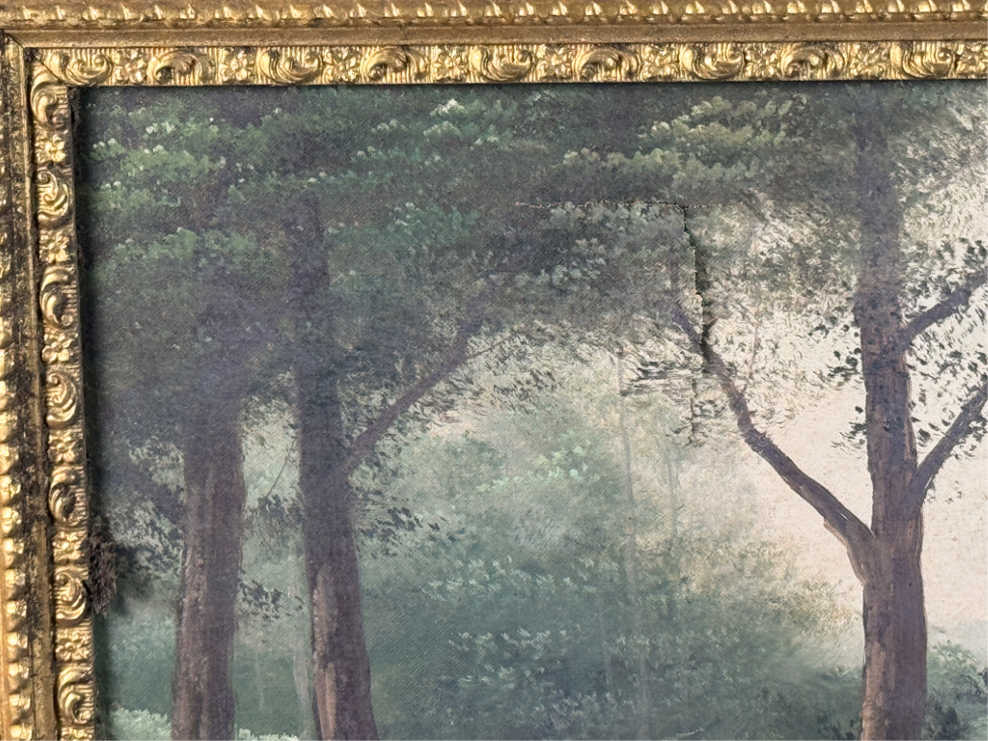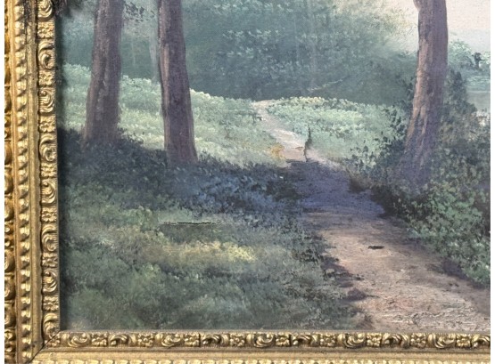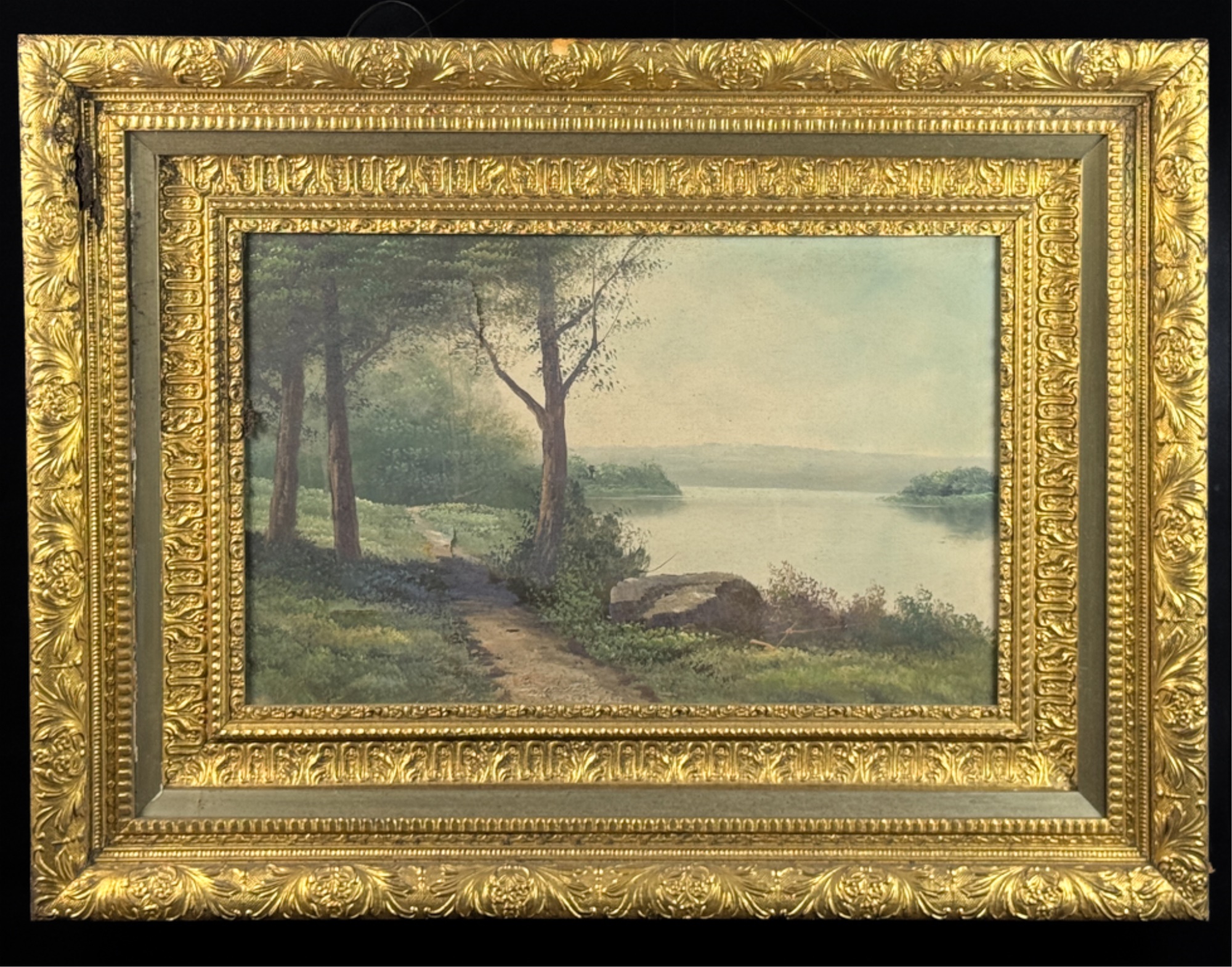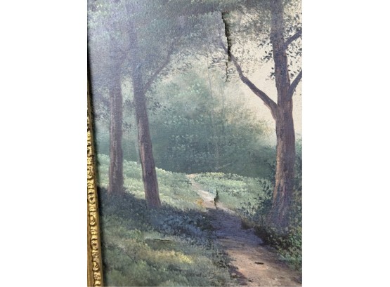 Early 20th Century scene and frame. 24 3/4 x 33 inches. Condition: Punctures to canvas. Minor losses to frame. See photos.