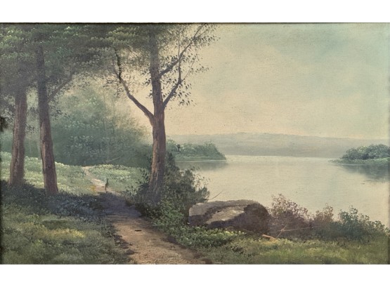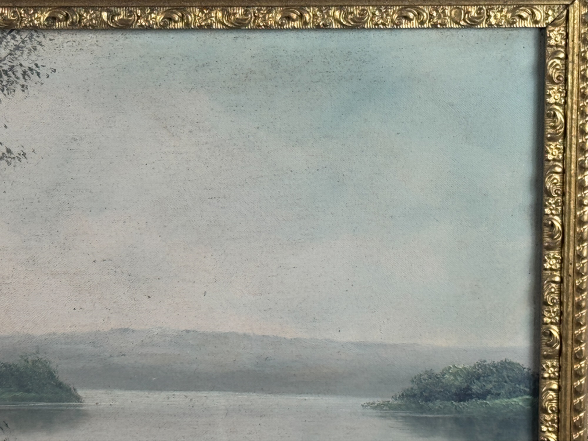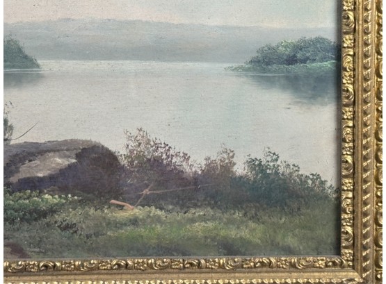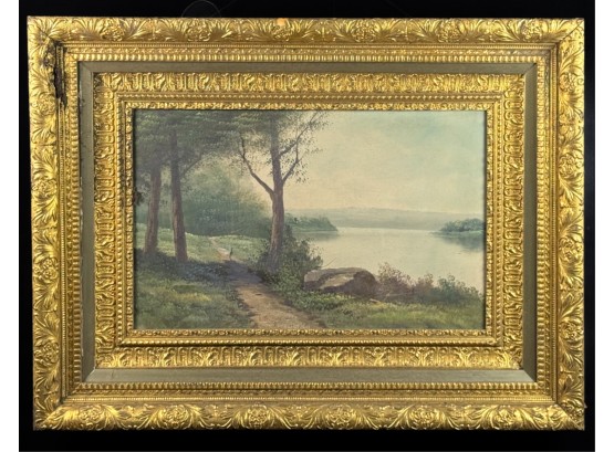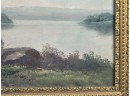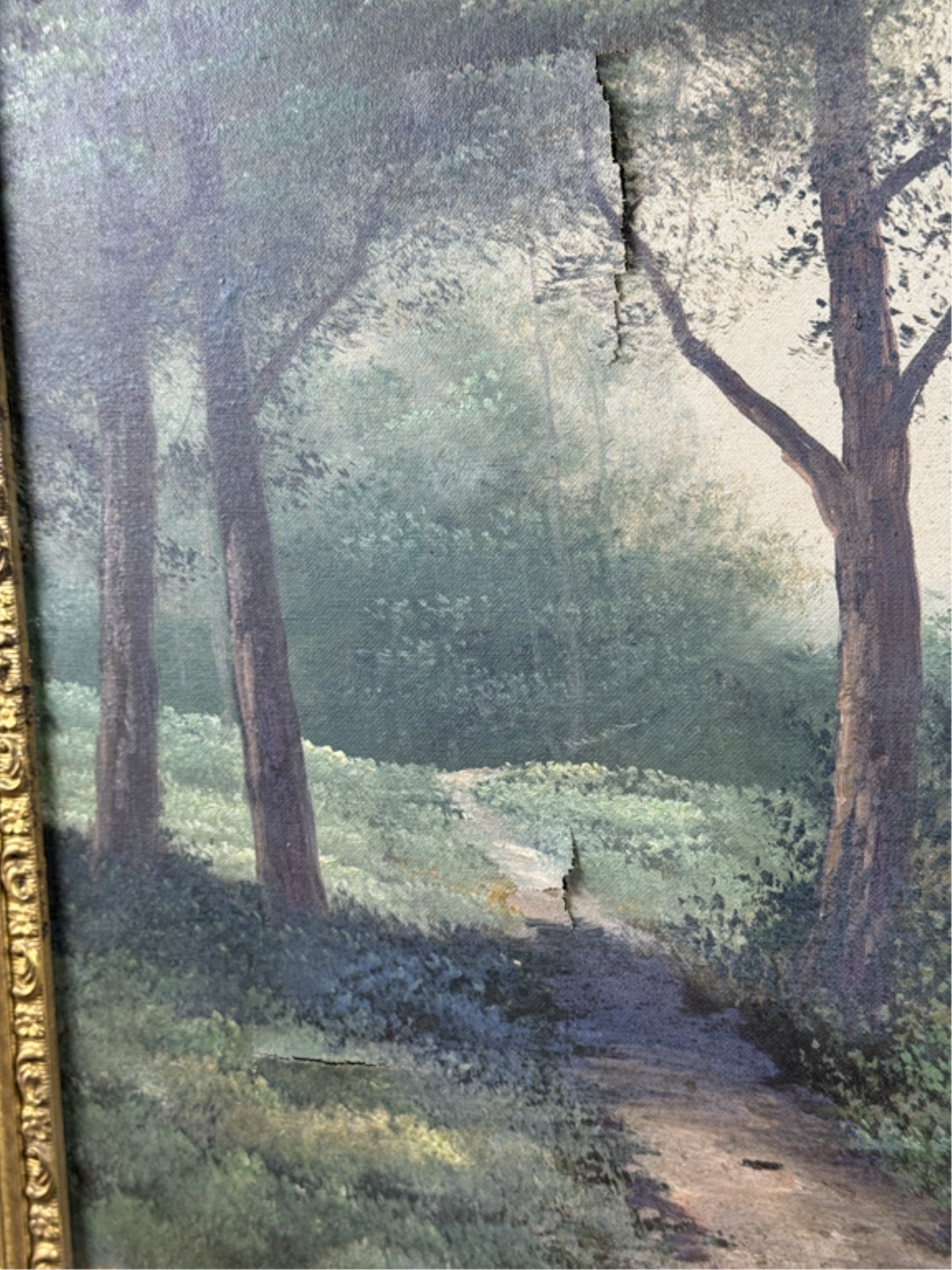 Early 20th Century scene and frame. 24 3/4 x 33 inches. Condition: Punctures to canvas. Minor losses to frame. See photos.
