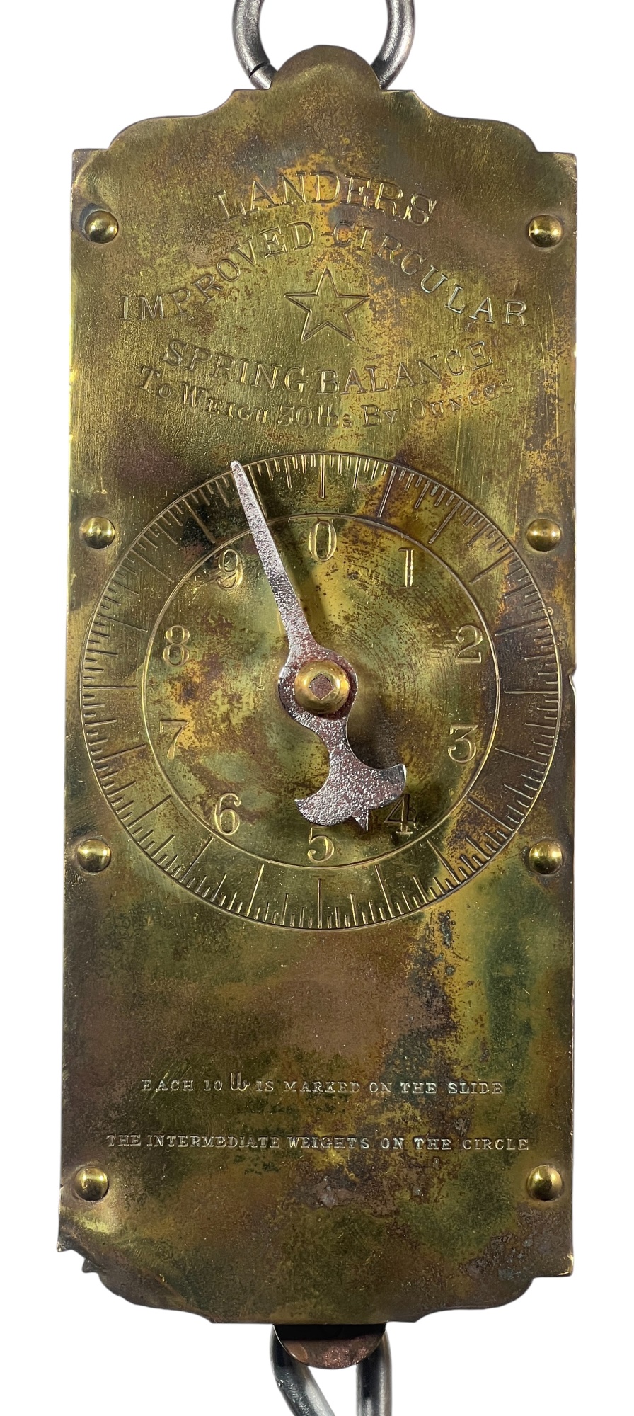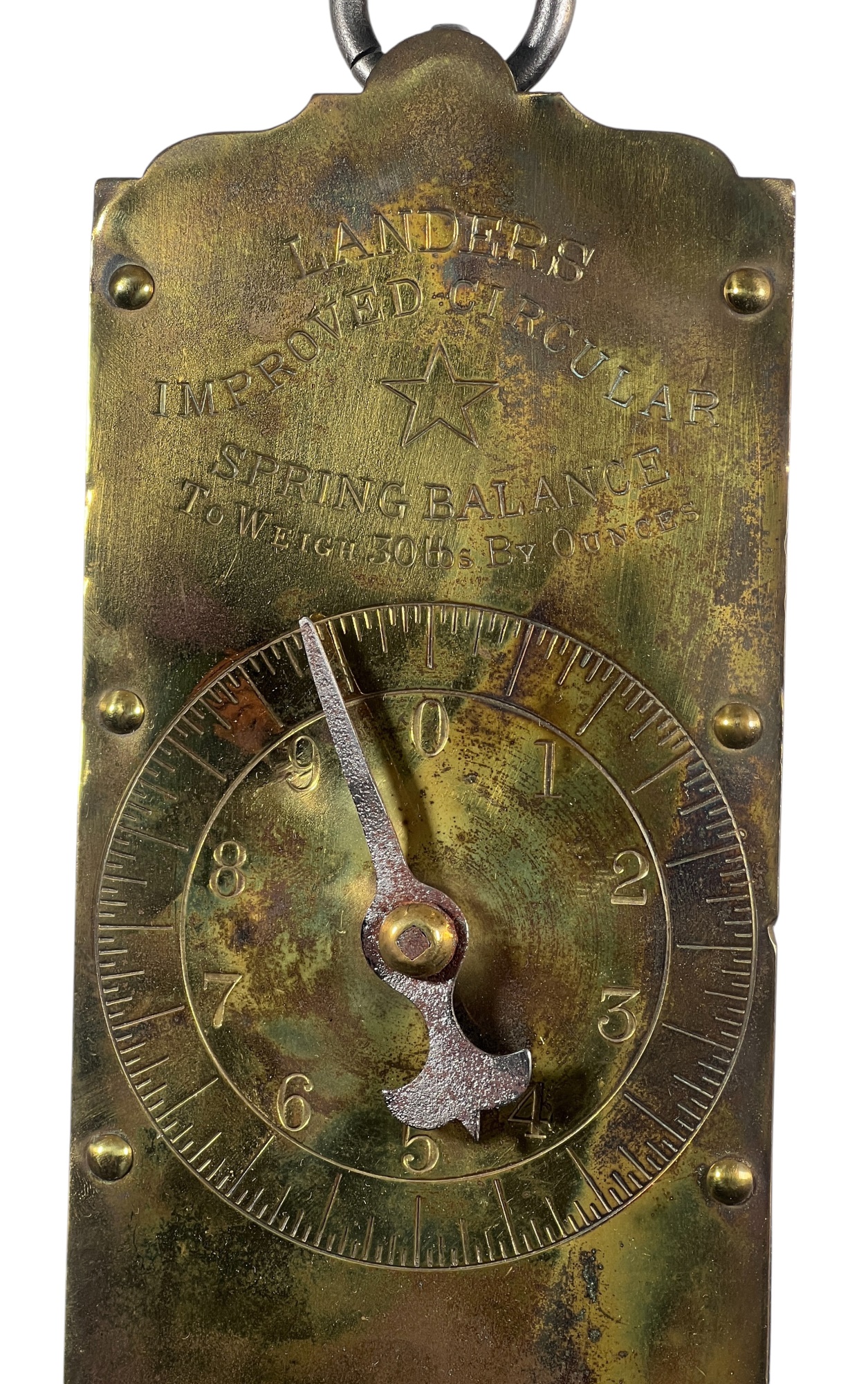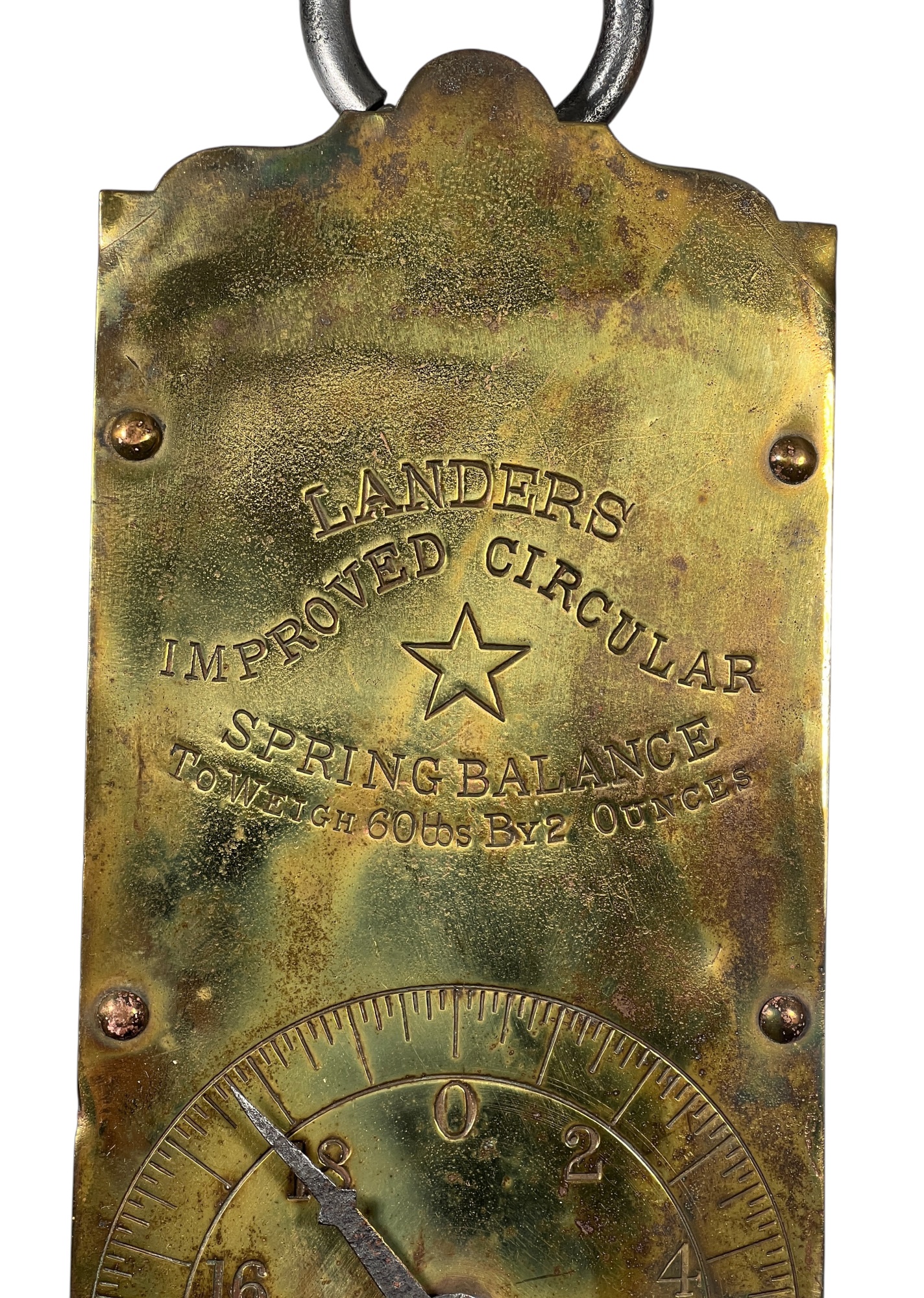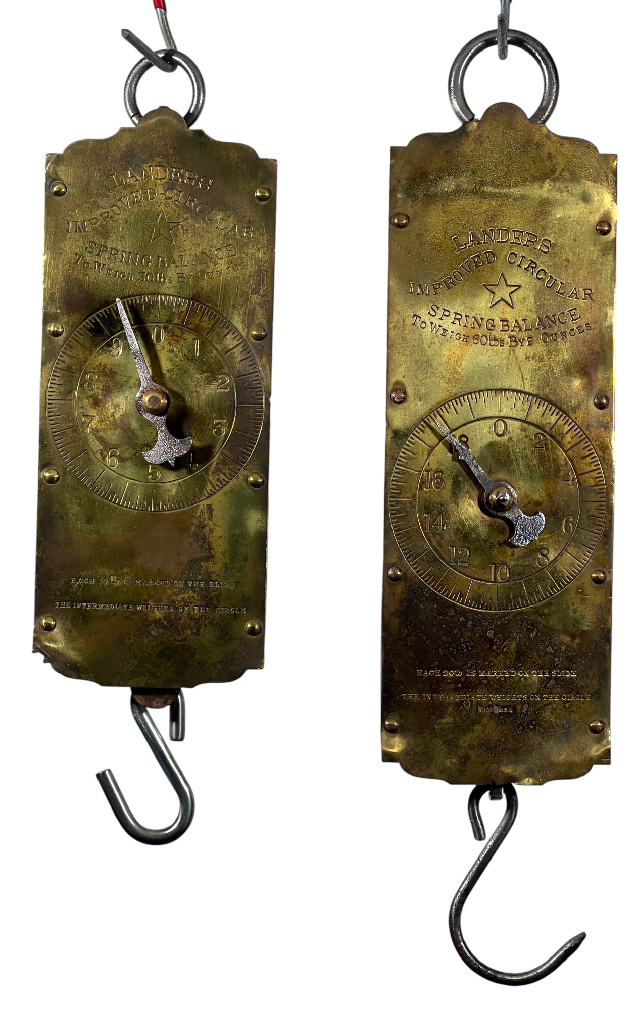 Lander's brass & iron spring scales, (30) and (60) pound examples. 17 x 4 1/4 inches. Condition: Good. Temp No 8815