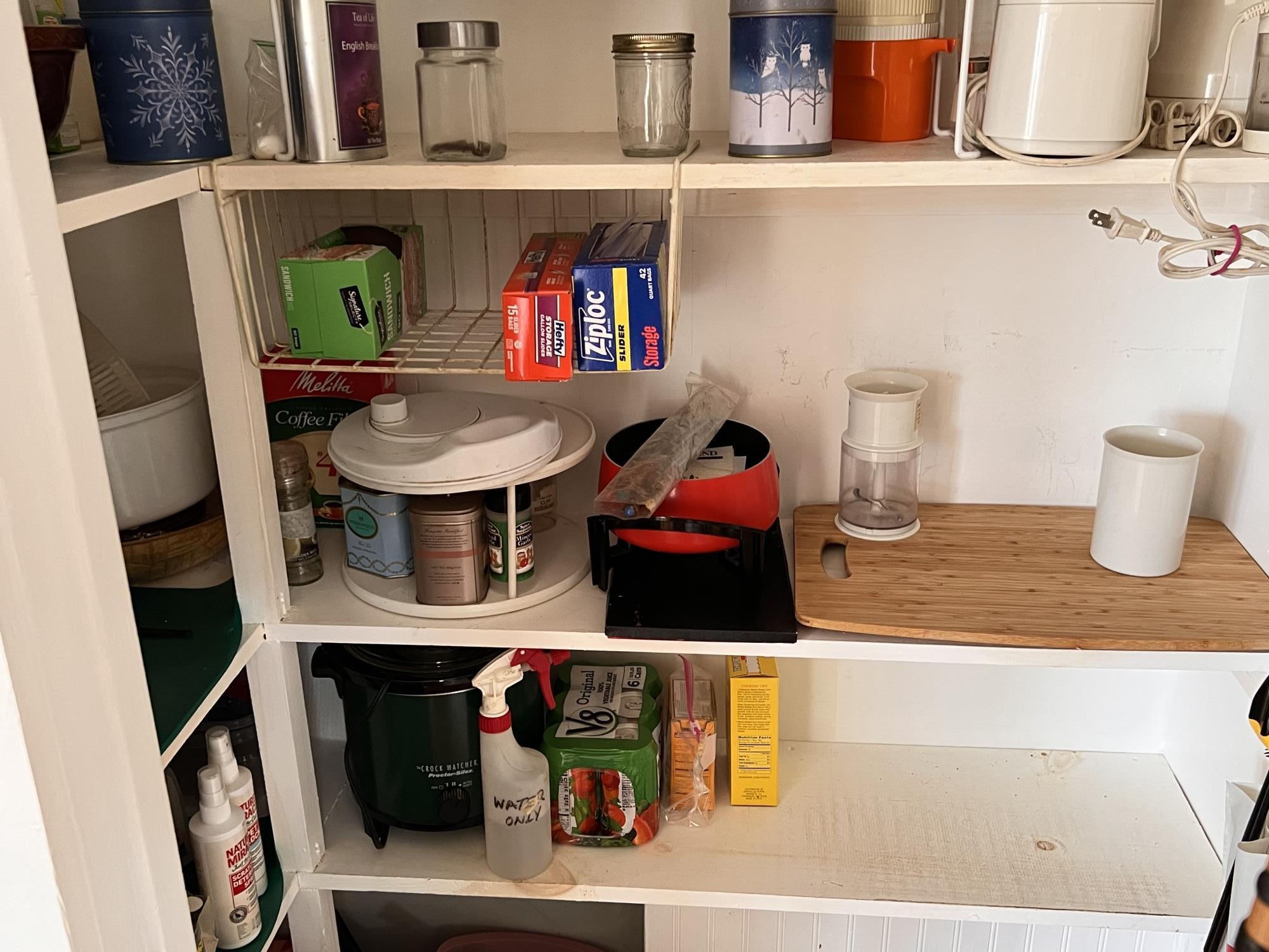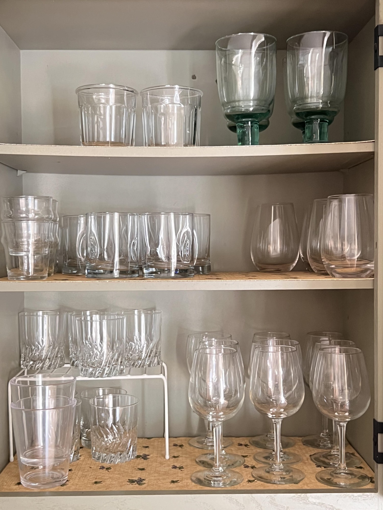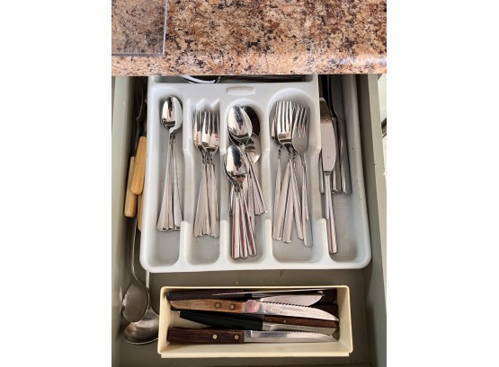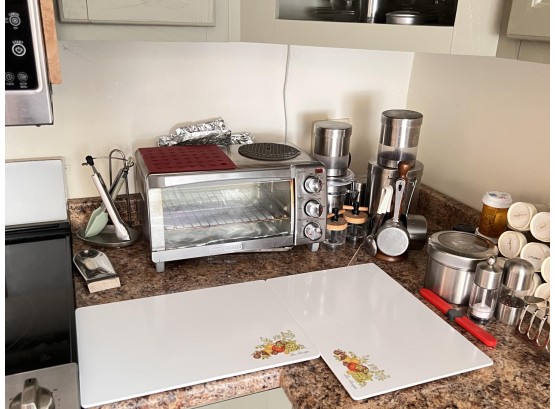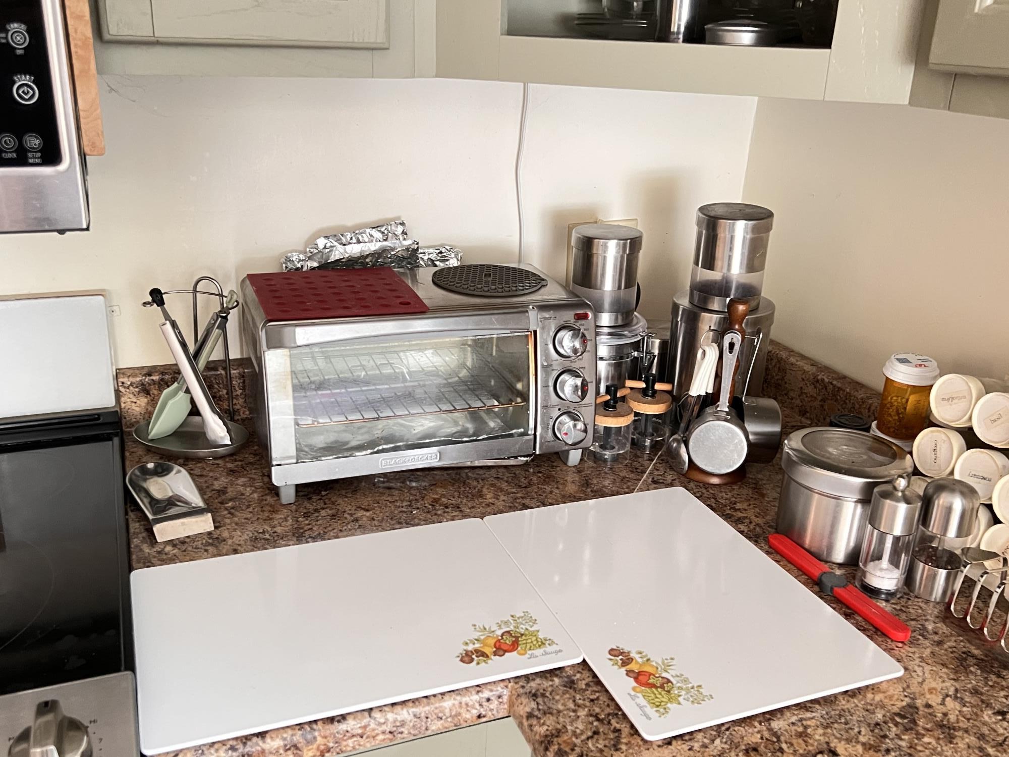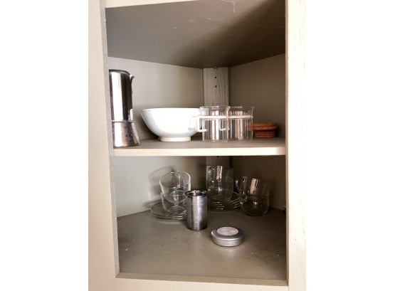 includes glassware, silverware, kitchenalia, toaster oven, pots, pans, pottery, wooden cutting boards and other useful kitchen items