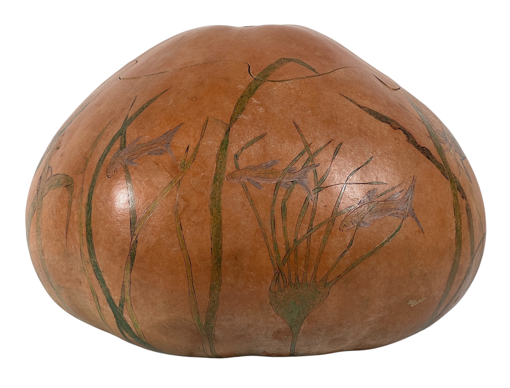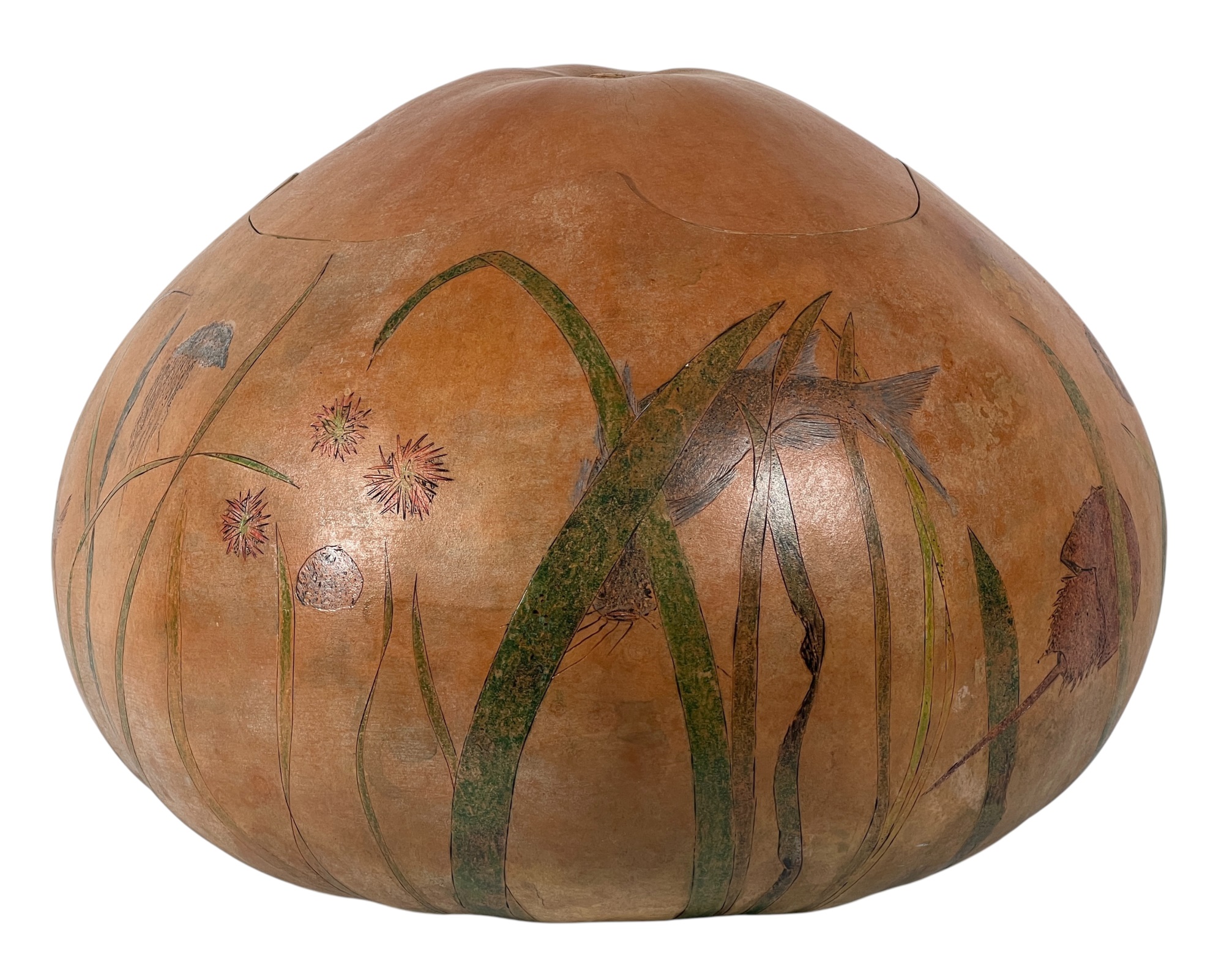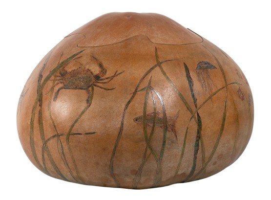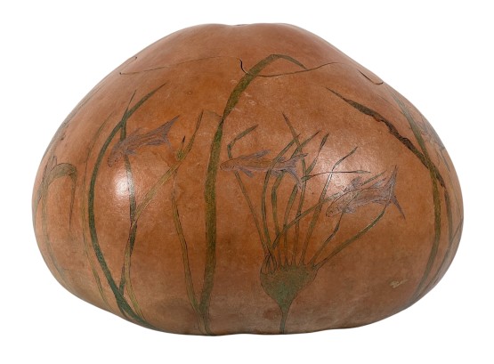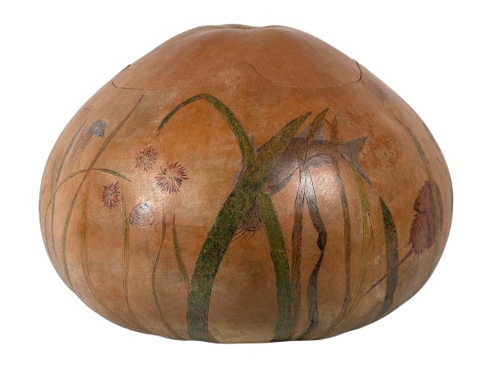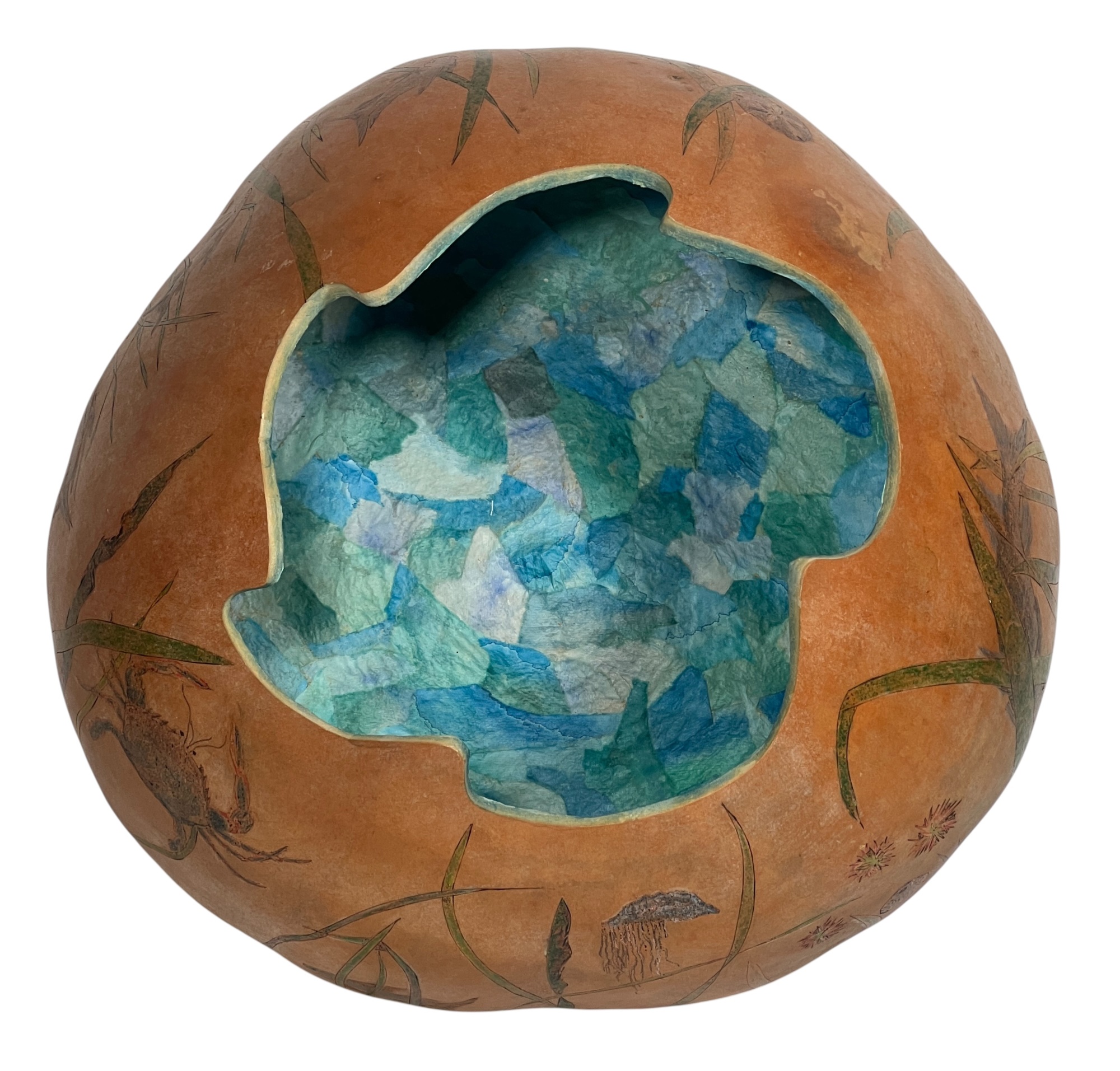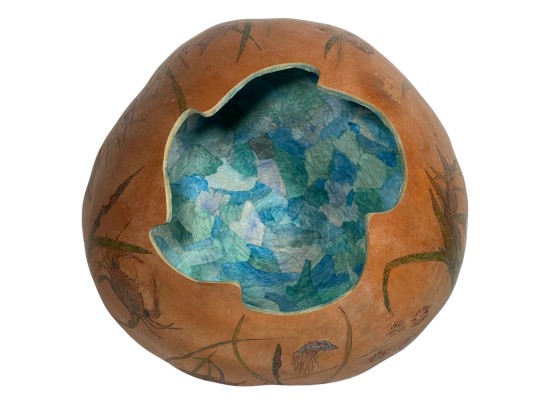 Dried & hollowed gourd paint decorated with tidal sea life, decoupage interior, signed & dated under base by Melbourne, FL artist Laura Barr. 10 x 13 inches. Condition: Some water damage to base. Please see photos.