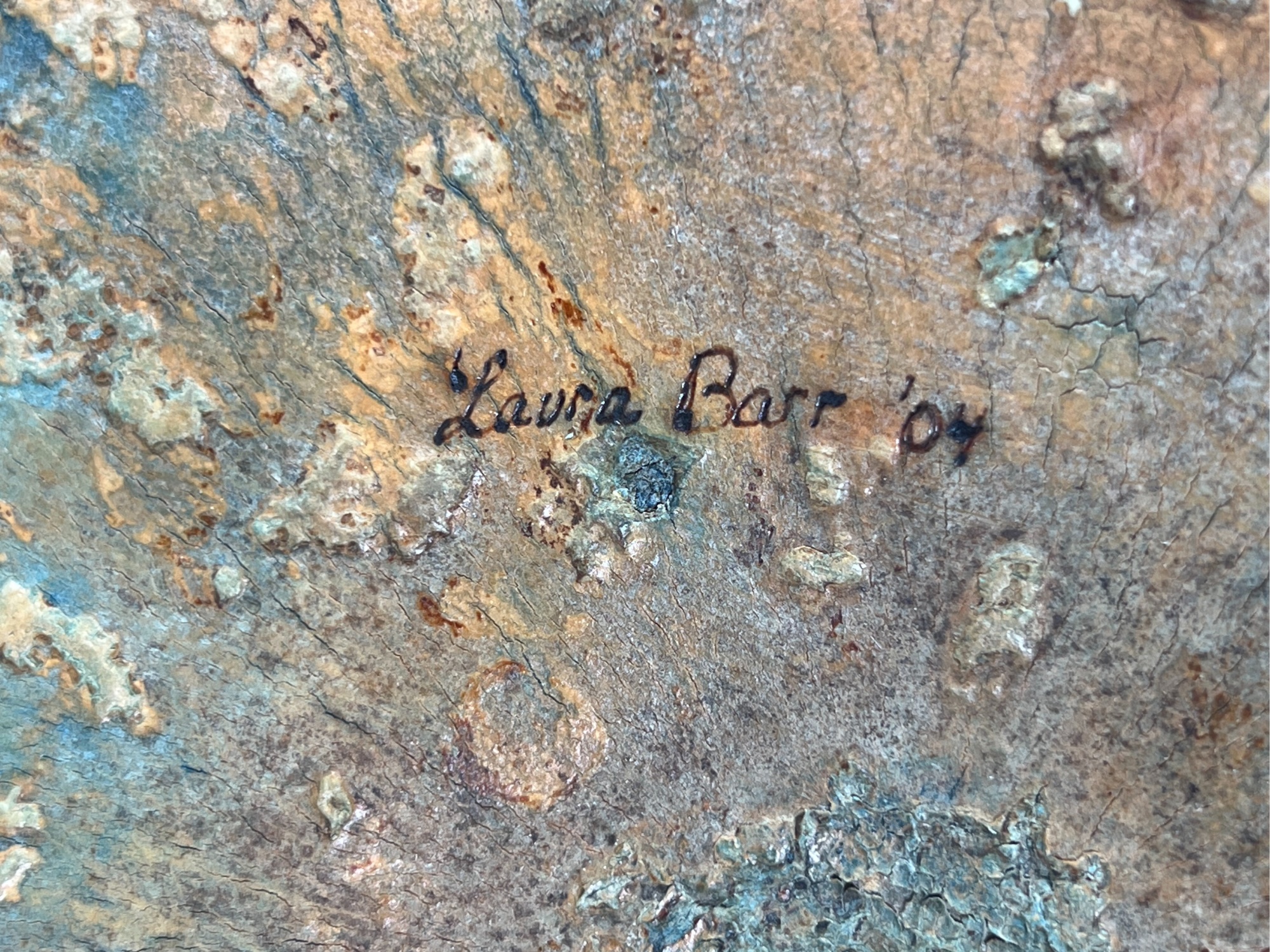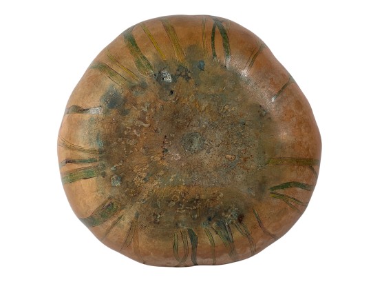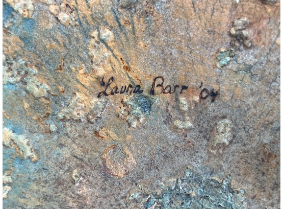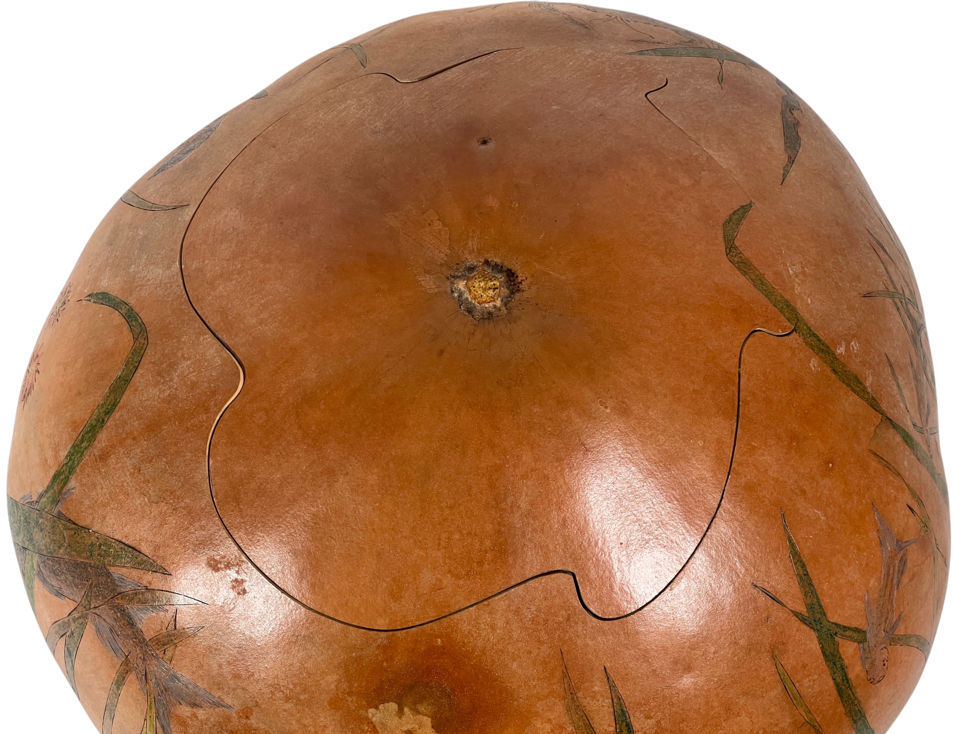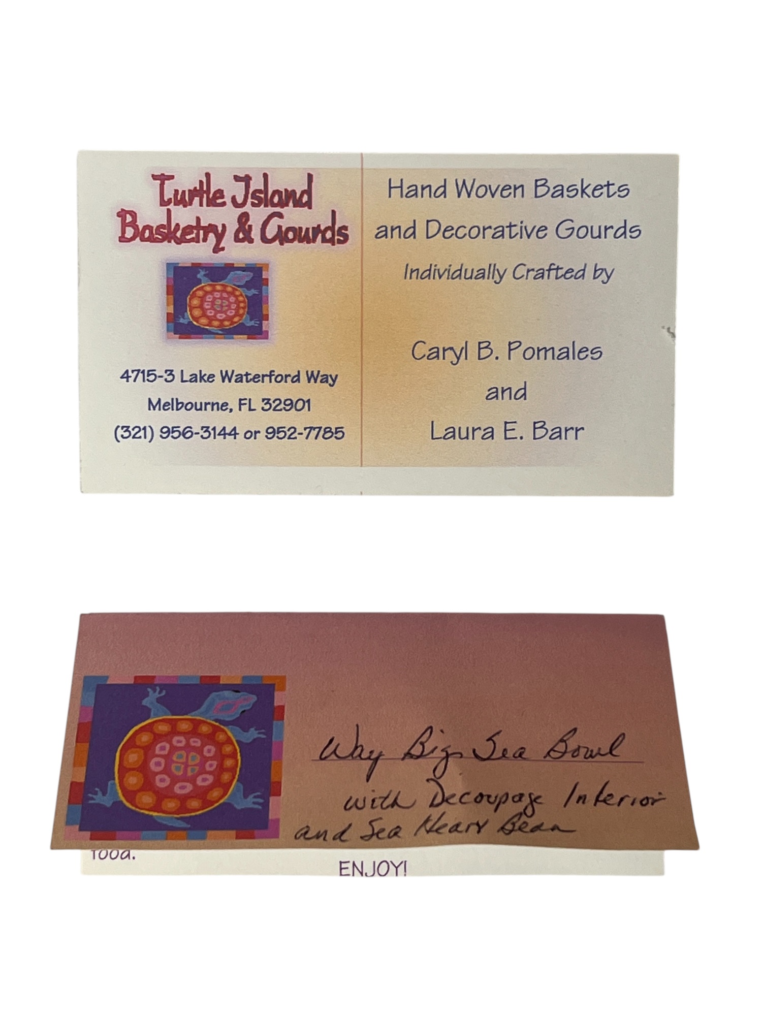 Dried & hollowed gourd paint decorated with tidal sea life, decoupage interior, signed & dated under base by Melbourne, FL artist Laura Barr. 10 x 13 inches. Condition: Some water damage to base. Please see photos.