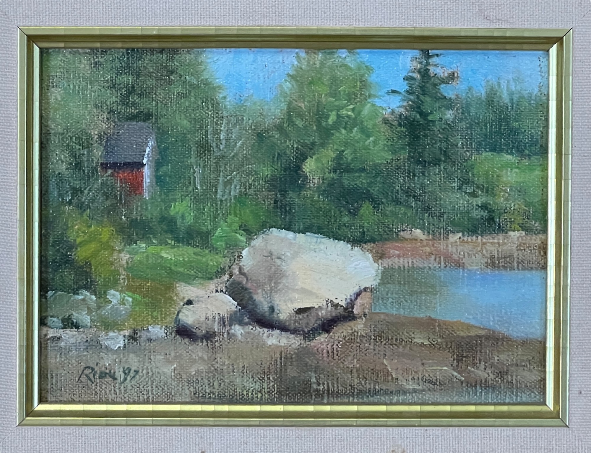 Oil on artist board. Signed front and reverse, dated 1997. 9 1/2" x 11 1/2" framed