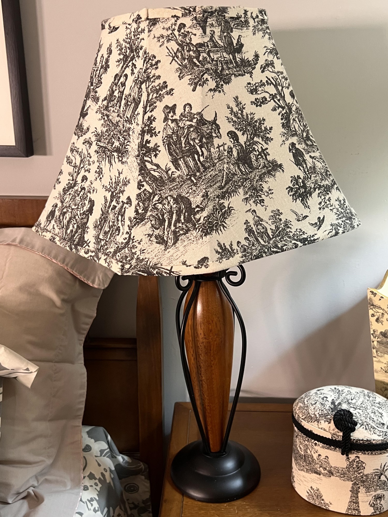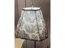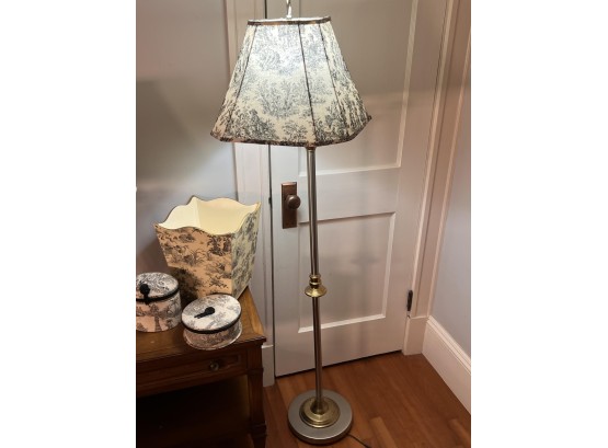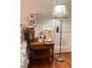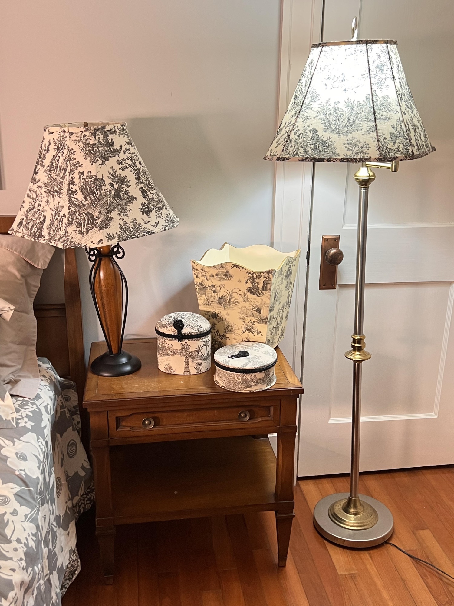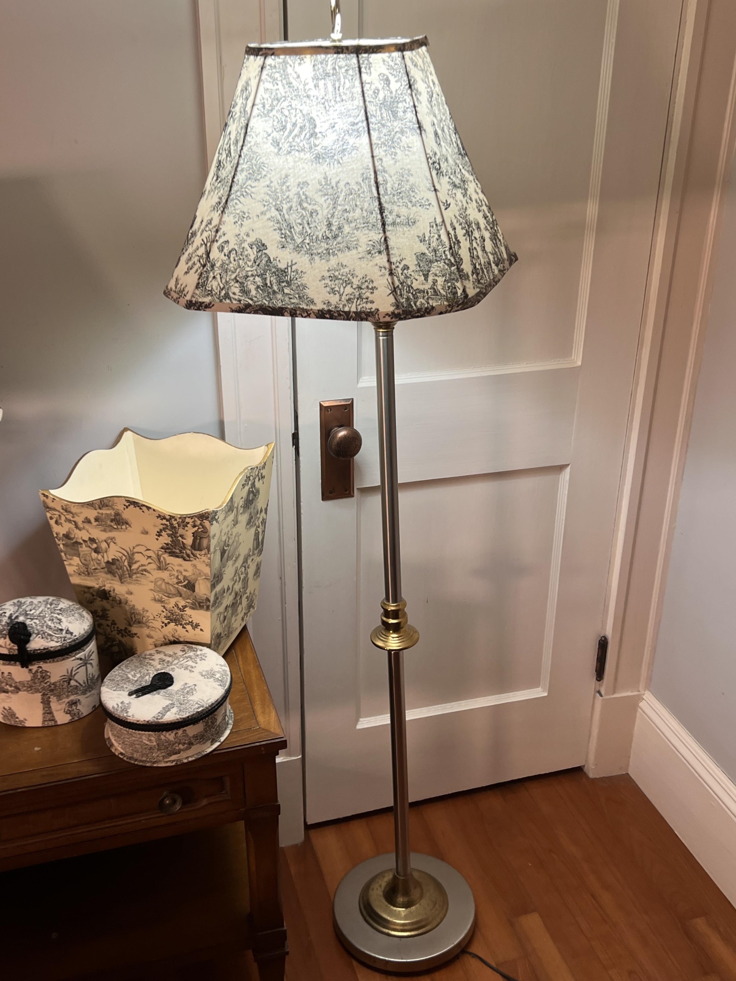 Including floor lamp, basket, (2) covered boxes and 2 valances. Tallest lamp 58 inches Condition: Good used condition