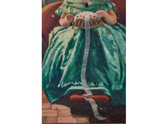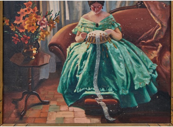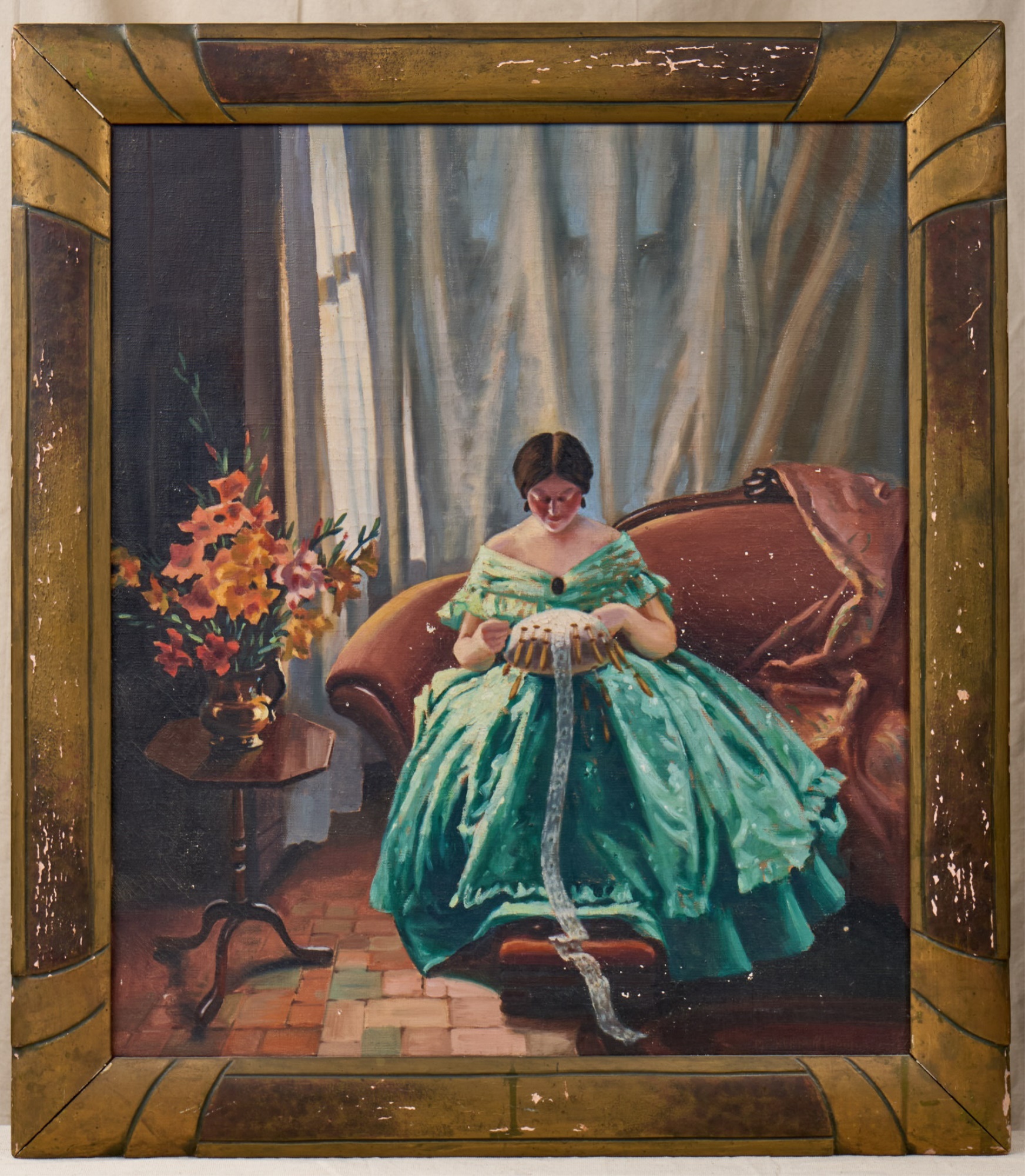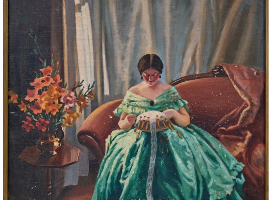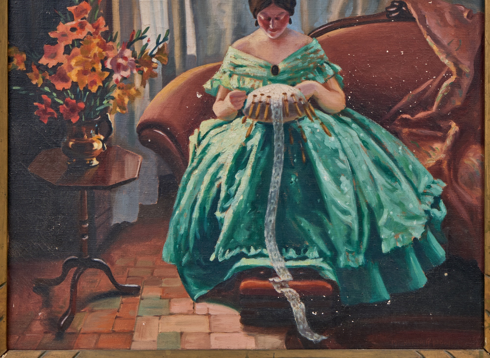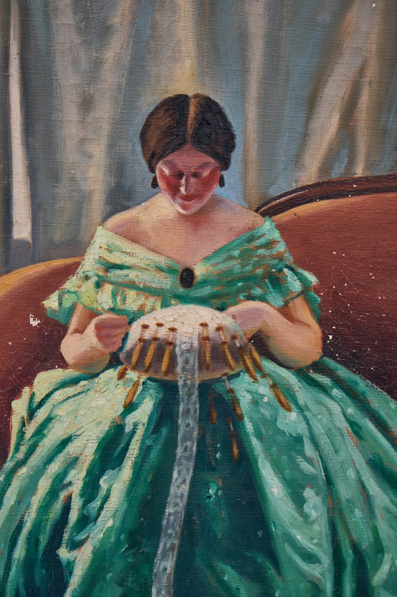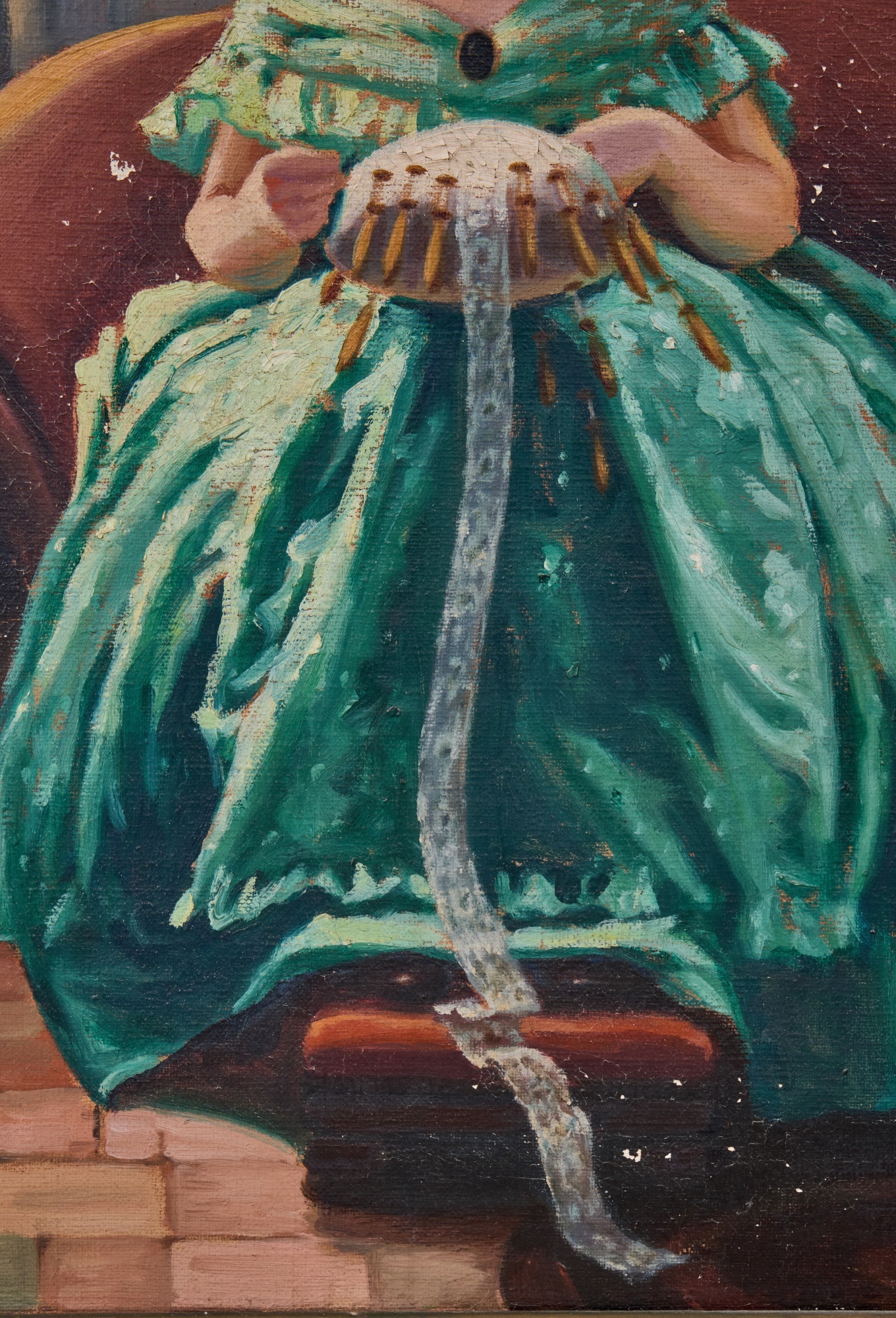 Lace Making for a Christening Gown. oil on canvas 28 x 24 inches. signed. frame 33 1/2 x 29 1/2 inches (overall) N.B. This work was commissioned in the 1930s by Josiah Tufts. The subject Ellen Tufts is making lace for her first child's gown.