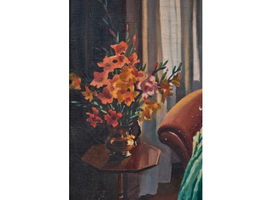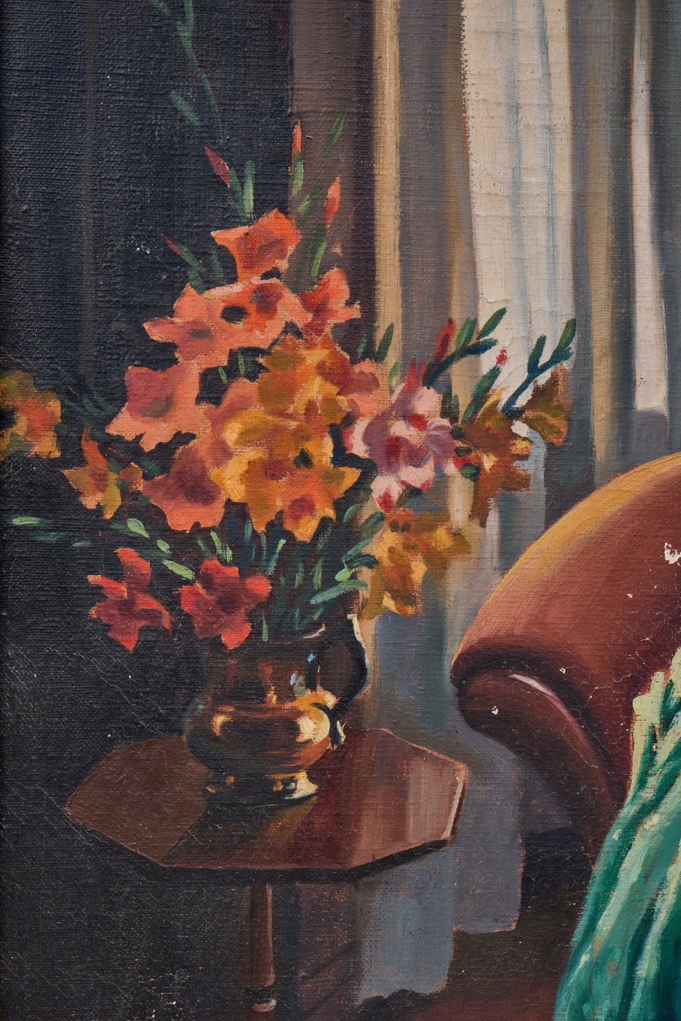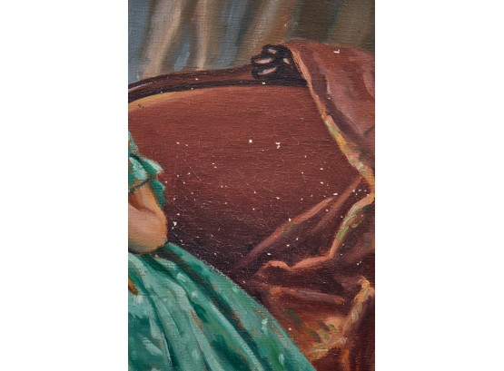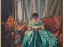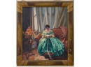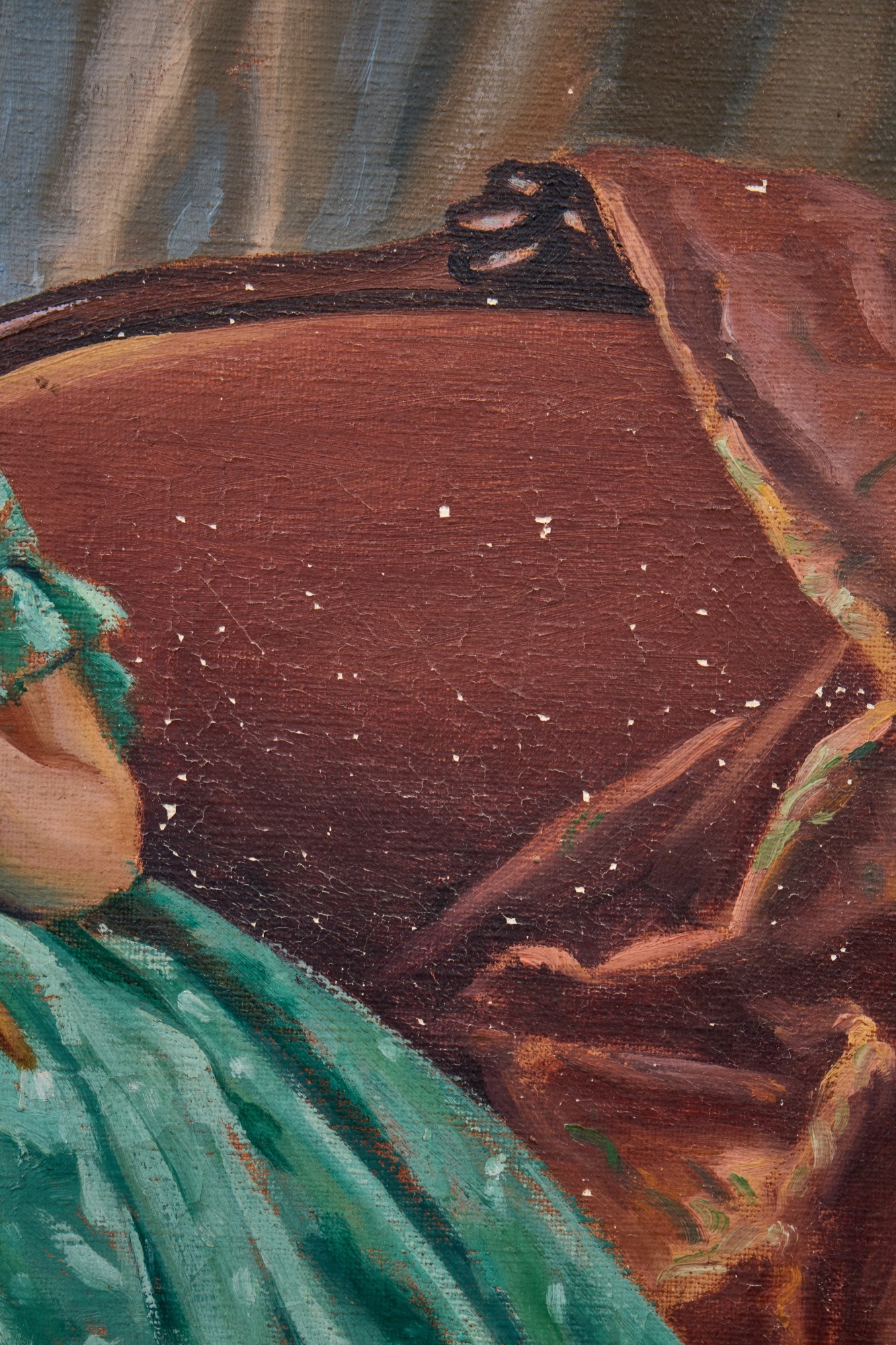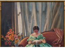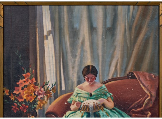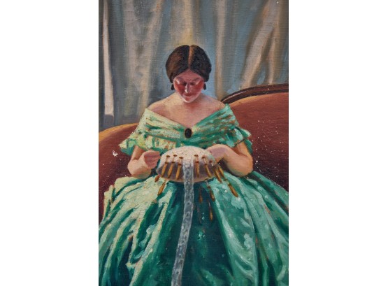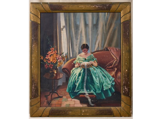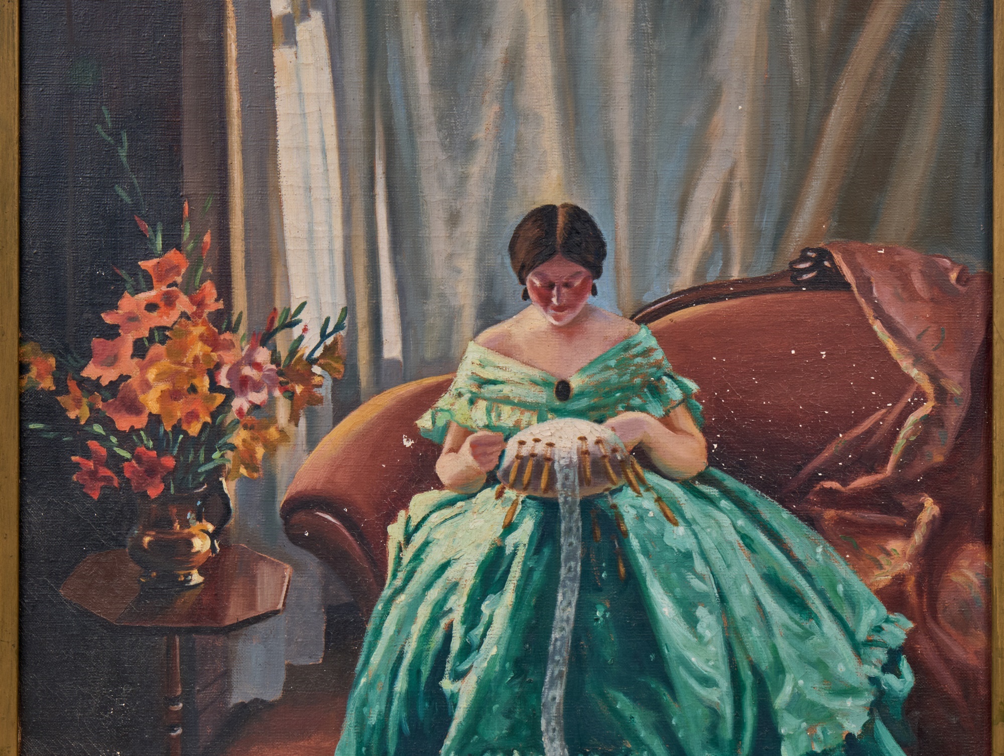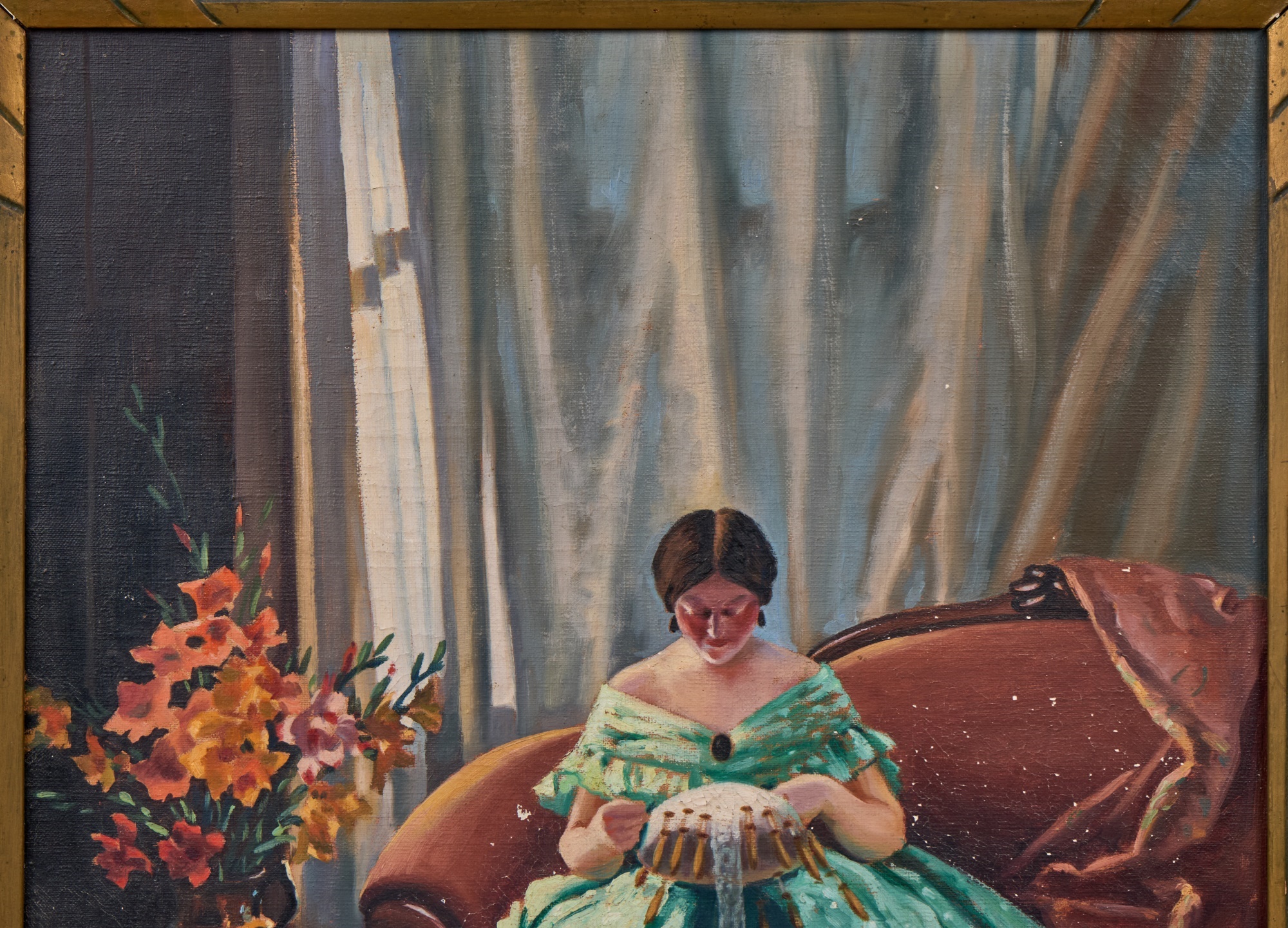 Lace Making for a Christening Gown. oil on canvas 28 x 24 inches. signed. frame 33 1/2 x 29 1/2 inches (overall) N.B. This work was commissioned in the 1930s by Josiah Tufts. The subject Ellen Tufts is making lace for her first child's gown.