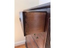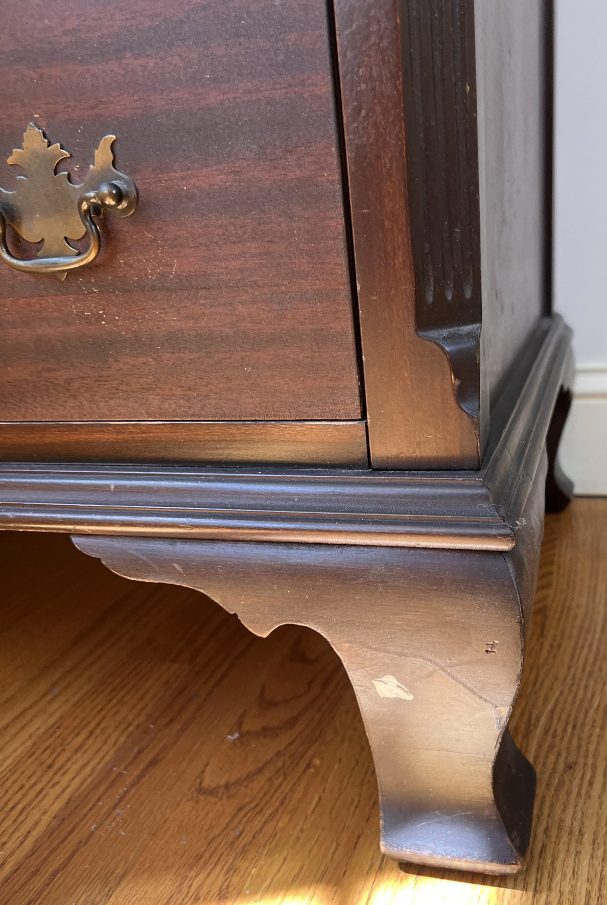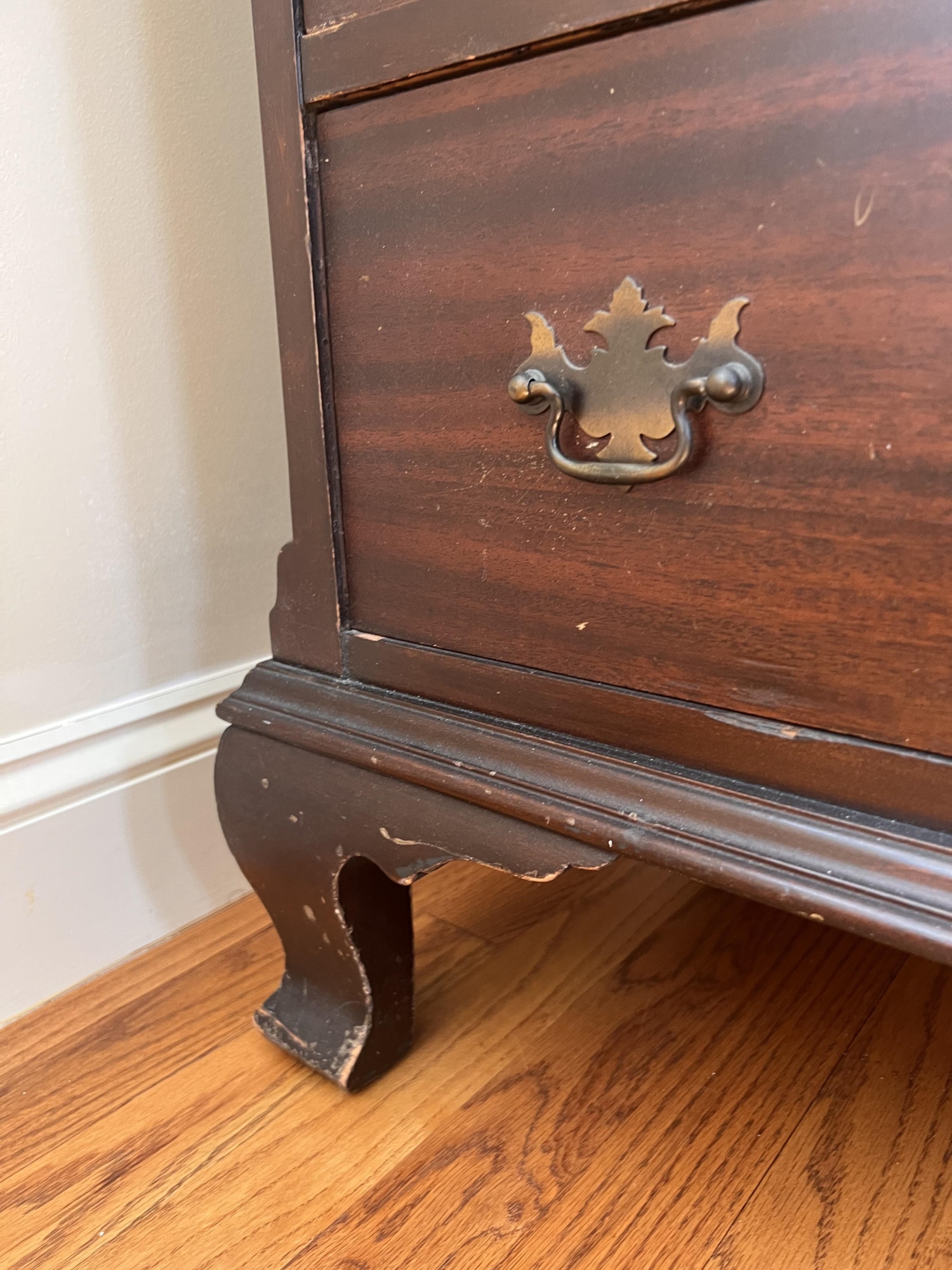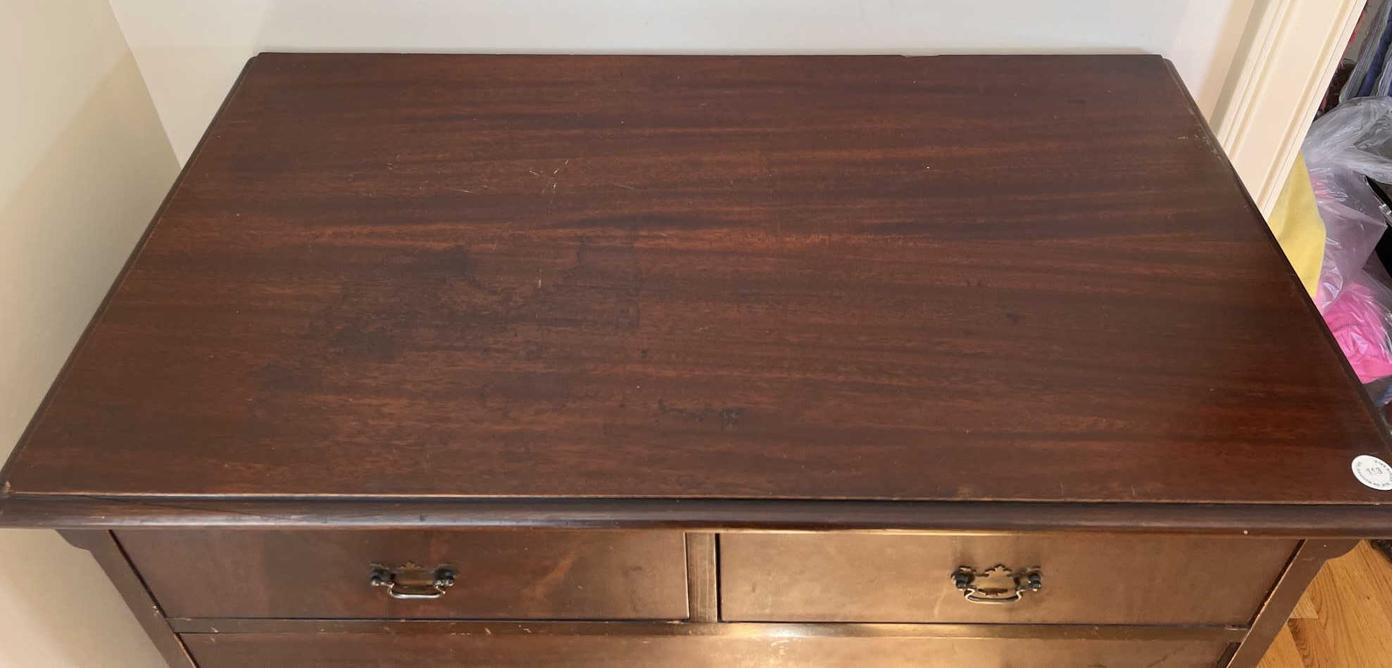 Simplified form with applied molded base and ogee feet. 46 x 36 x 20 inches Condition: Light scratches, finish inconsistencies