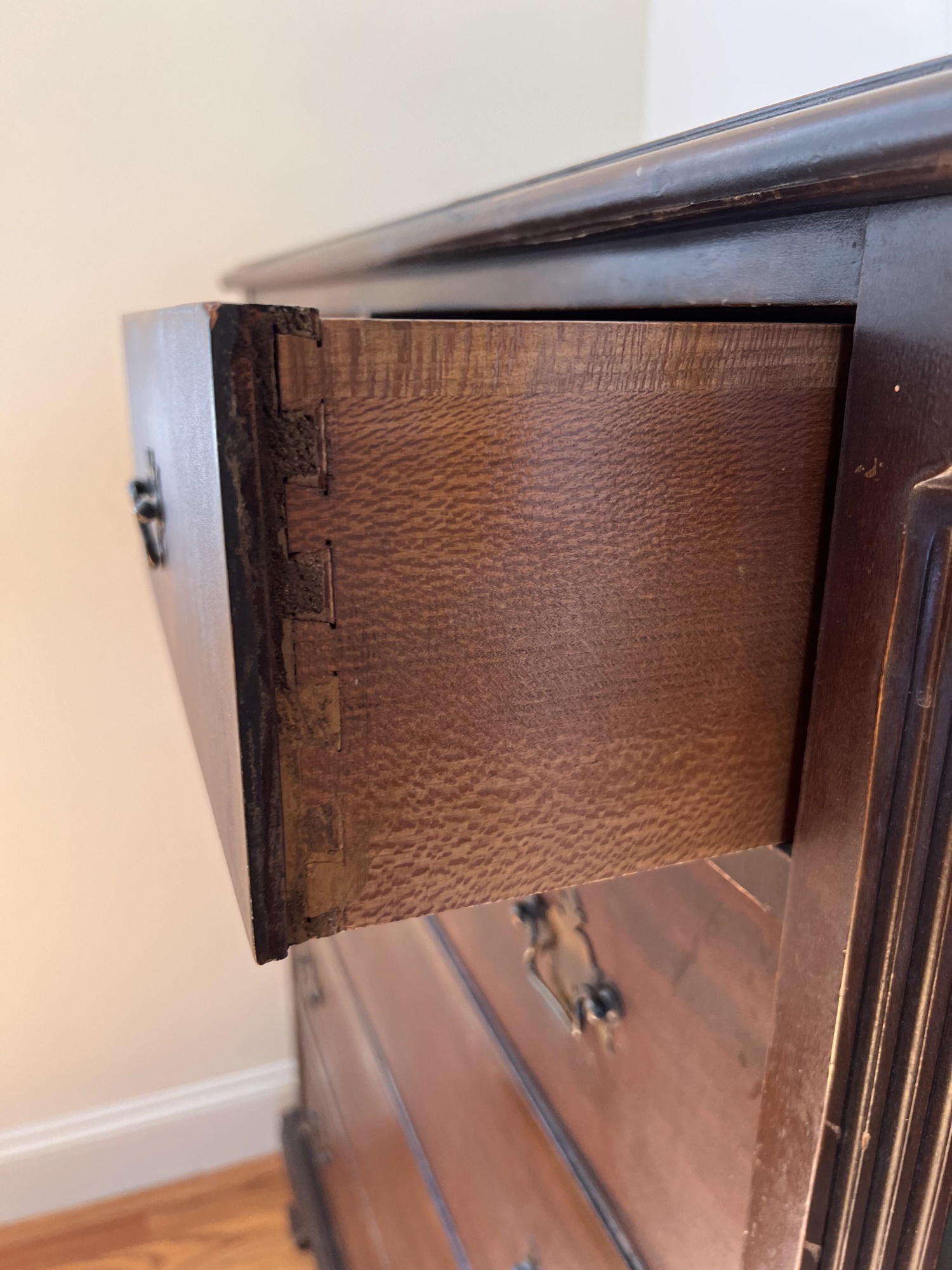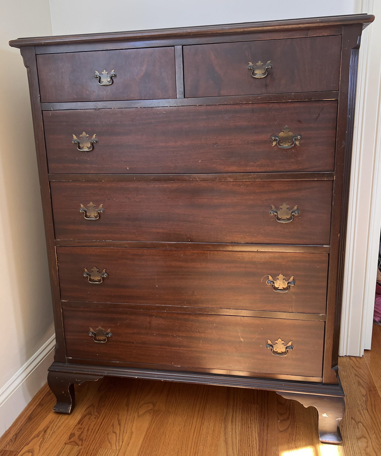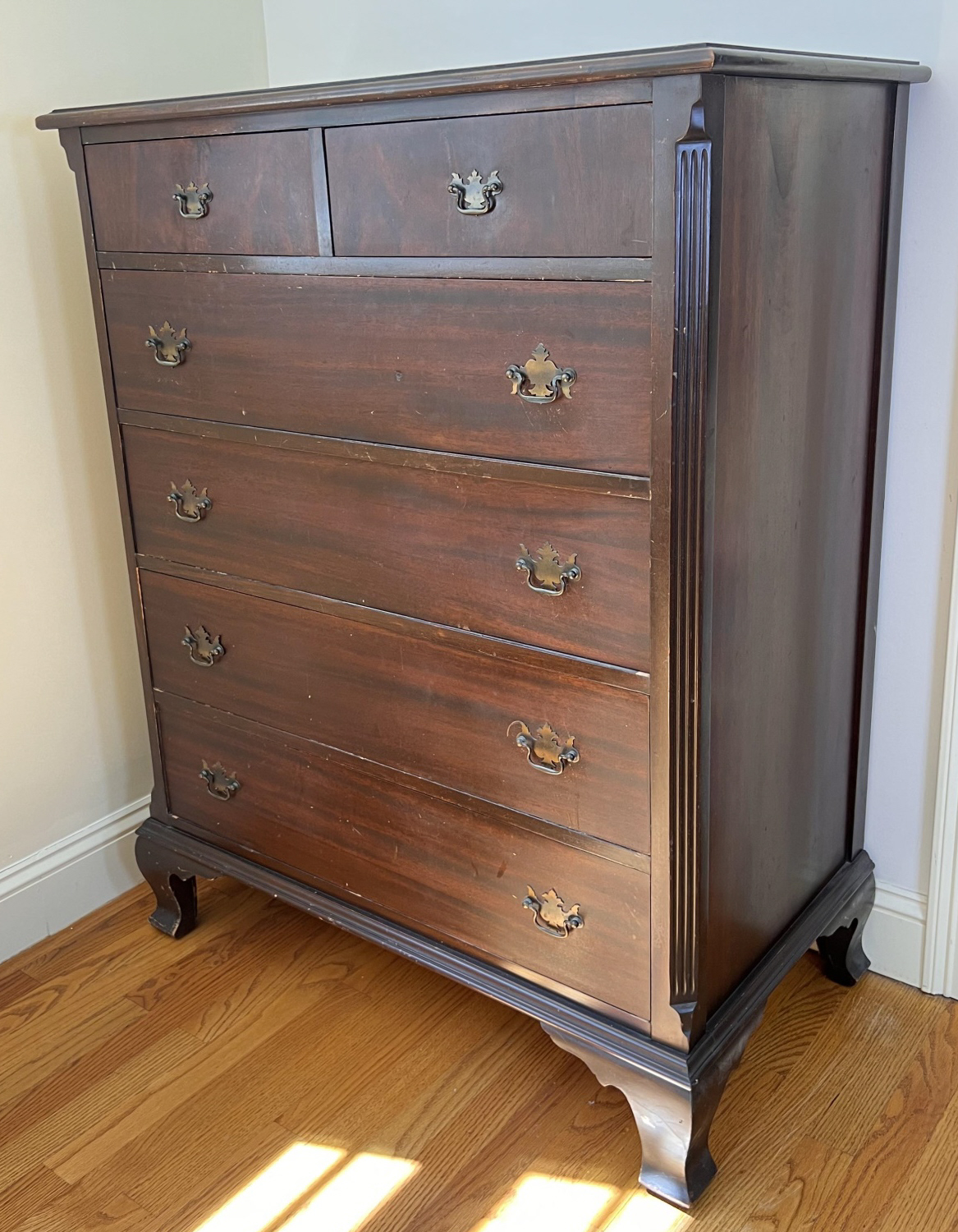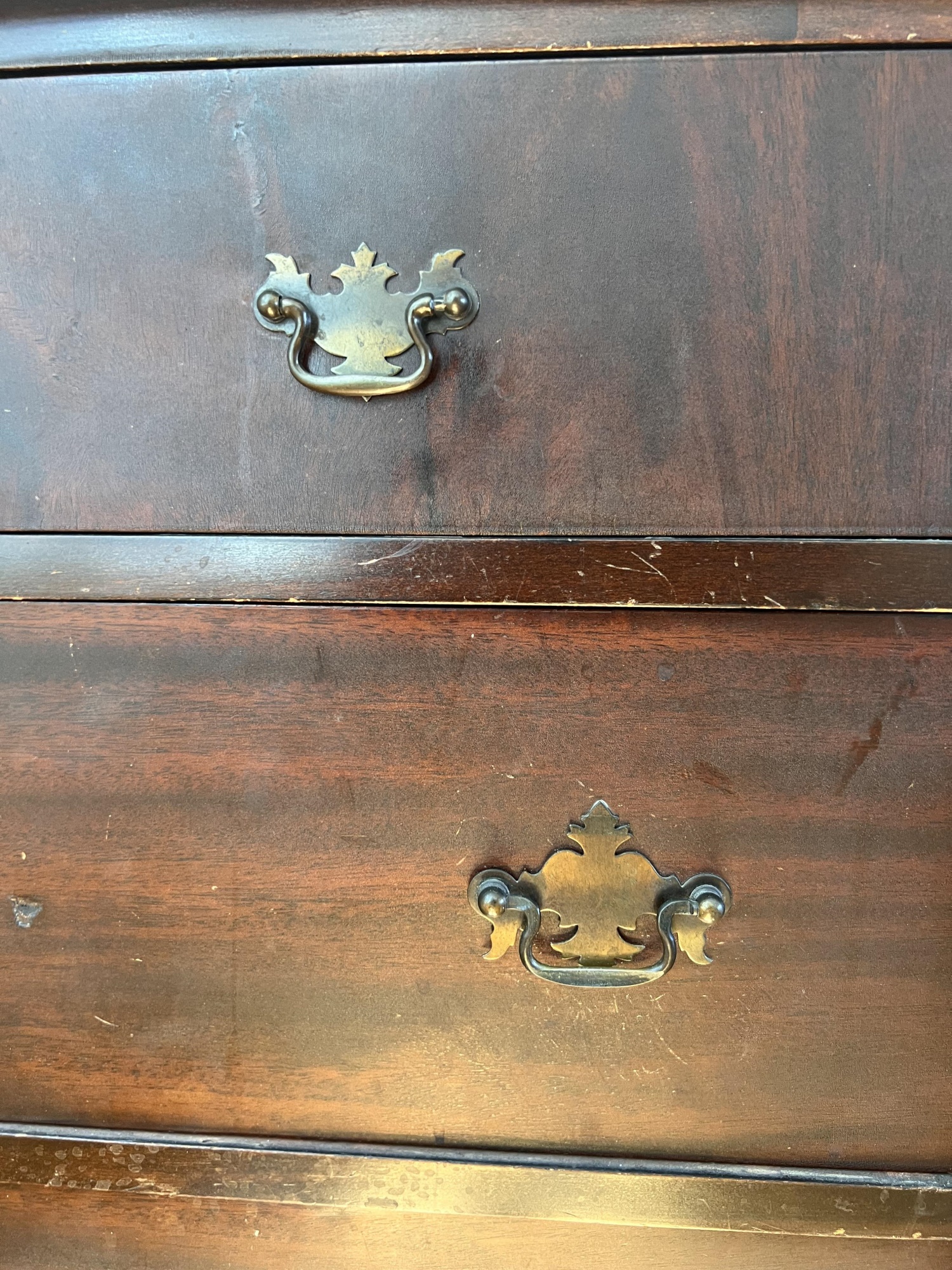 Simplified form with applied molded base and ogee feet. 46 x 36 x 20 inches Condition: Light scratches, finish inconsistencies