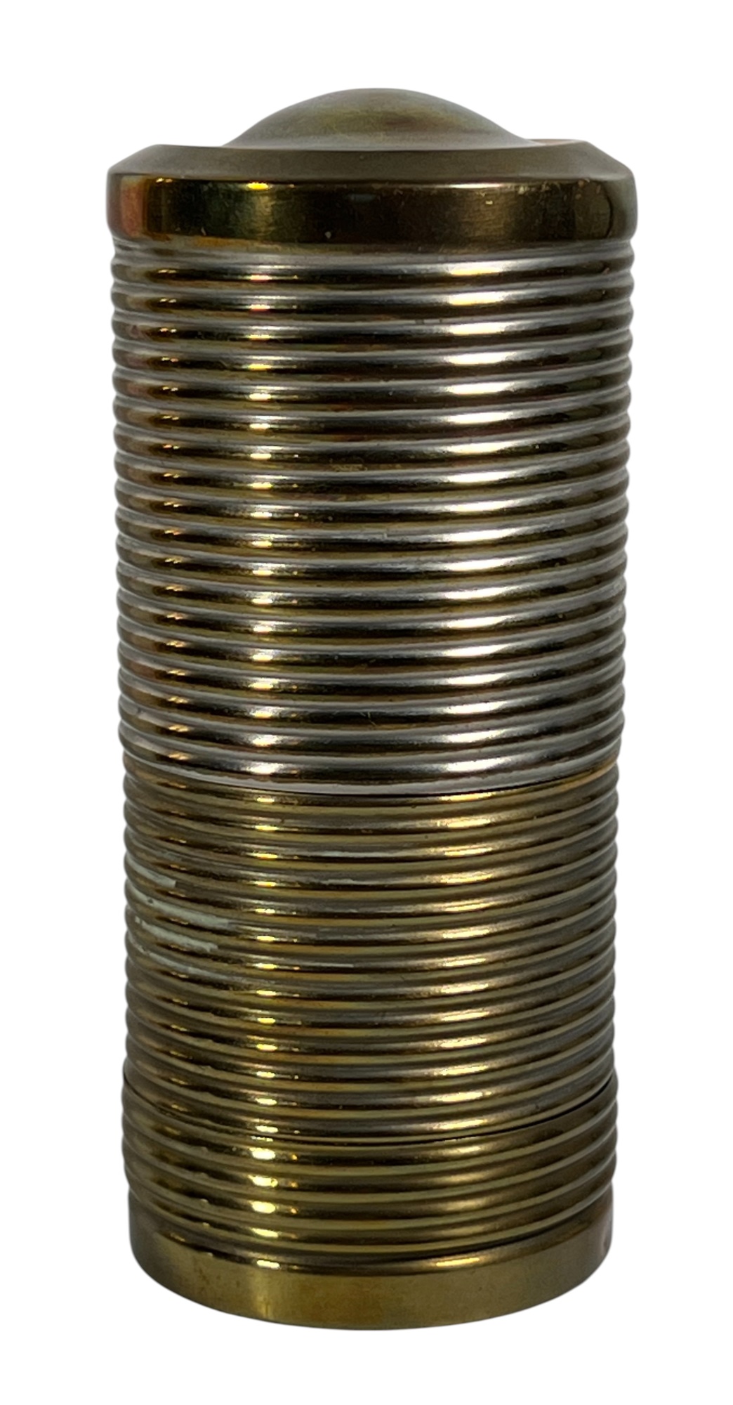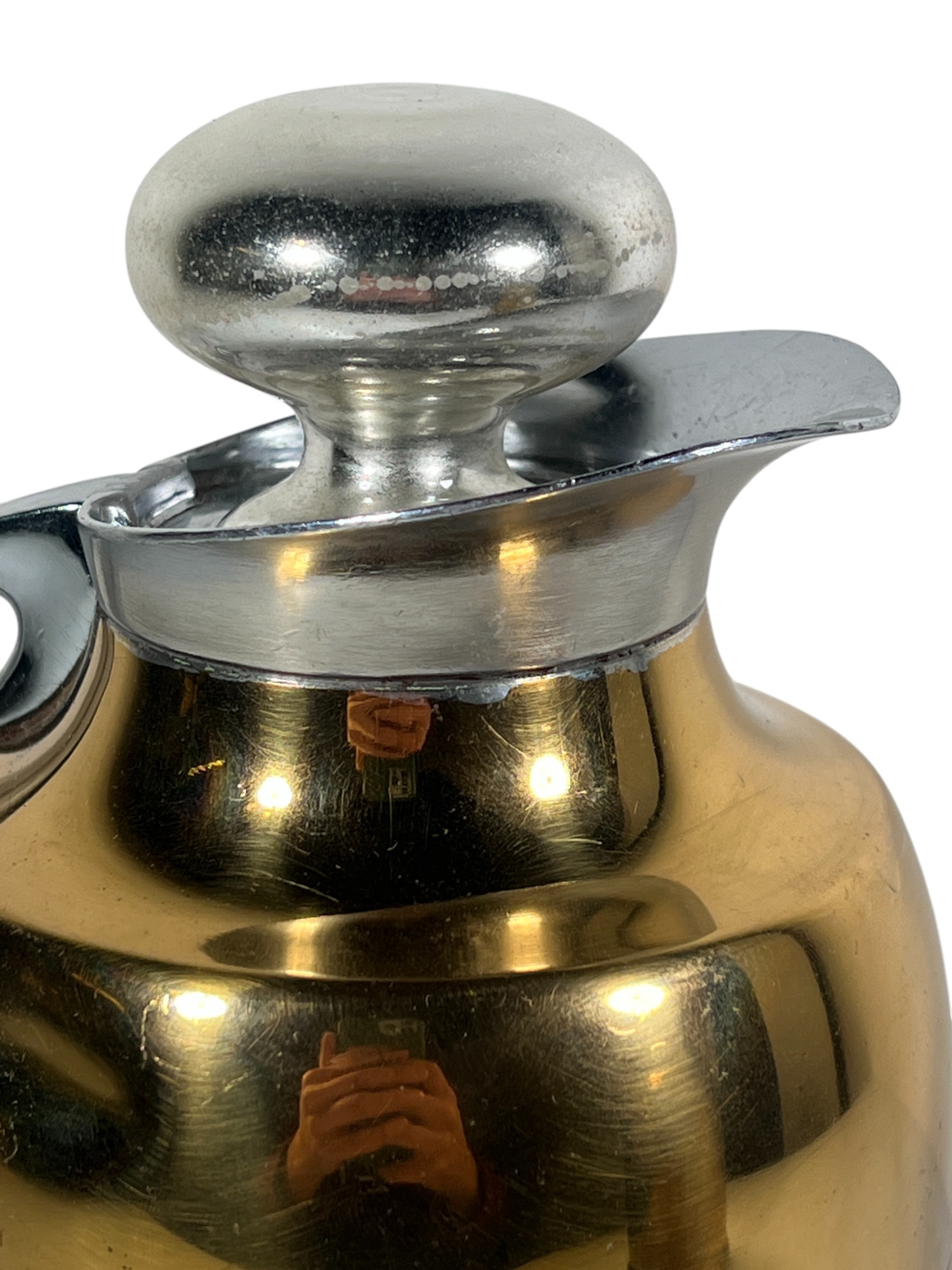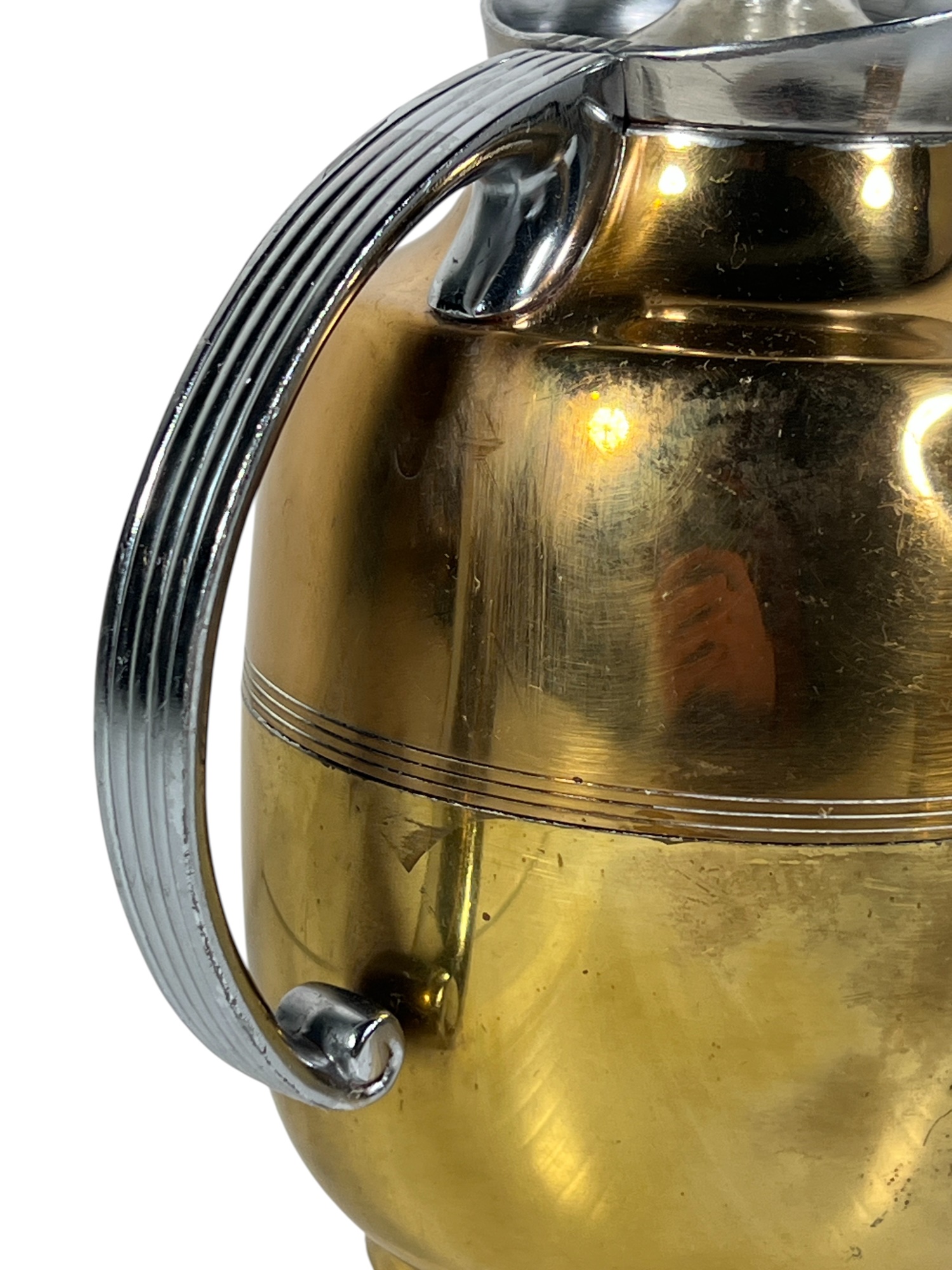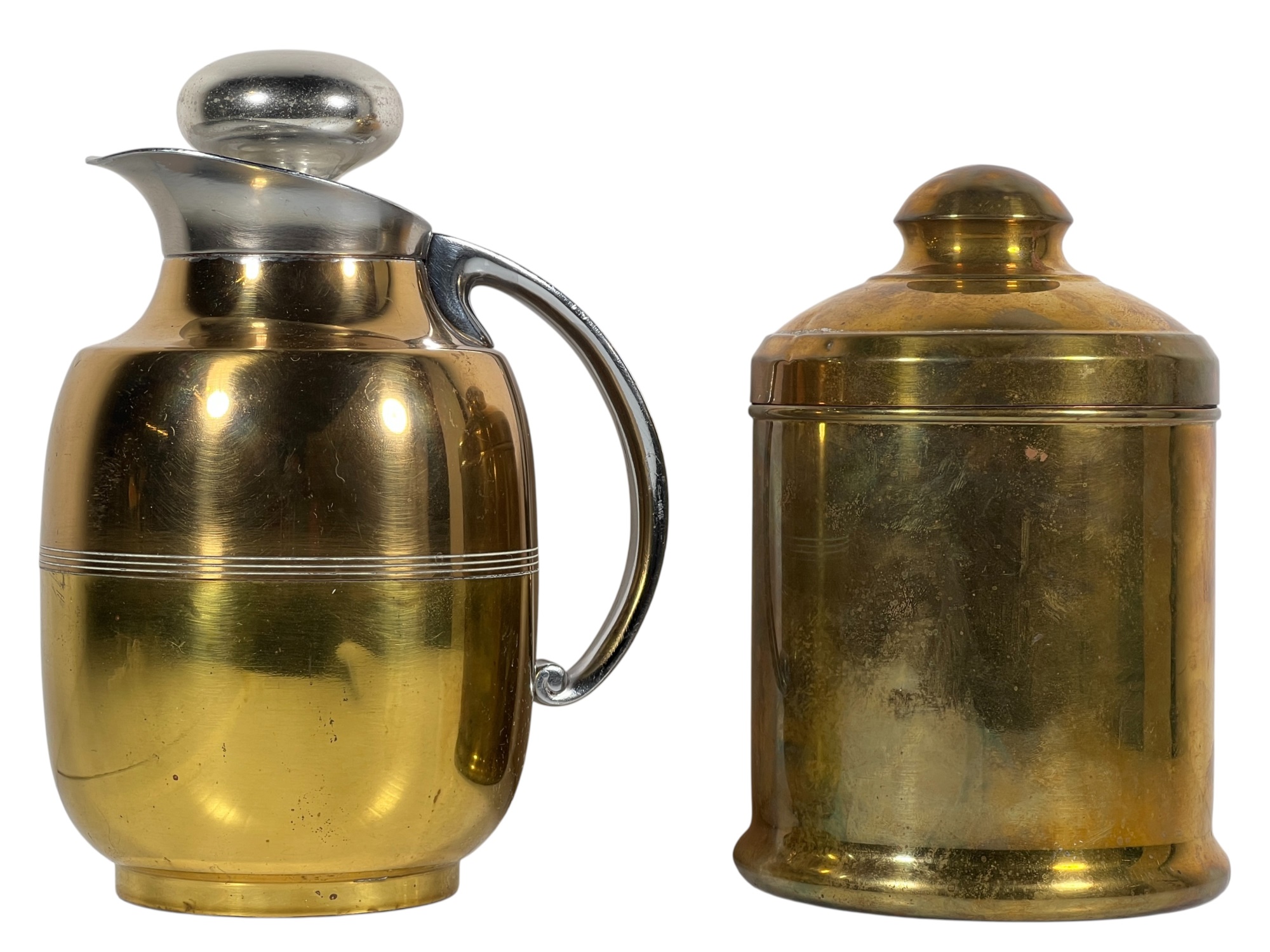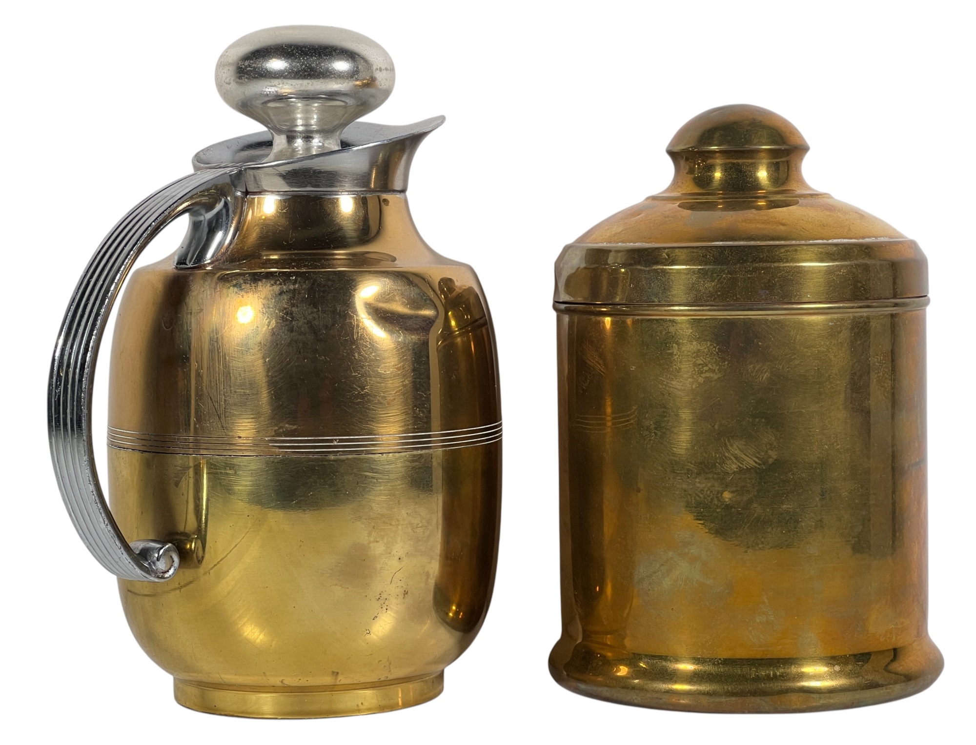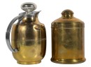 Manning Bowman Co. Art Deco brass & nickel insulated carafe no. 415F. Along with a brass humidor. 7 inches. Condition: Good. Temp No 8618