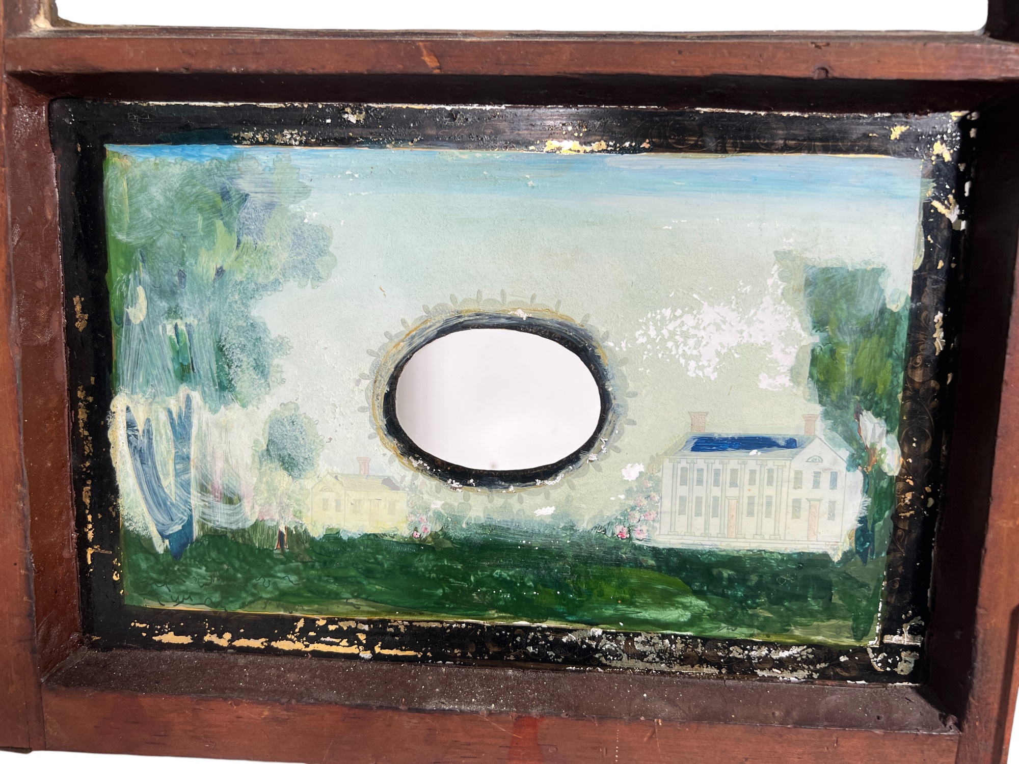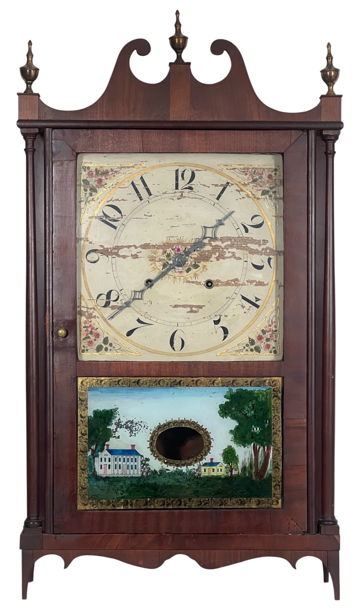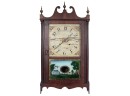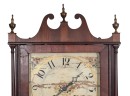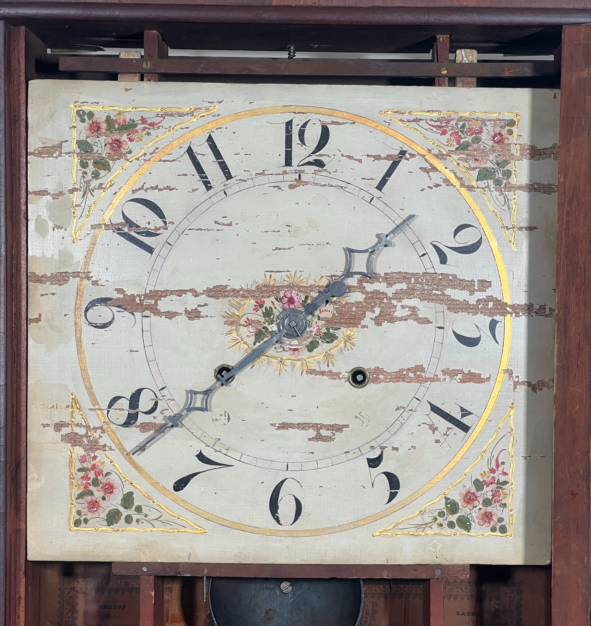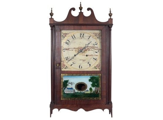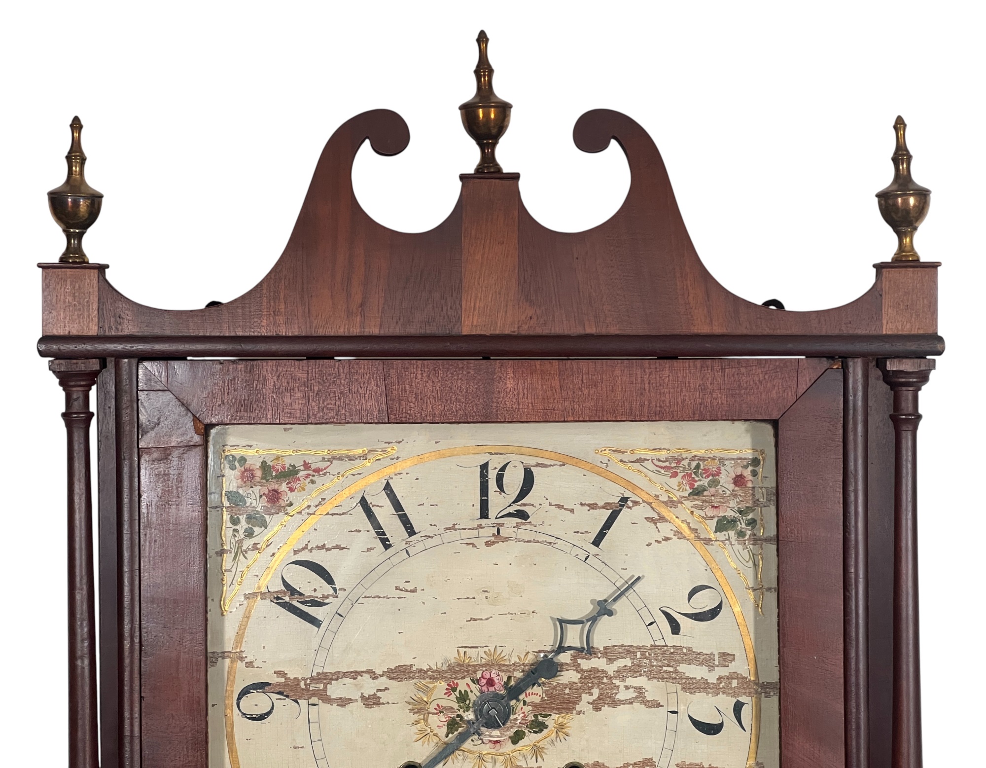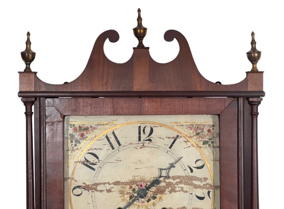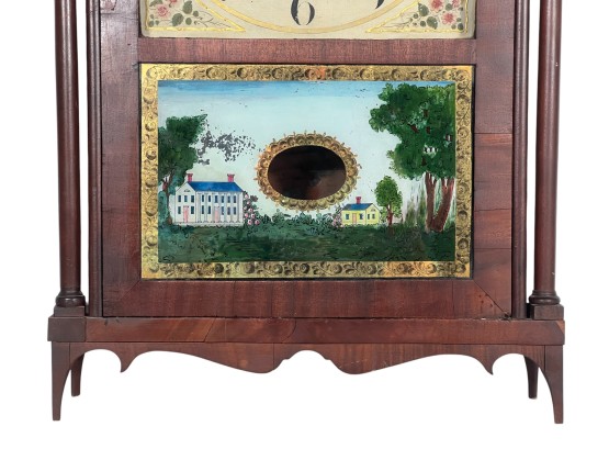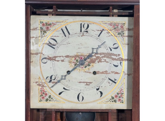 Mahogany case, hand painted & gilt dial with floral spandrels, reverse glass painted eglomise tablet. 30 x 16 1/2 x 4 1/2 inches. Condition: Scattered paint loss, minor loss to base. Untested.