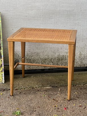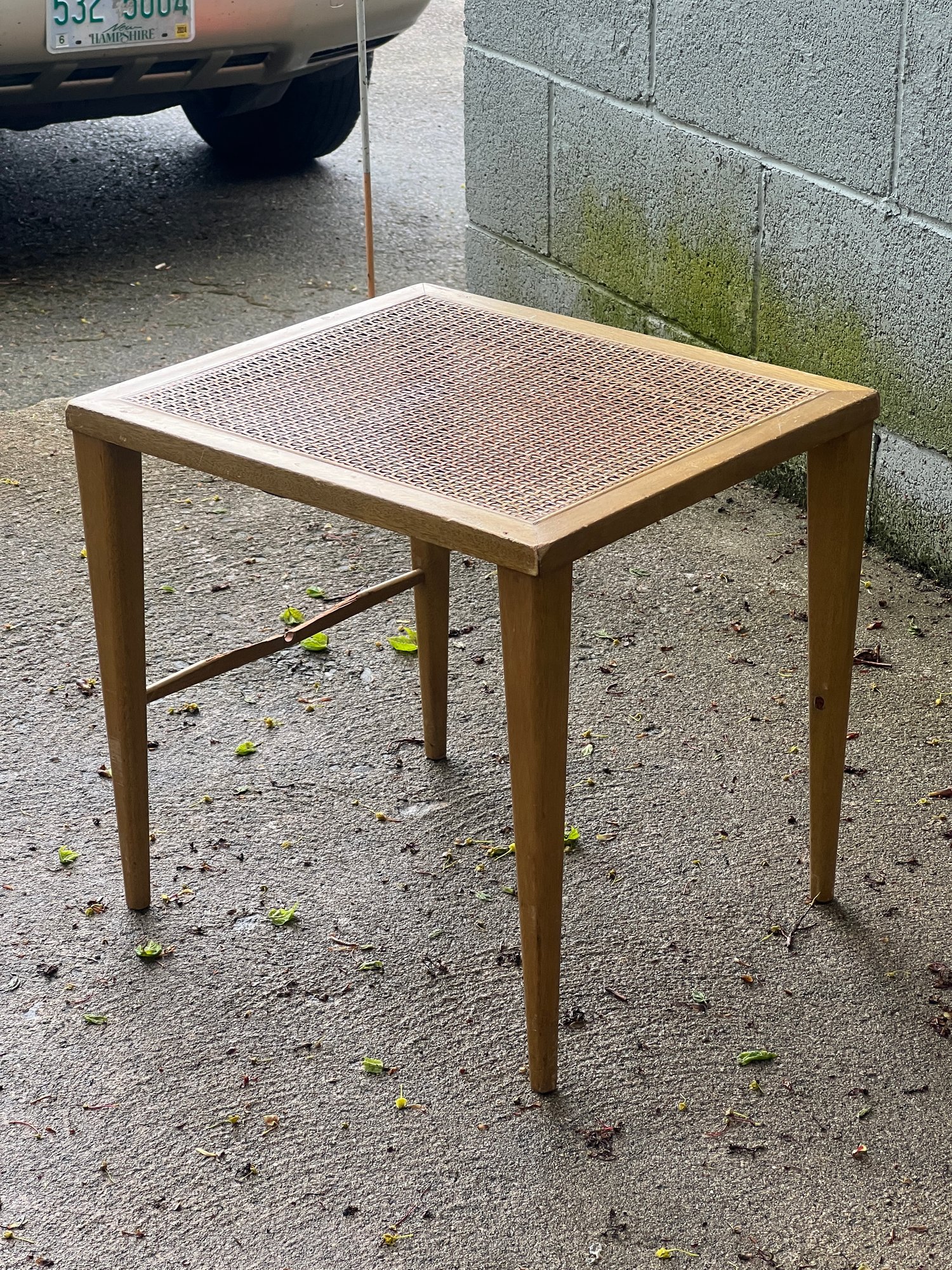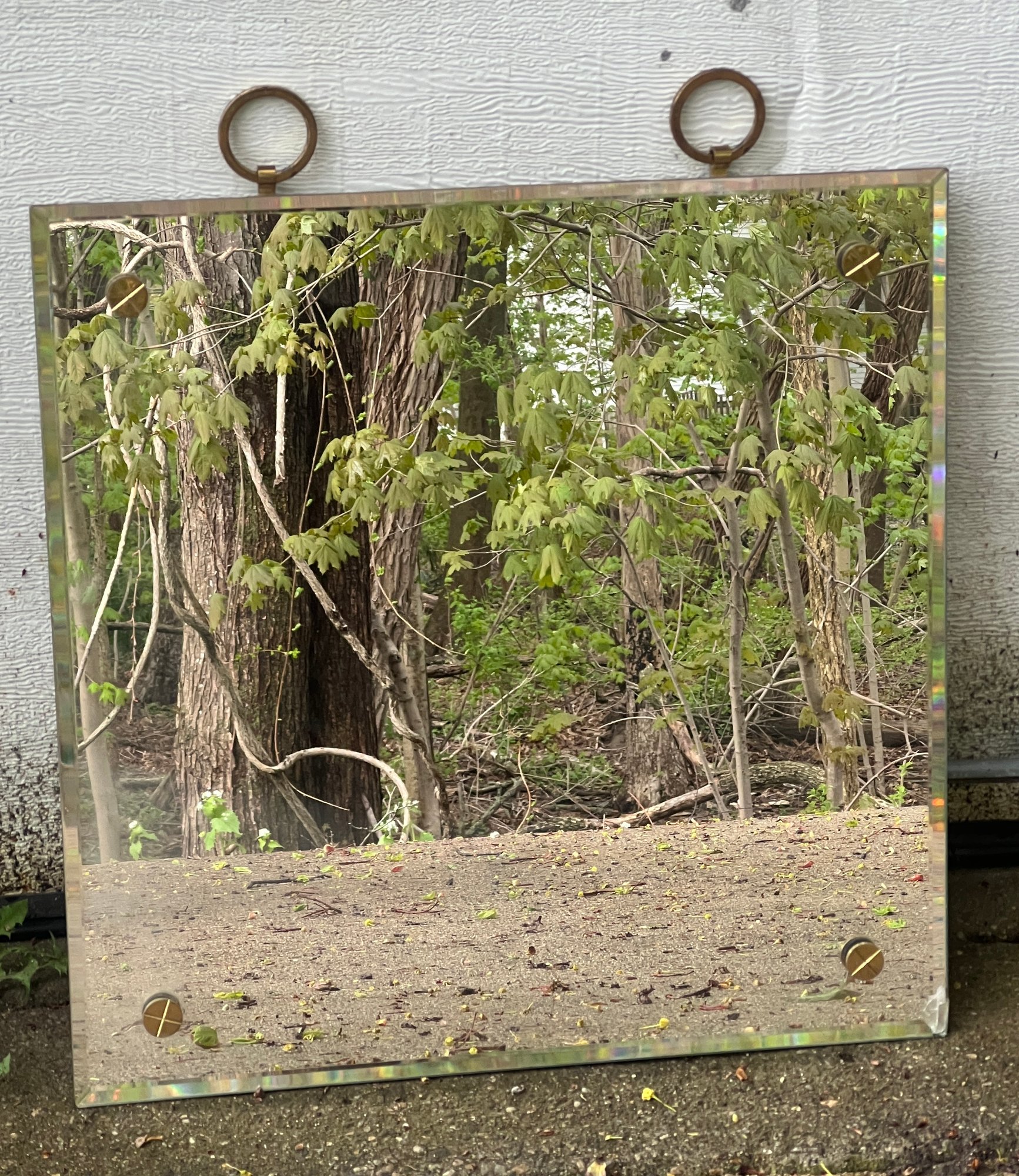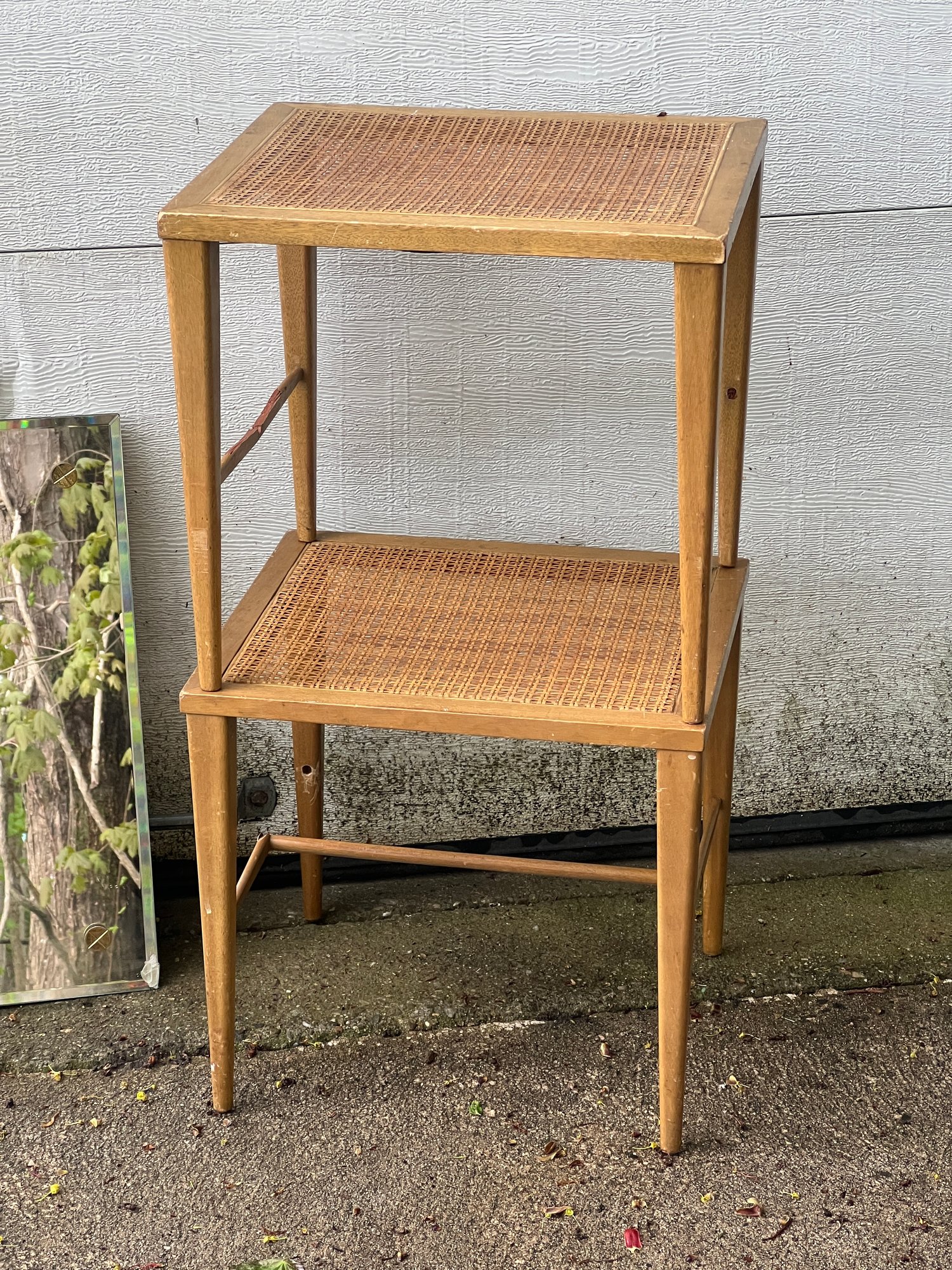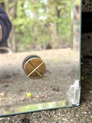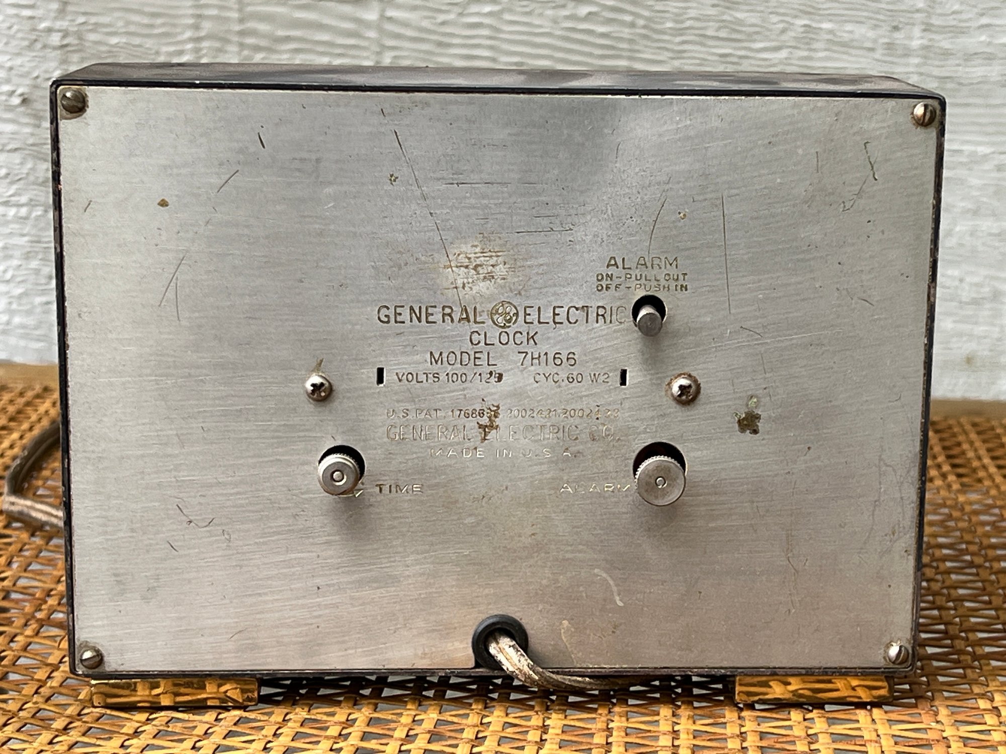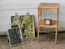 General Electric alarm clock model 7H165, (2) Paul McCobb foot stools, beveled glass mirror, beveled glass picture frame. Mirror measures
