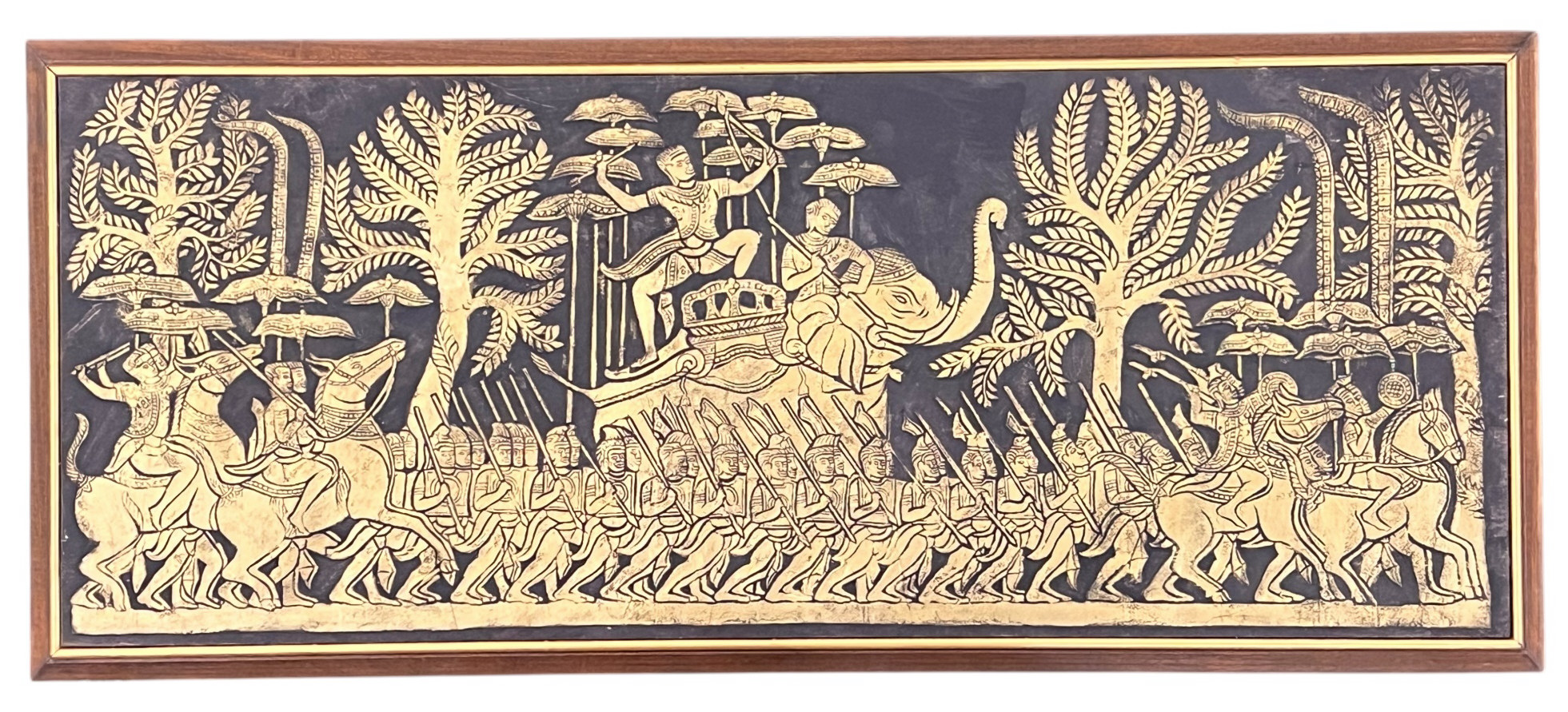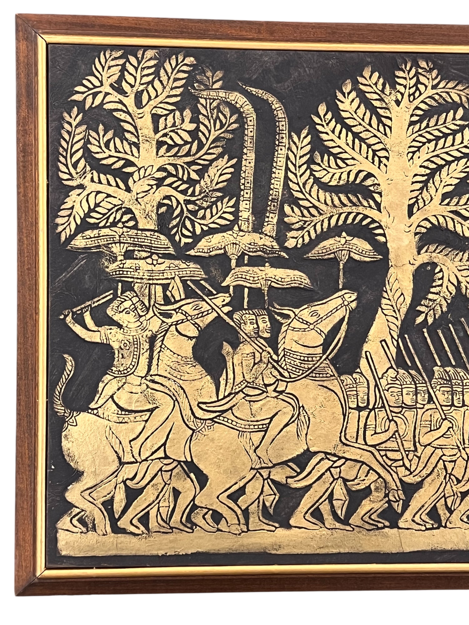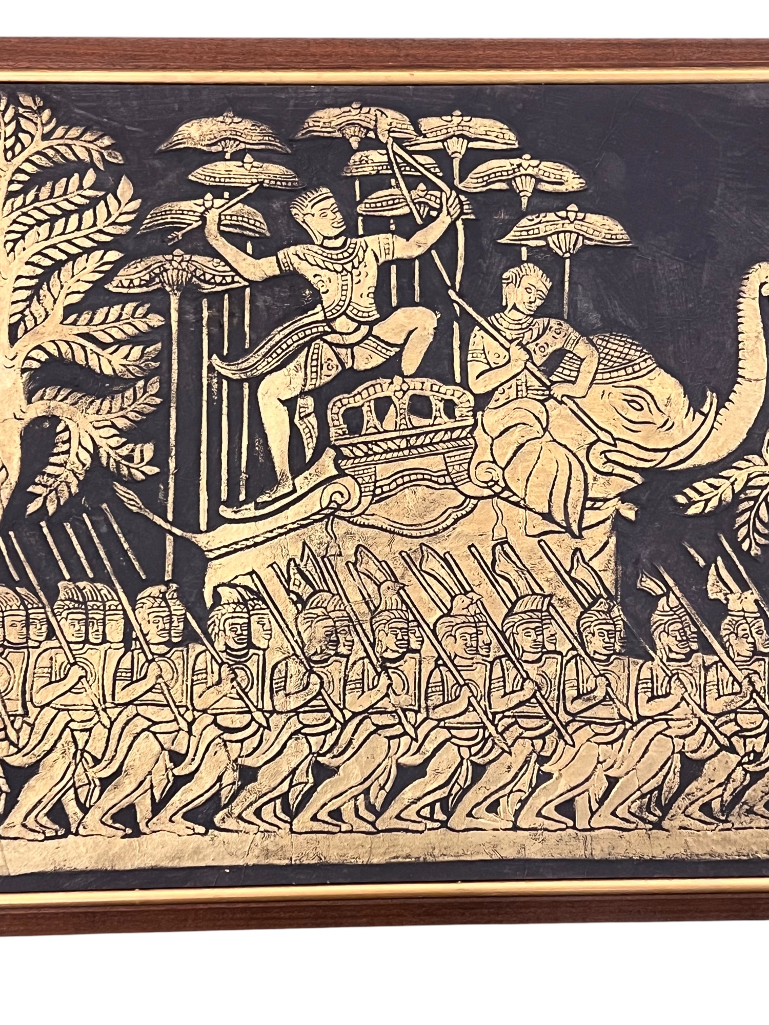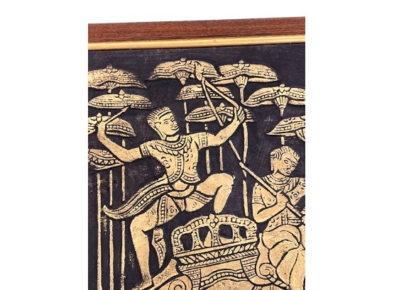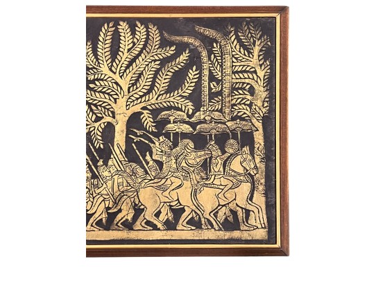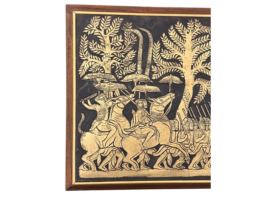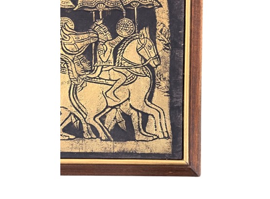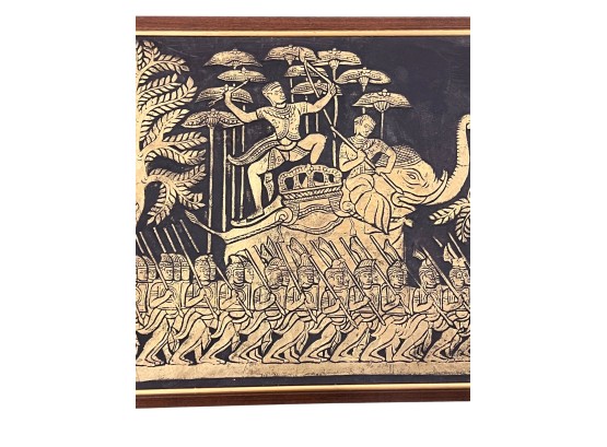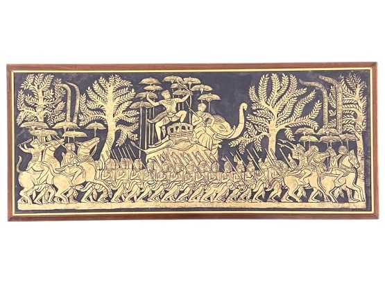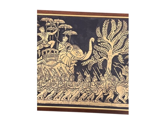 Embossed painted paper depicting an army marching to battle. 21" x 50" framed Condition: Good