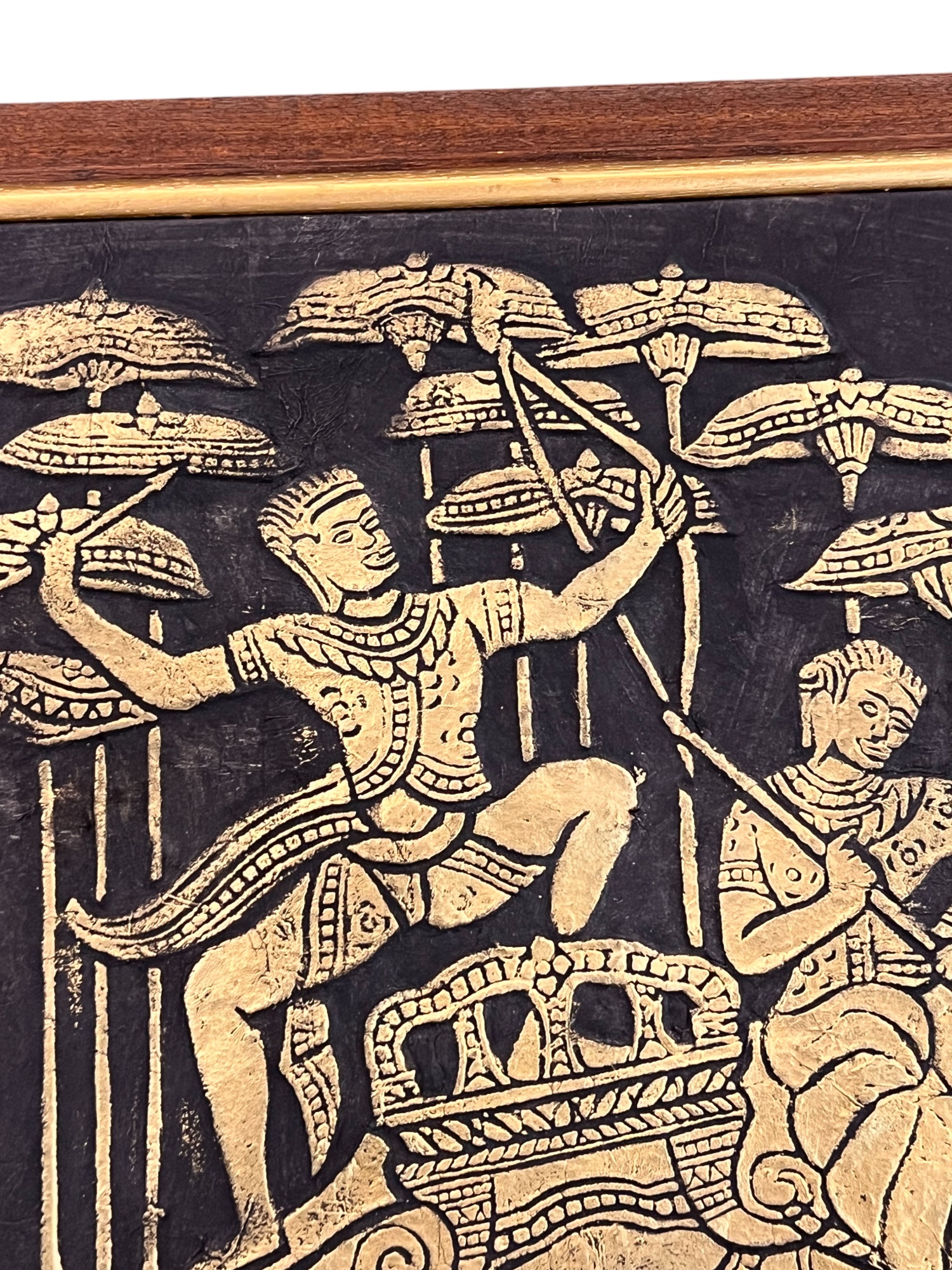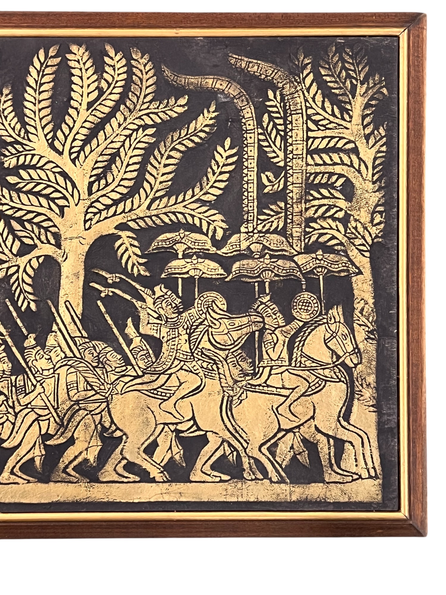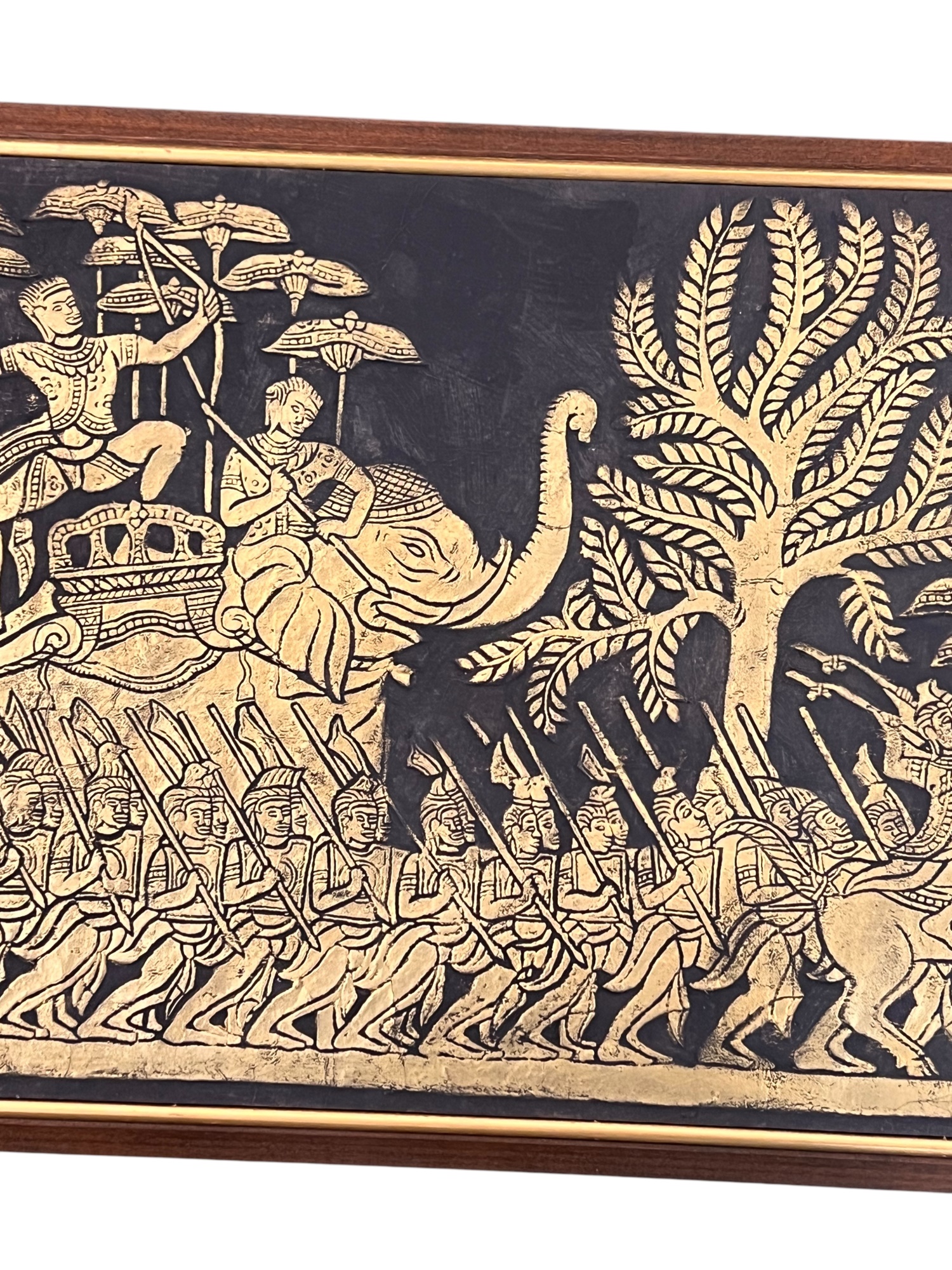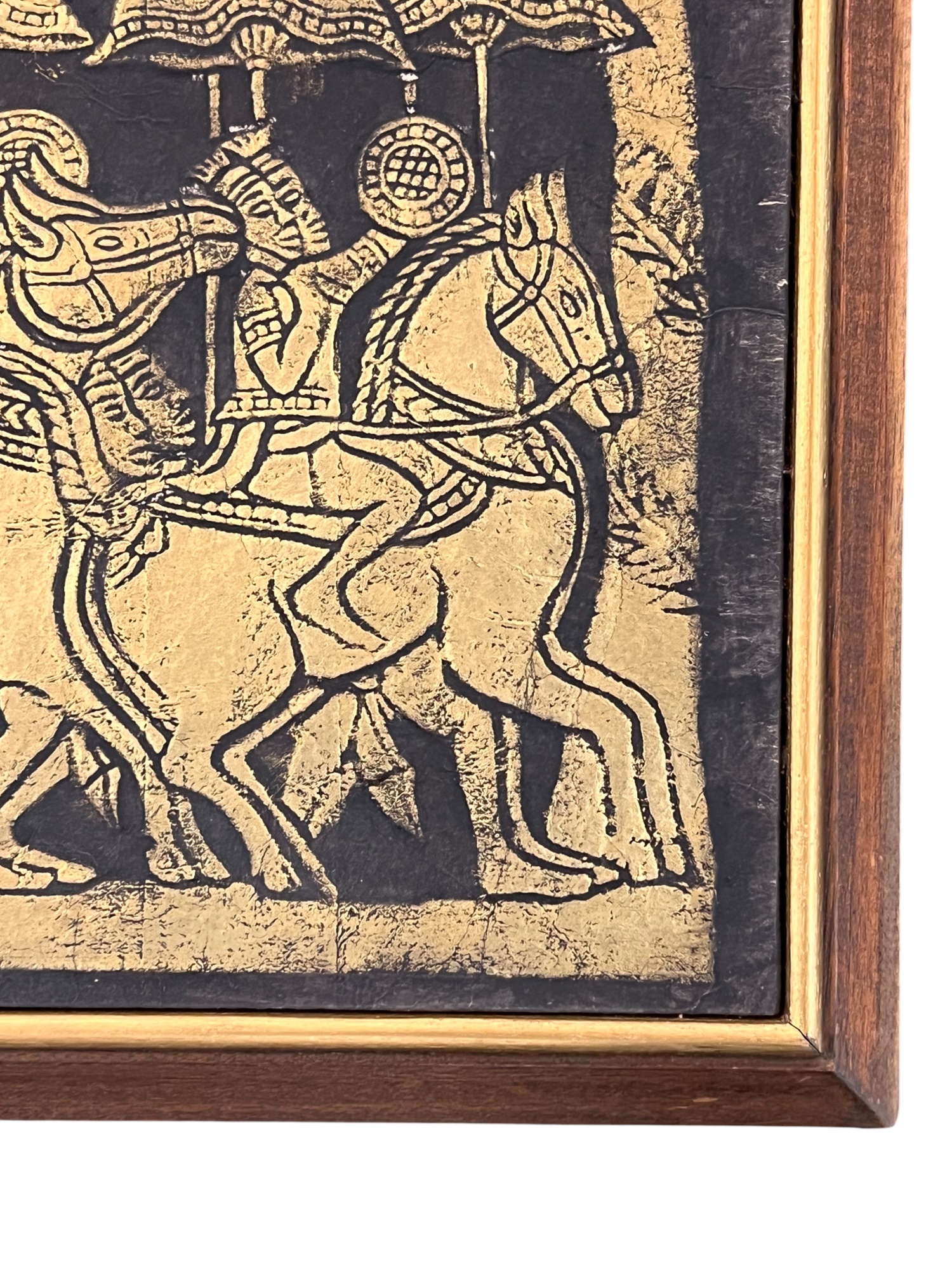 Embossed painted paper depicting an army marching to battle. 21" x 50" framed Condition: Good