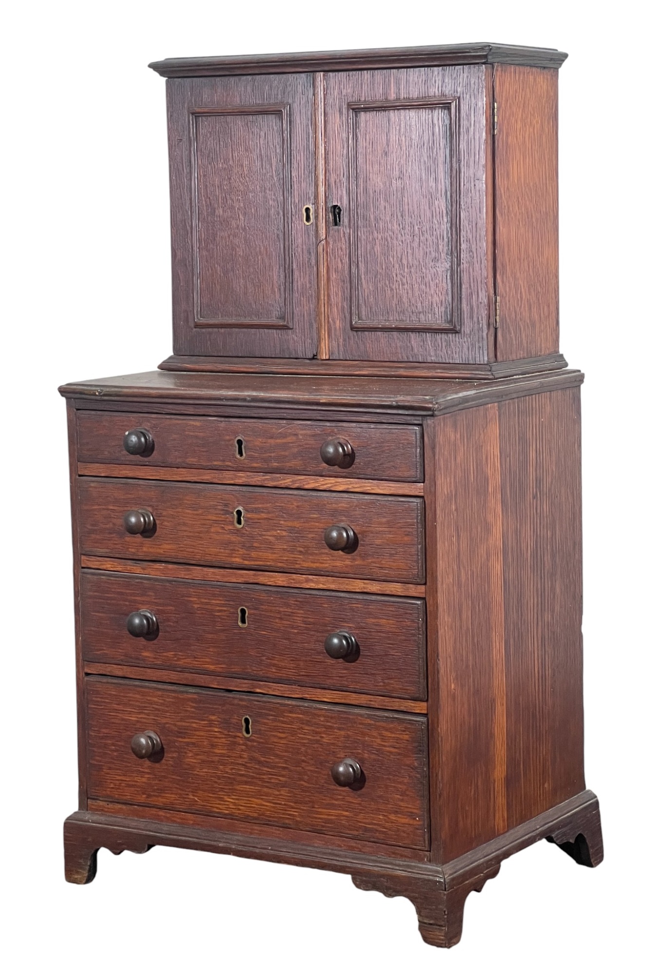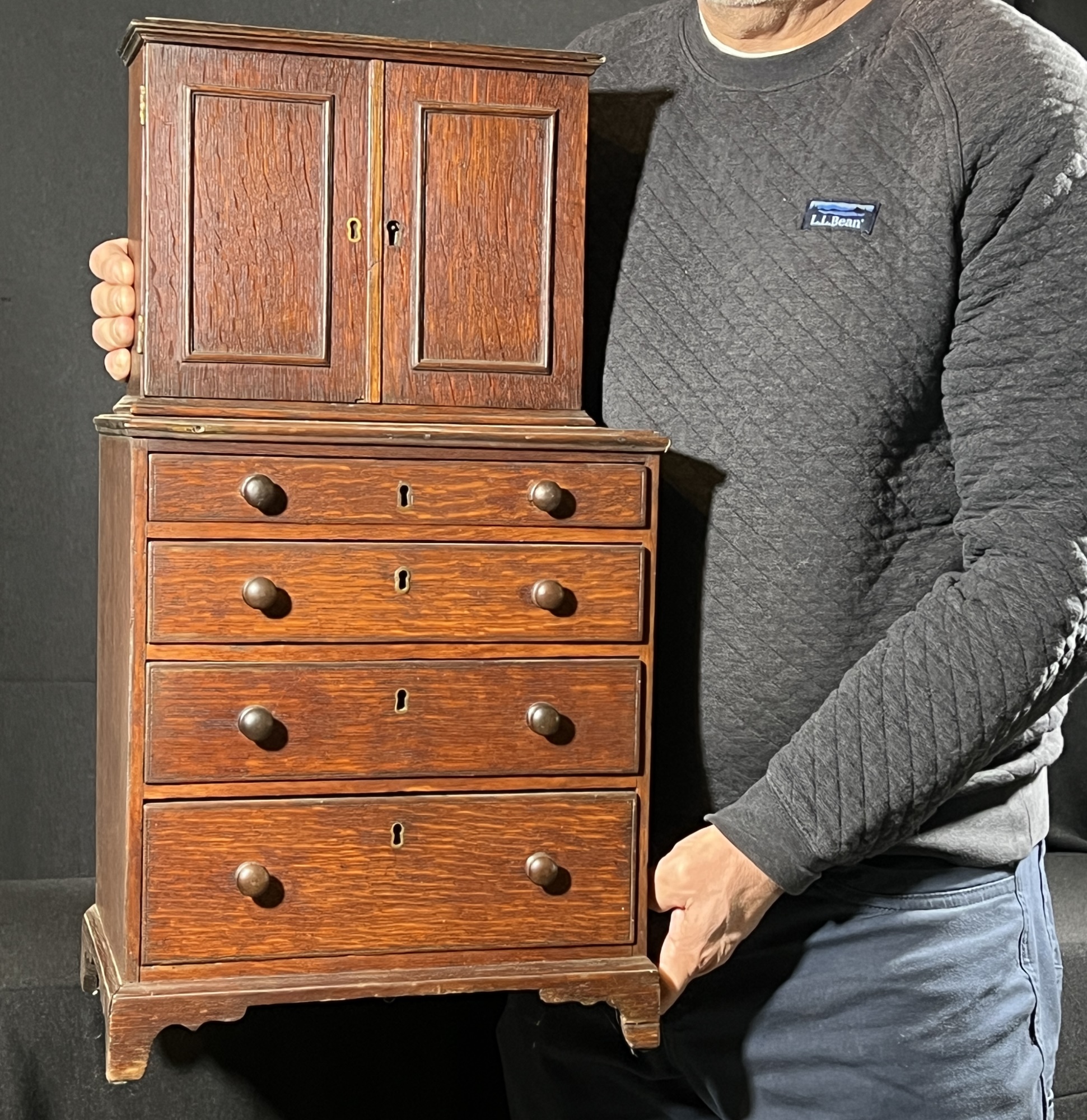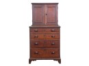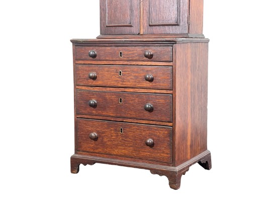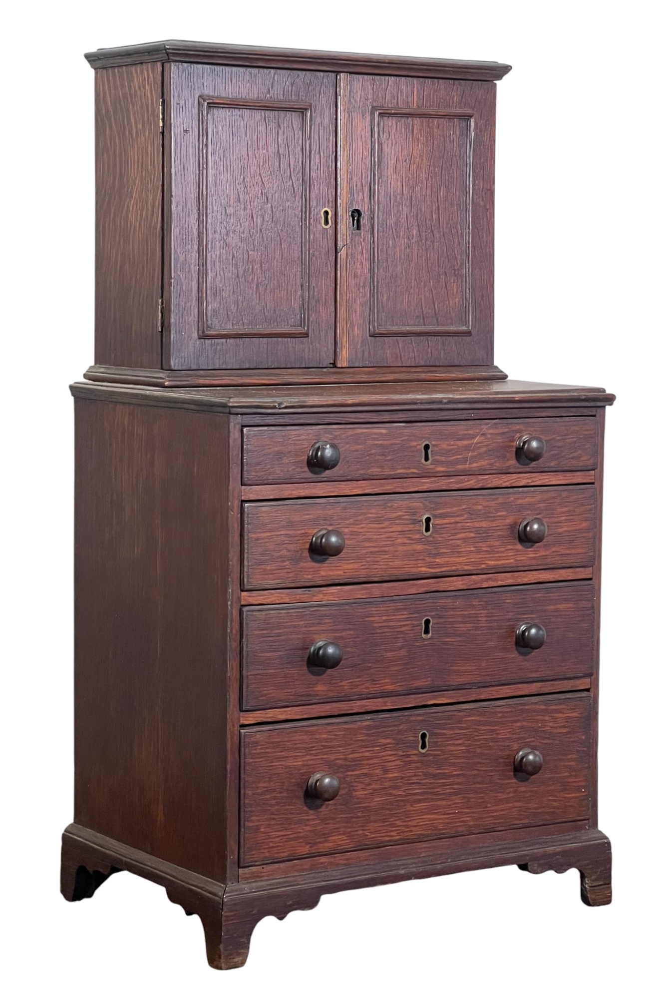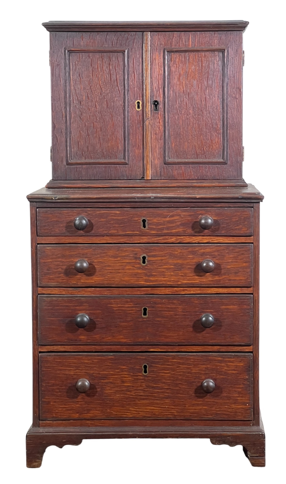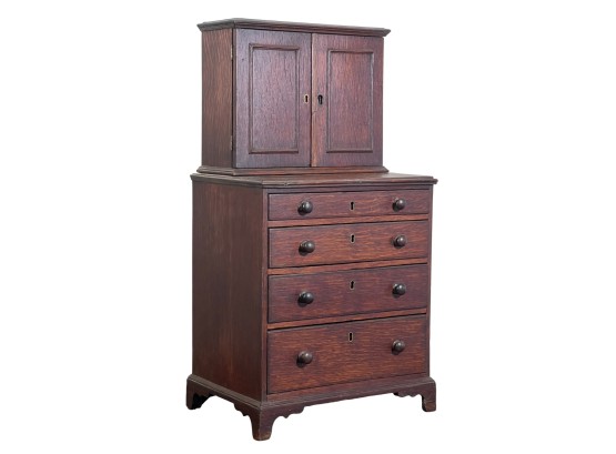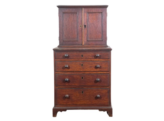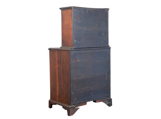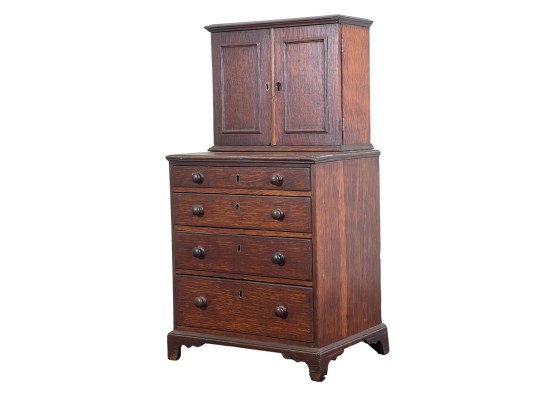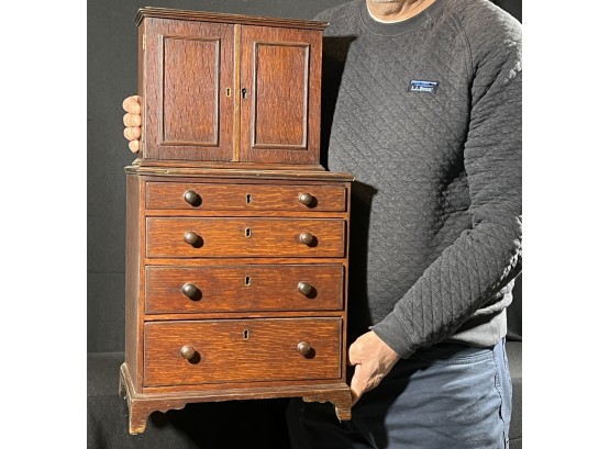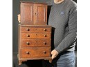 Upper case with (2) doors revealing (2) shelves, lower case with (4) graduated drawers. 23 1/2 x 12 1/4 x 8 3/4 inches. Condition: Good.