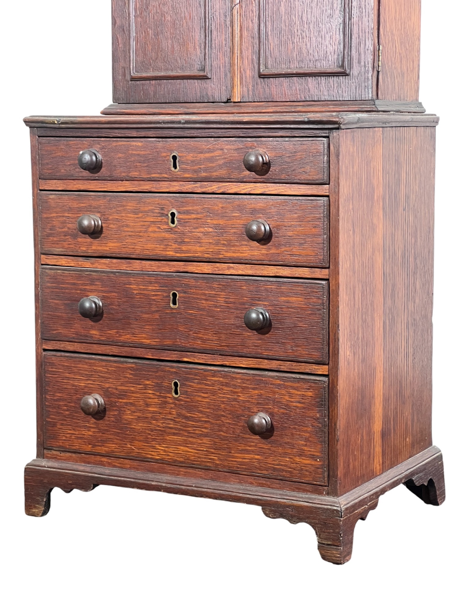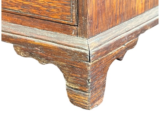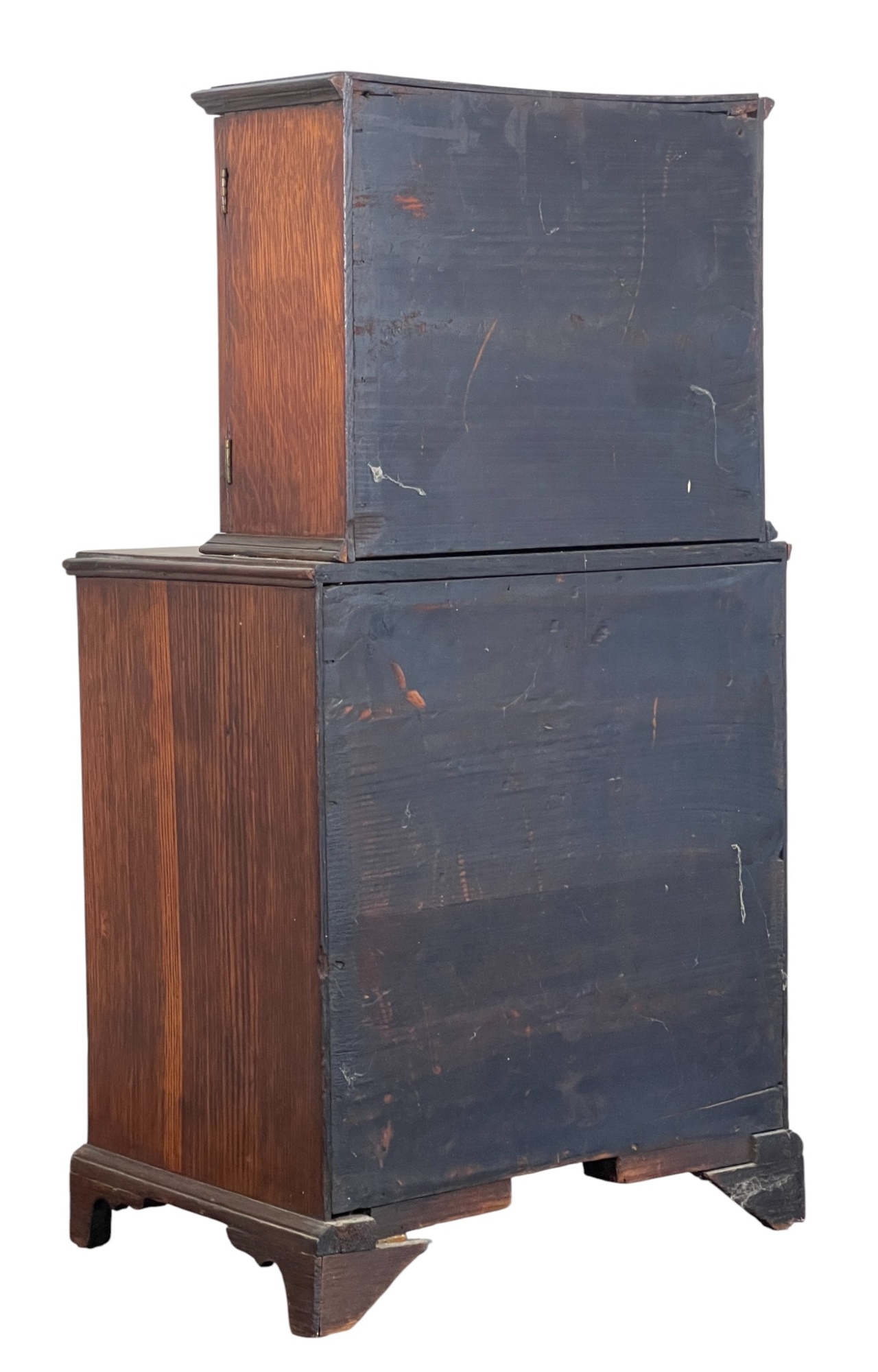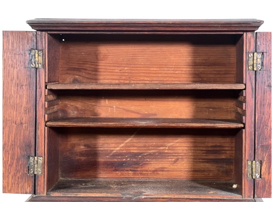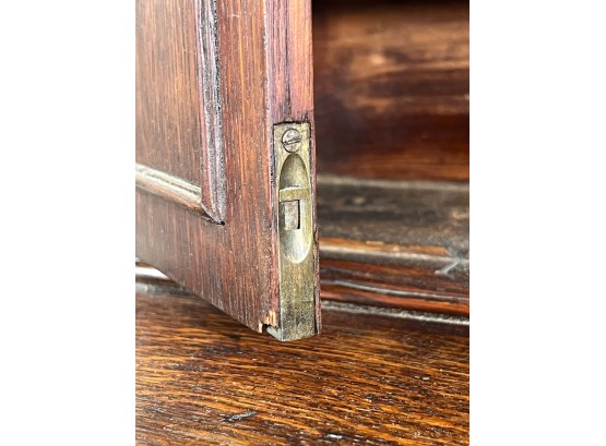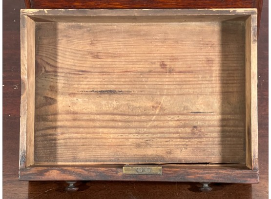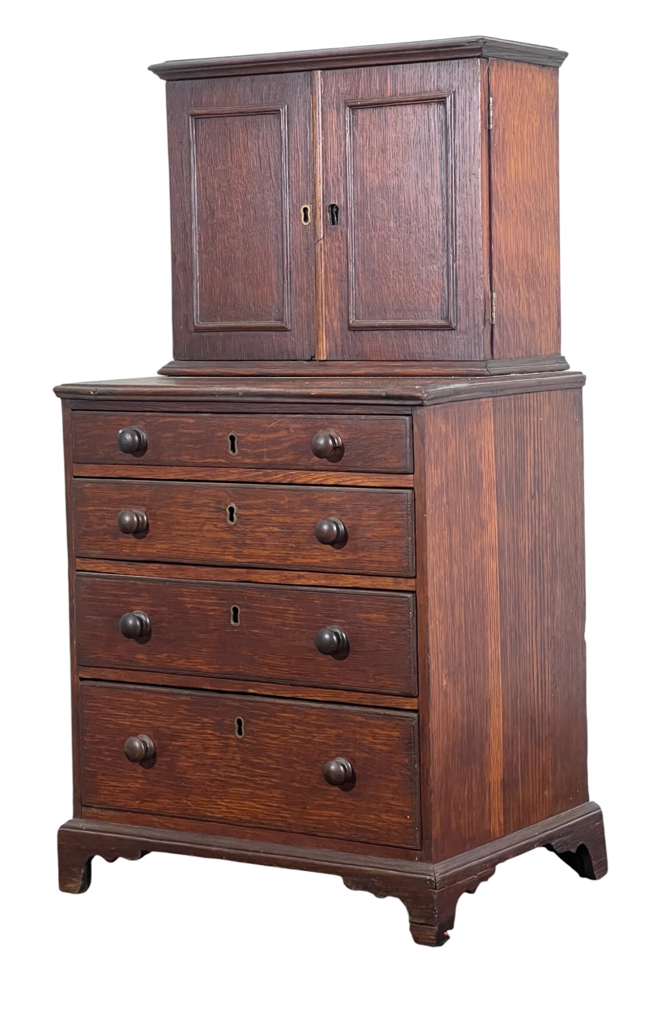 Upper case with (2) doors revealing (2) shelves, lower case with (4) graduated drawers. 23 1/2 x 12 1/4 x 8 3/4 inches. Condition: Good.