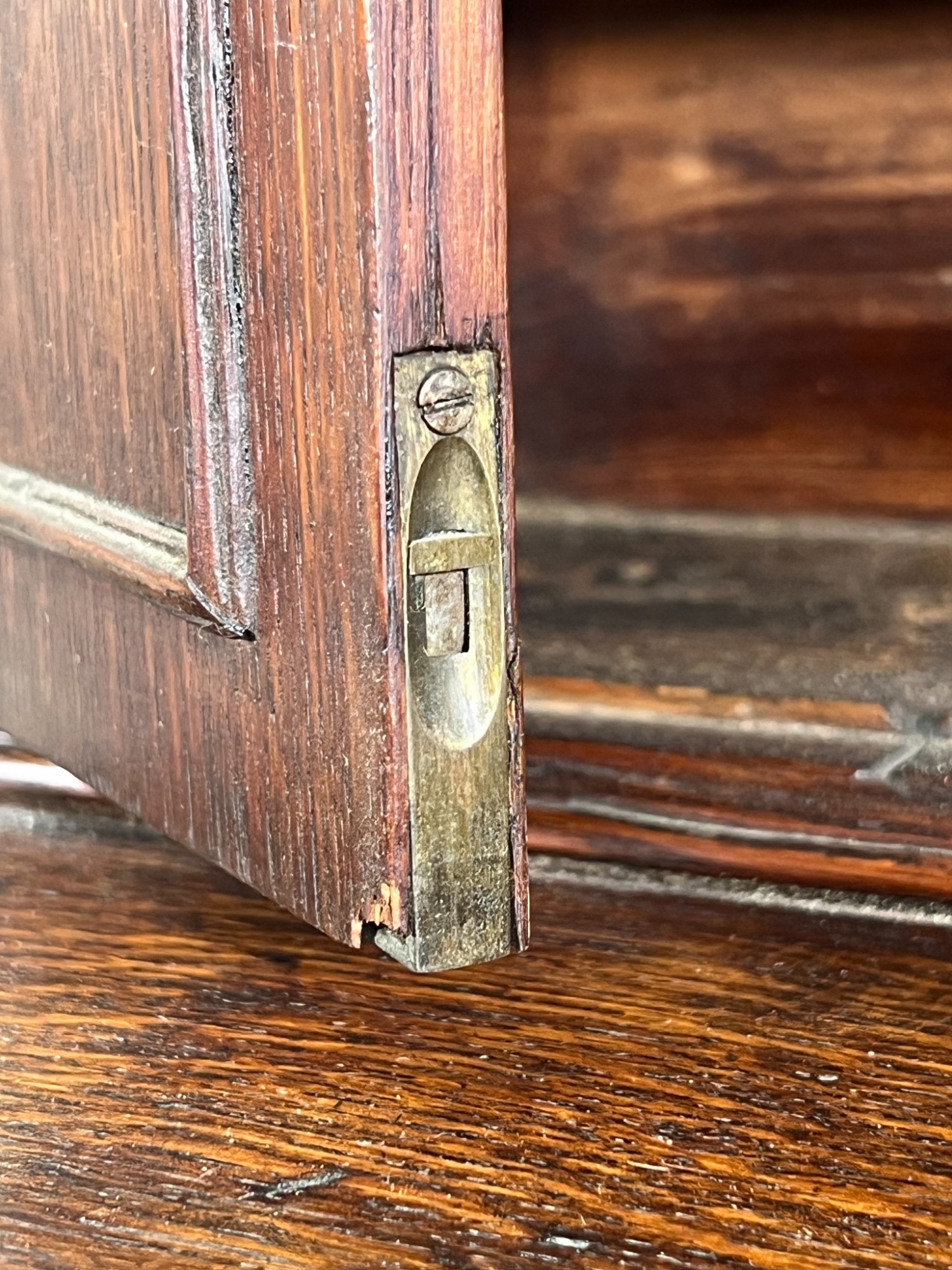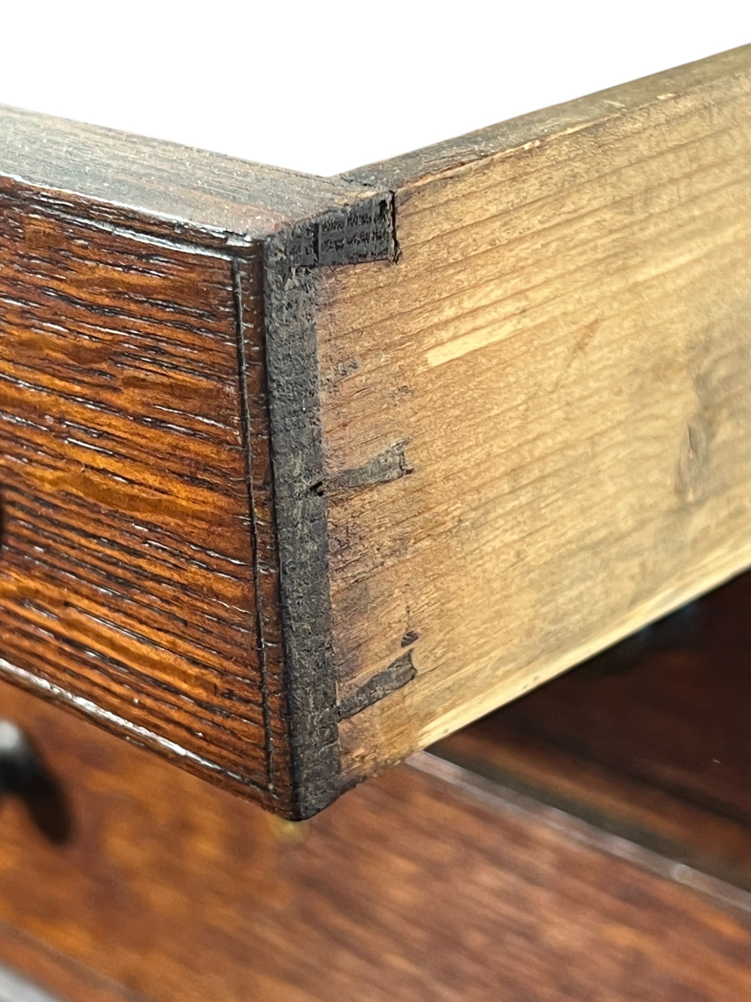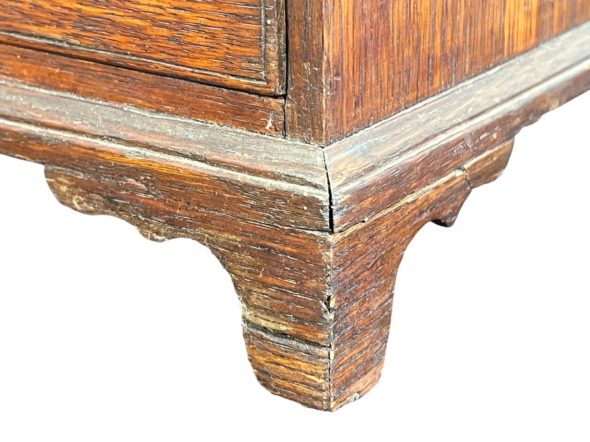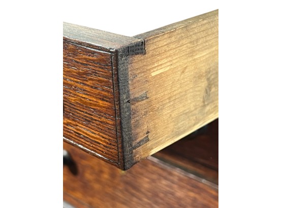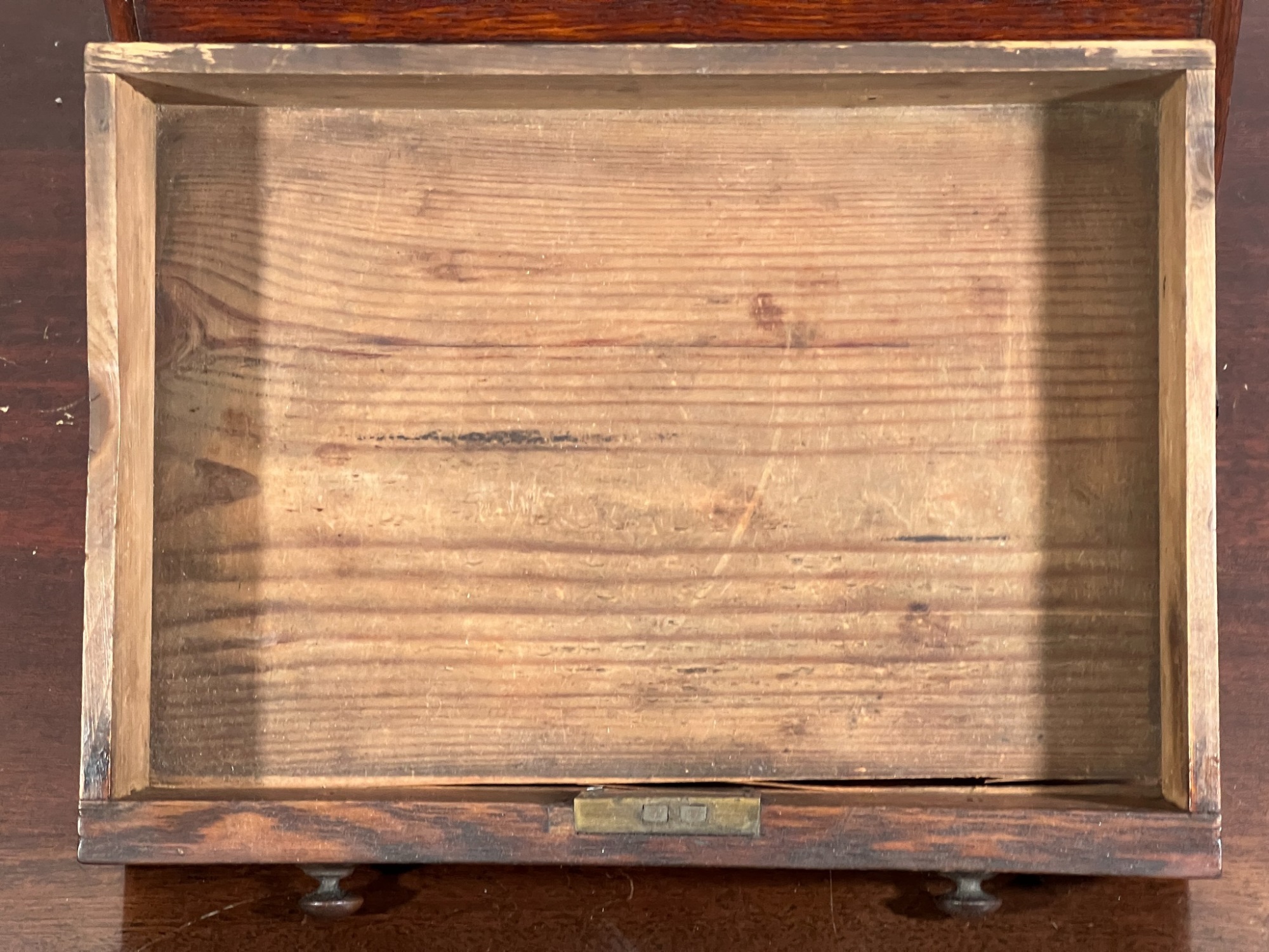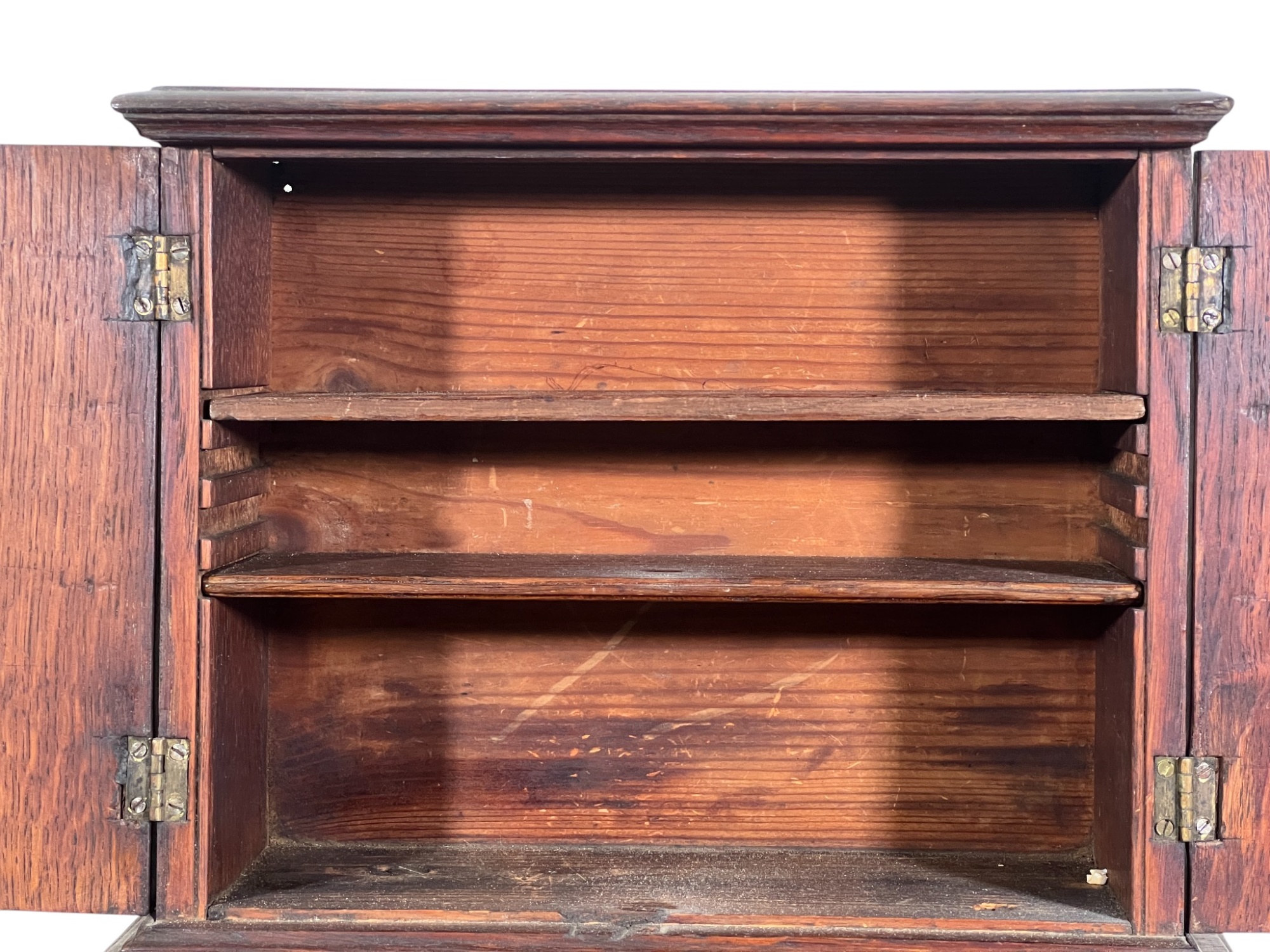 Upper case with (2) doors revealing (2) shelves, lower case with (4) graduated drawers. 23 1/2 x 12 1/4 x 8 3/4 inches. Condition: Good.
