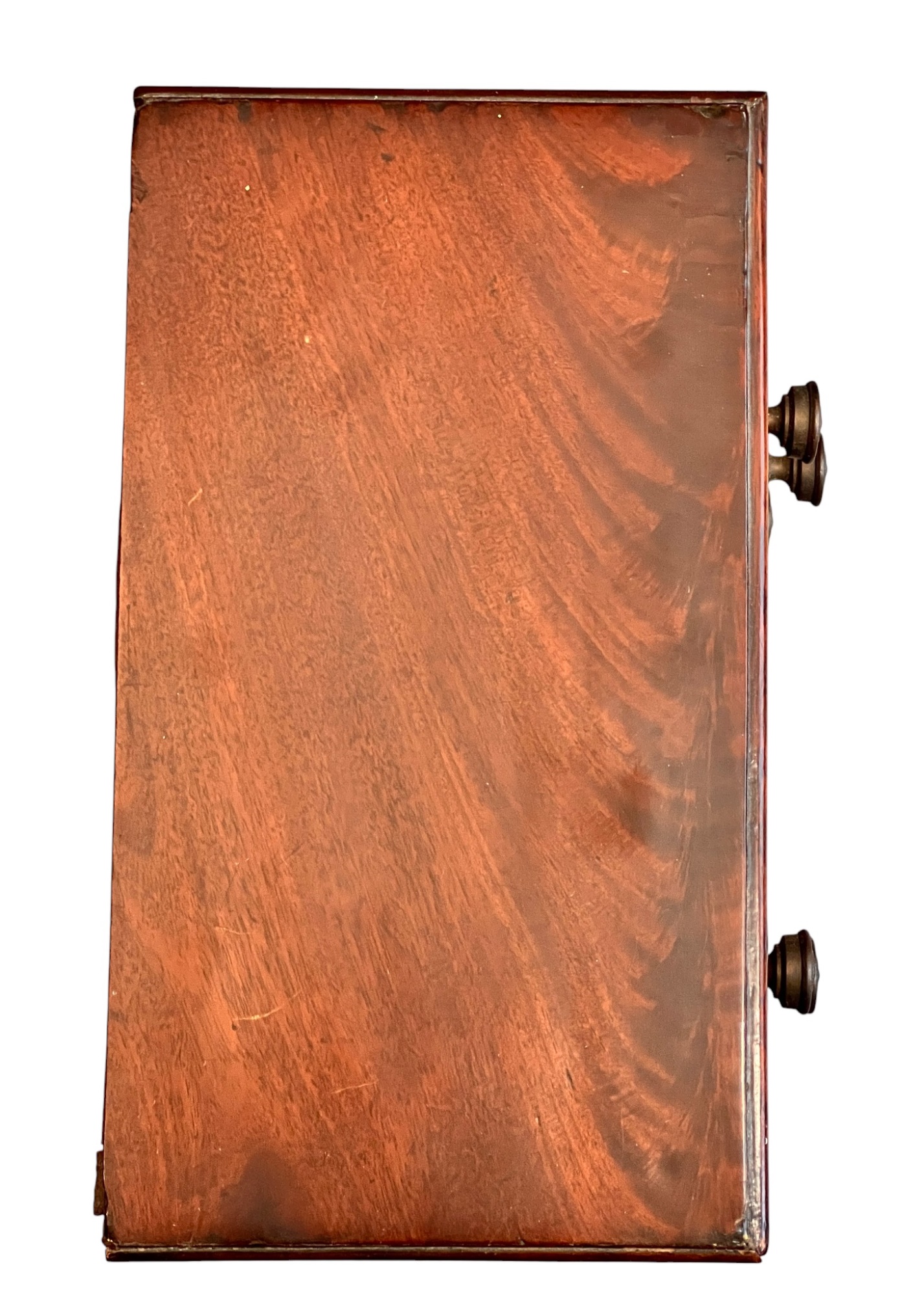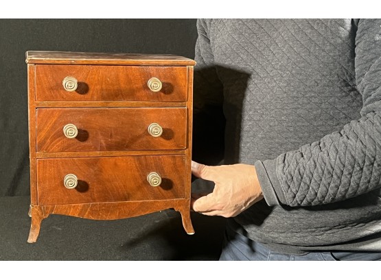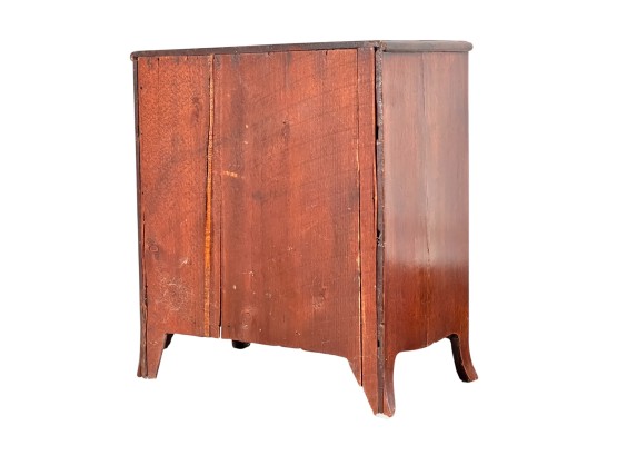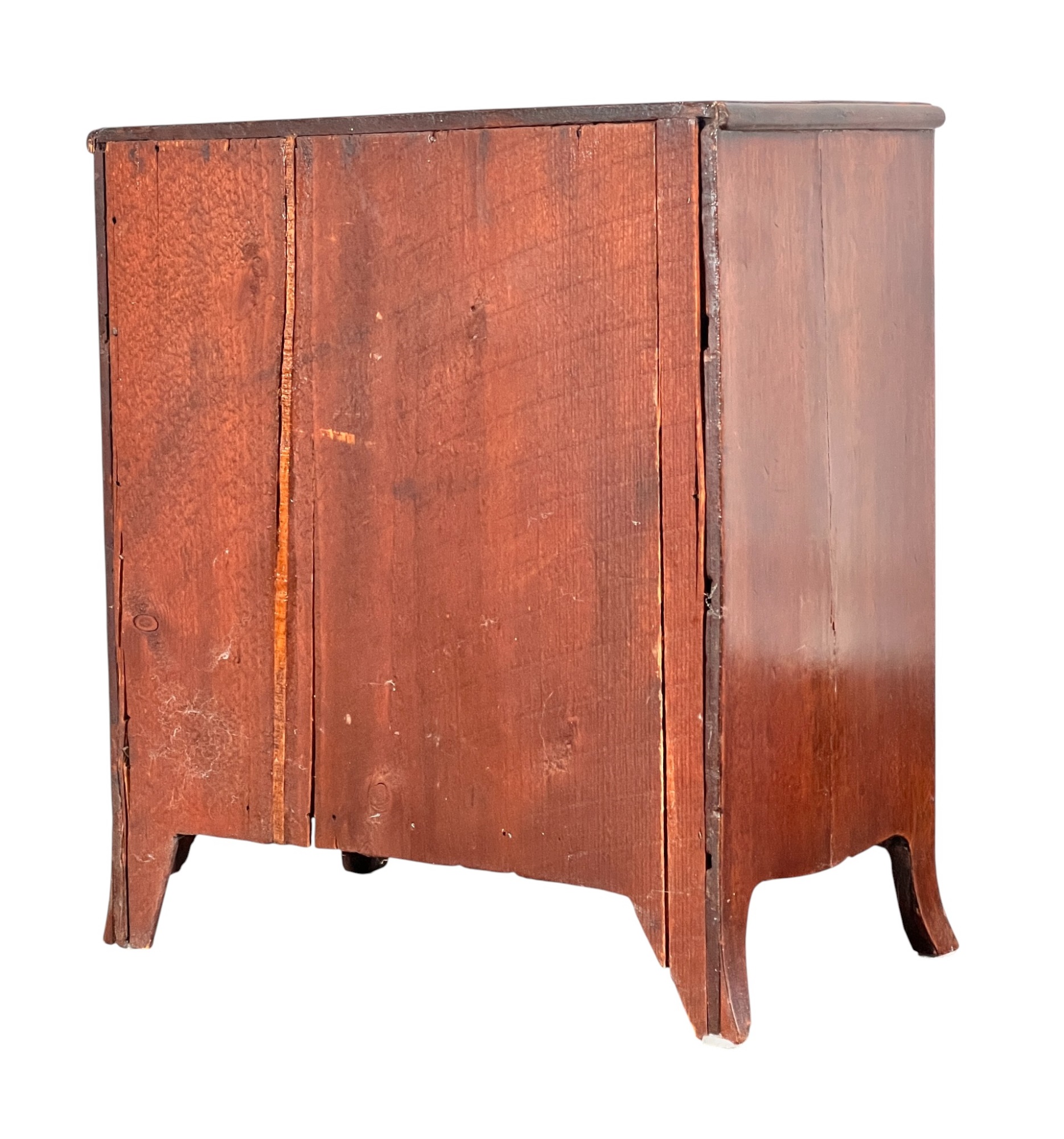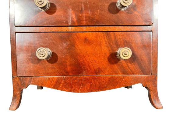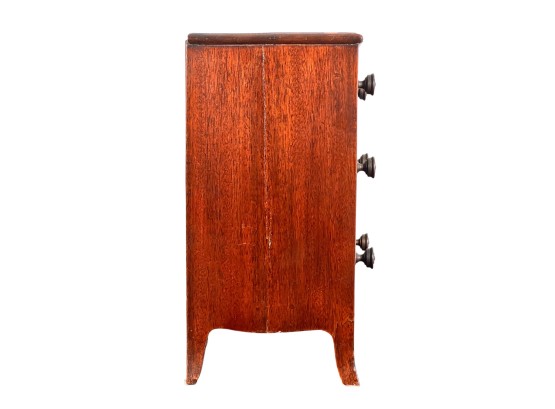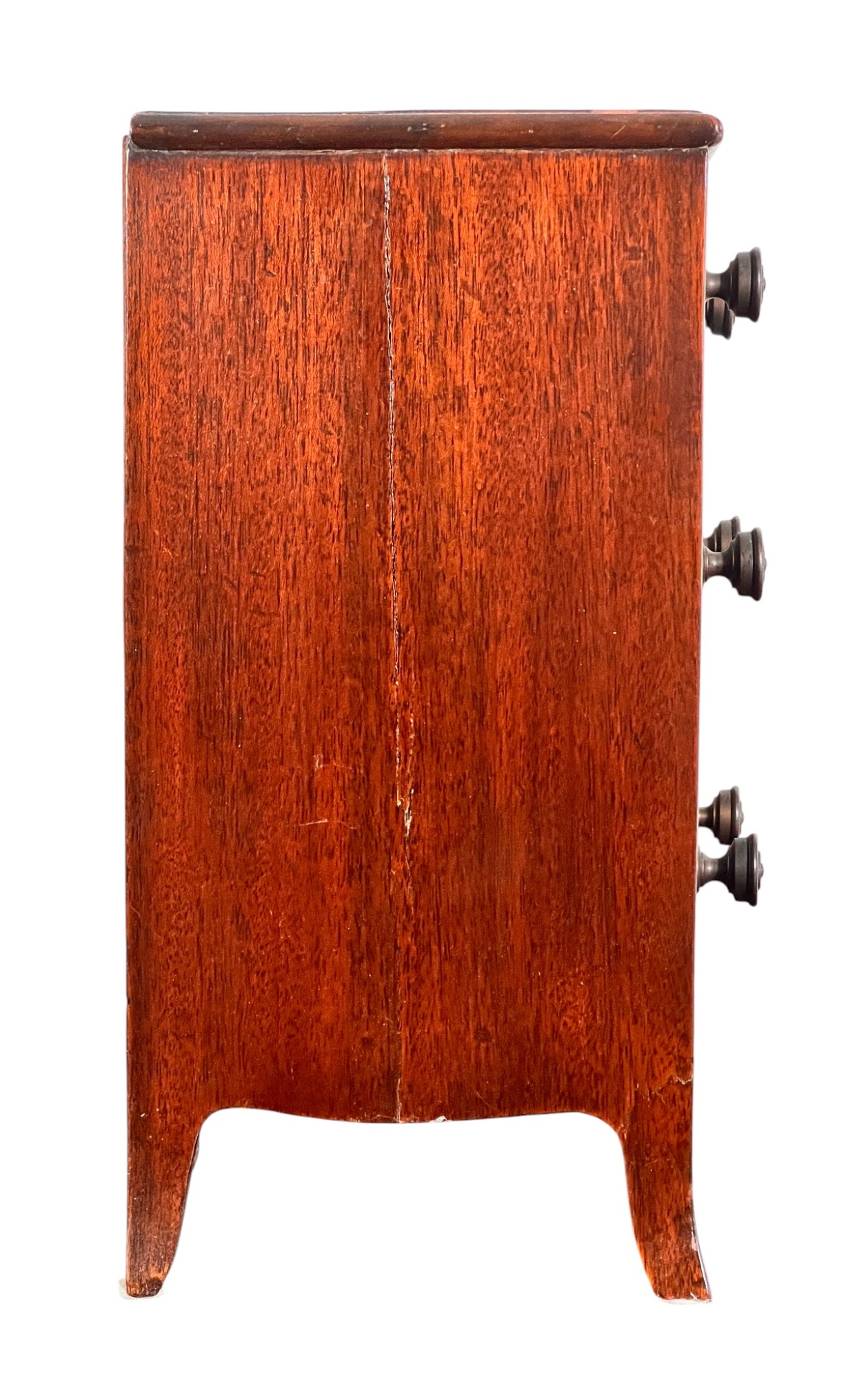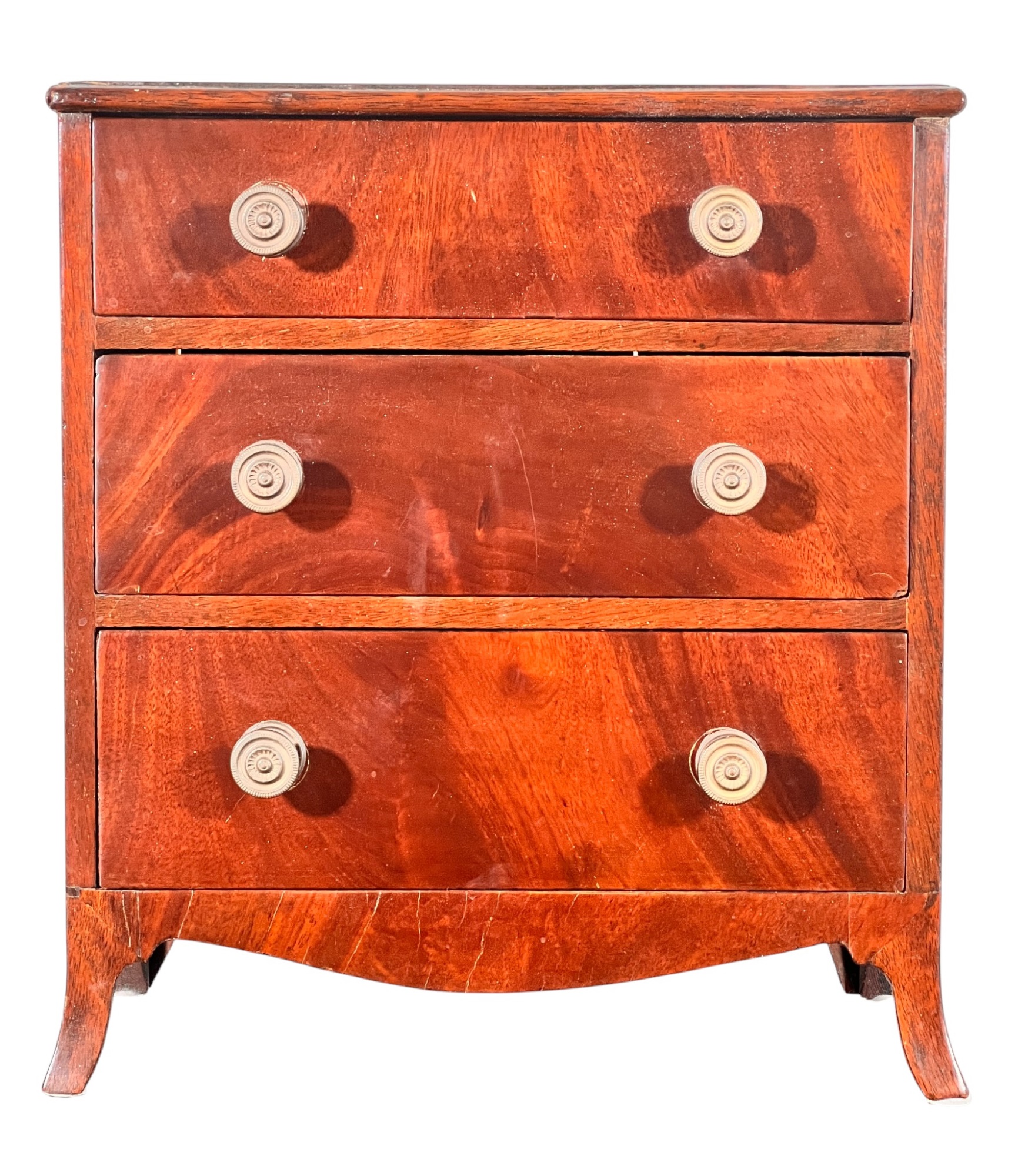 Miniature (19th c) figured mahogany chest of drawers with (3) graduated drawers, splayed legs, dovetail construction. 11 1/4 x 11 x 6 3/4 inches. Condition: Good, some veneer cracks.