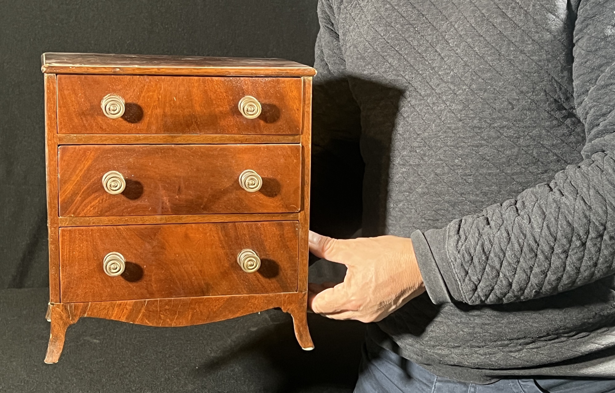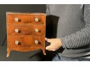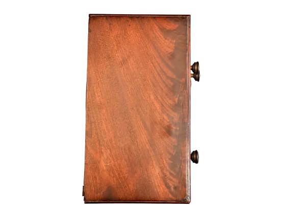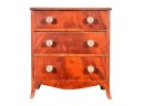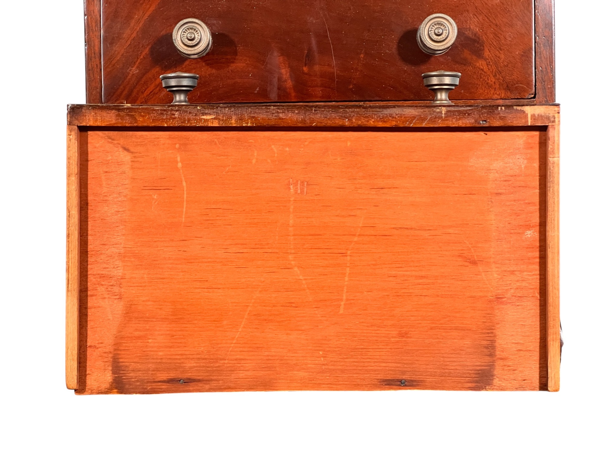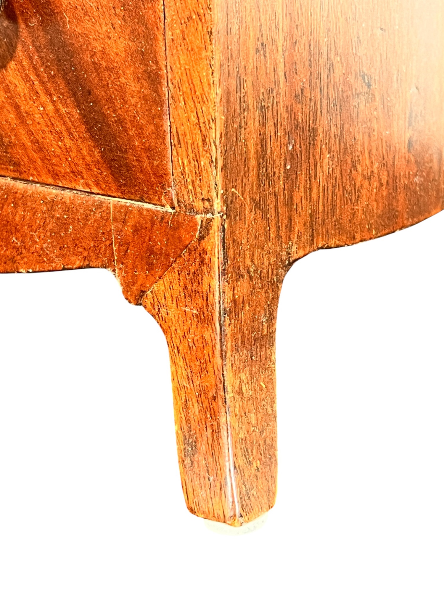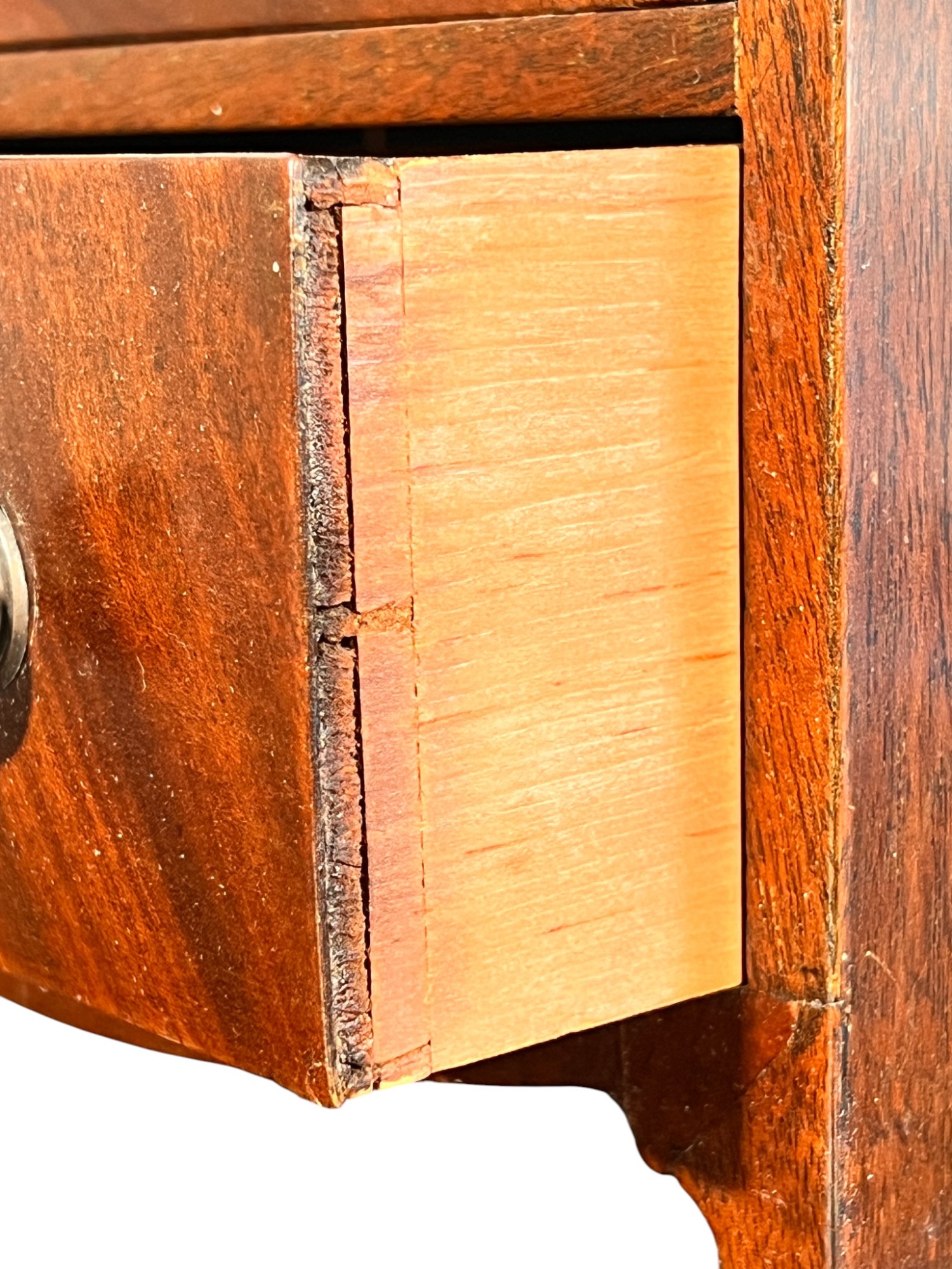Miniature (19th c) figured mahogany chest of drawers with (3) graduated drawers, splayed legs, dovetail construction. 11 1/4 x 11 x 6 3/4 inches. Condition: Good, some veneer cracks.