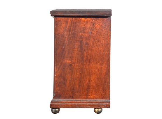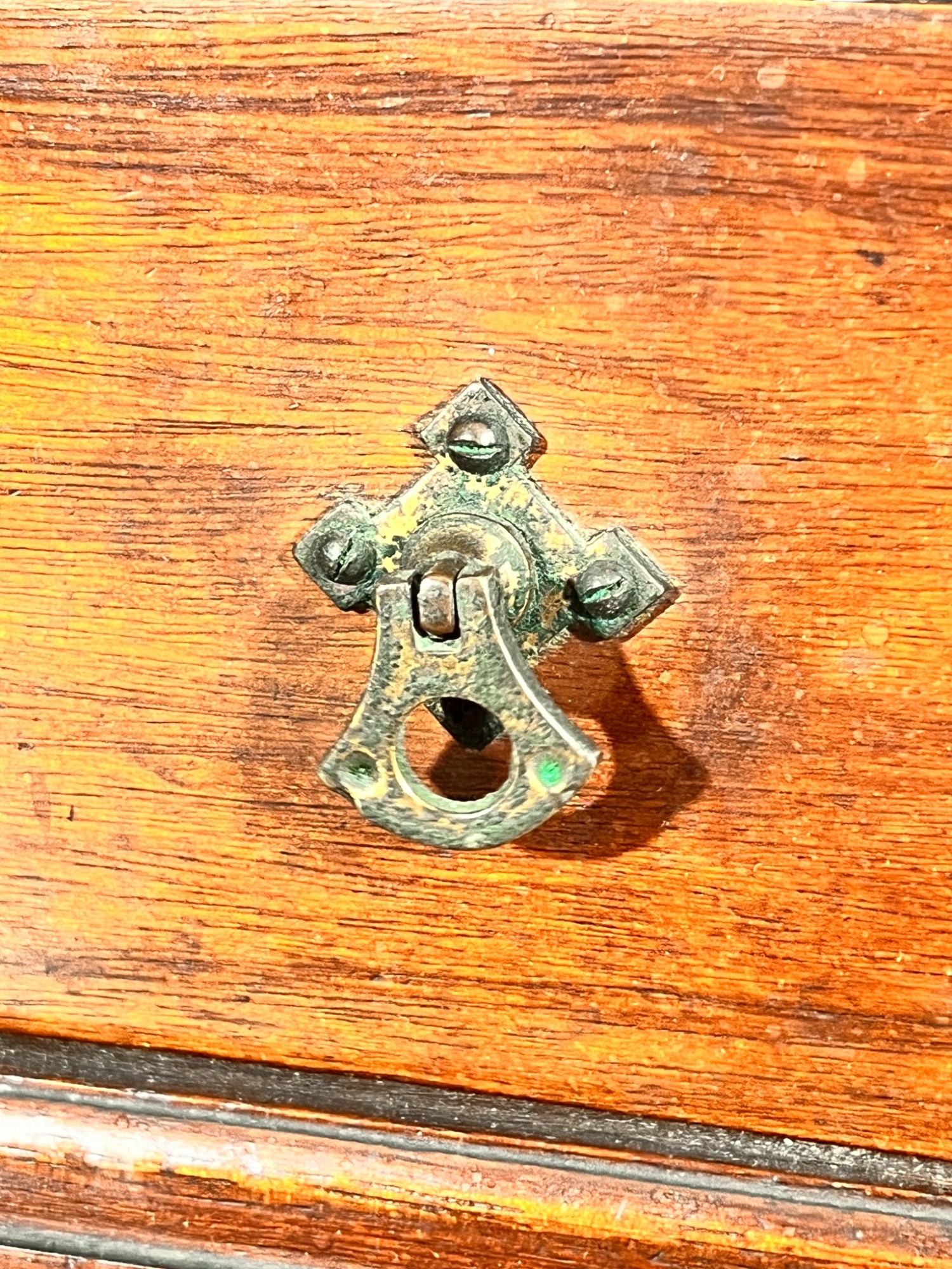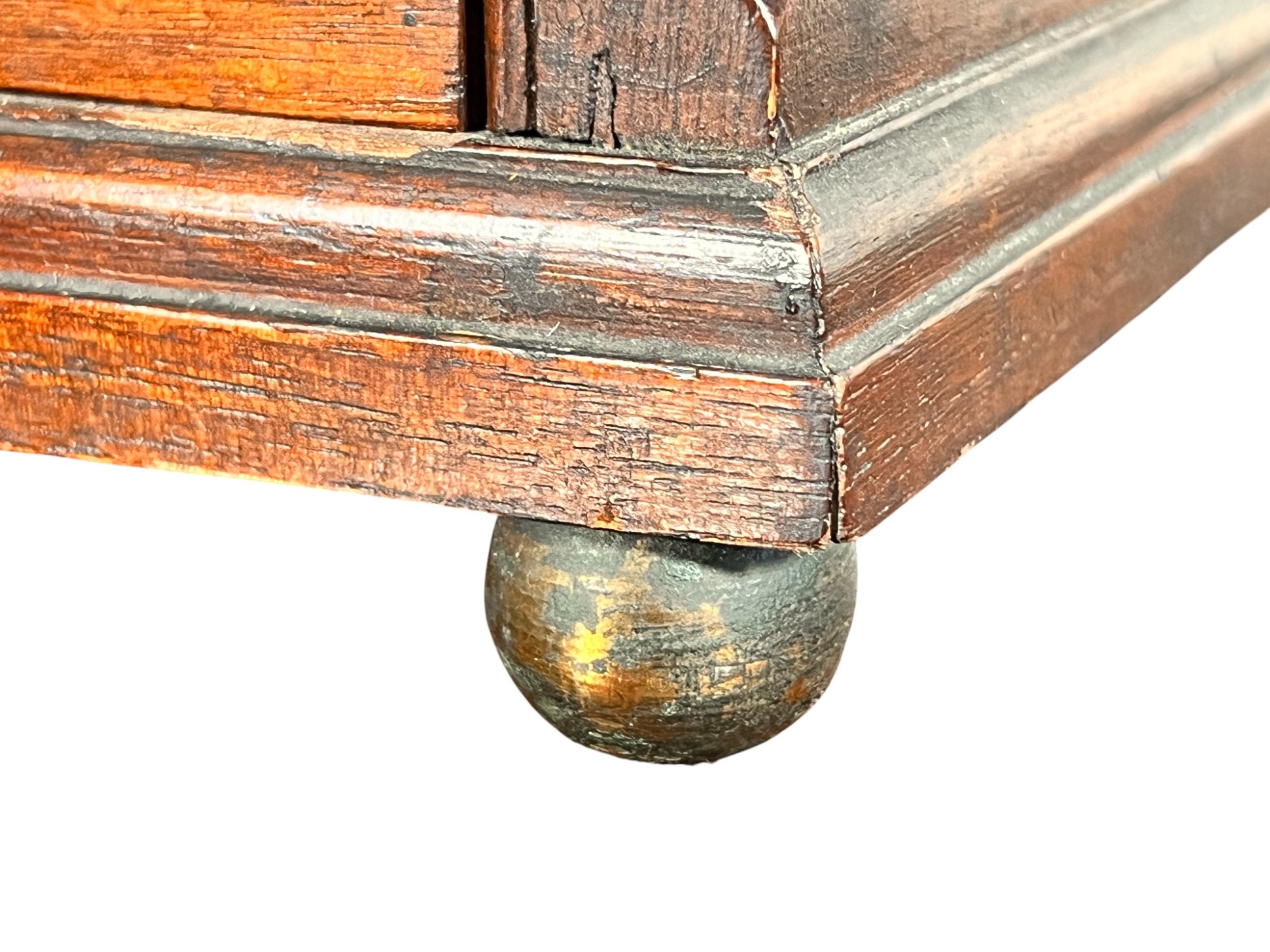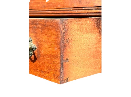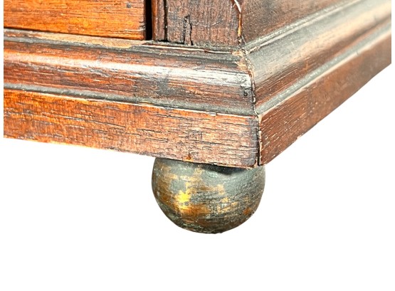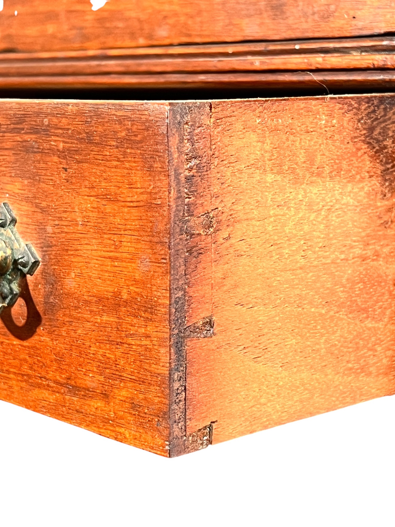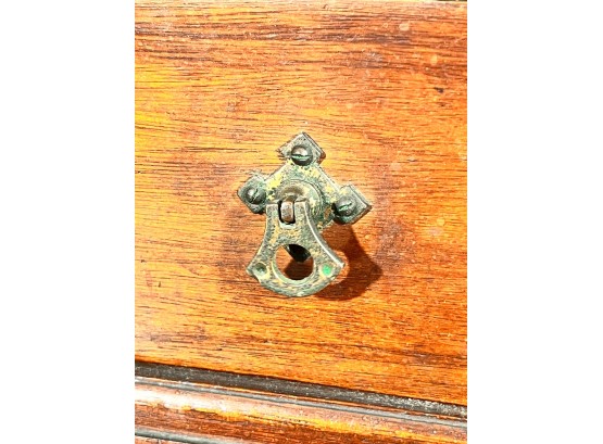 William & Mary style brass pulls, brass bun feet. 11 1/2 x 13 x 6 1/2 inches. Condition: Good.
