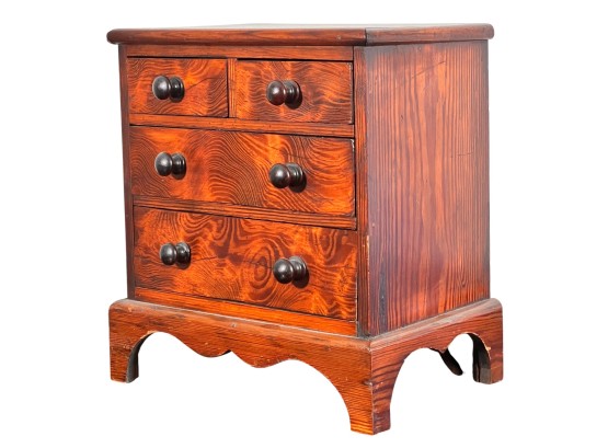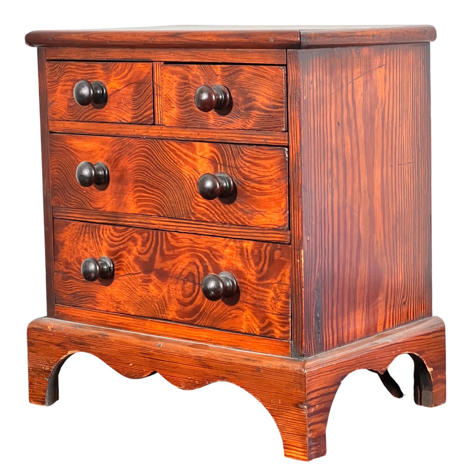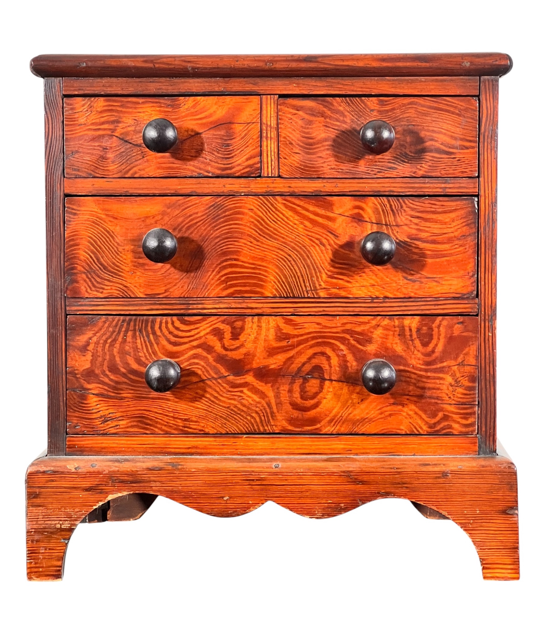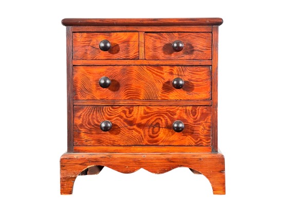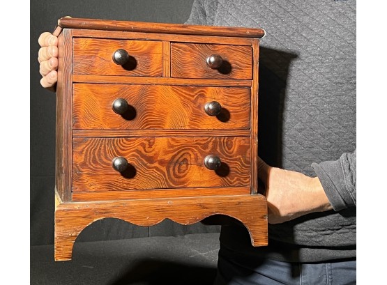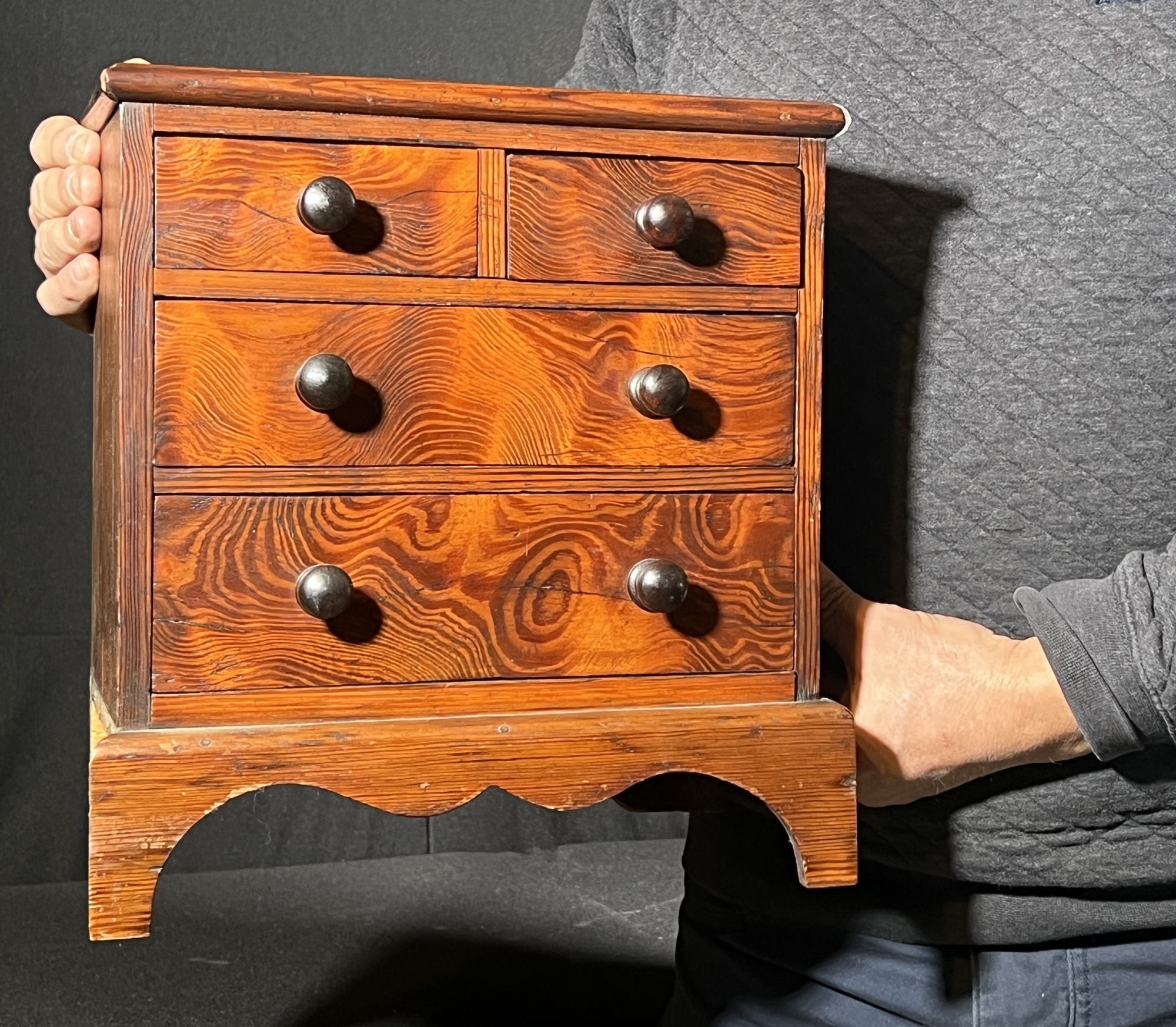 Miniature (19th c) chest of drawers with interesting wavy wood grain, interior signed & dated "William Mee May 22nd 1878". Found in NJ. 12 1/2 x 11 3/4 x 7 3/4 inches. Condition: Good.