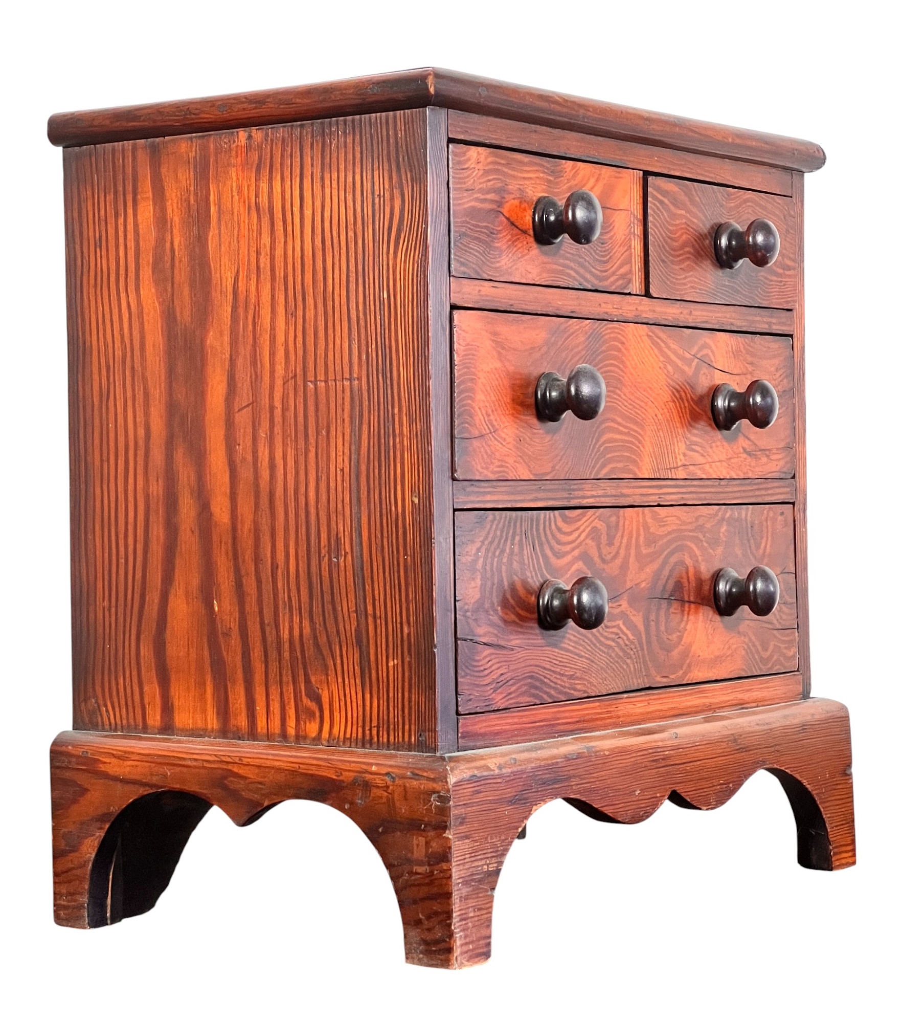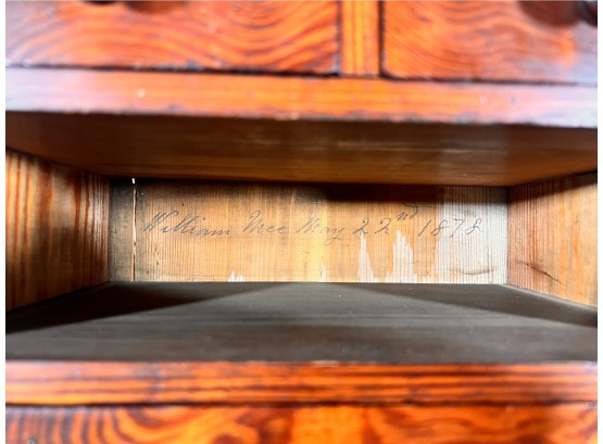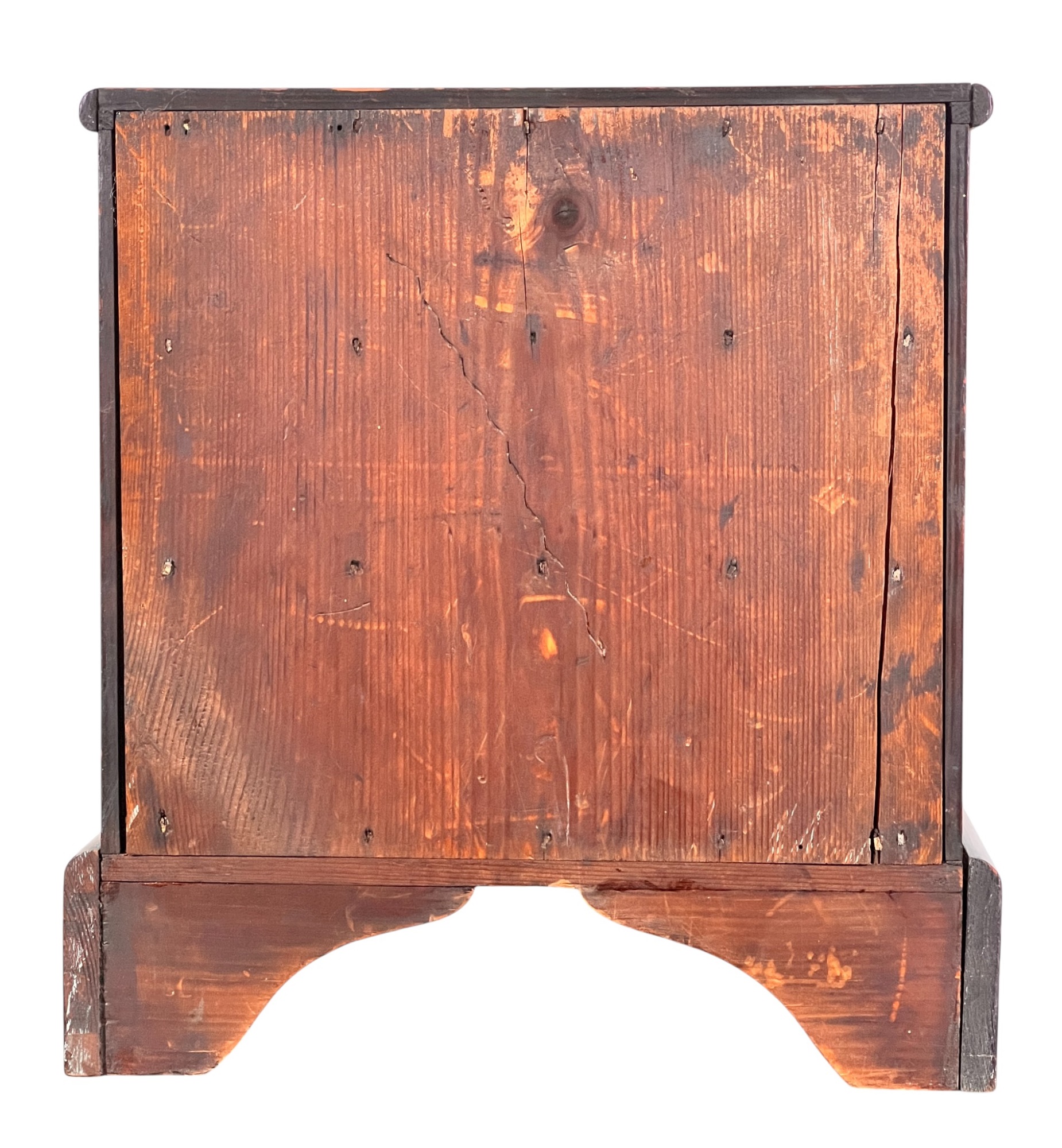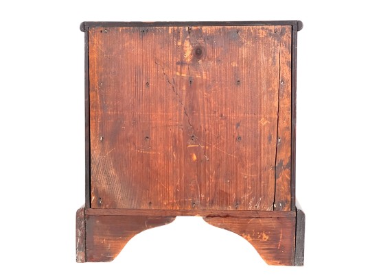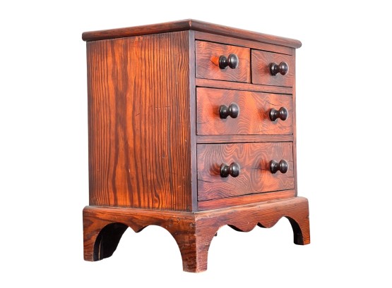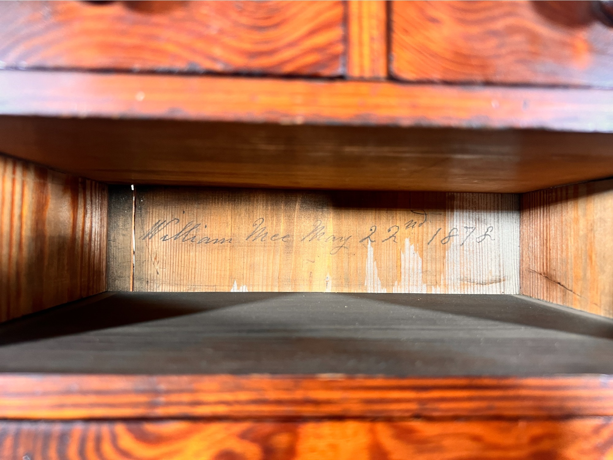 Miniature (19th c) chest of drawers with interesting wavy wood grain, interior signed & dated "William Mee May 22nd 1878". Found in NJ. 12 1/2 x 11 3/4 x 7 3/4 inches. Condition: Good.