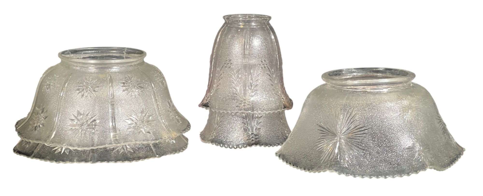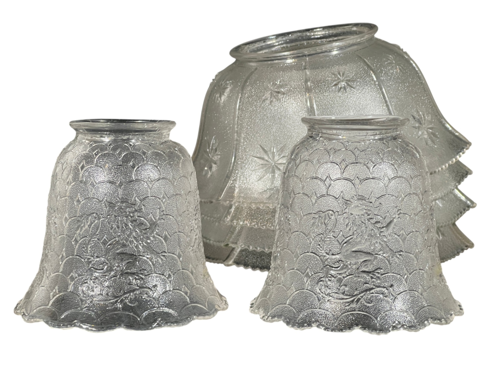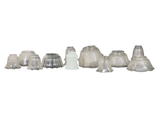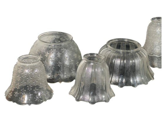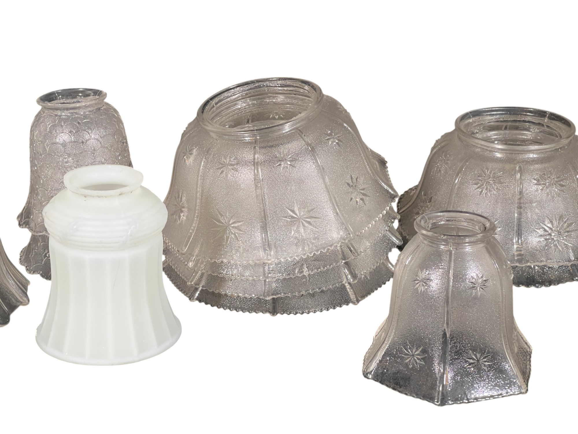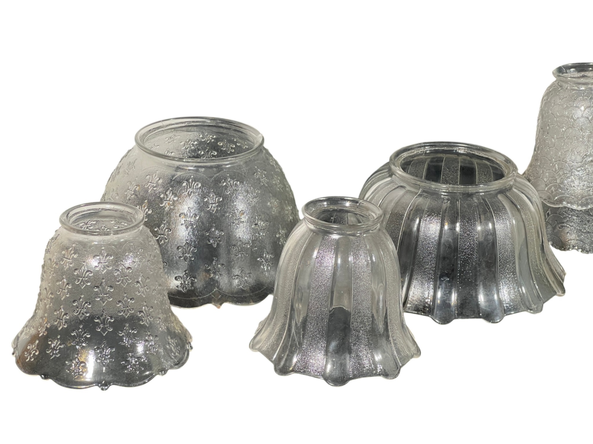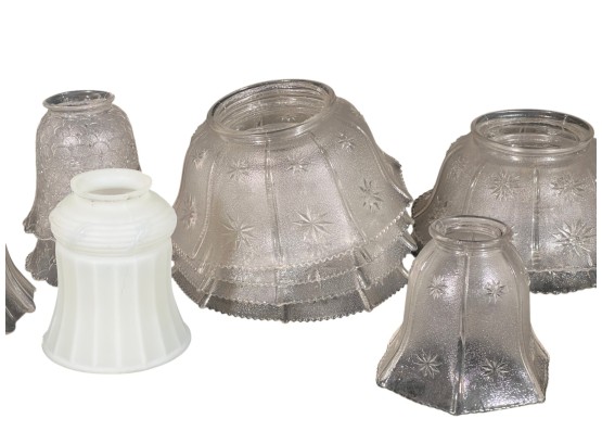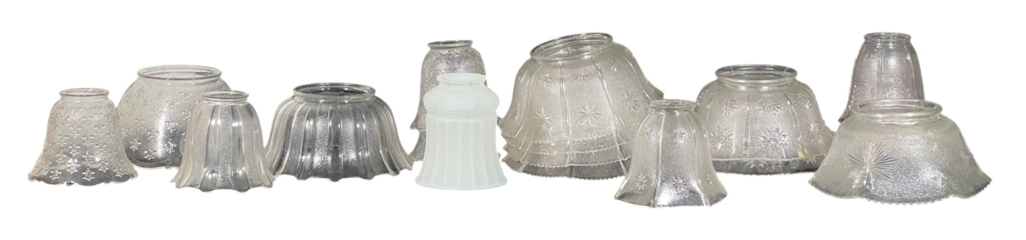 Miscellaneous group of early (20th c) pressed glass light fixture shades with various patterns including armorial lion, fleur-de-lis, stars, and flora. 4 x 7 3/4 inches. Condition: Good. Temp No 8885