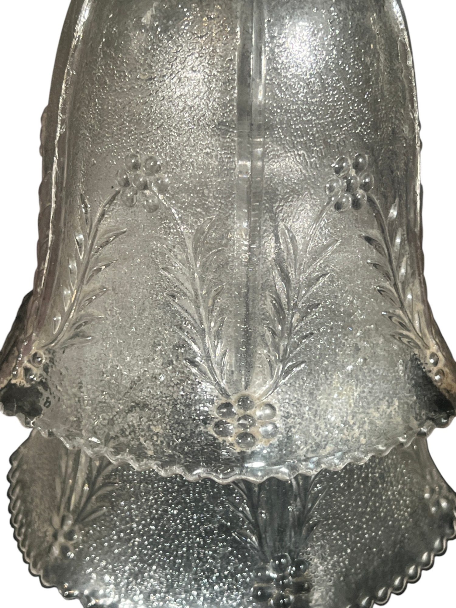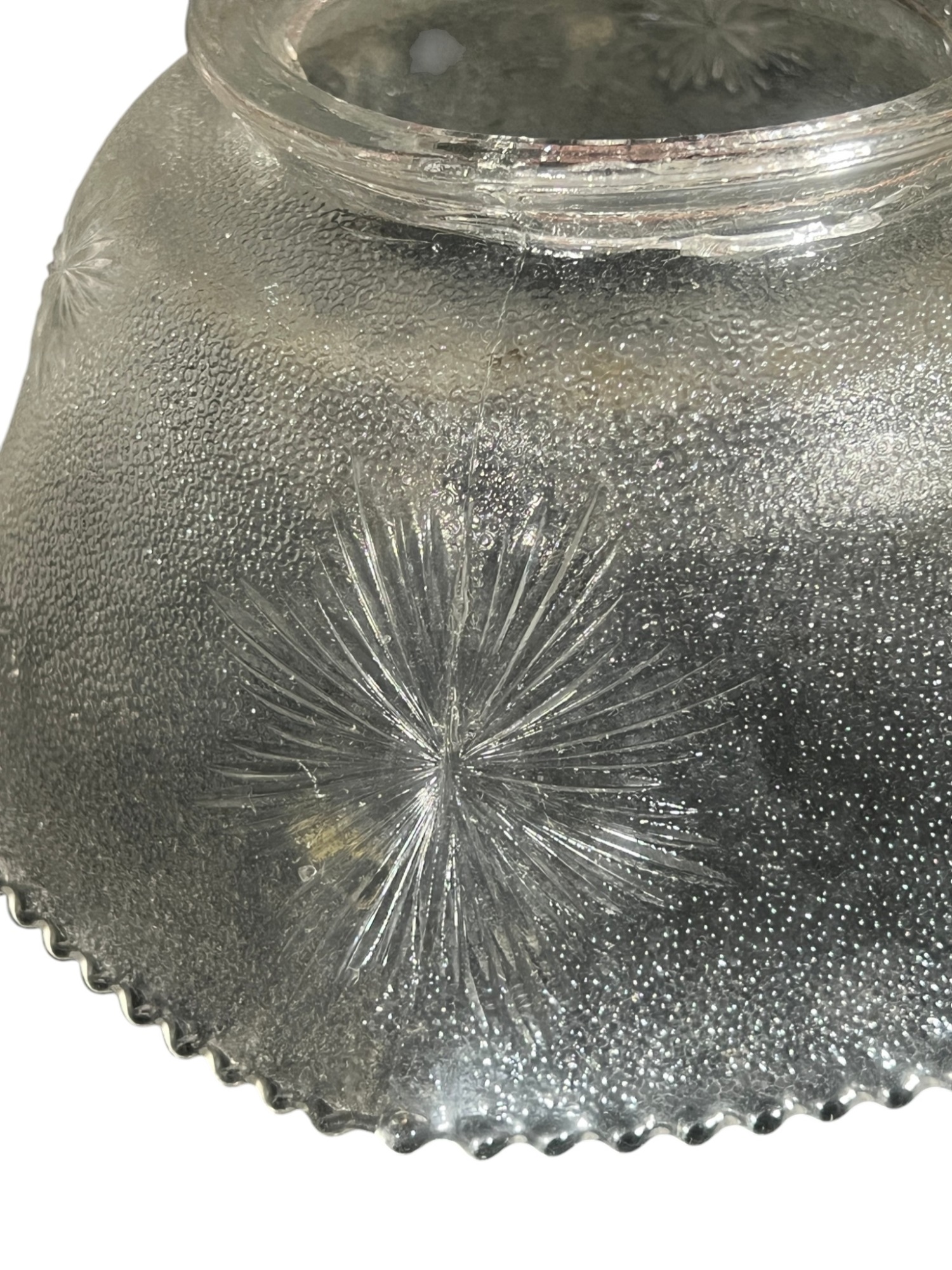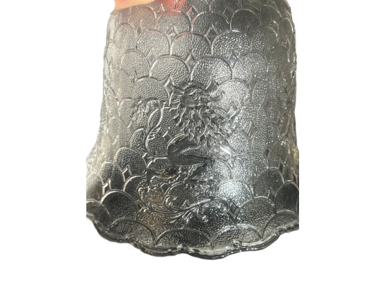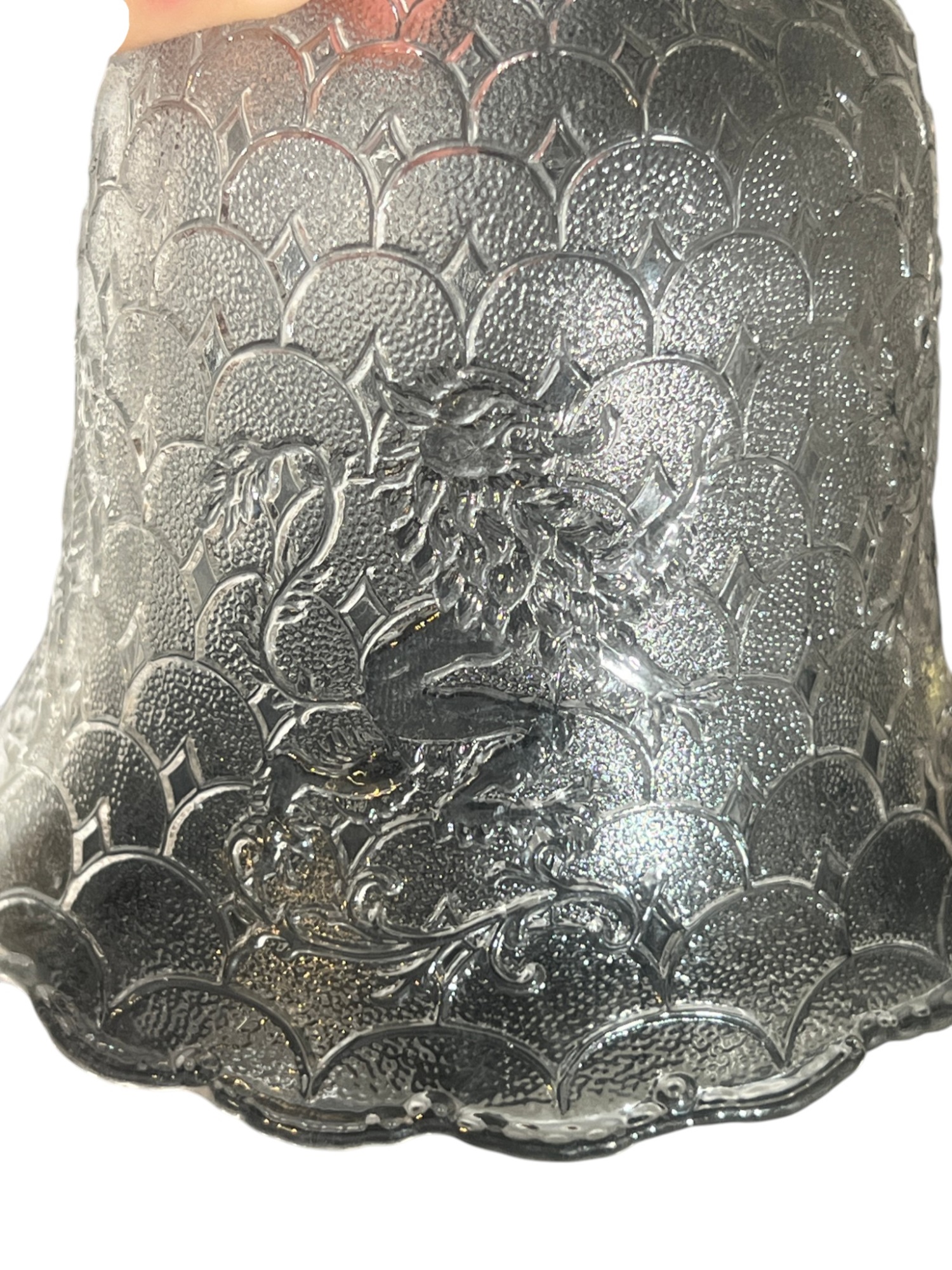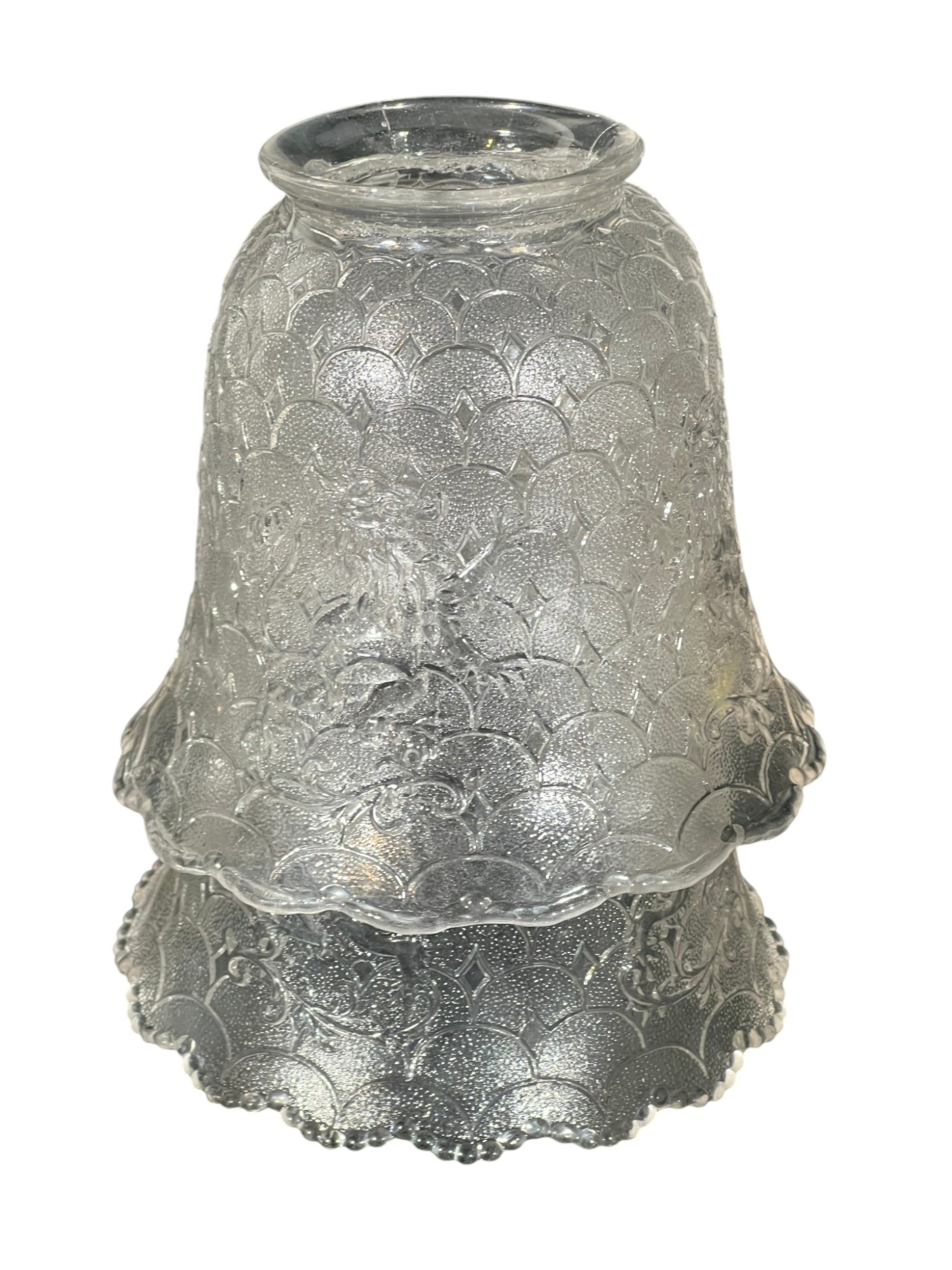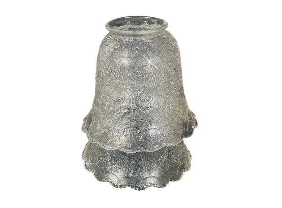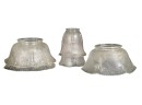 Miscellaneous group of early (20th c) pressed glass light fixture shades with various patterns including armorial lion, fleur-de-lis, stars, and flora. 4 x 7 3/4 inches. Condition: Good. Temp No 8885