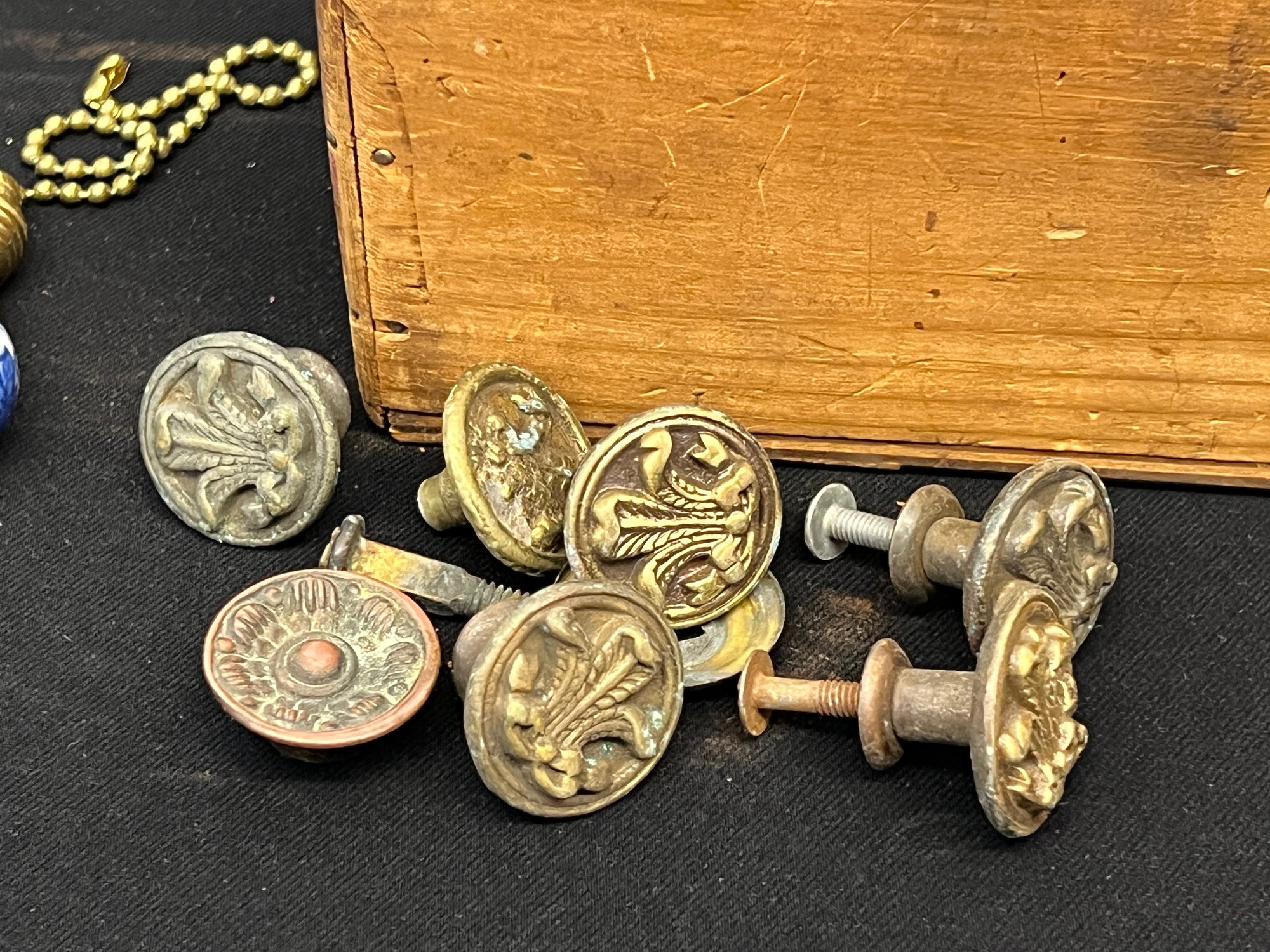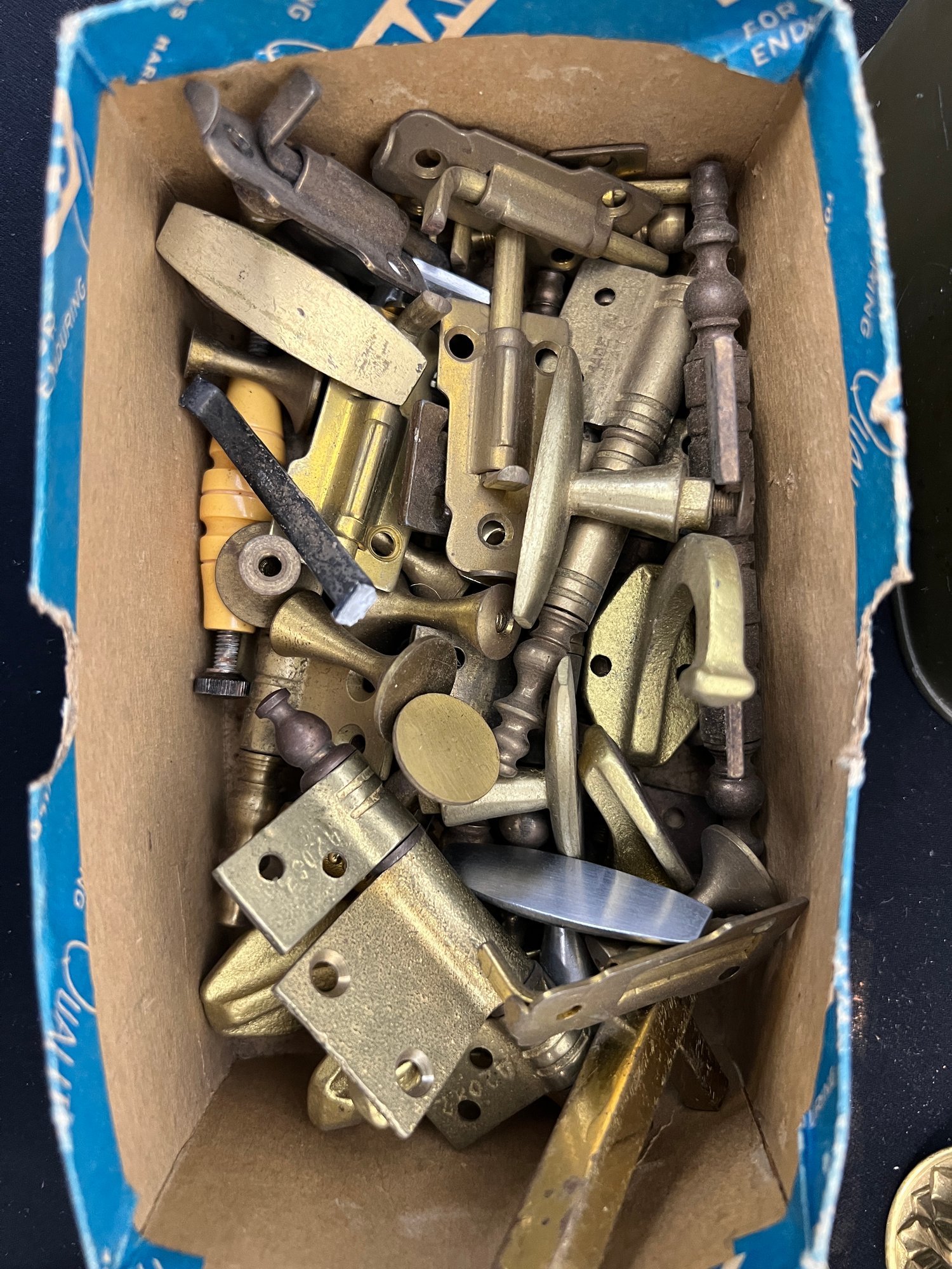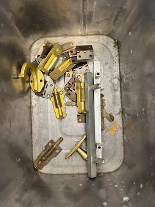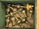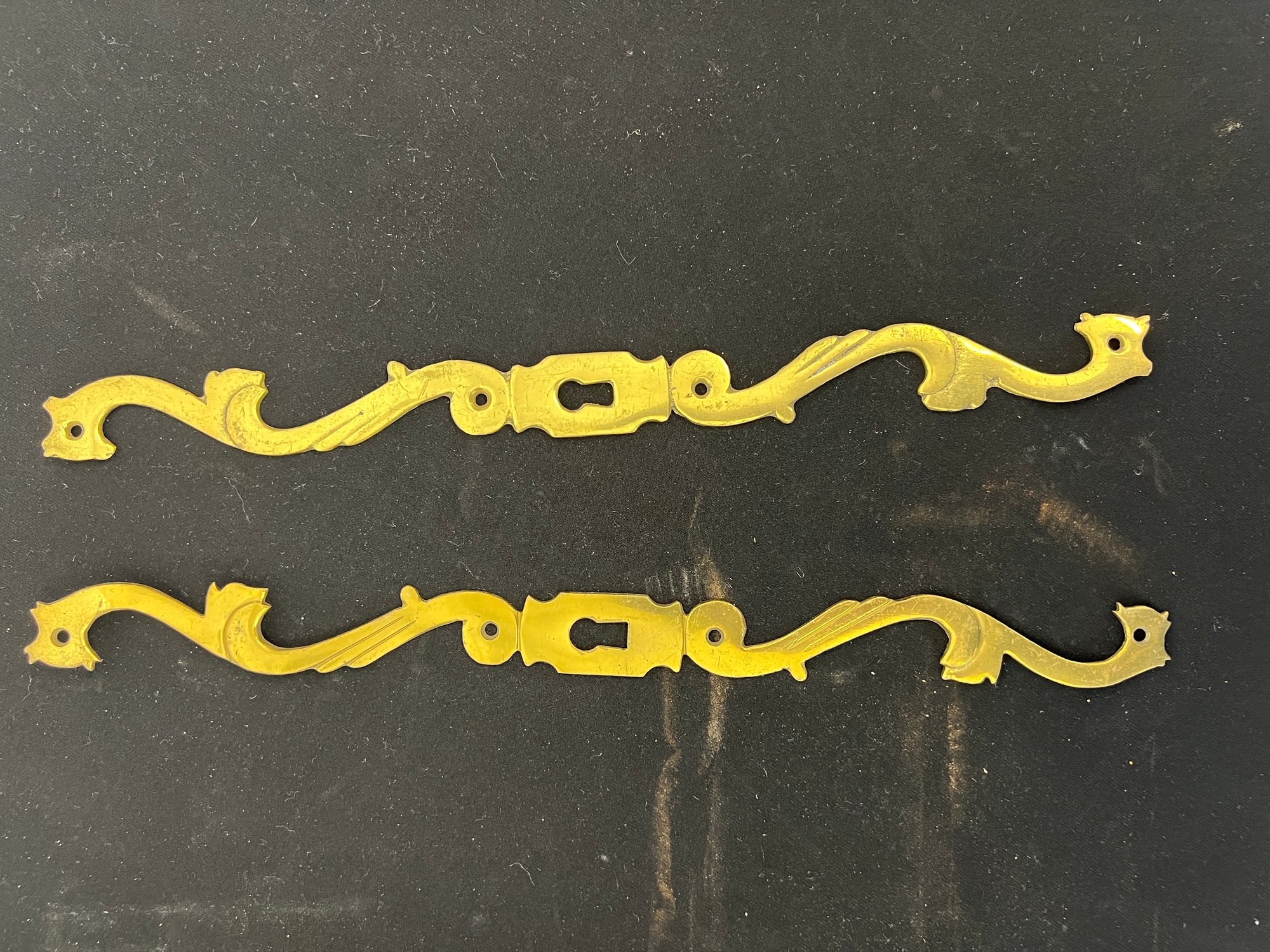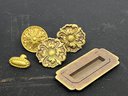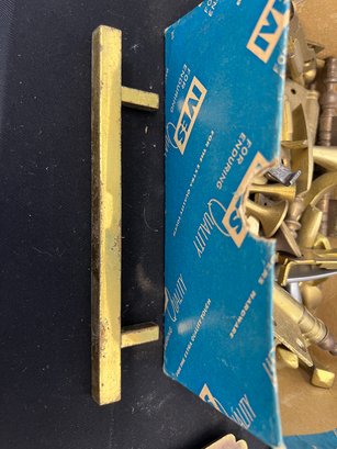Lamp finials, brass hinges, lamp harps, bed hardware, shade pulls, drawer pulls, etc. Please see photos. Brass door escutcheon measures 13 1/4 inches.