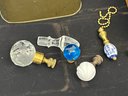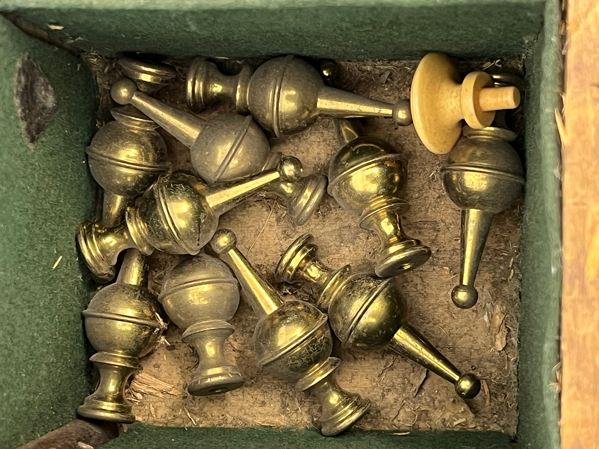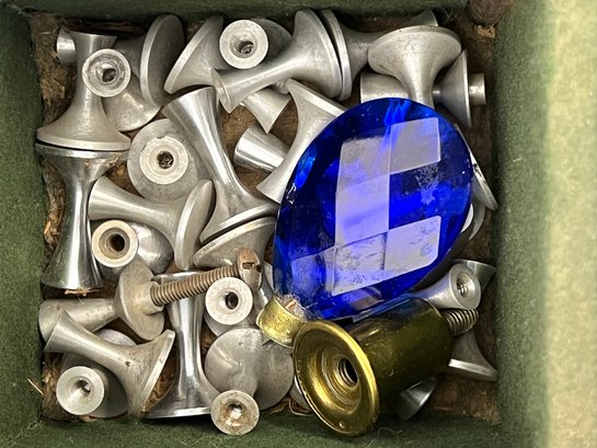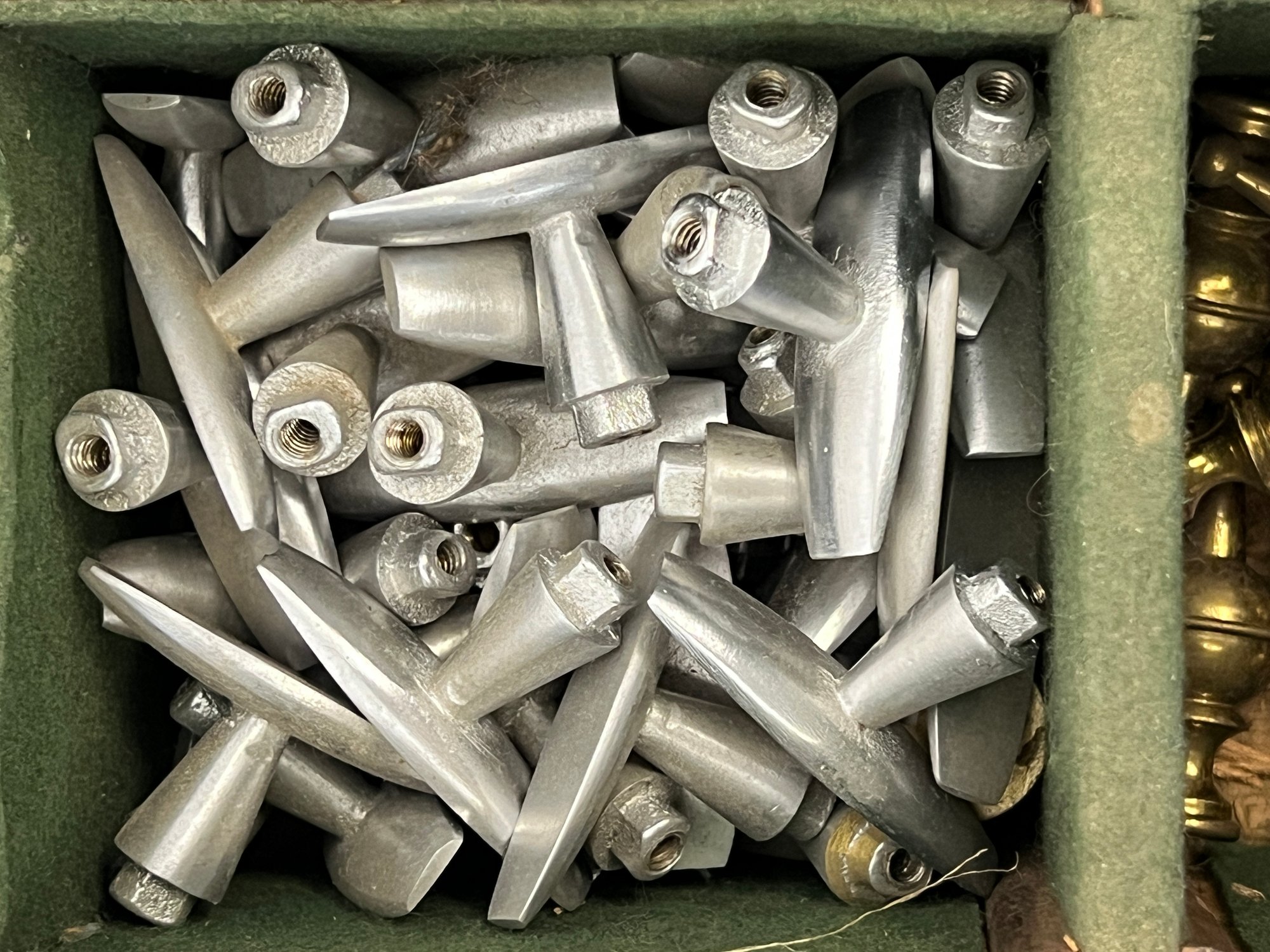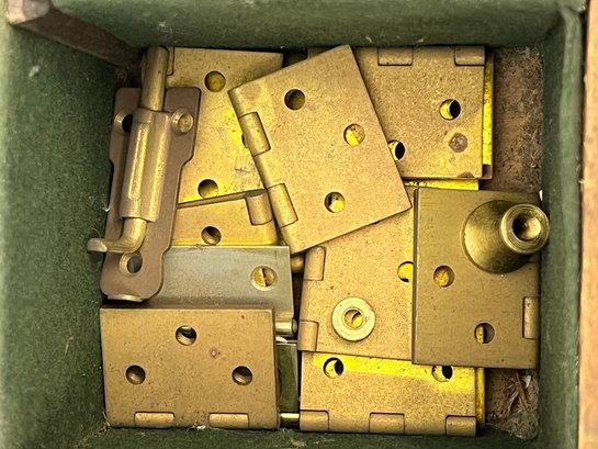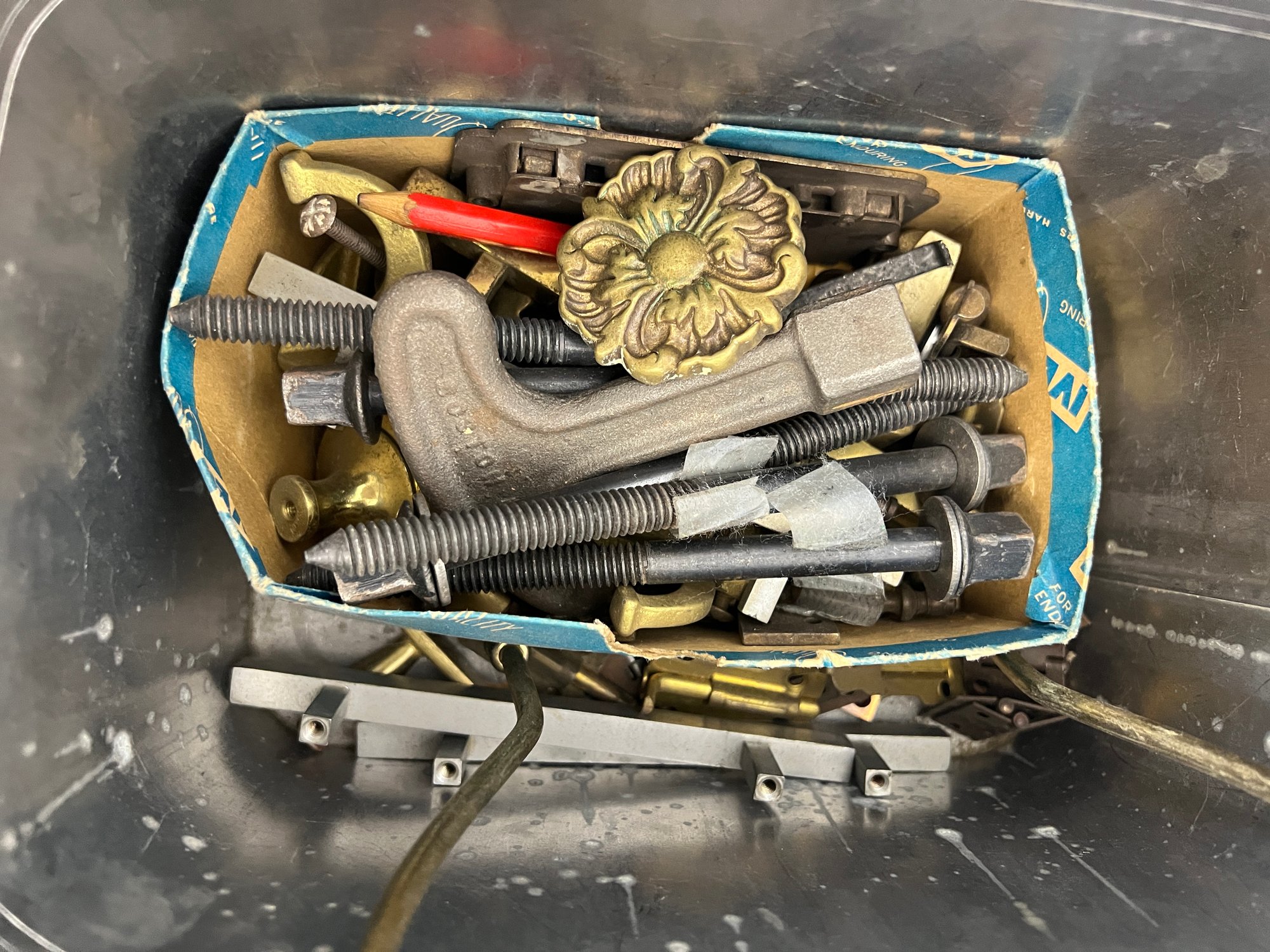 Lamp finials, brass hinges, lamp harps, bed hardware, shade pulls, drawer pulls, etc. Please see photos. Brass door escutcheon measures 13 1/4 inches.