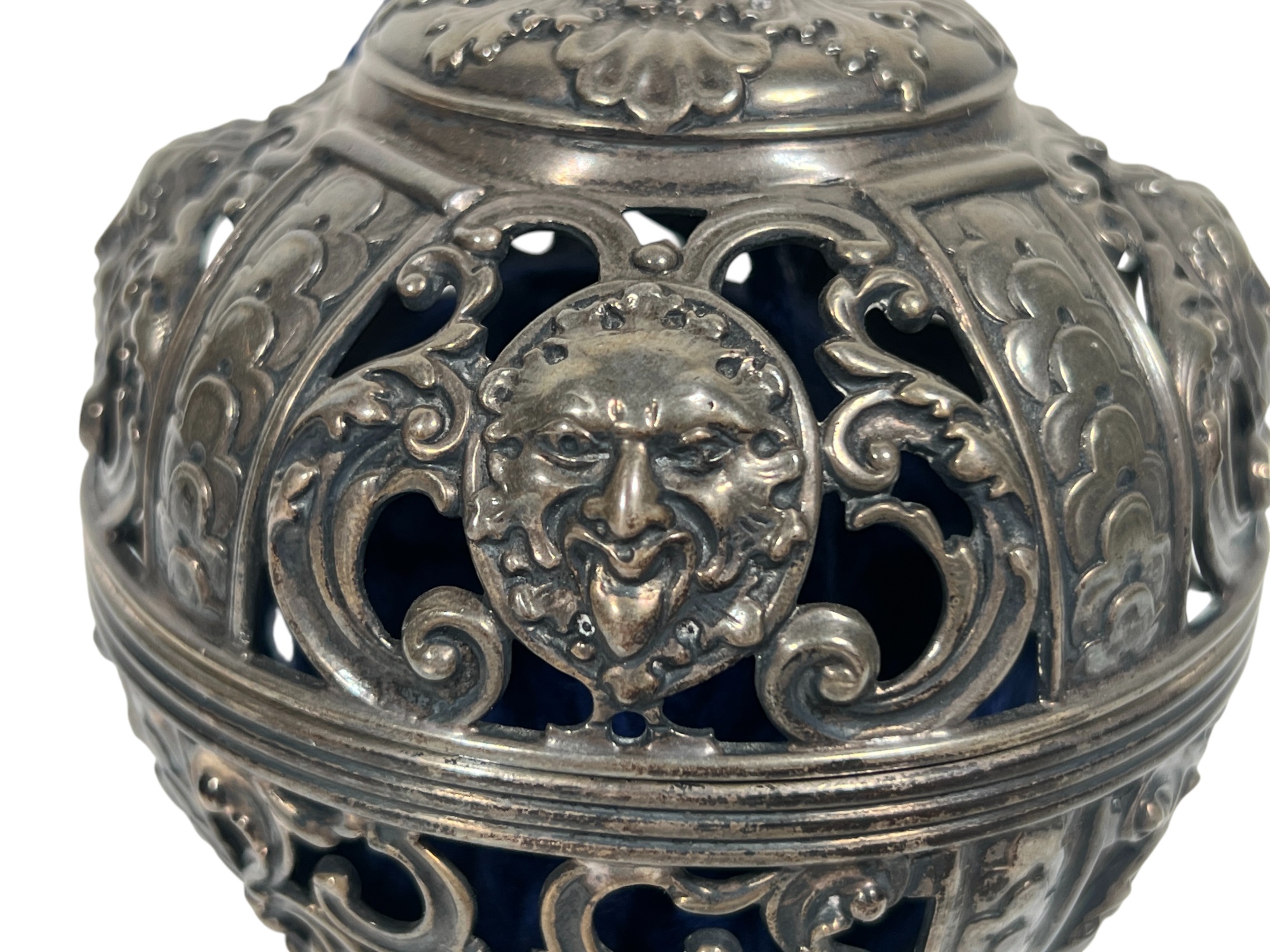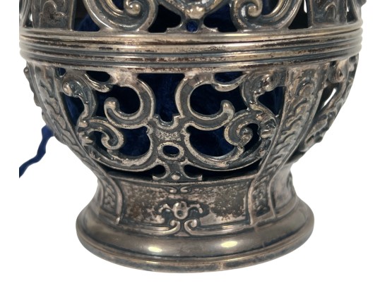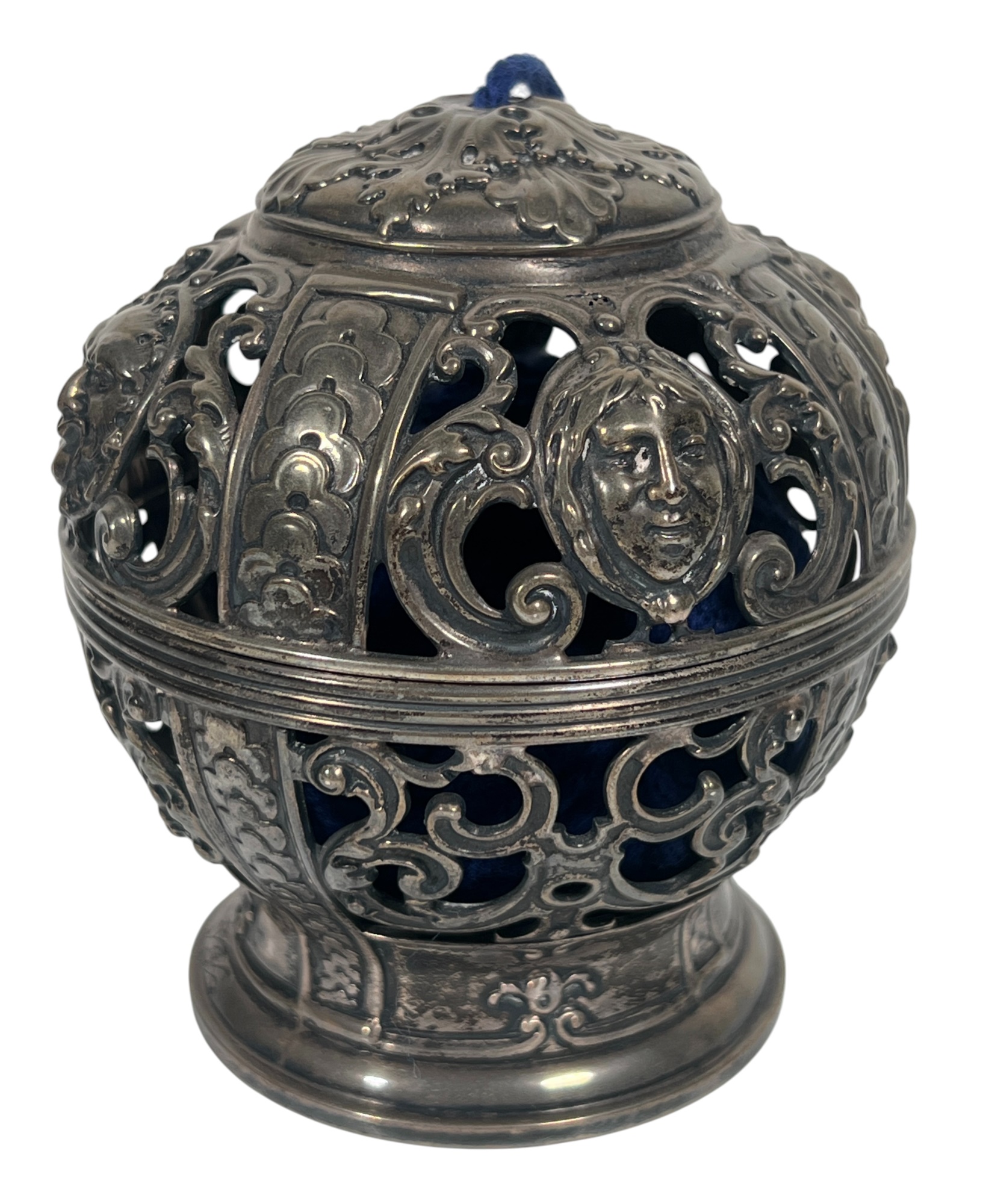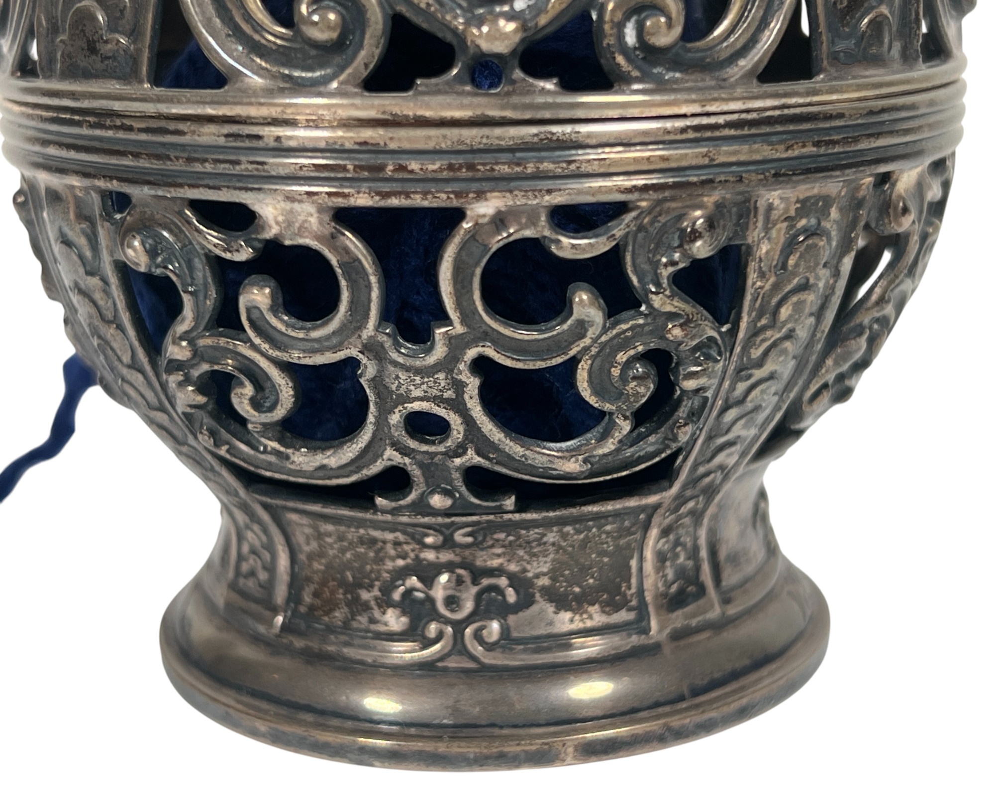Beautiful Gorham Art Nouveau pierced sterling yarn dispenser with grotesque mascarons, acanthus, and fish scaling. 3 inches. 6.56 ozt. Condition: Good. Temp No 8592