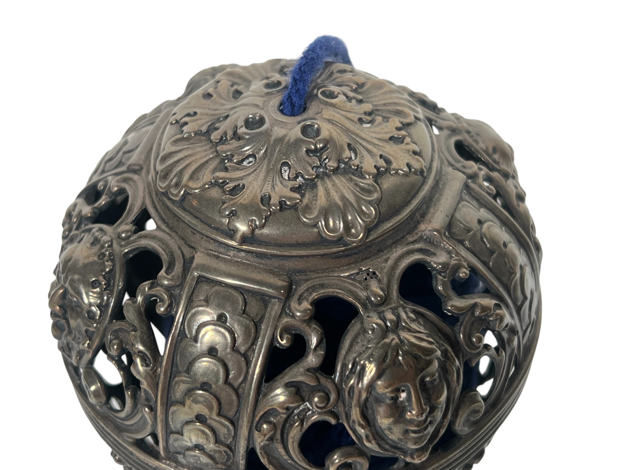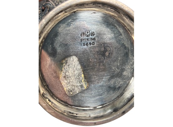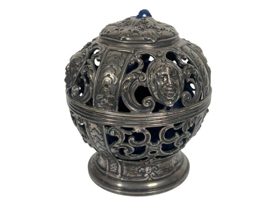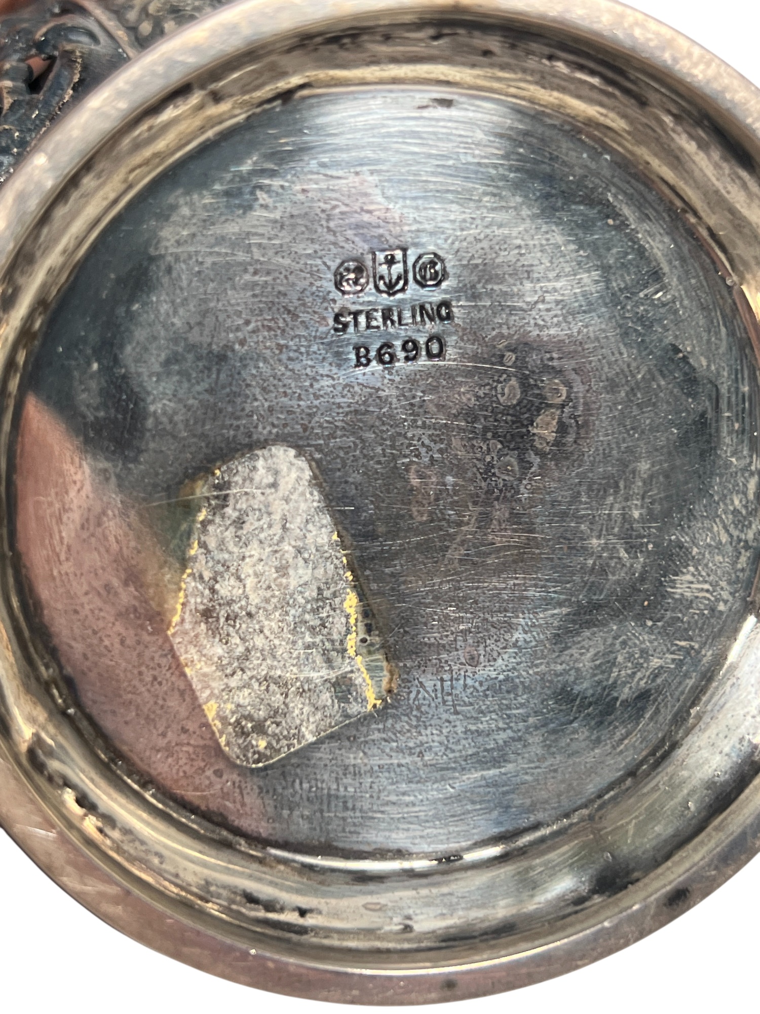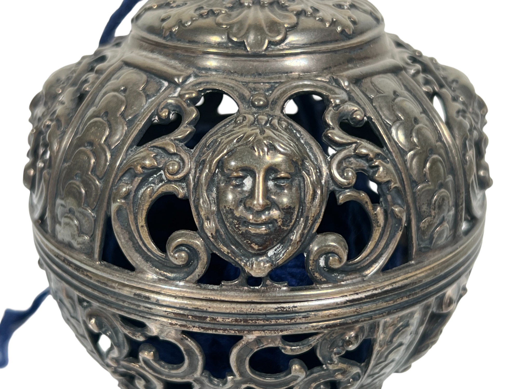 Beautiful Gorham Art Nouveau pierced sterling yarn dispenser with grotesque mascarons, acanthus, and fish scaling. 3 inches. 6.56 ozt. Condition: Good. Temp No 8592
