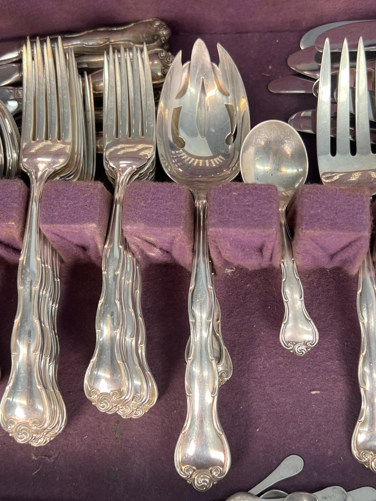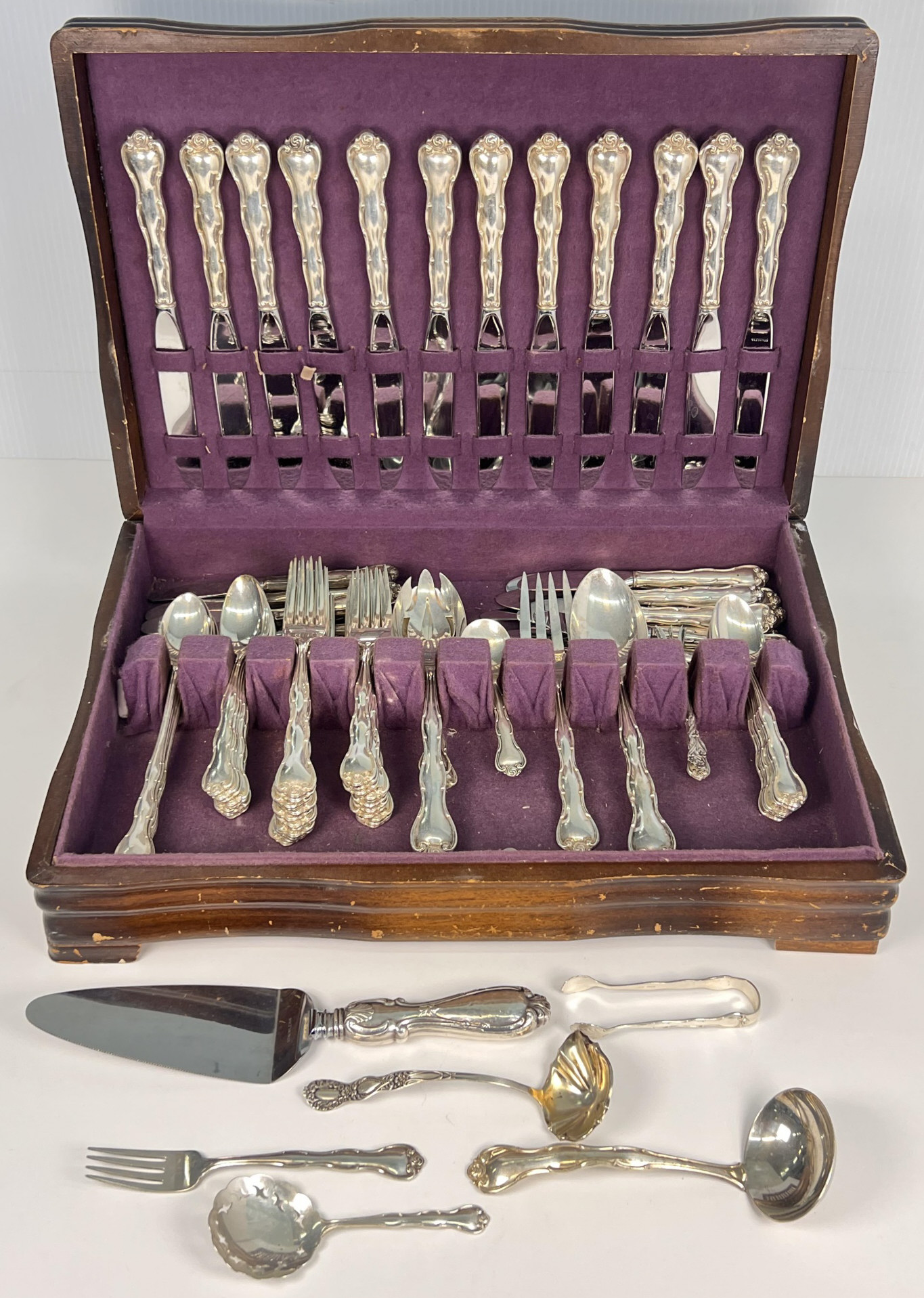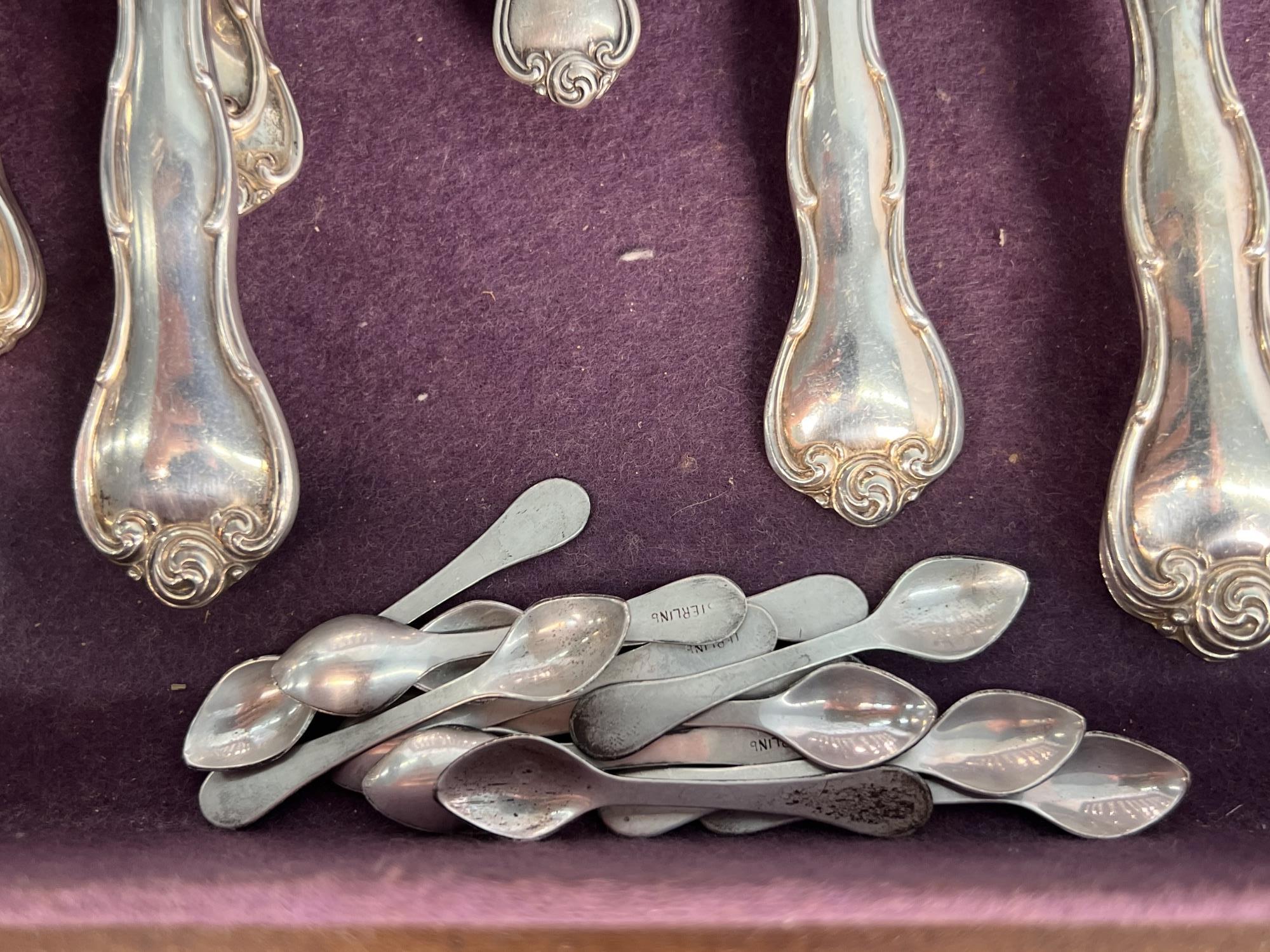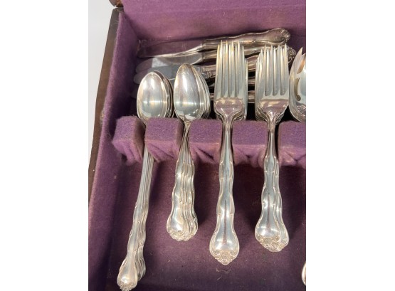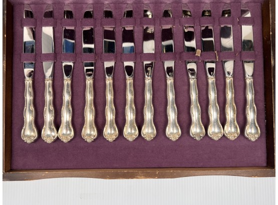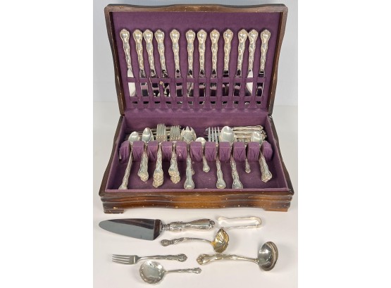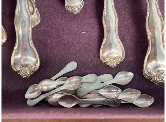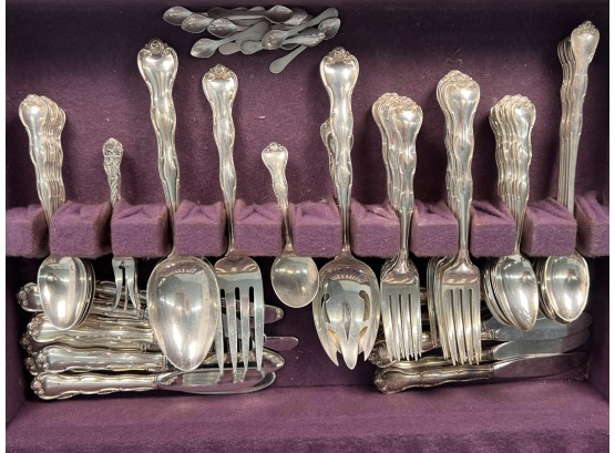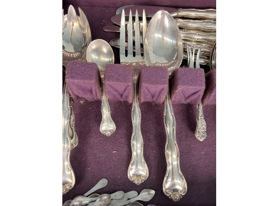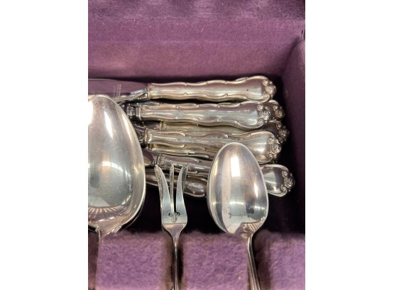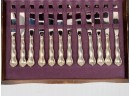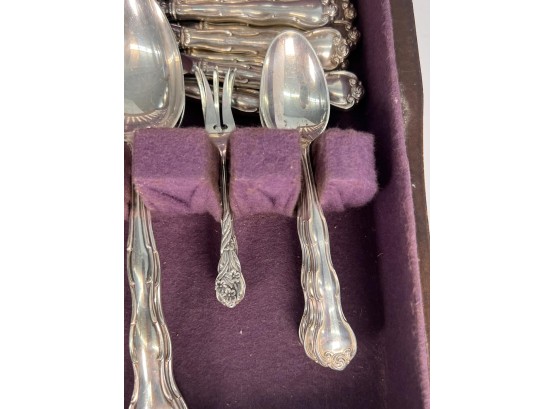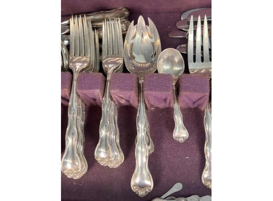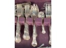 Cased set including tea spoons, iced tea spoons, dinner forks, salad forks, butter knives, dinner knives and misc serving pieces. 75.16 OZT weighable