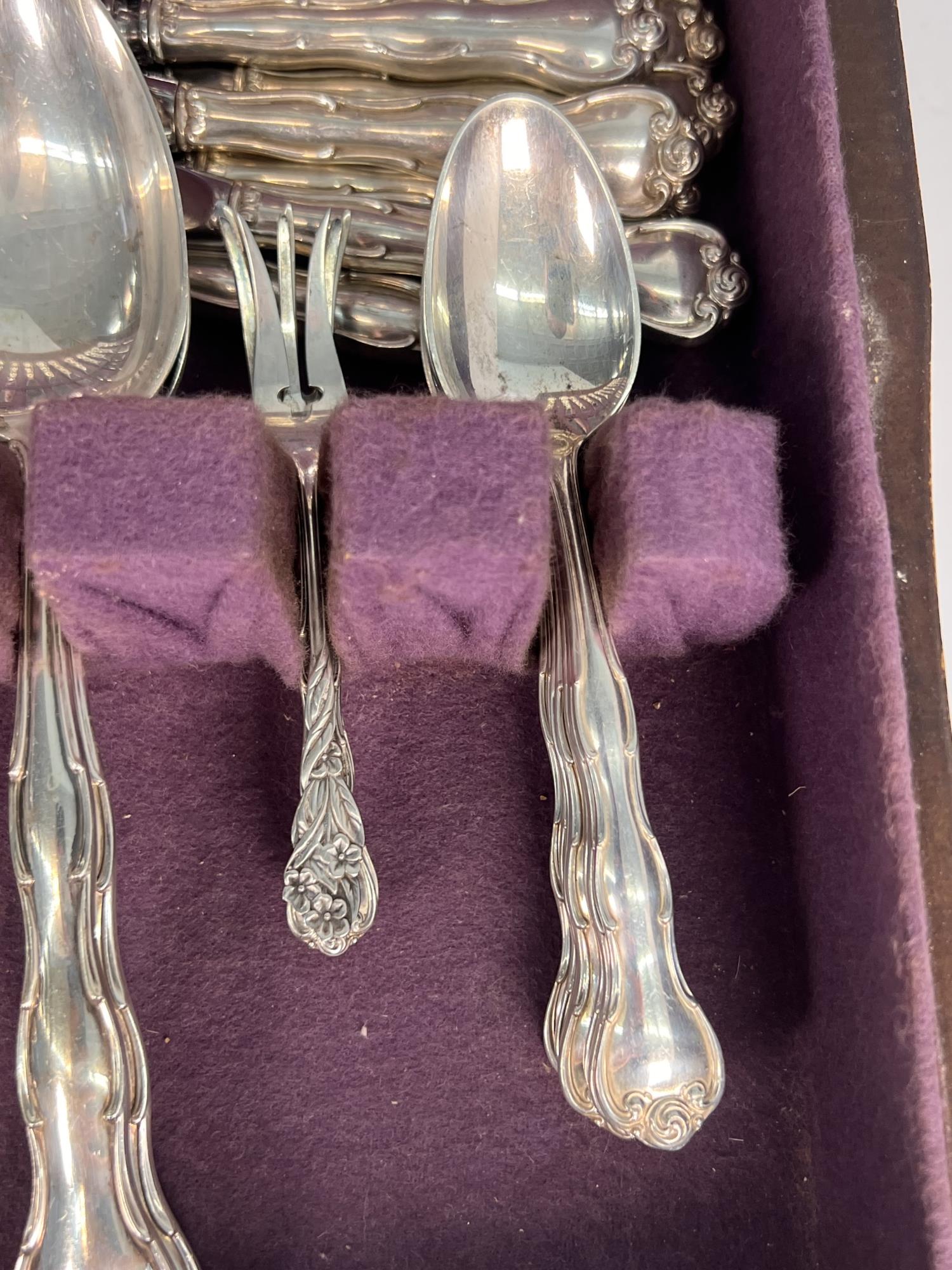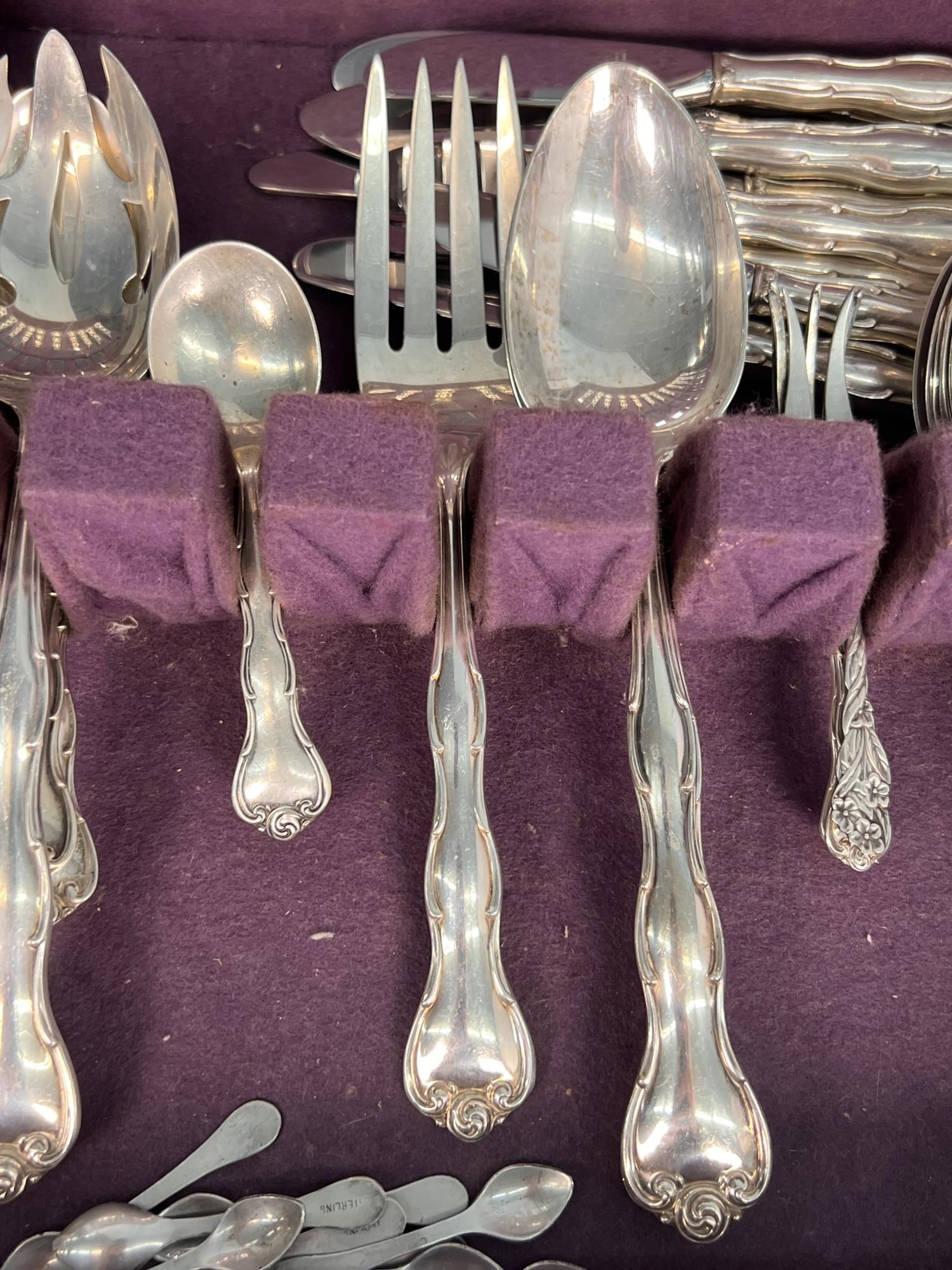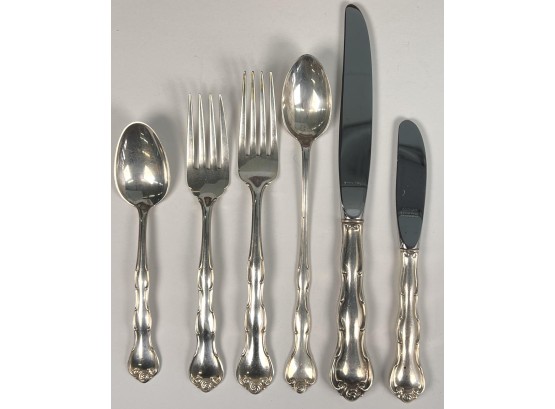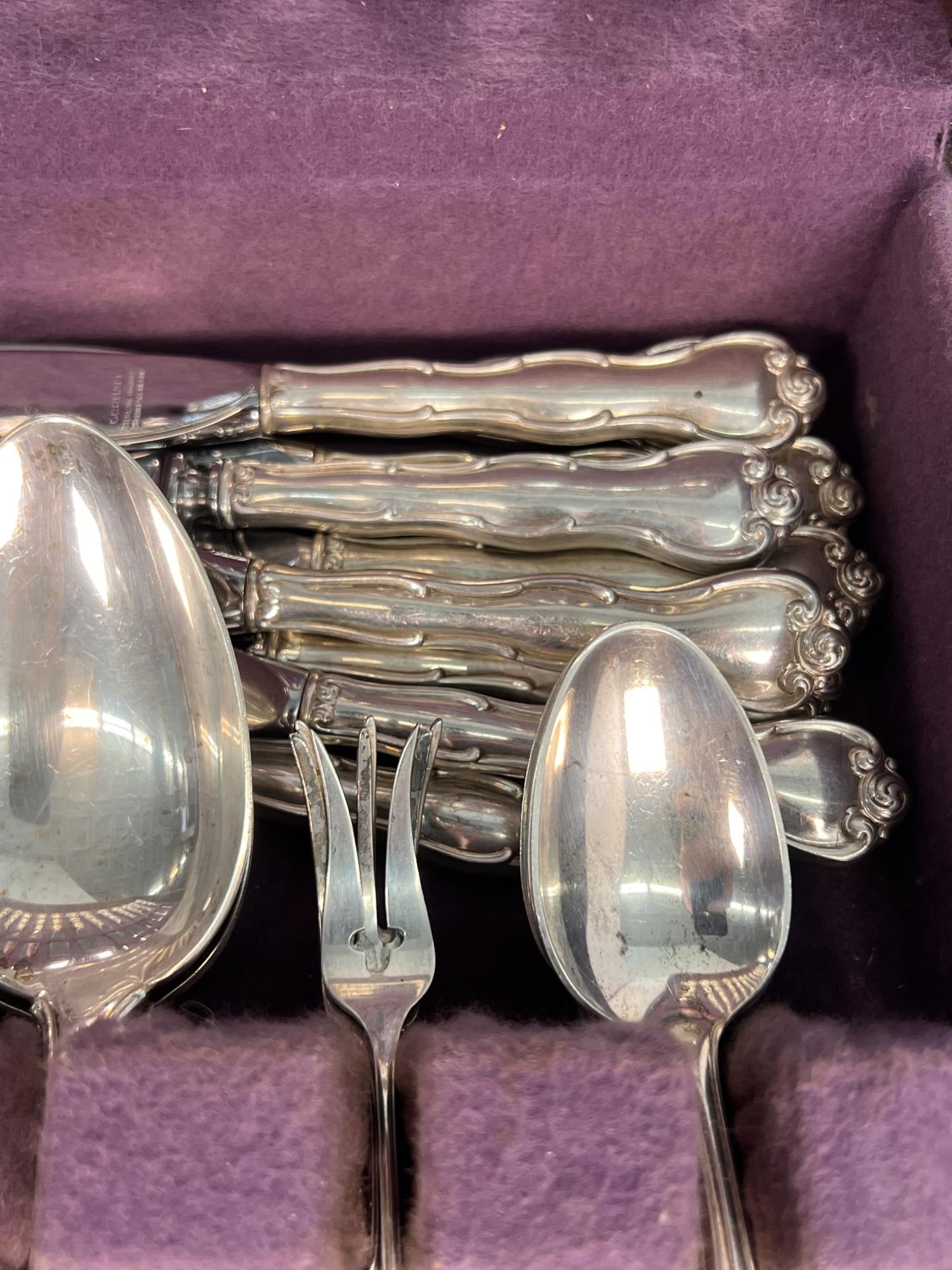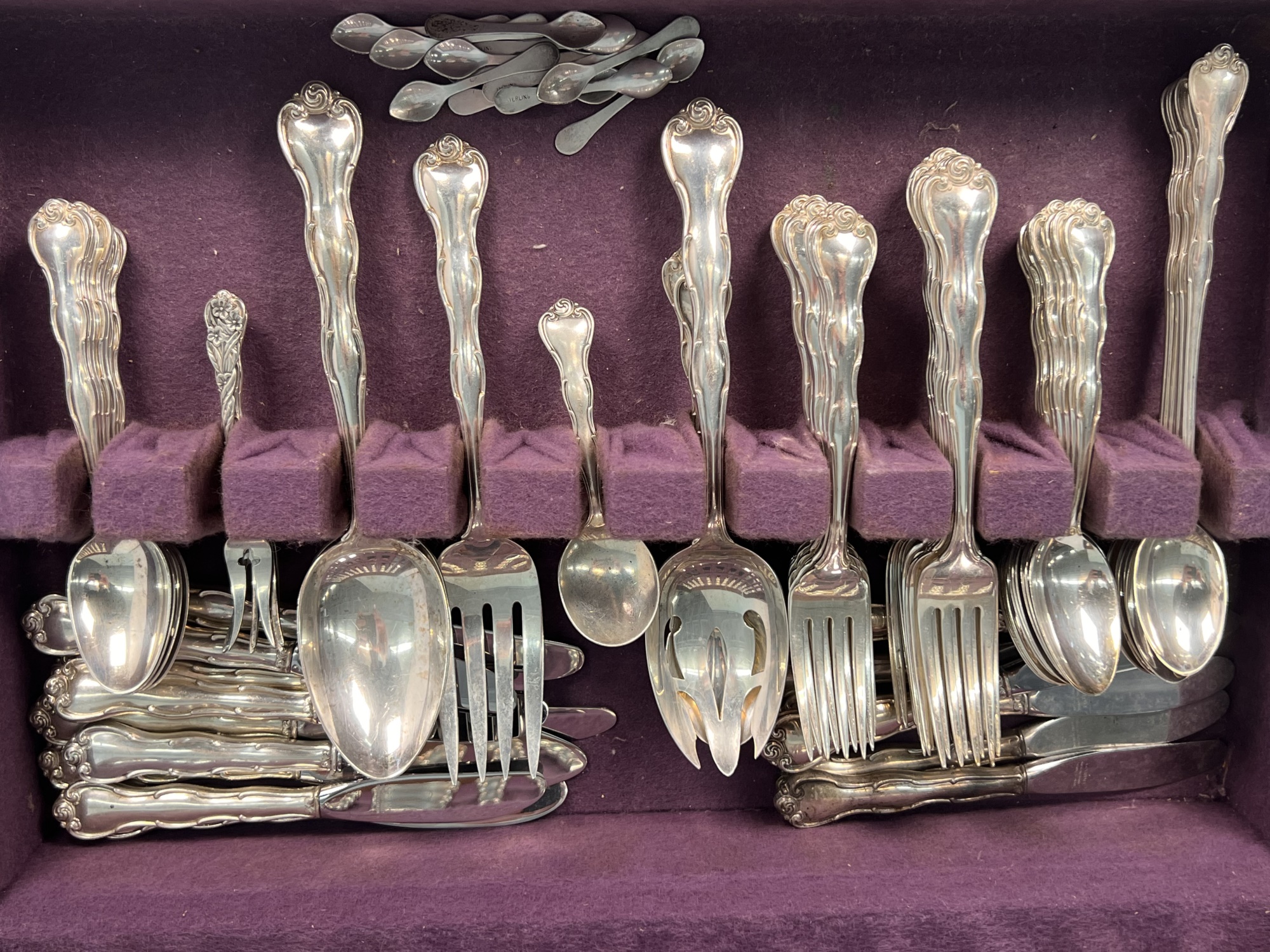 Cased set including tea spoons, iced tea spoons, dinner forks, salad forks, butter knives, dinner knives and misc serving pieces. 75.16 OZT weighable