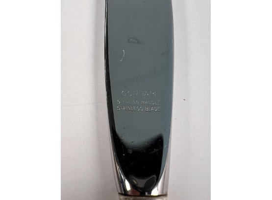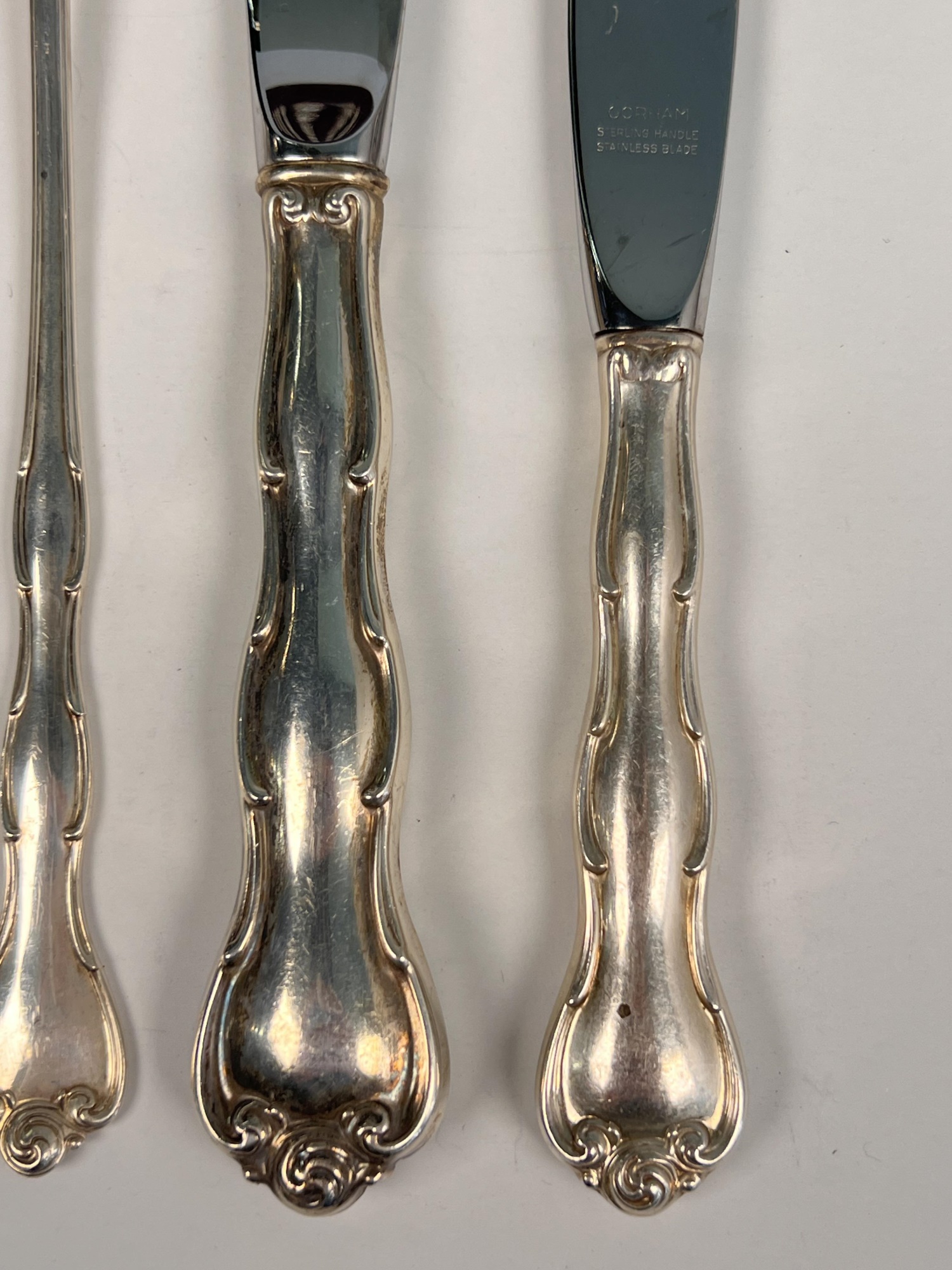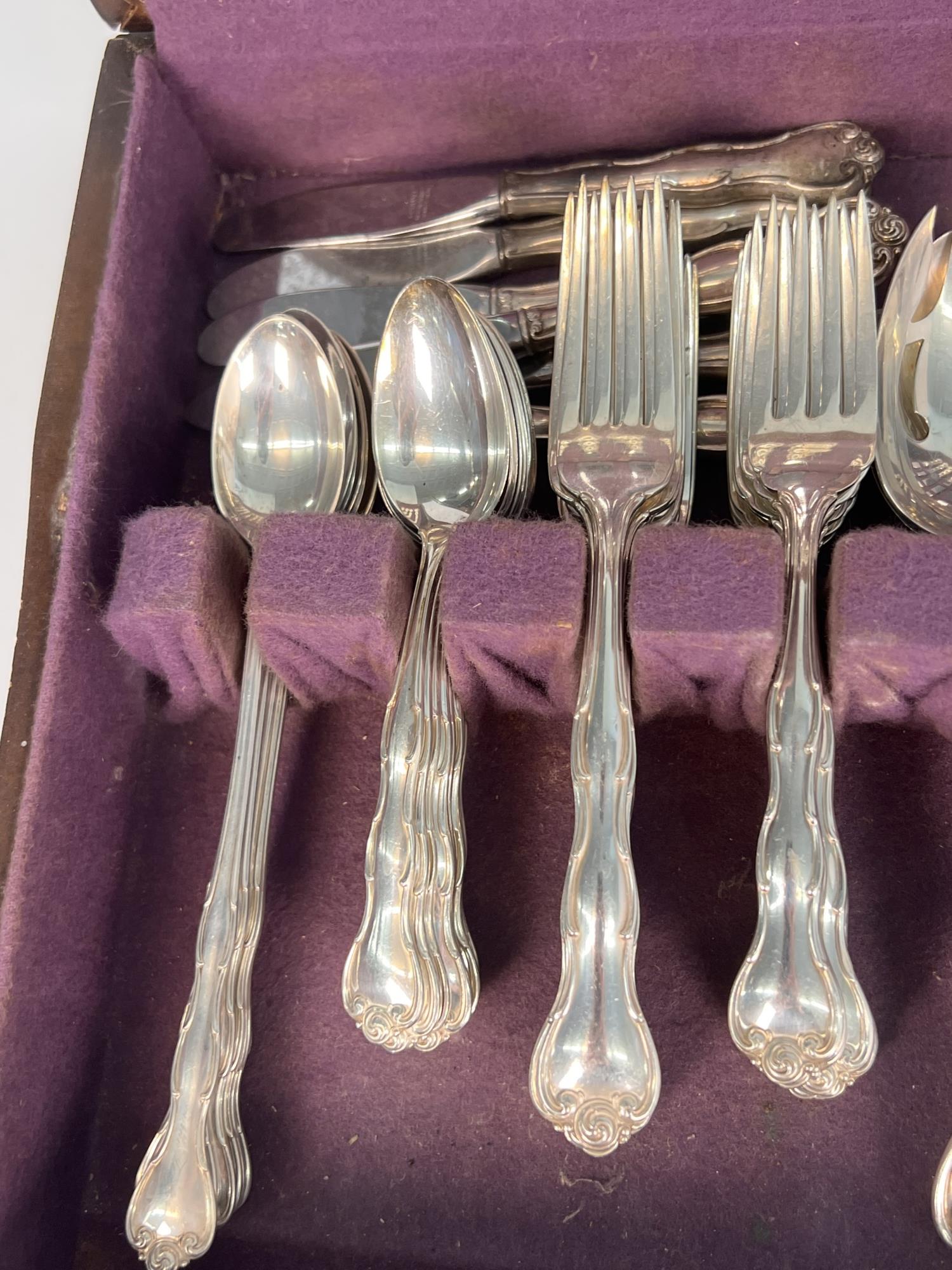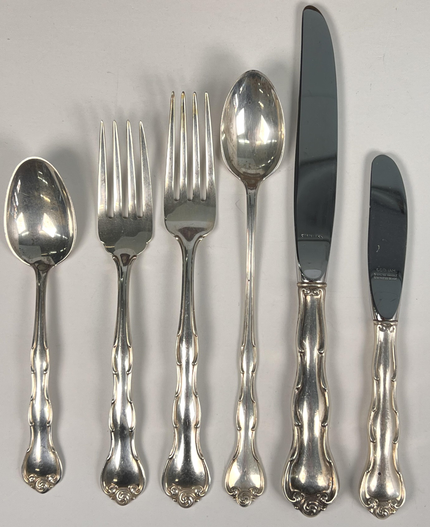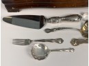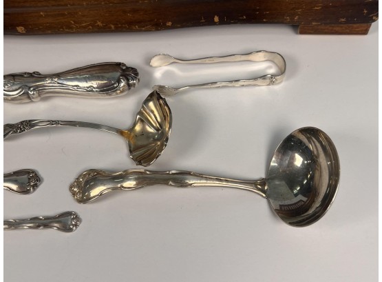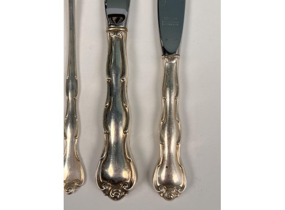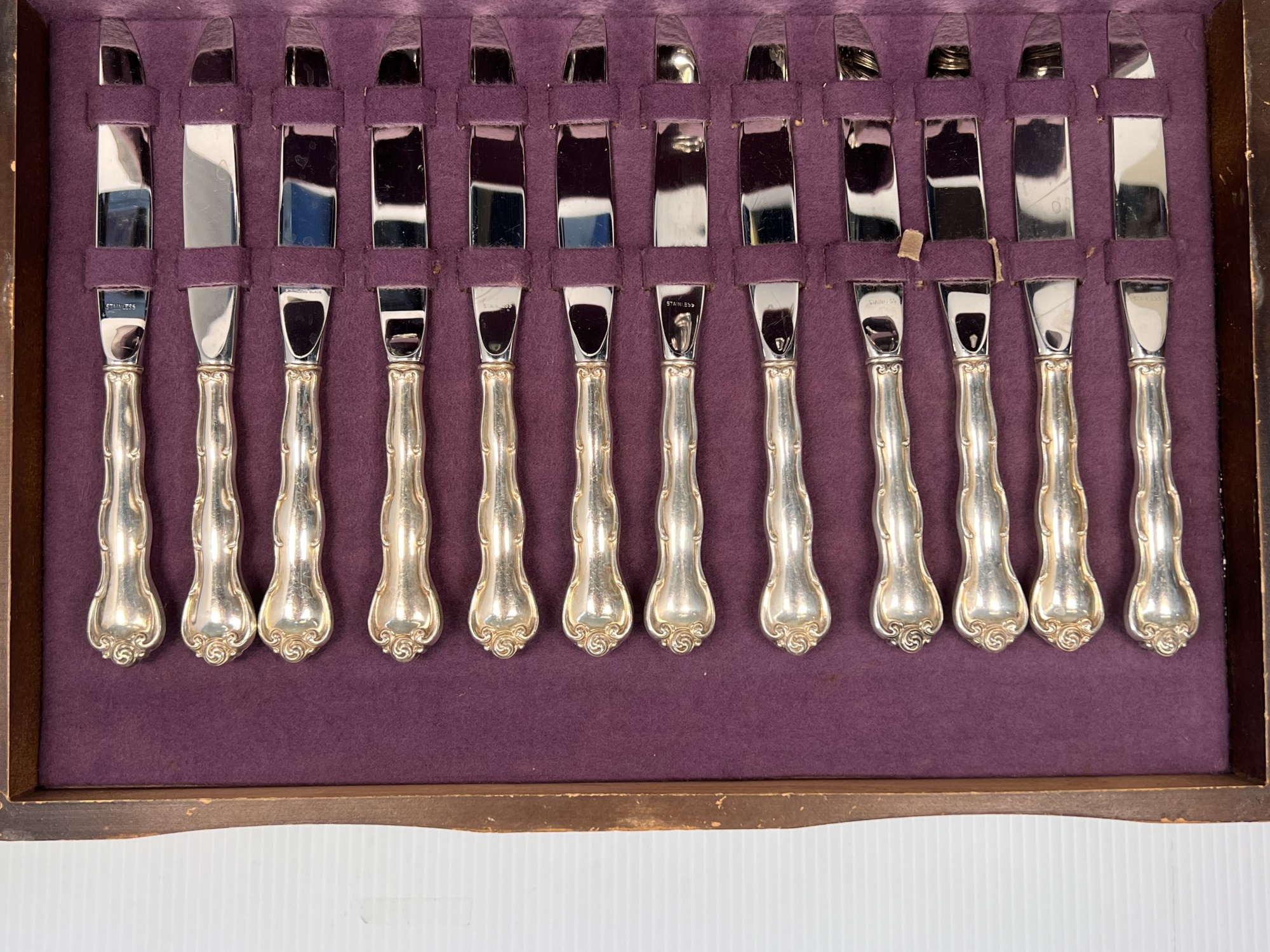 Cased set including tea spoons, iced tea spoons, dinner forks, salad forks, butter knives, dinner knives and misc serving pieces. 75.16 OZT weighable