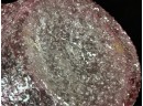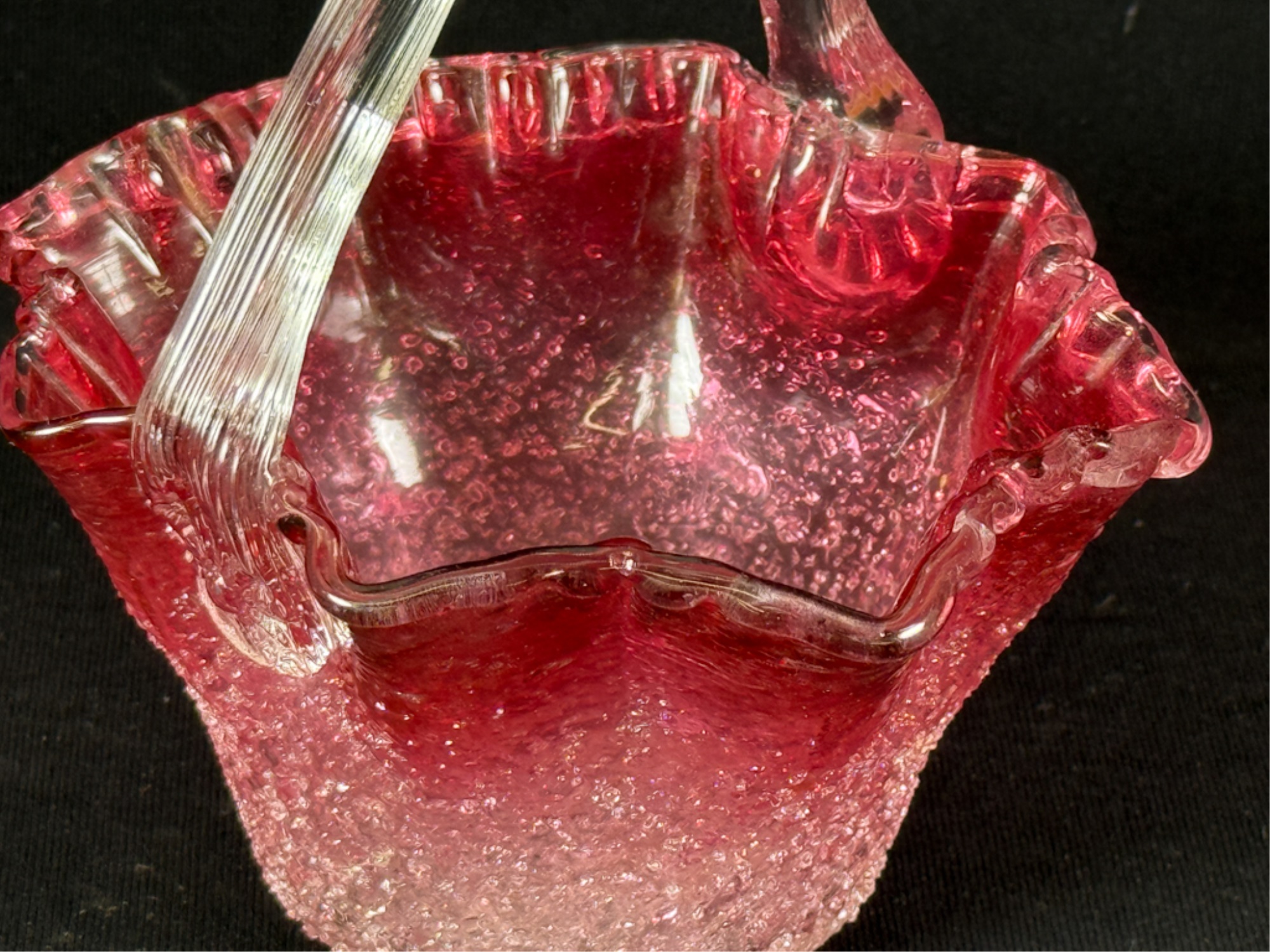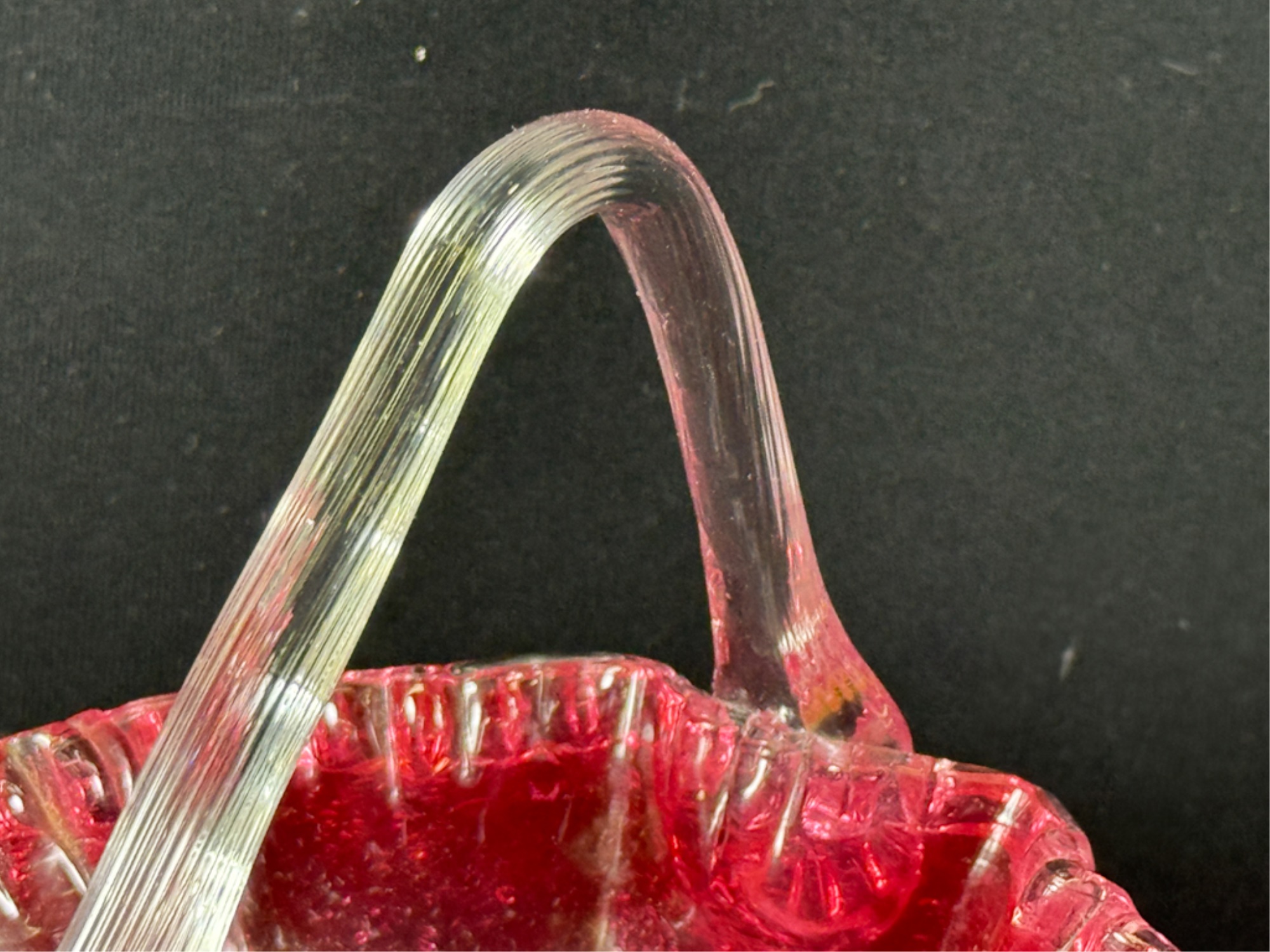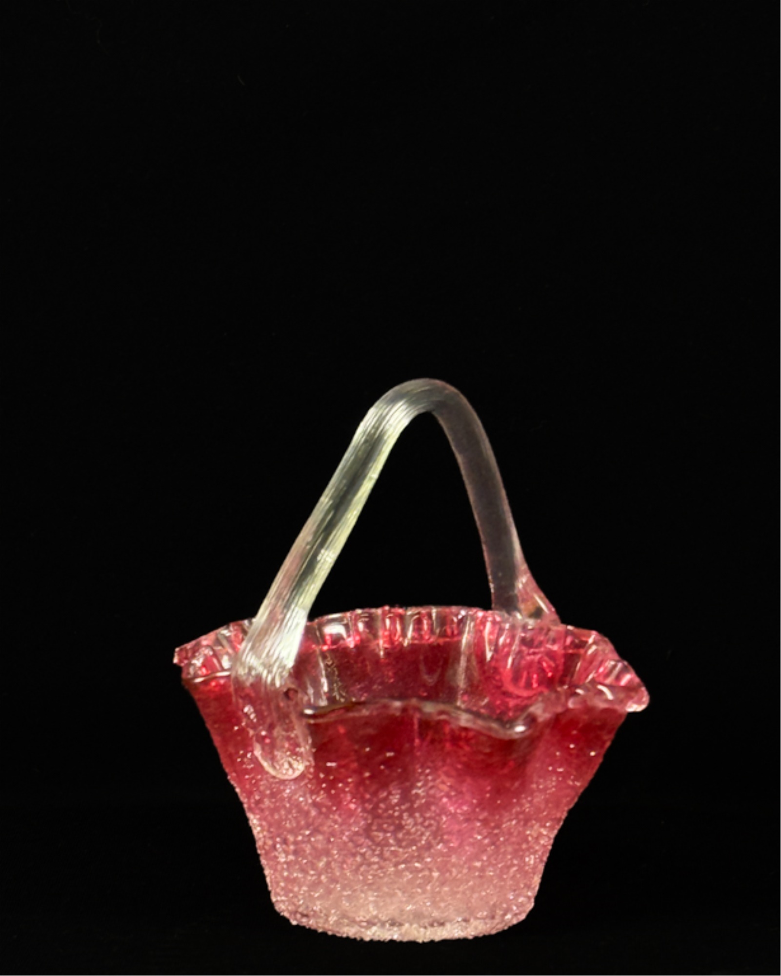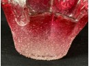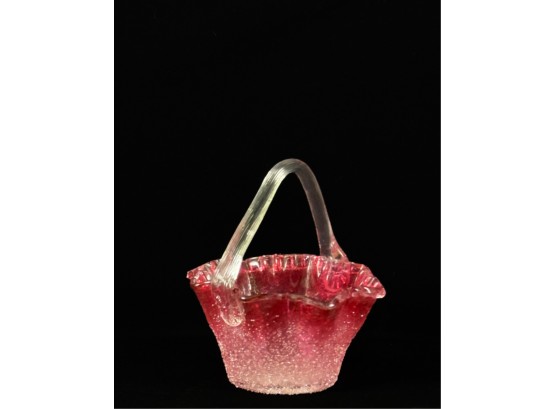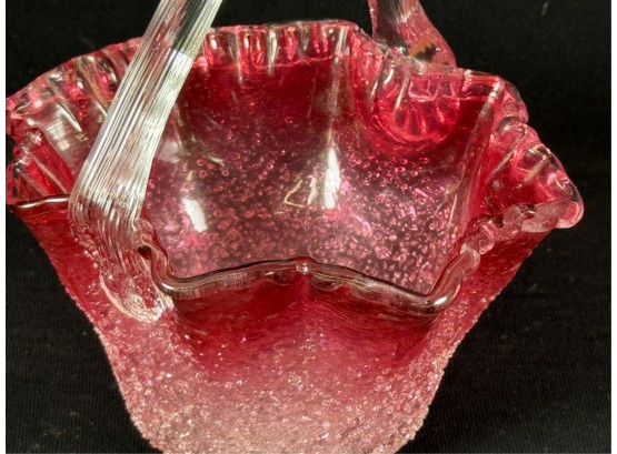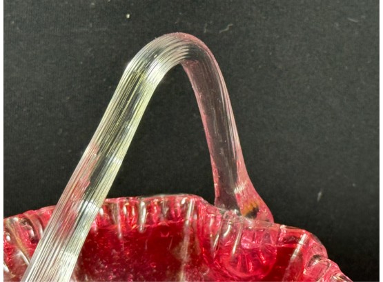 Overshot cranberry glass basket with molded rim & ribbed handle with flora. 5 x 4 x 5 inches. Condition: Good. Temp No 2538