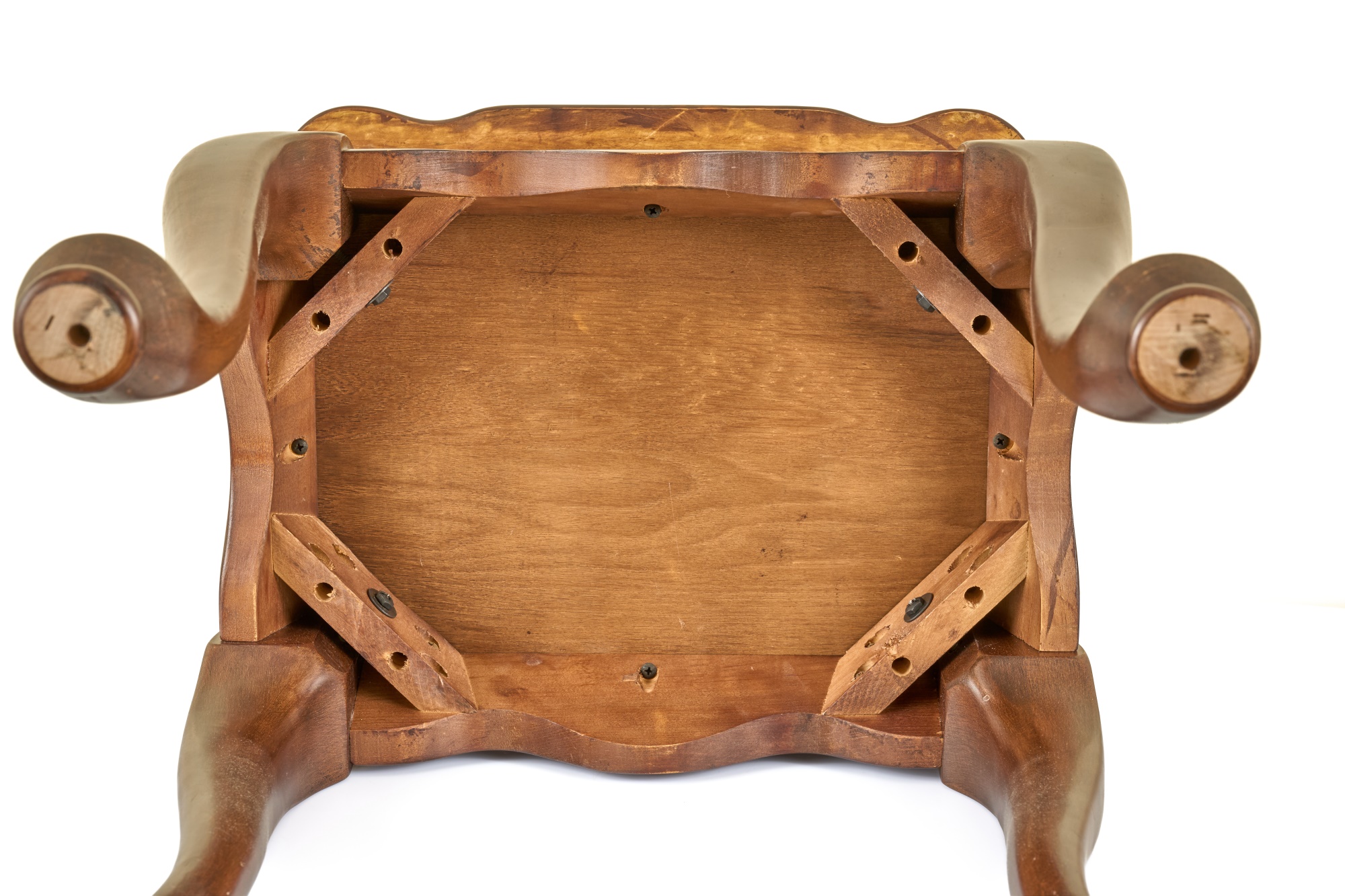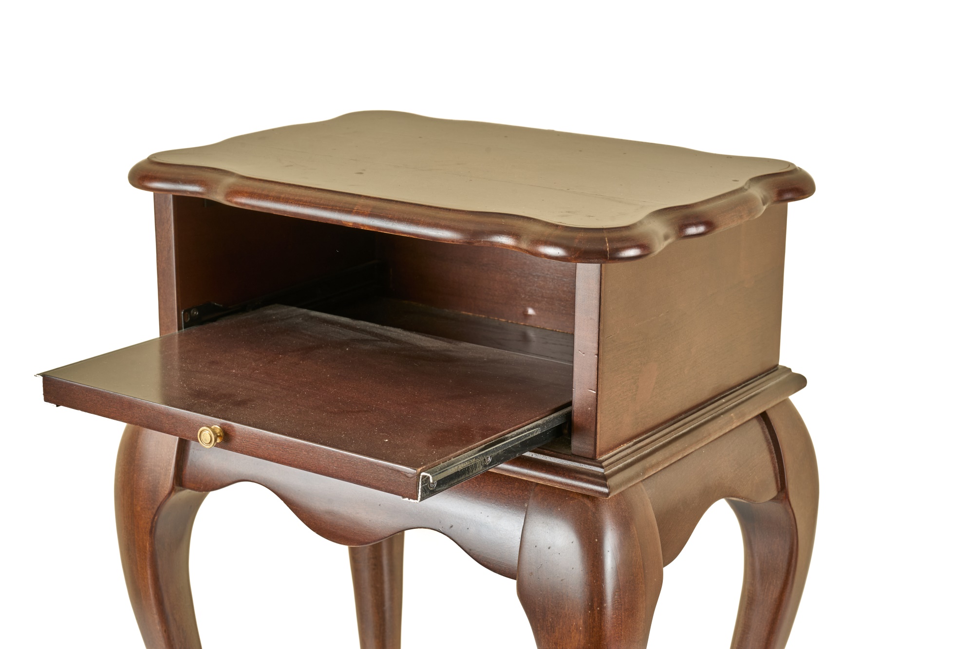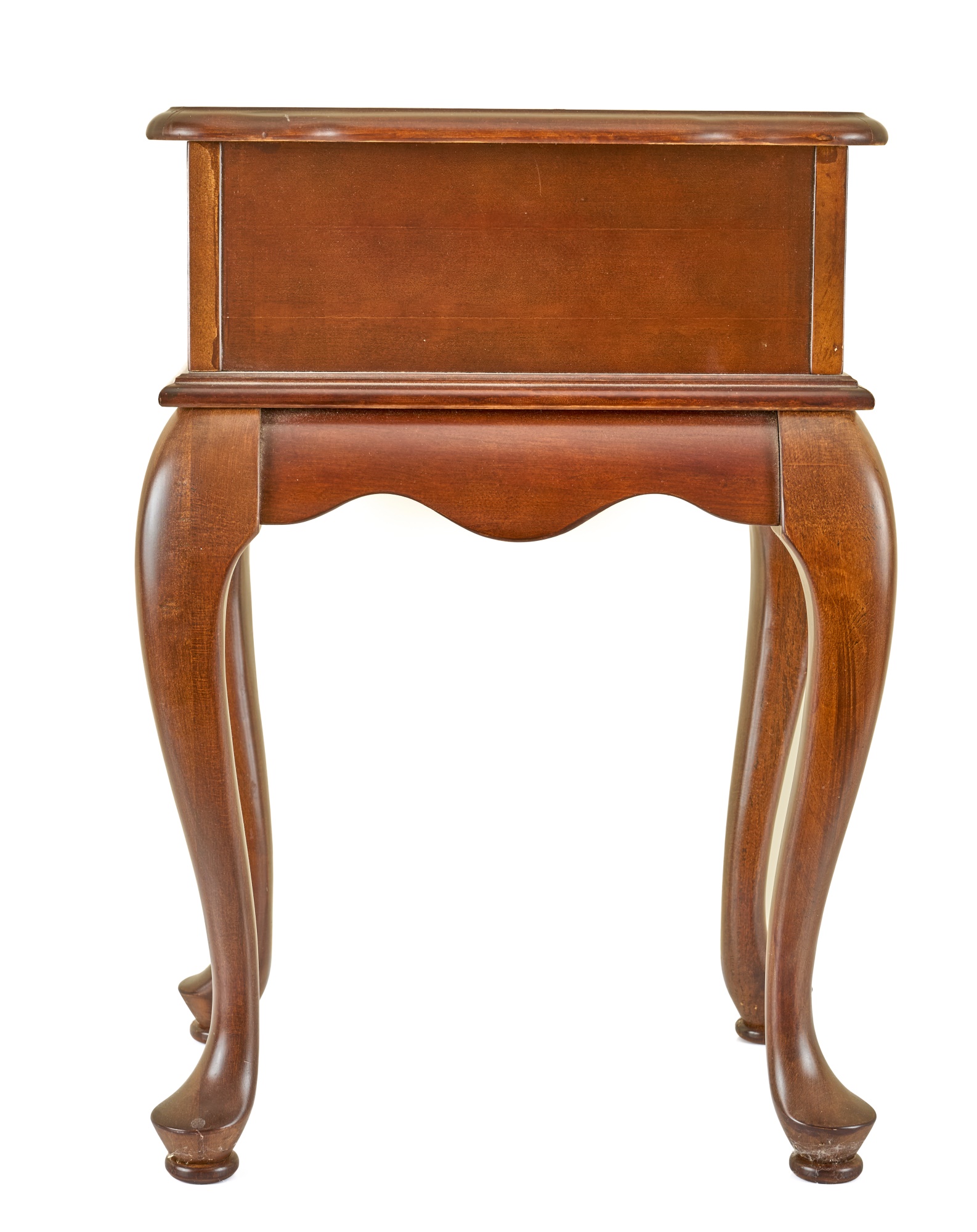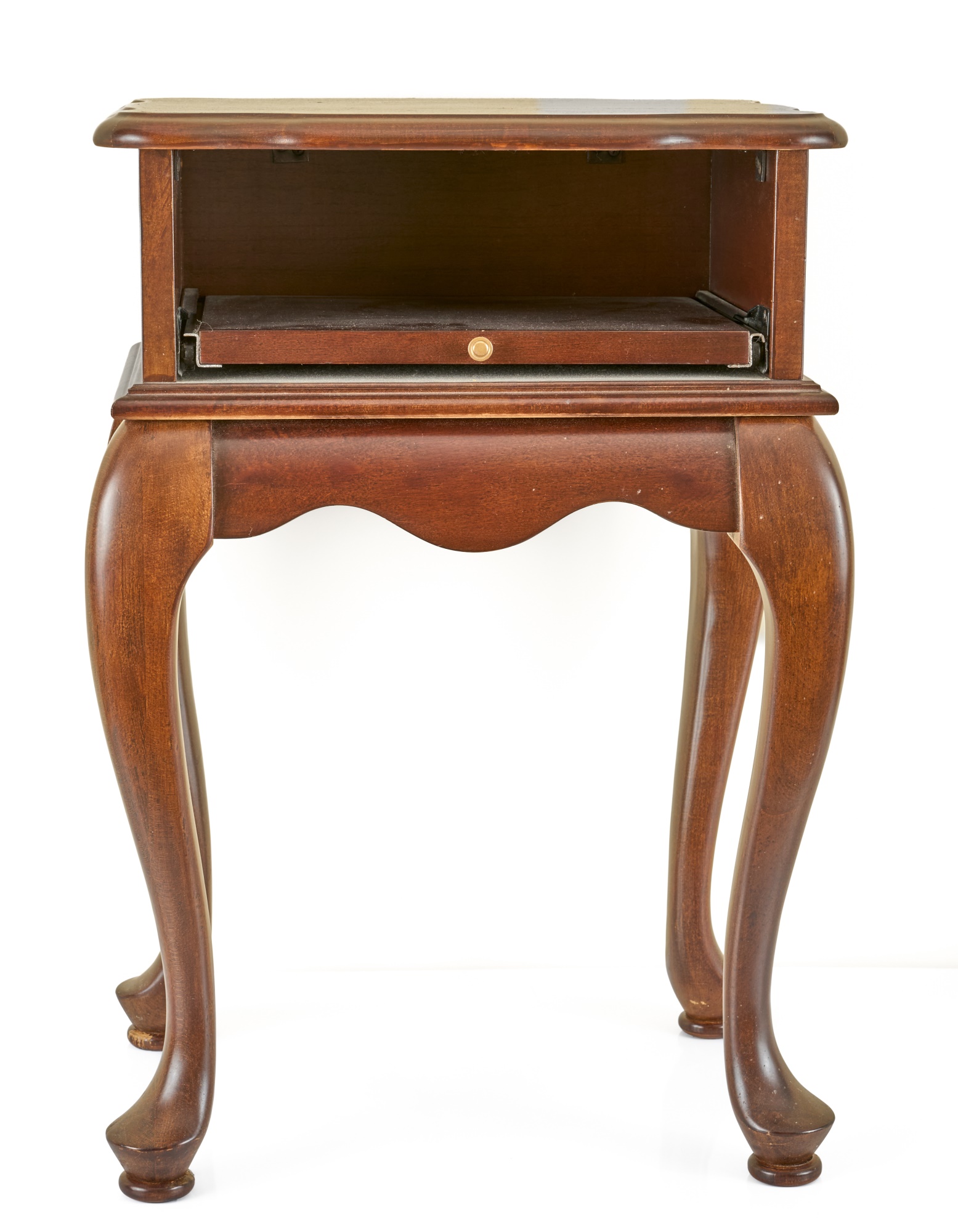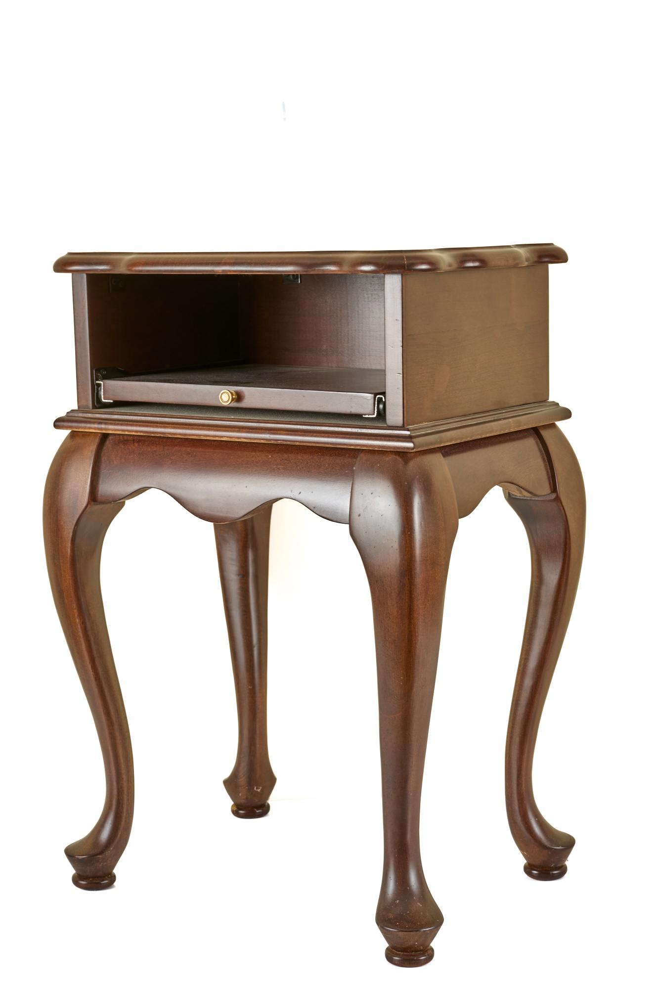 Serpentine top, over compartment with sliding shelf, shaped apron, cabriole legs and pad feet. Unmarked 24 x 16.5 x 12 inches Condition: Good
