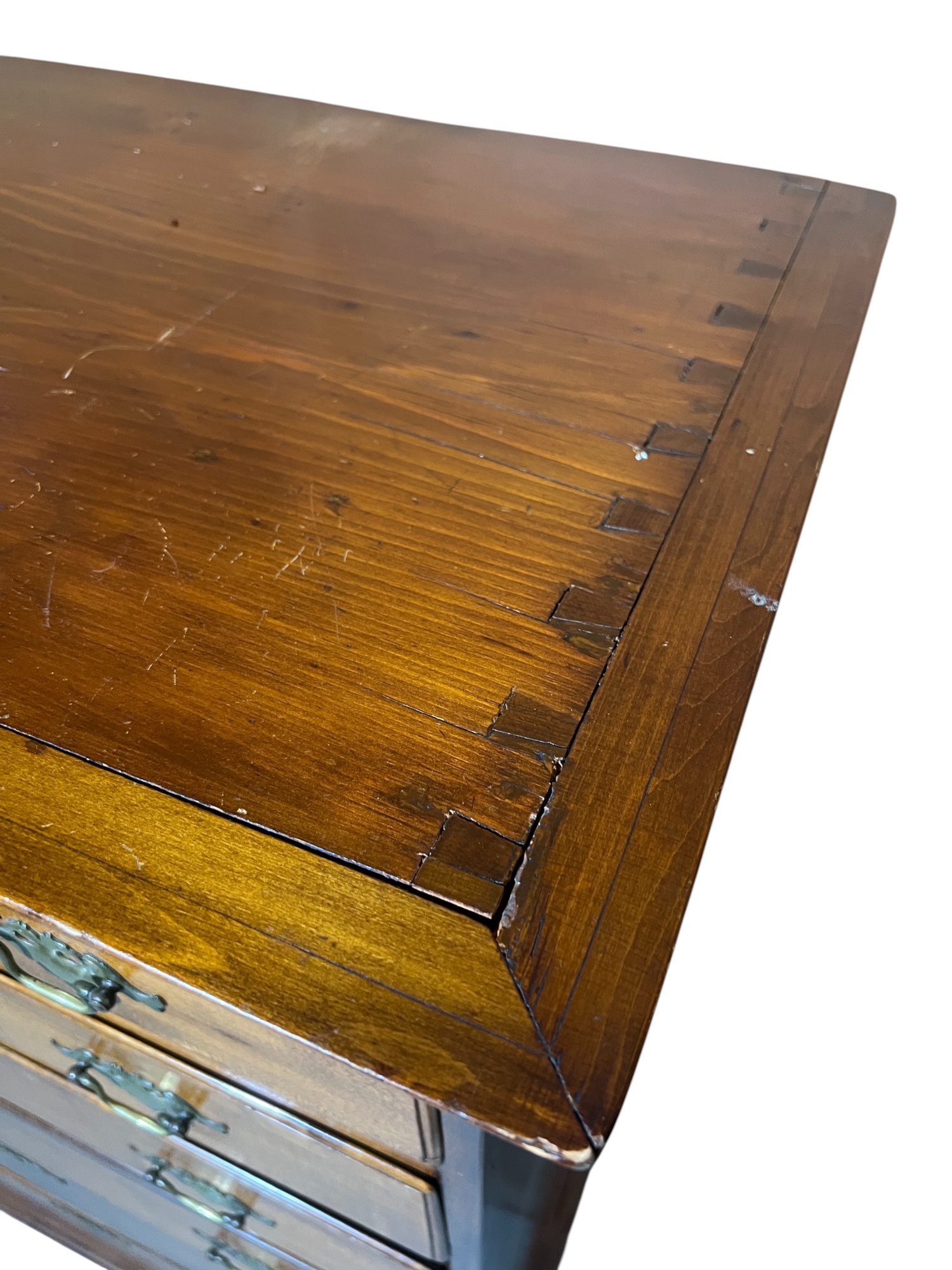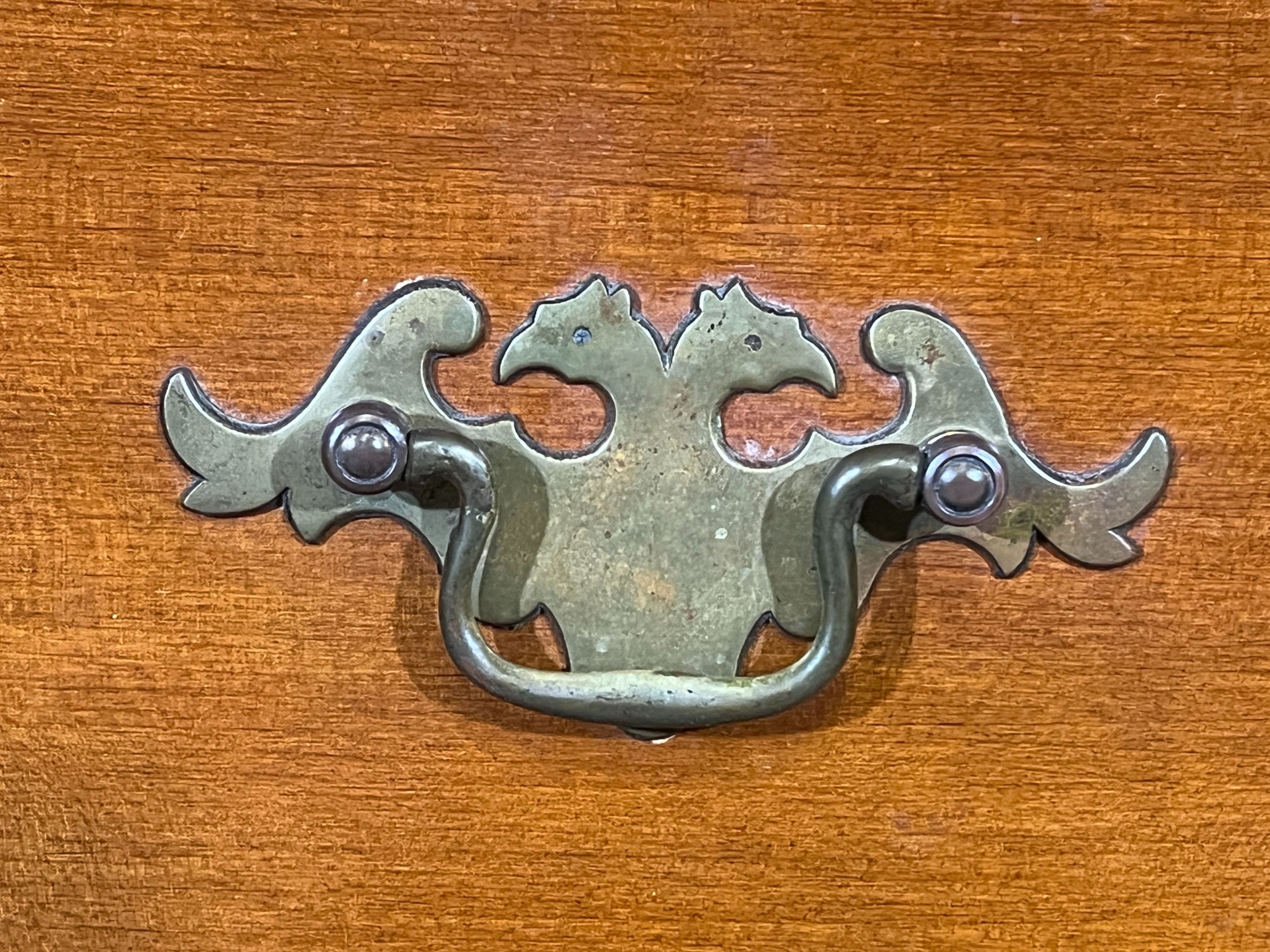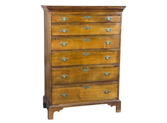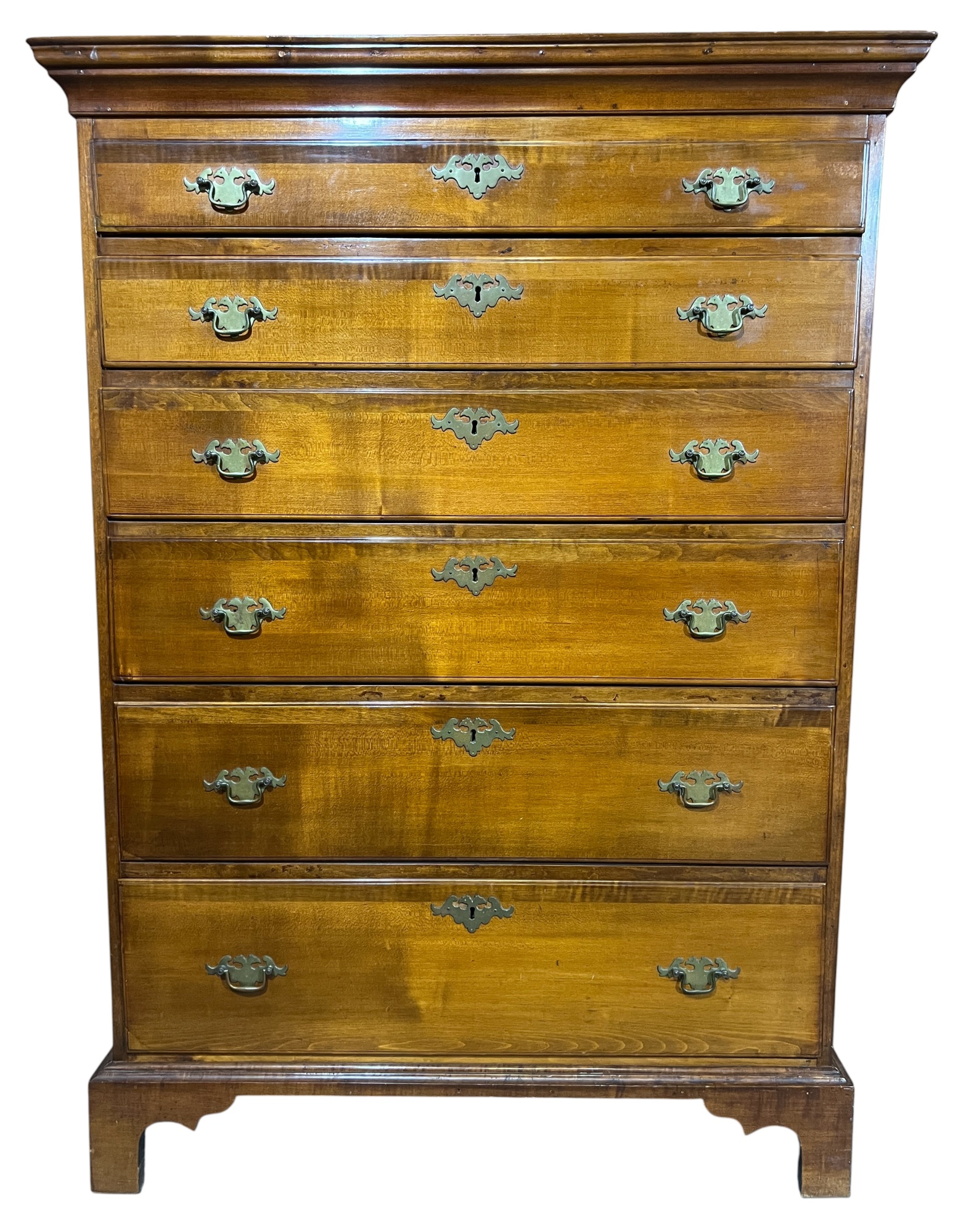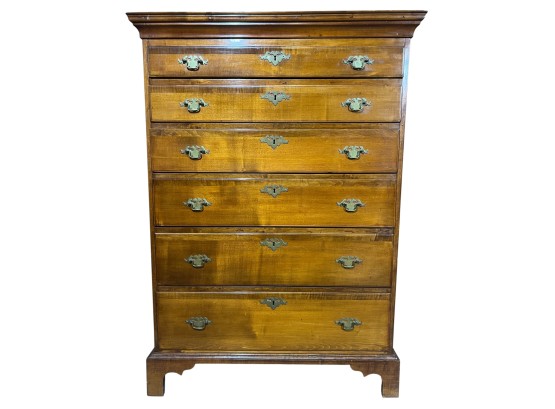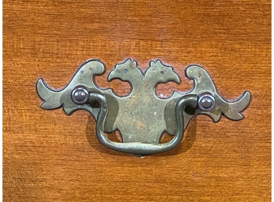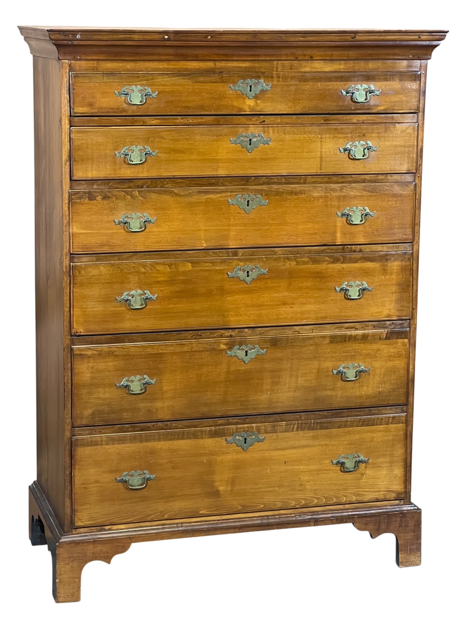 Molded top, (6) graduated drawers, dovetail construction, interesting double eagle brass pulls, bracket feet. 54 1/2 x 39 x 19 1/2 inches. Condition: Good. Temp No 3001