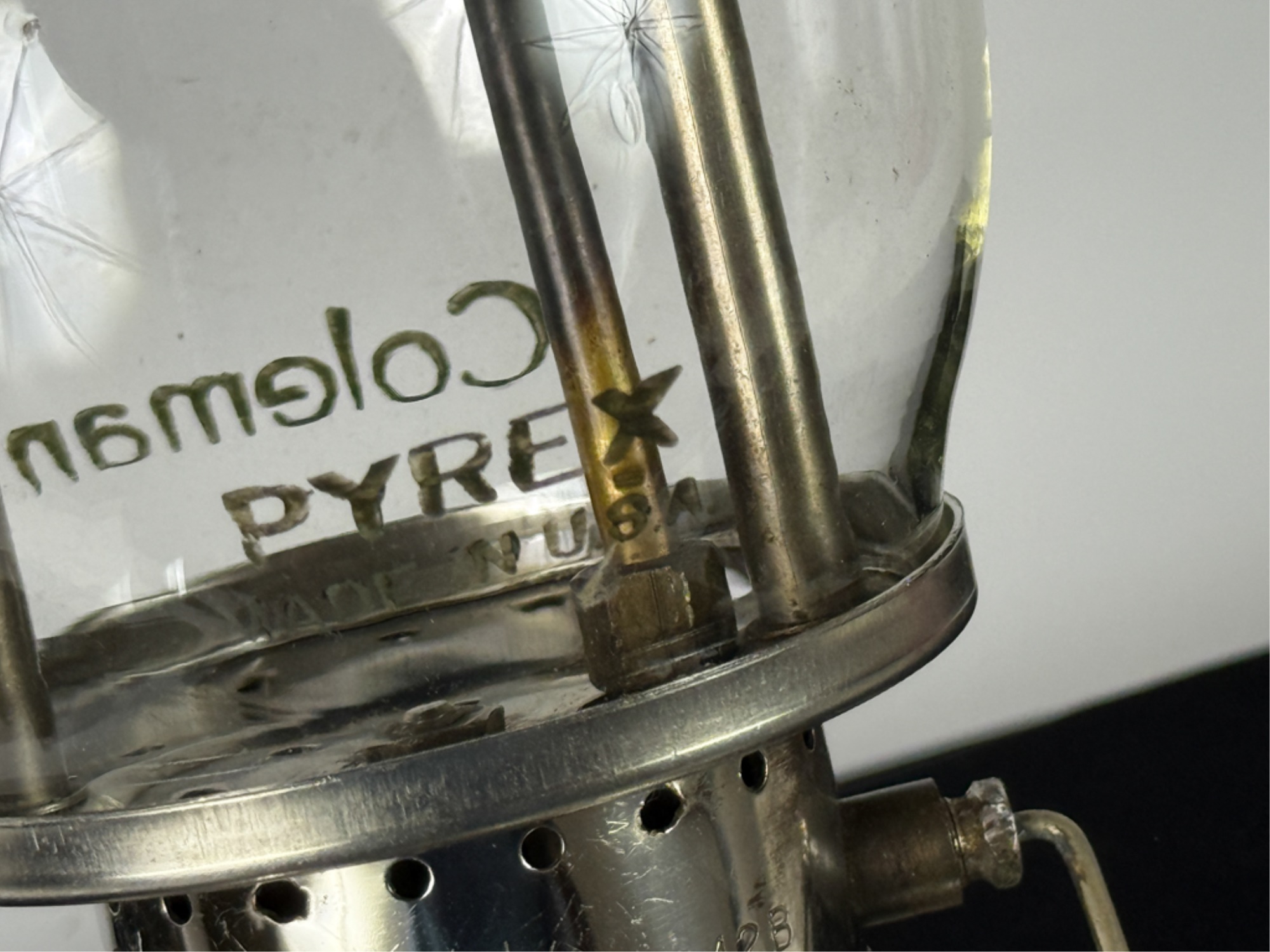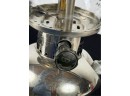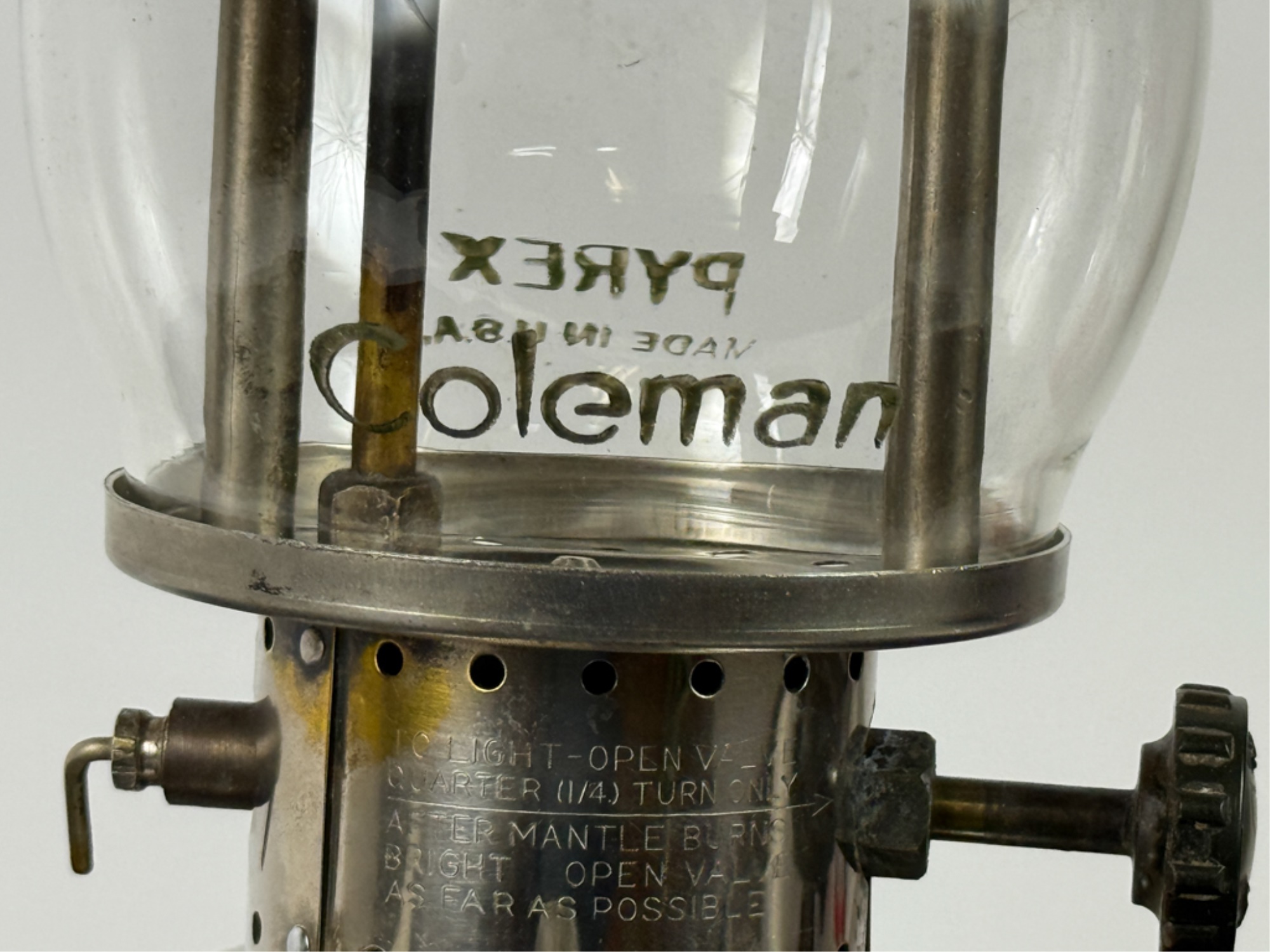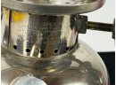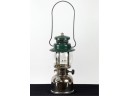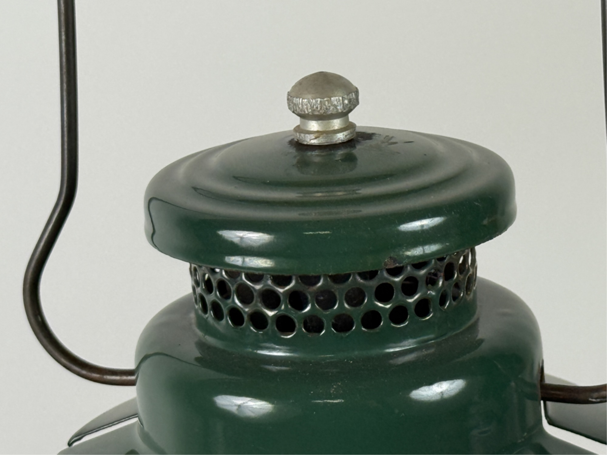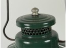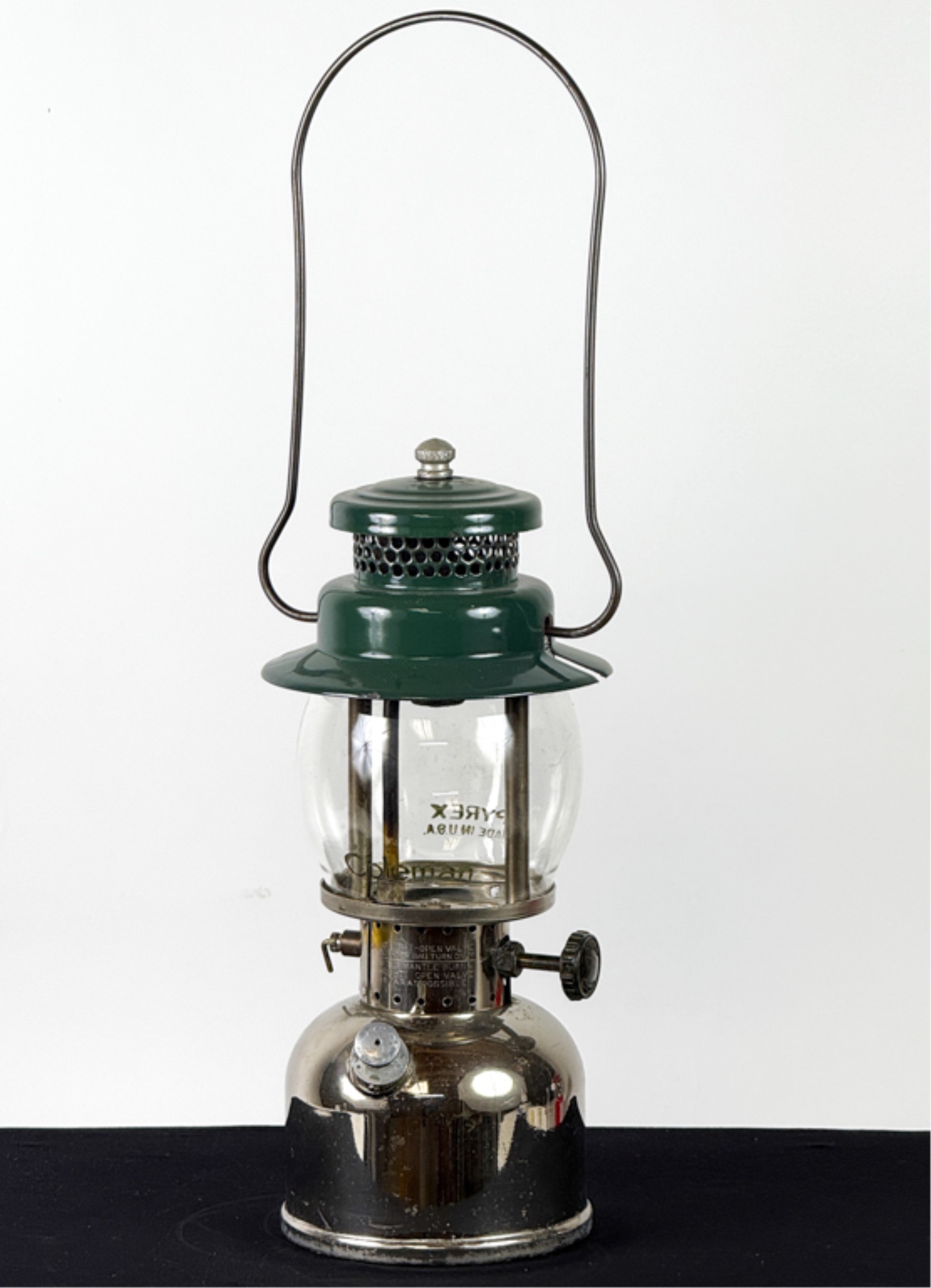 With Pyrex shade and green enamel painted lid. 19 inches including handle. Condition: Some loss to enamel, untested. Temp No 4046