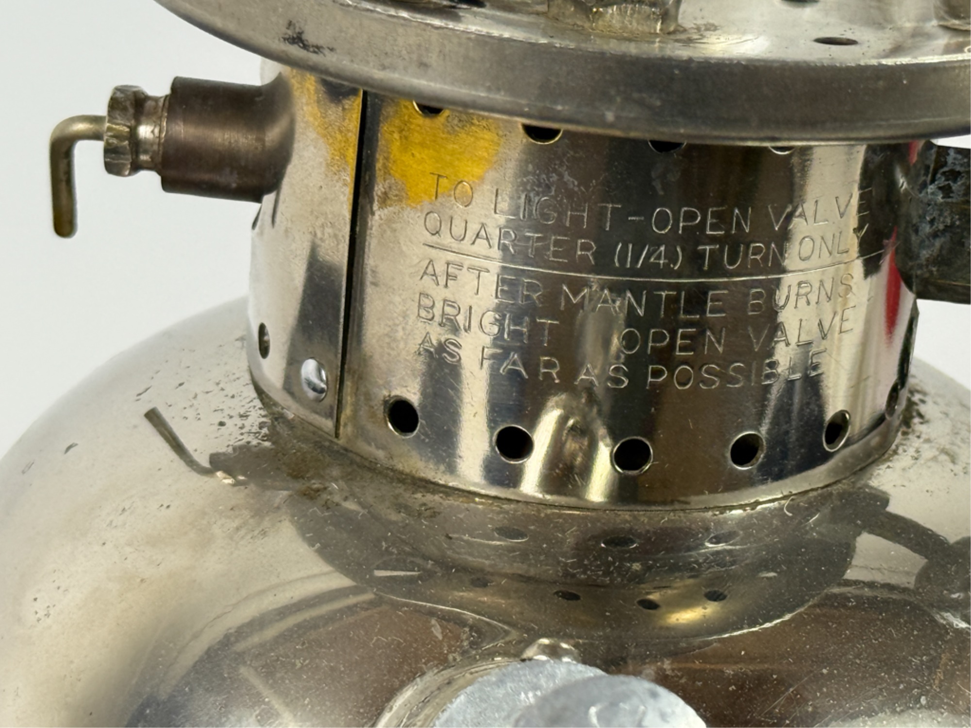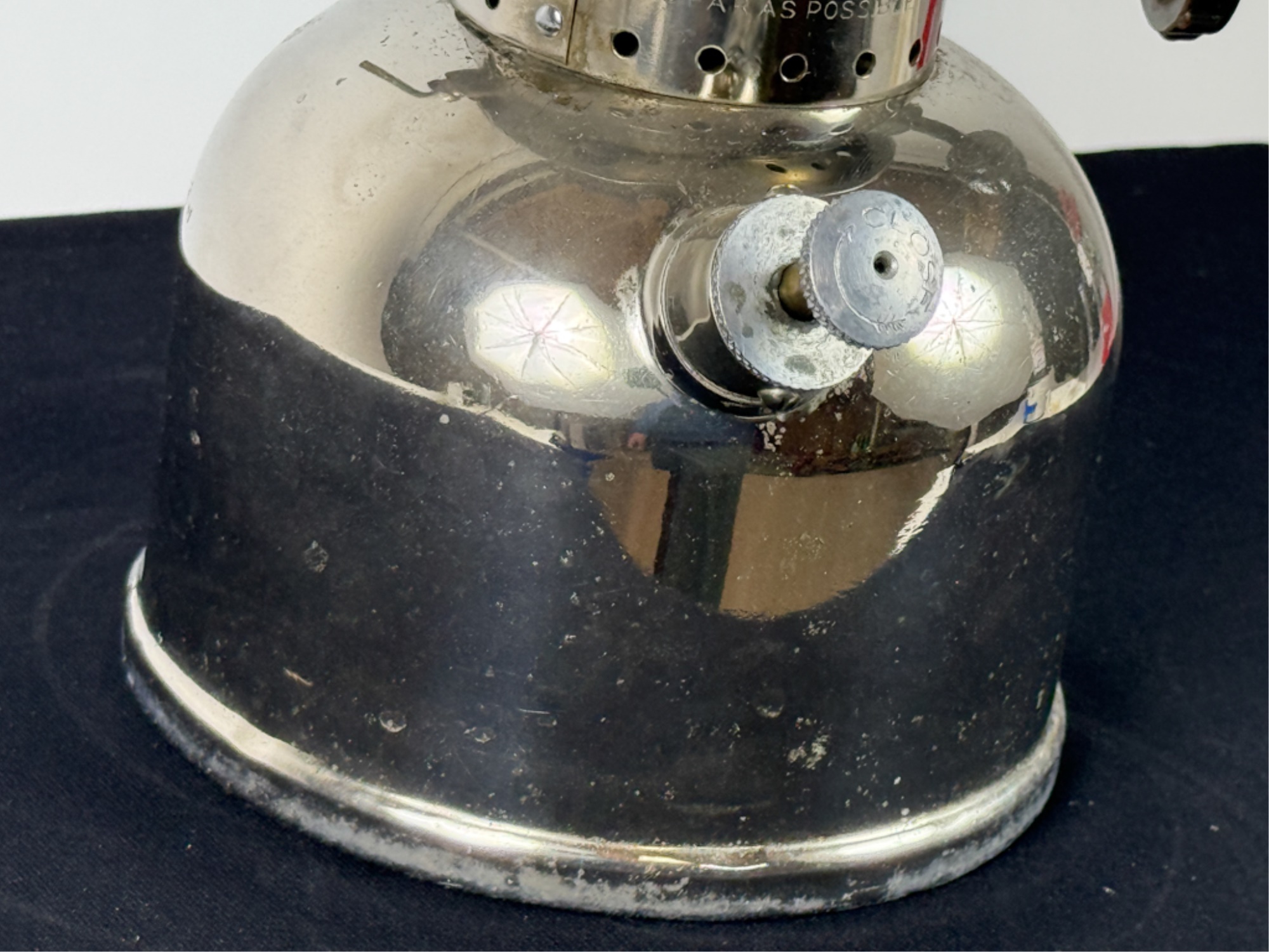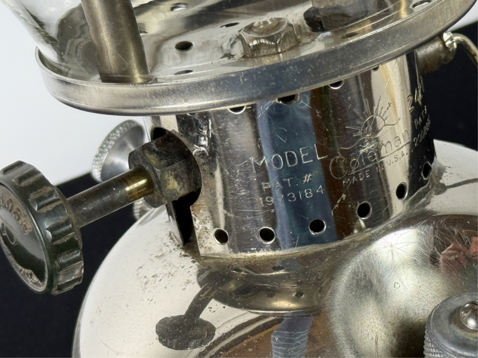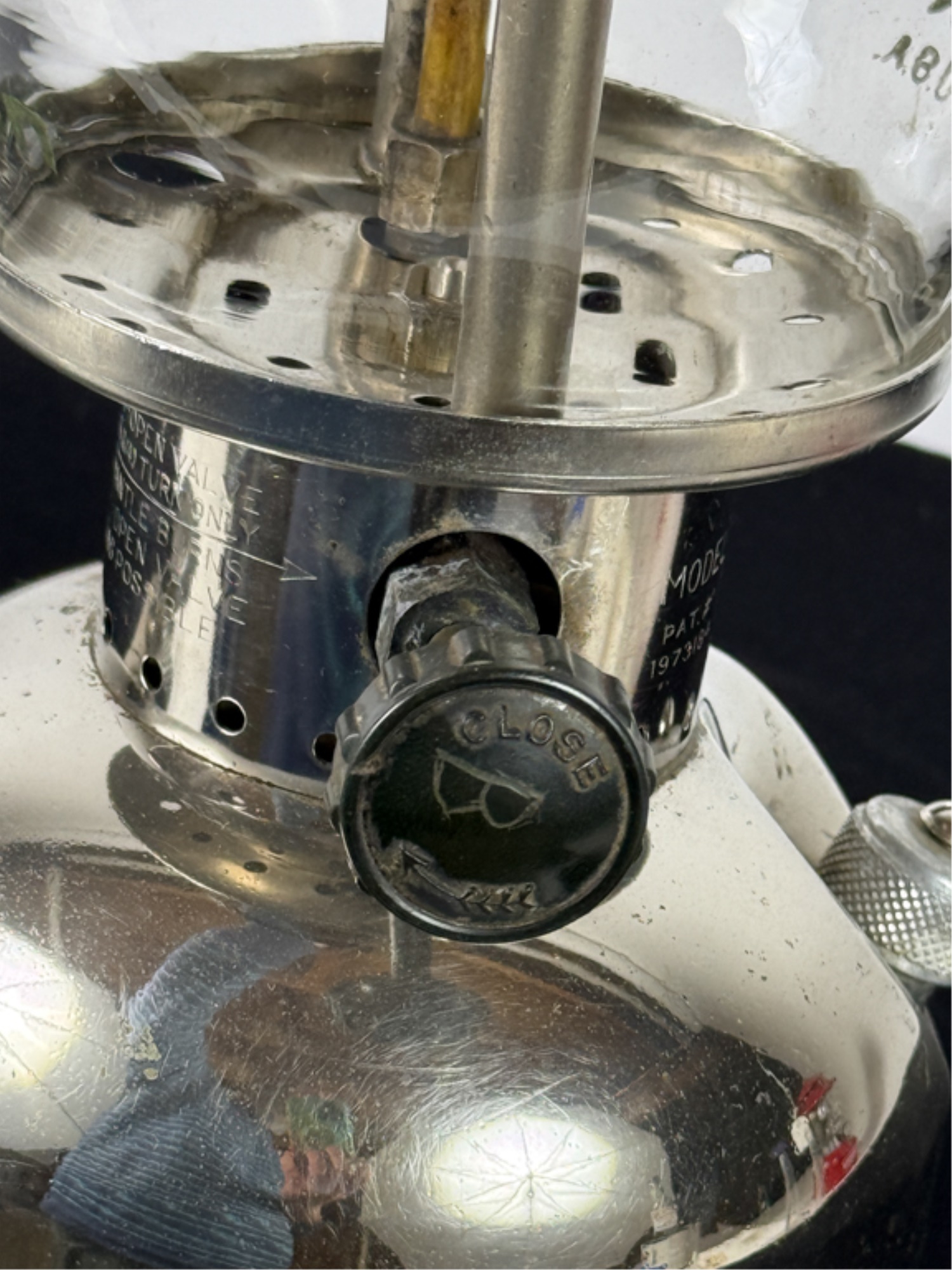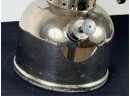 With Pyrex shade and green enamel painted lid. 19 inches including handle. Condition: Some loss to enamel, untested. Temp No 4046