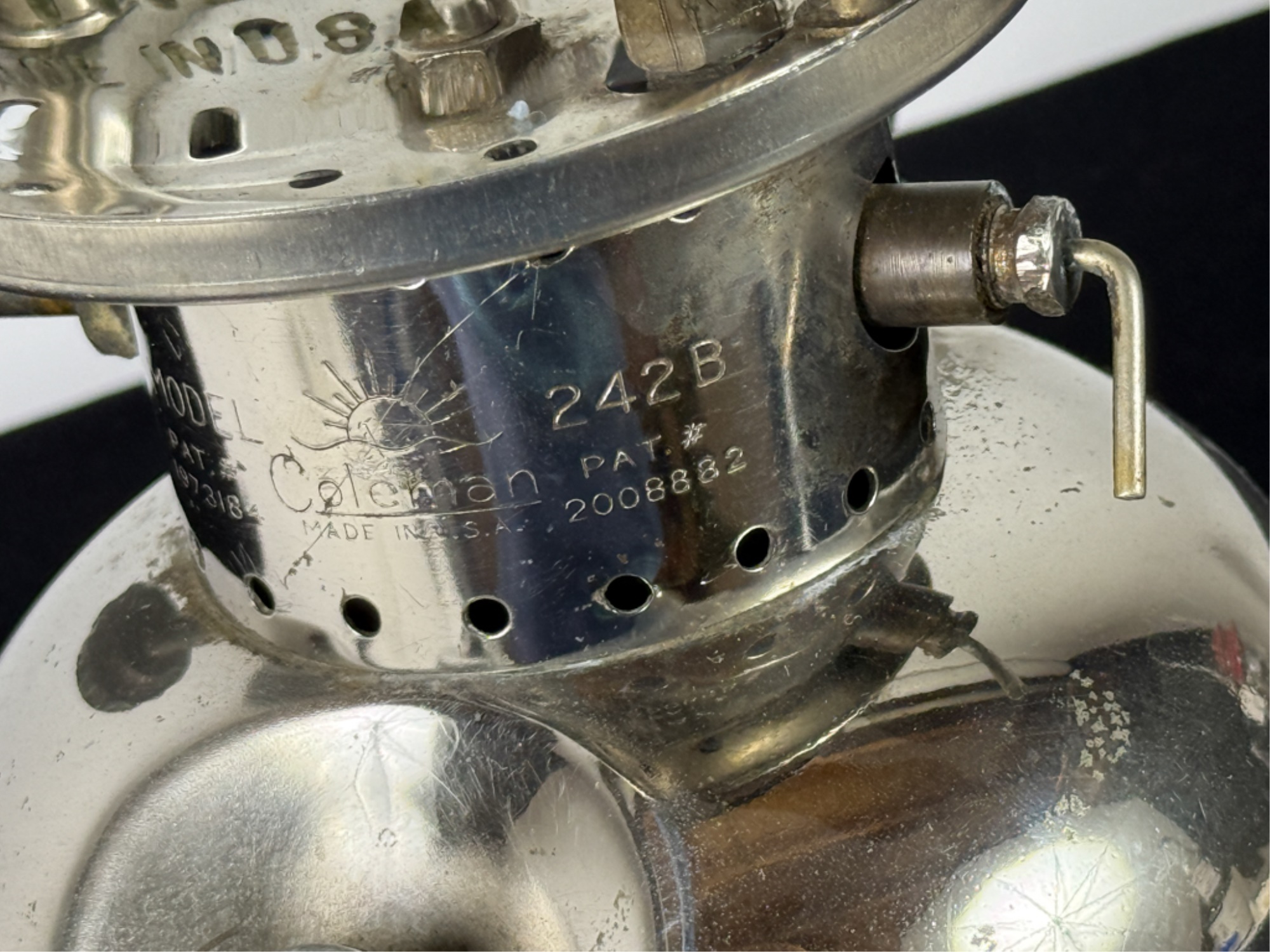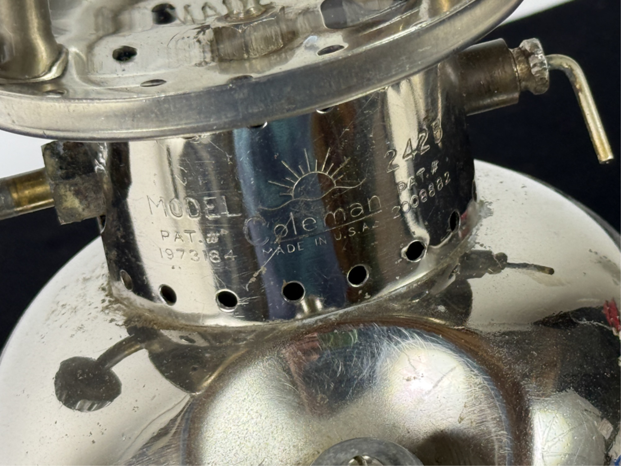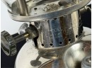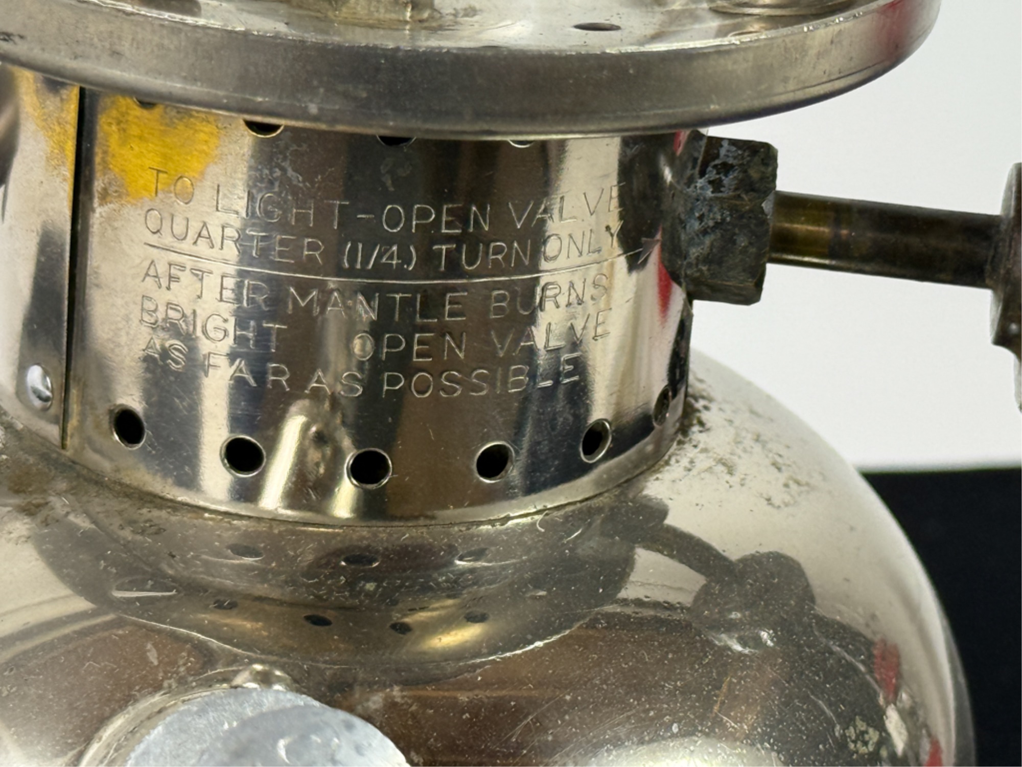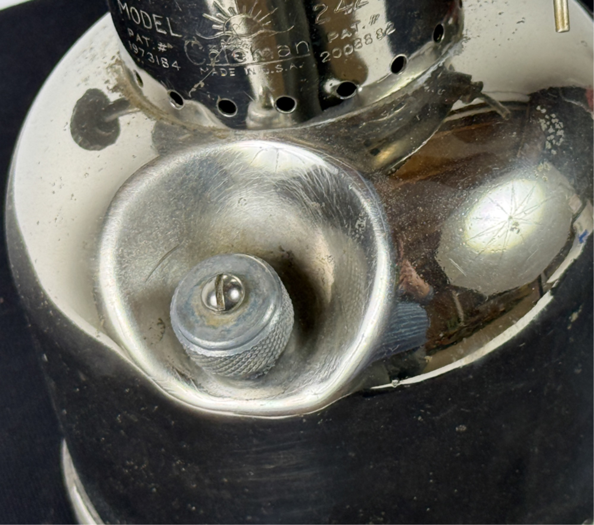 With Pyrex shade and green enamel painted lid. 19 inches including handle. Condition: Some loss to enamel, untested. Temp No 4046