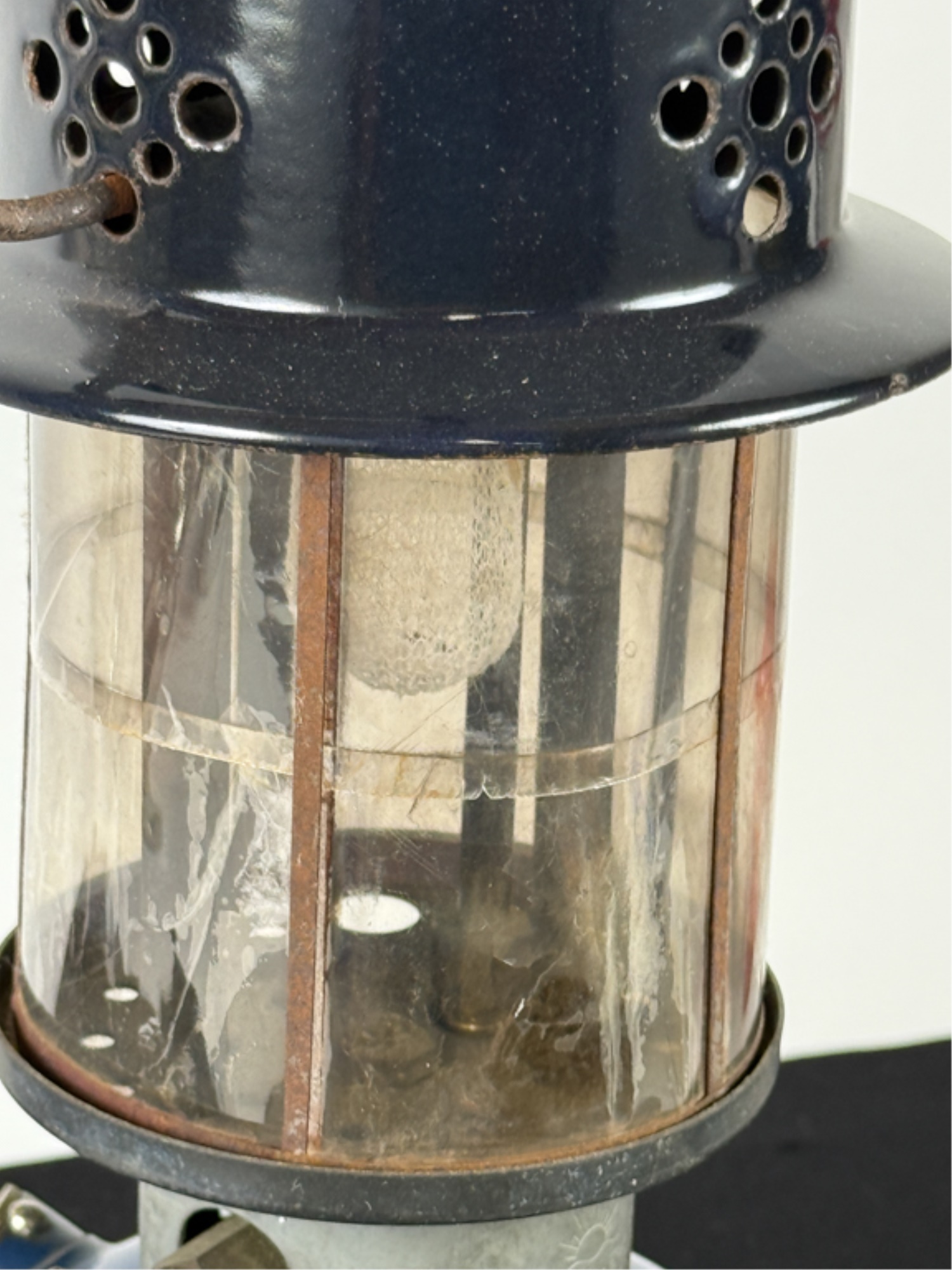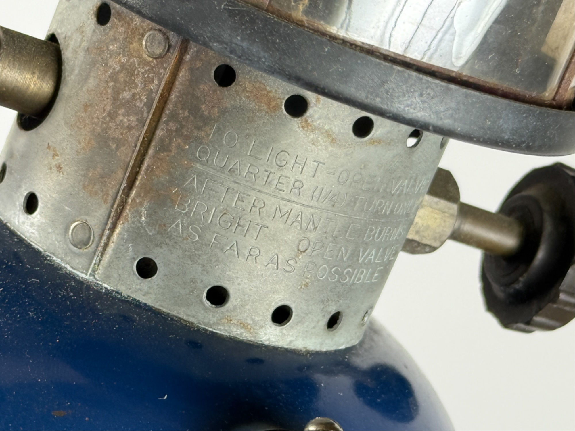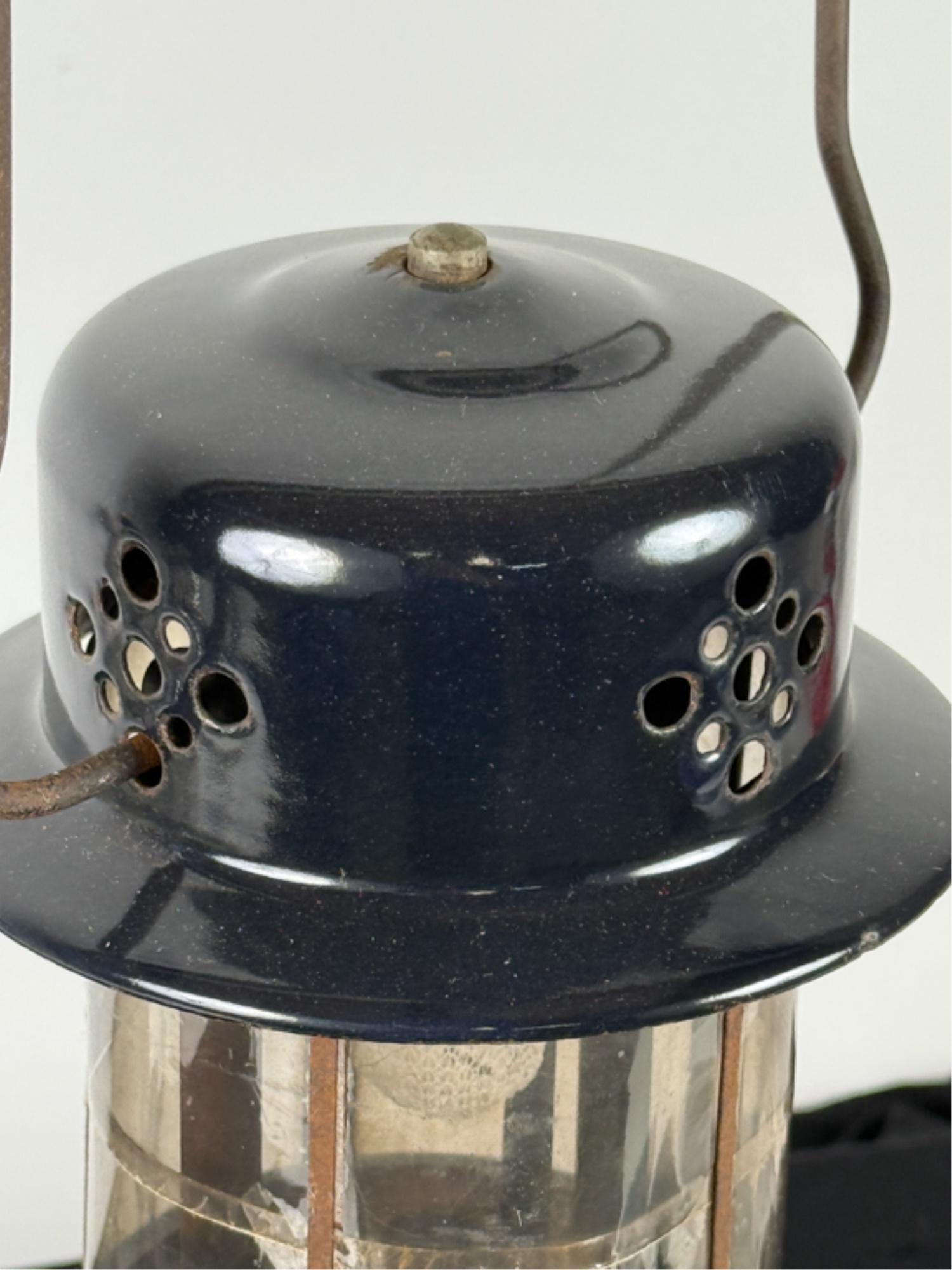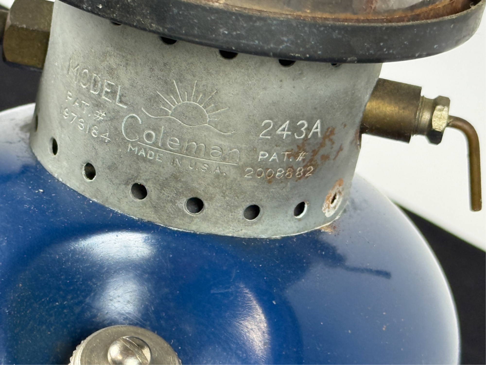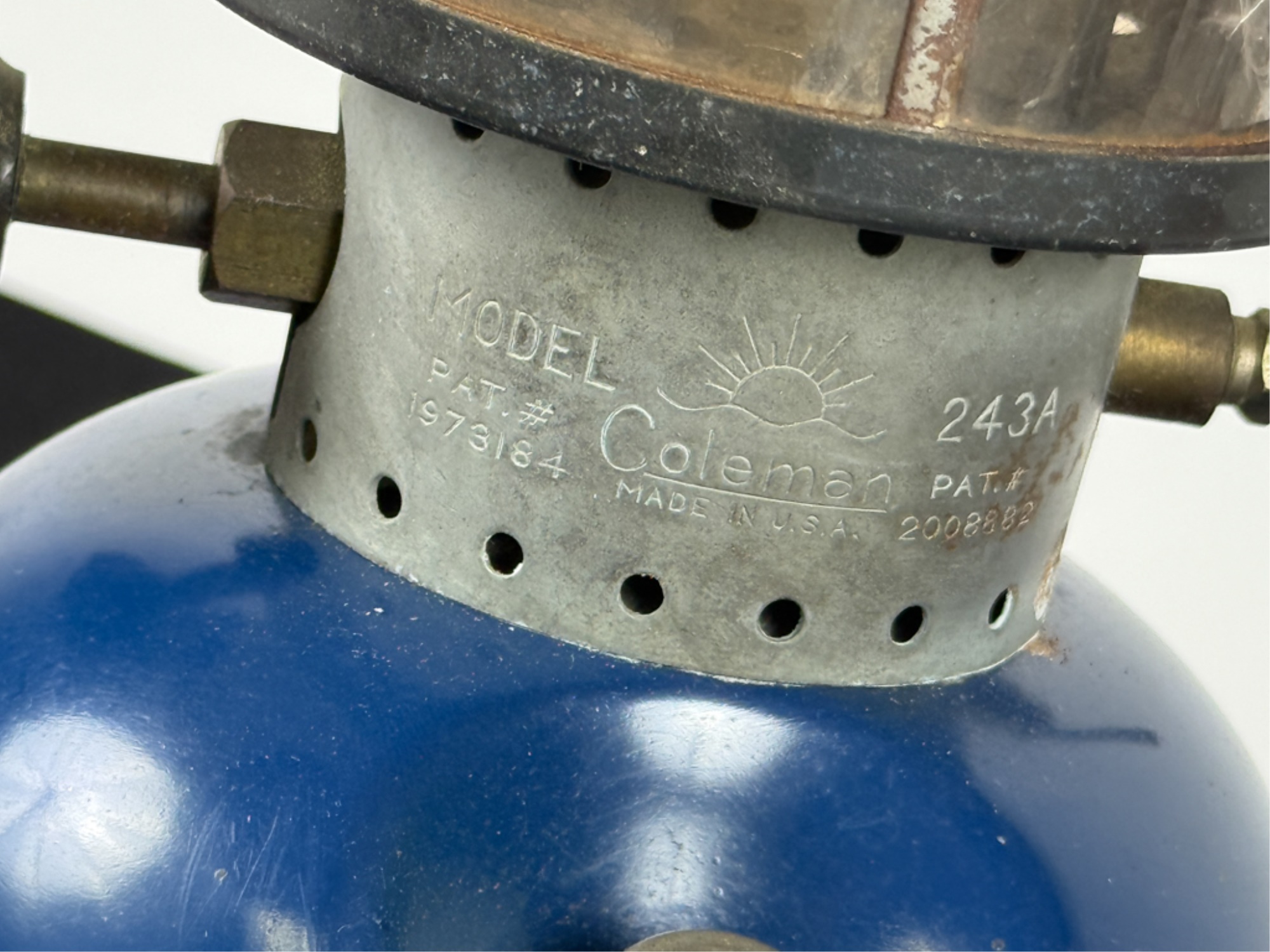 In blue enamel paint, model 243A. 19 inches including handle. Condition: Shade possibly replaced, untested. Temp No 4043