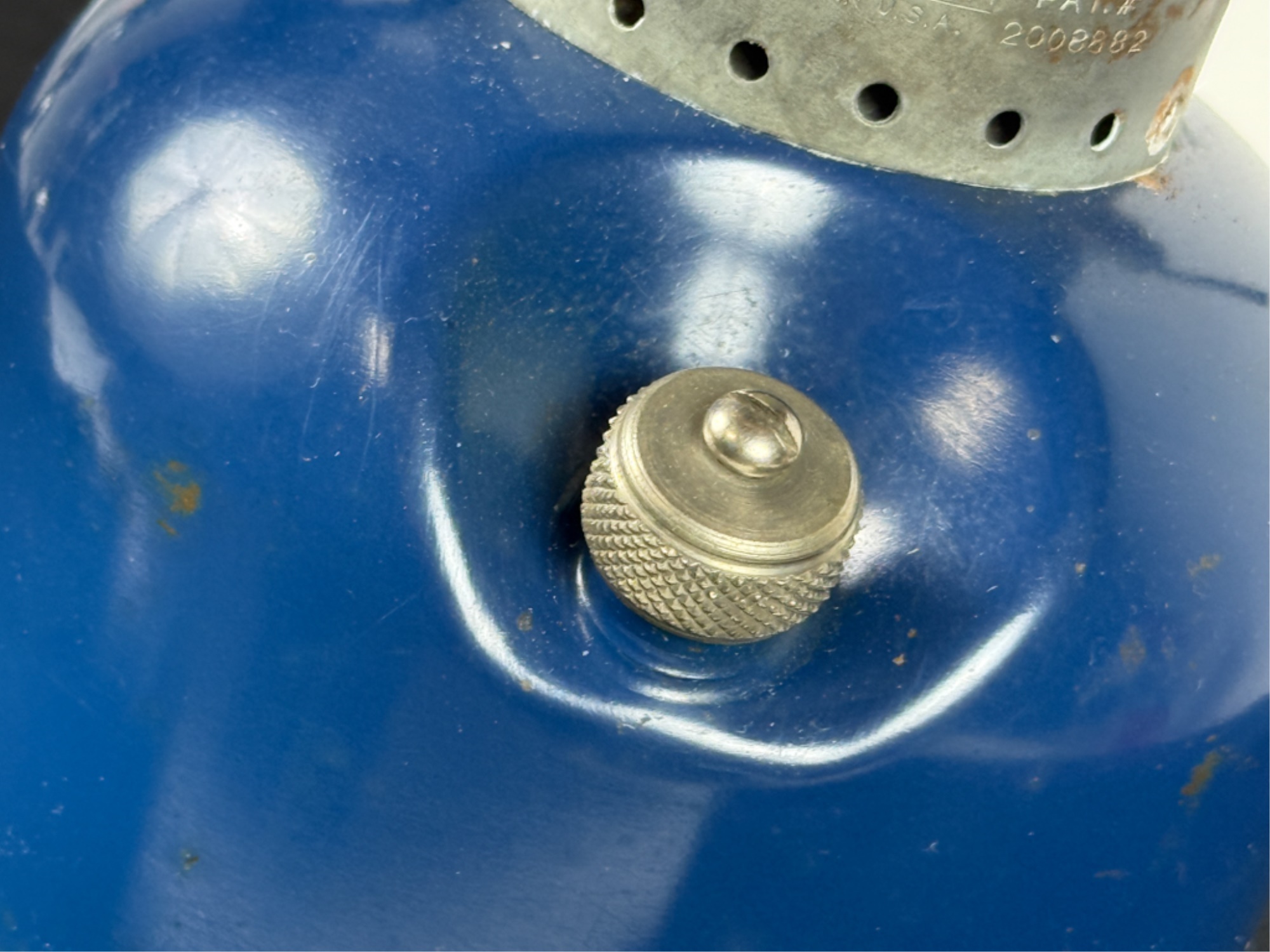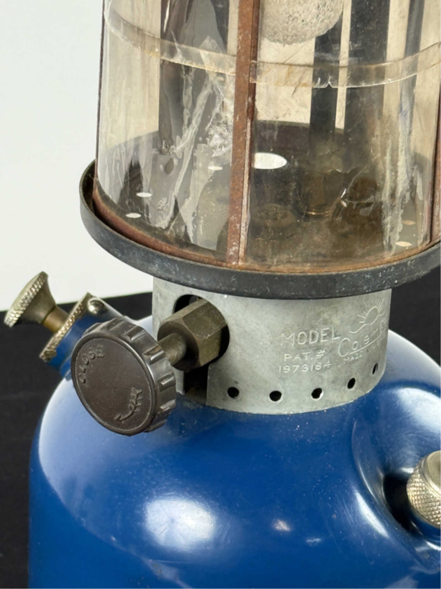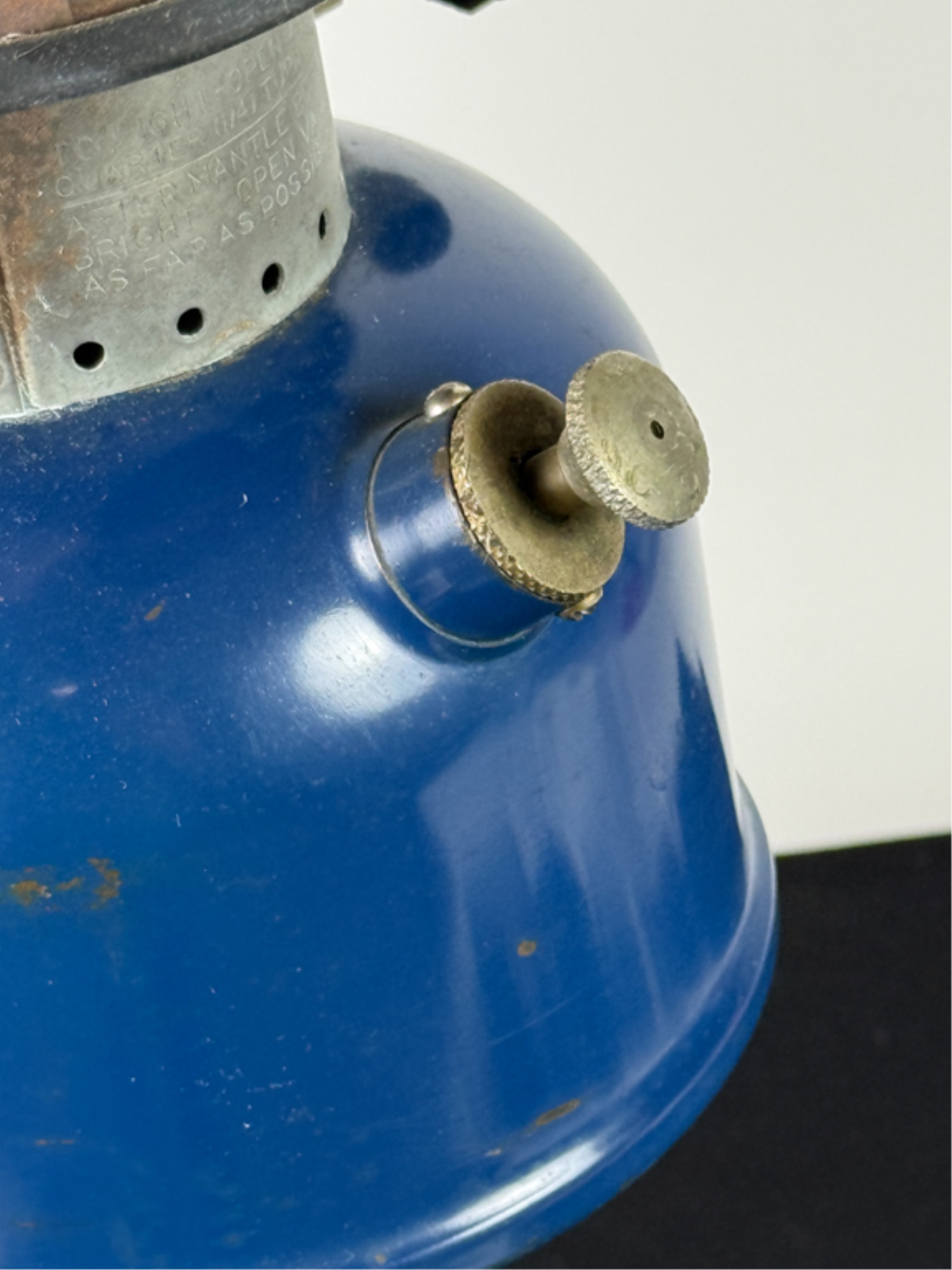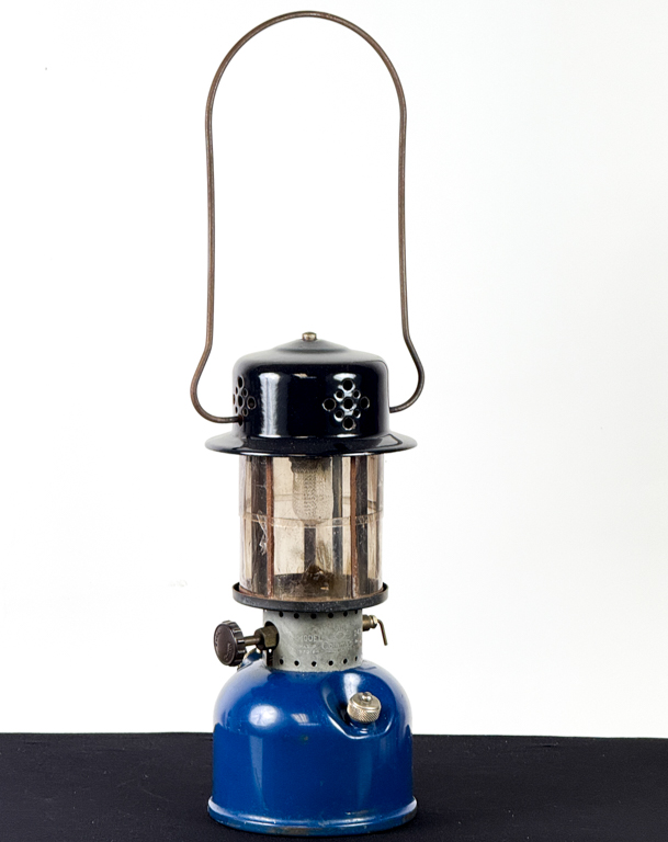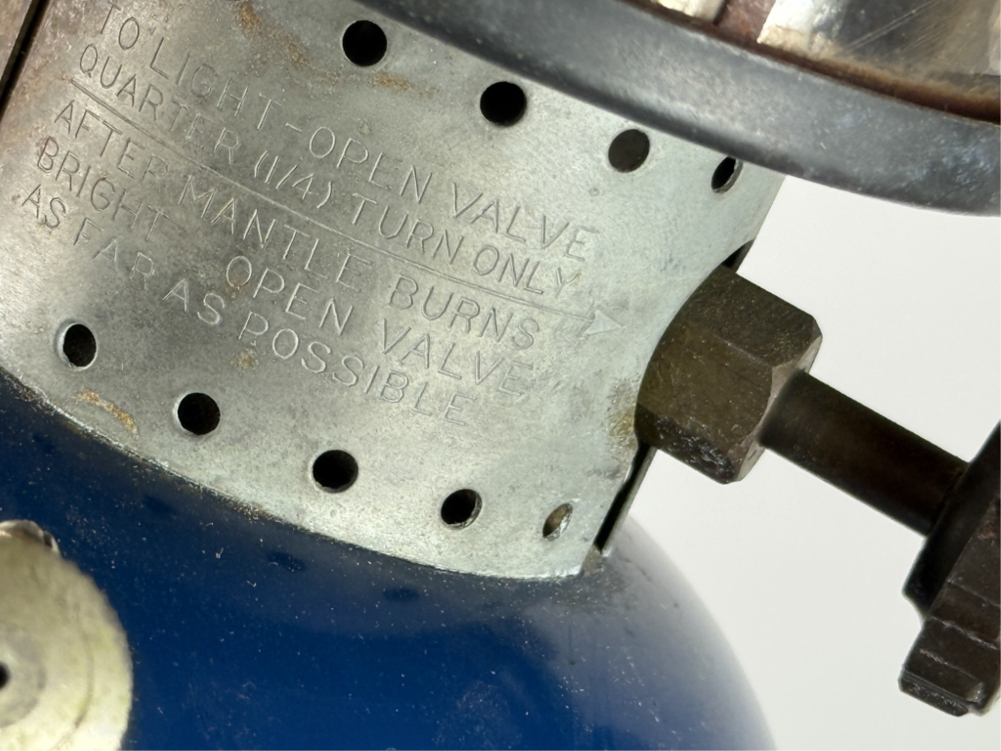In blue enamel paint, model 243A. 19 inches including handle. Condition: Shade possibly replaced, untested. Temp No 4043