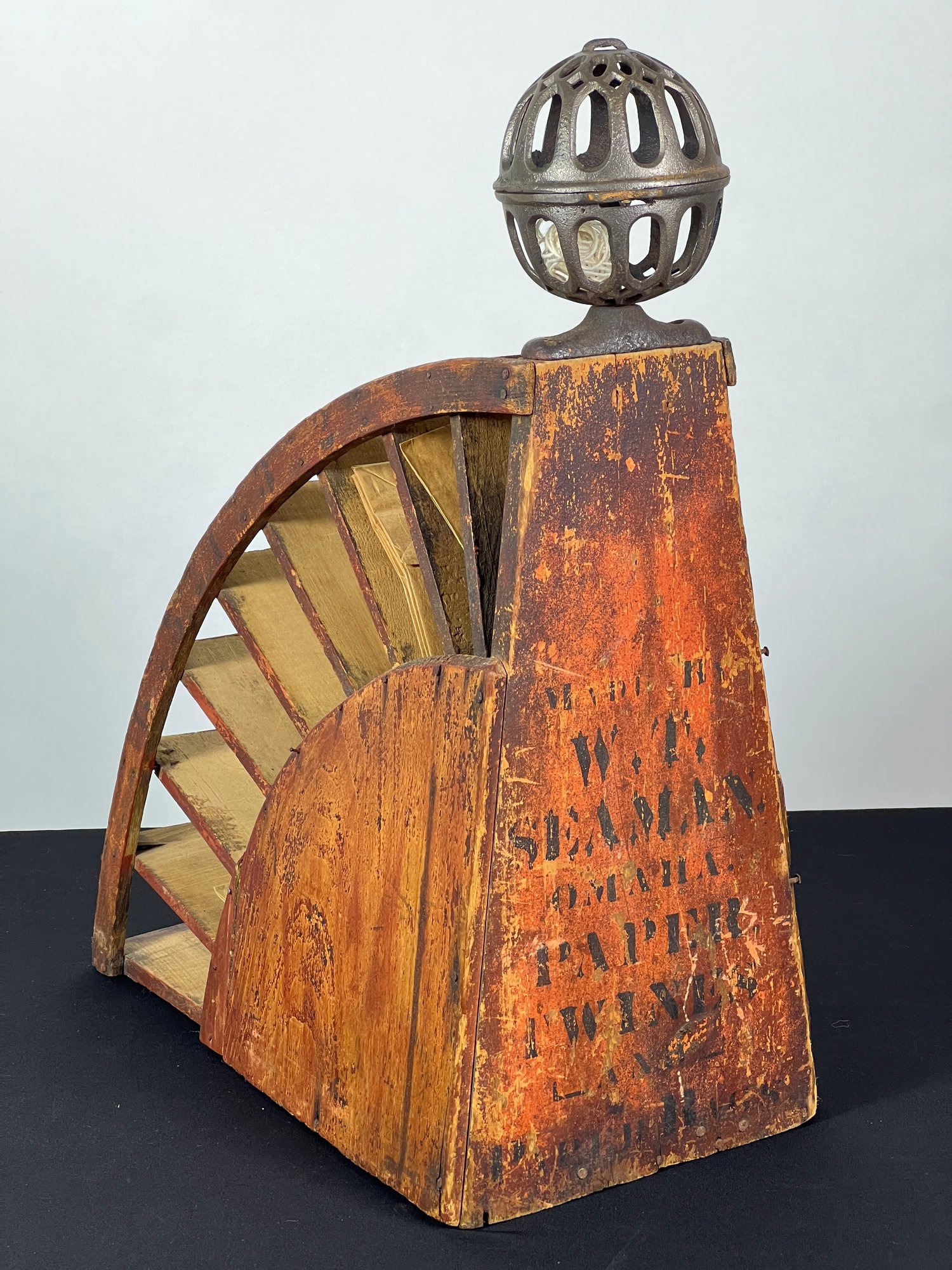 Graduated dispenser for different sized paper bags. Manufactured by W.T. Seaman of Omaha. With remnants of red paint and stenciling. 14 1/2 x 14 1/2 x 8 1/2 inches.