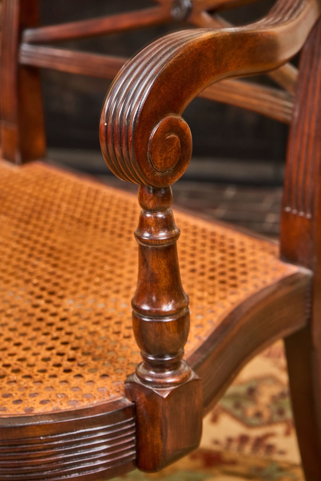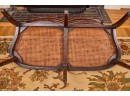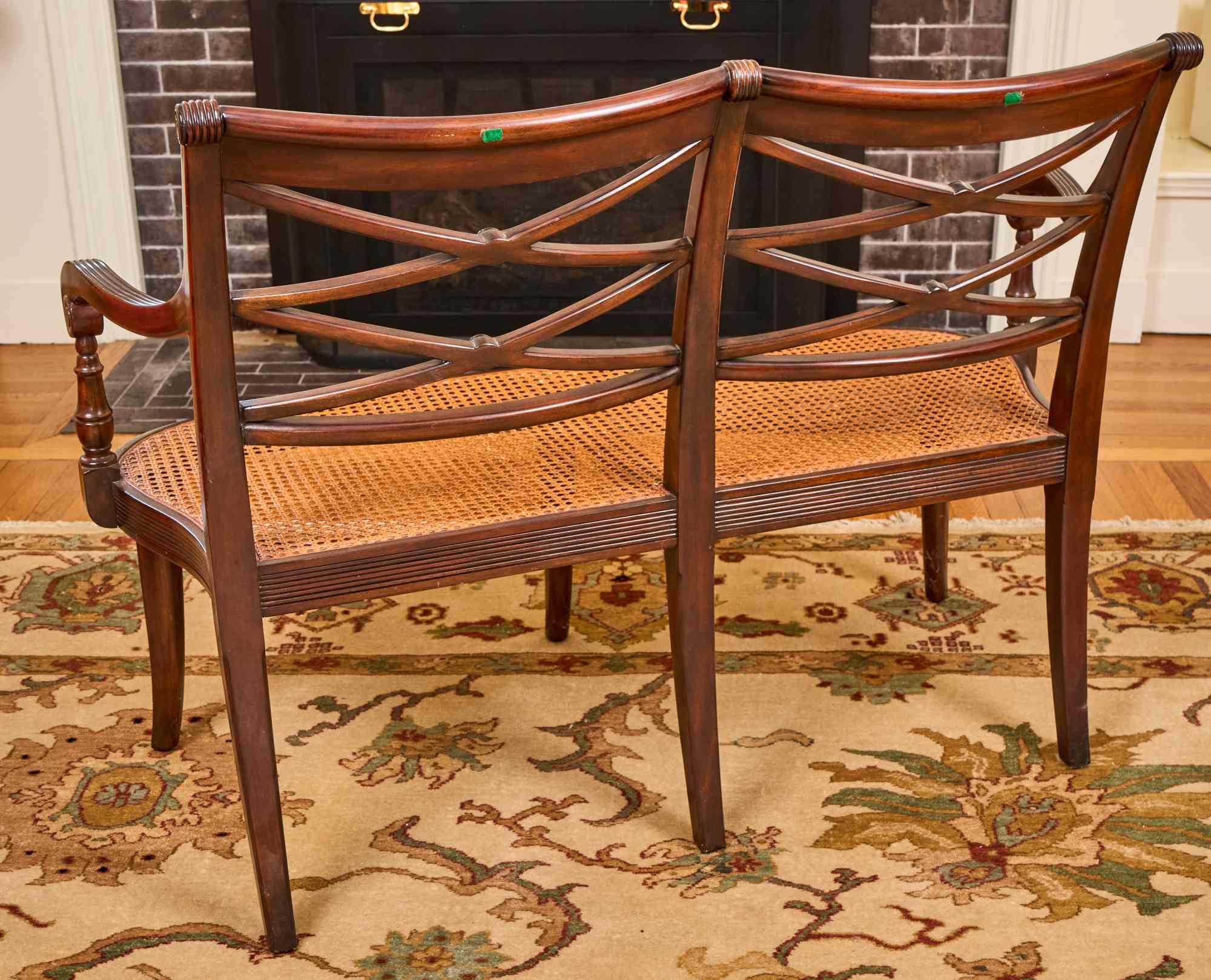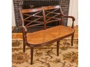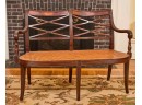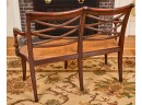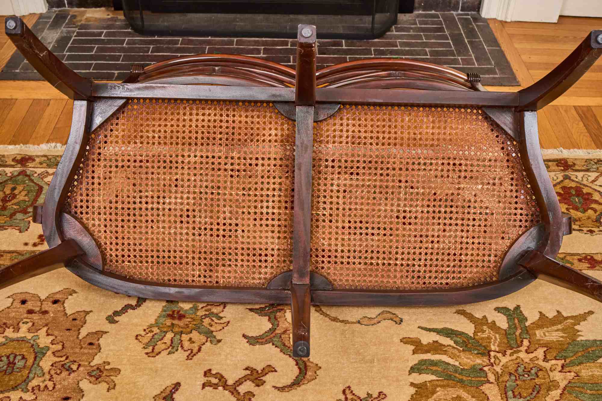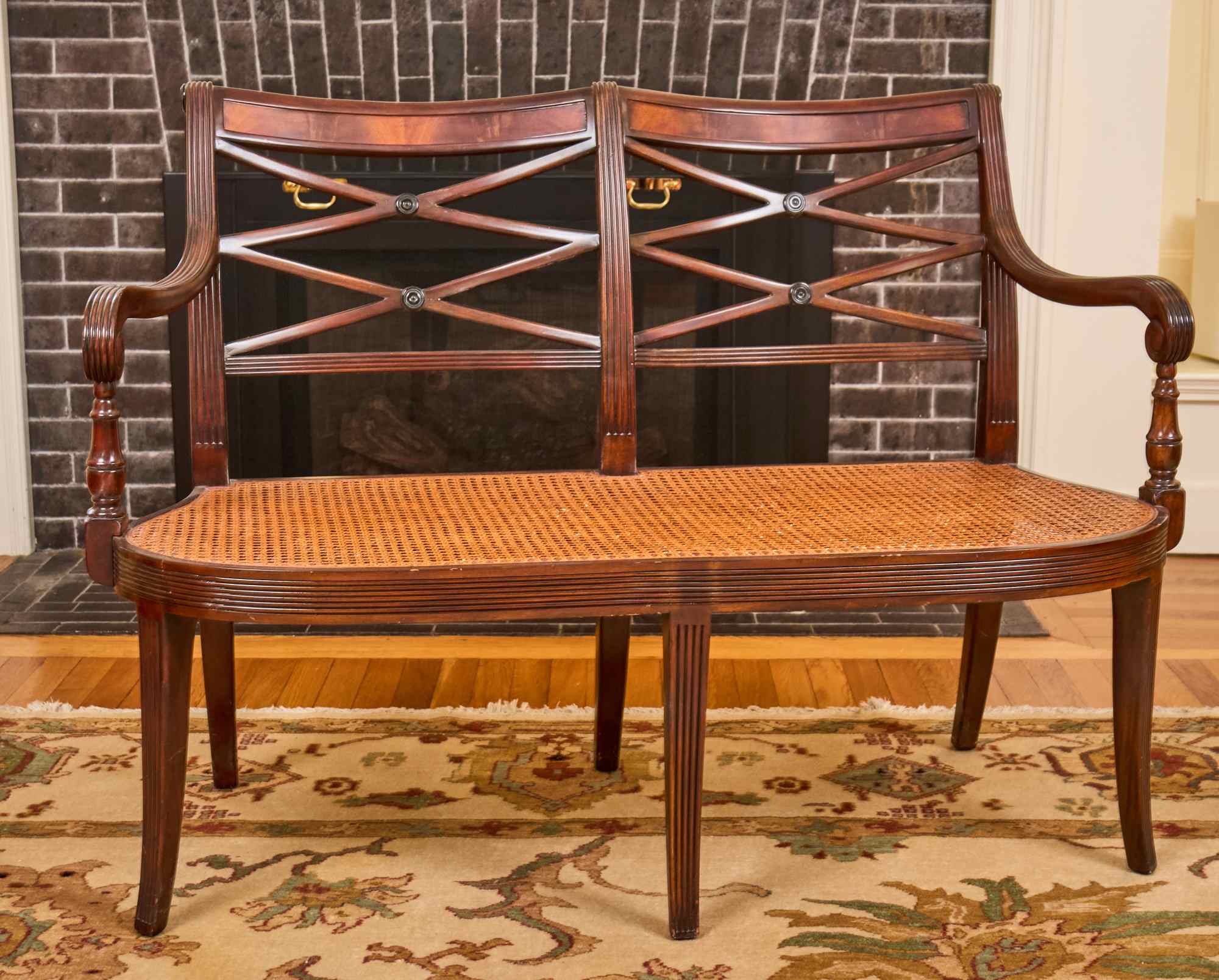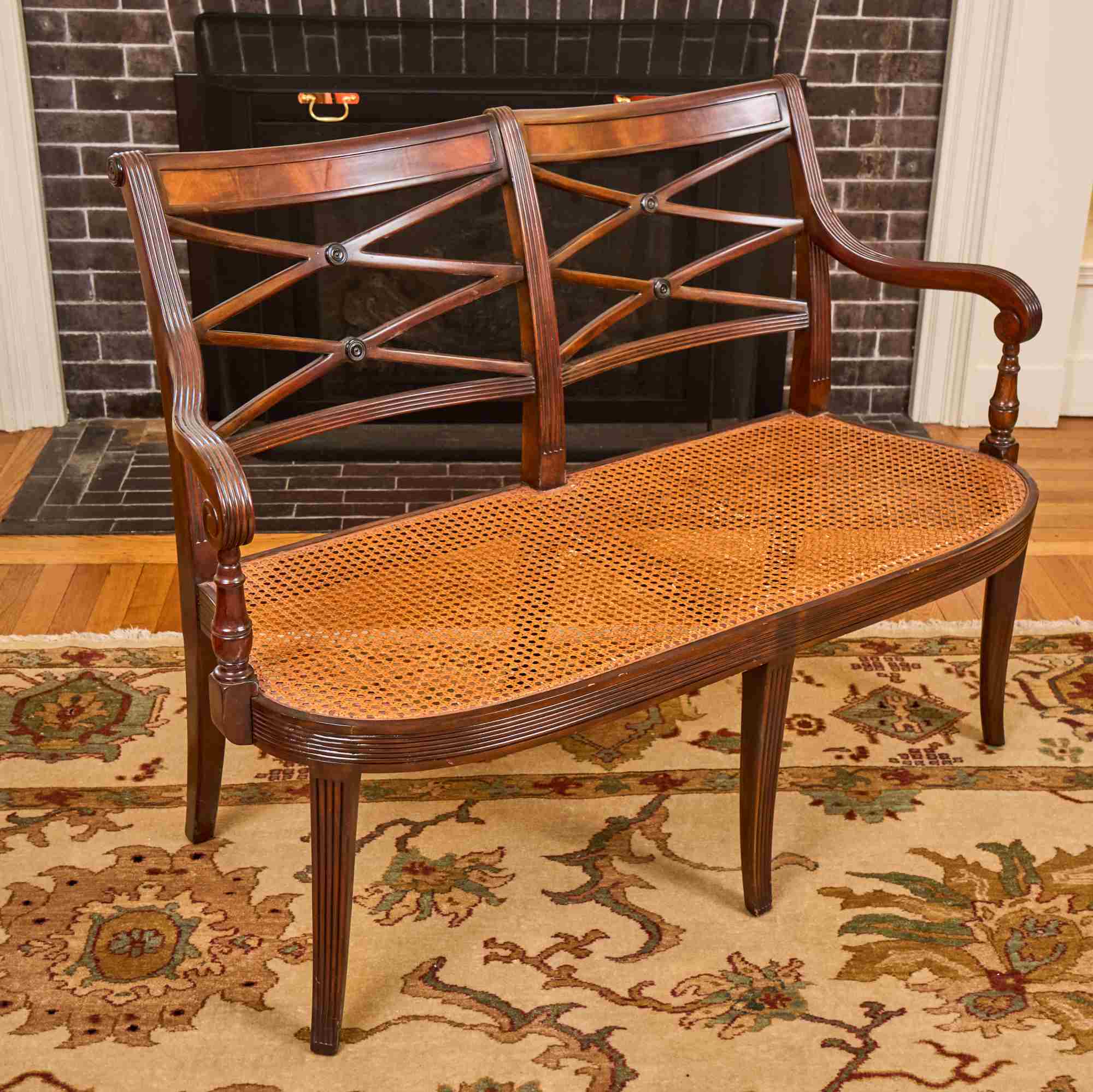 (20th / 21st c) Settee is framed in mahogany with gorgeous wood grains, scrolled arms with turned volutes, caned seat, reeded apron and (6) reeded sabre legs. Unsigned and attributed. 36 x 48 x 22 inches Condition: Good
