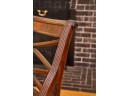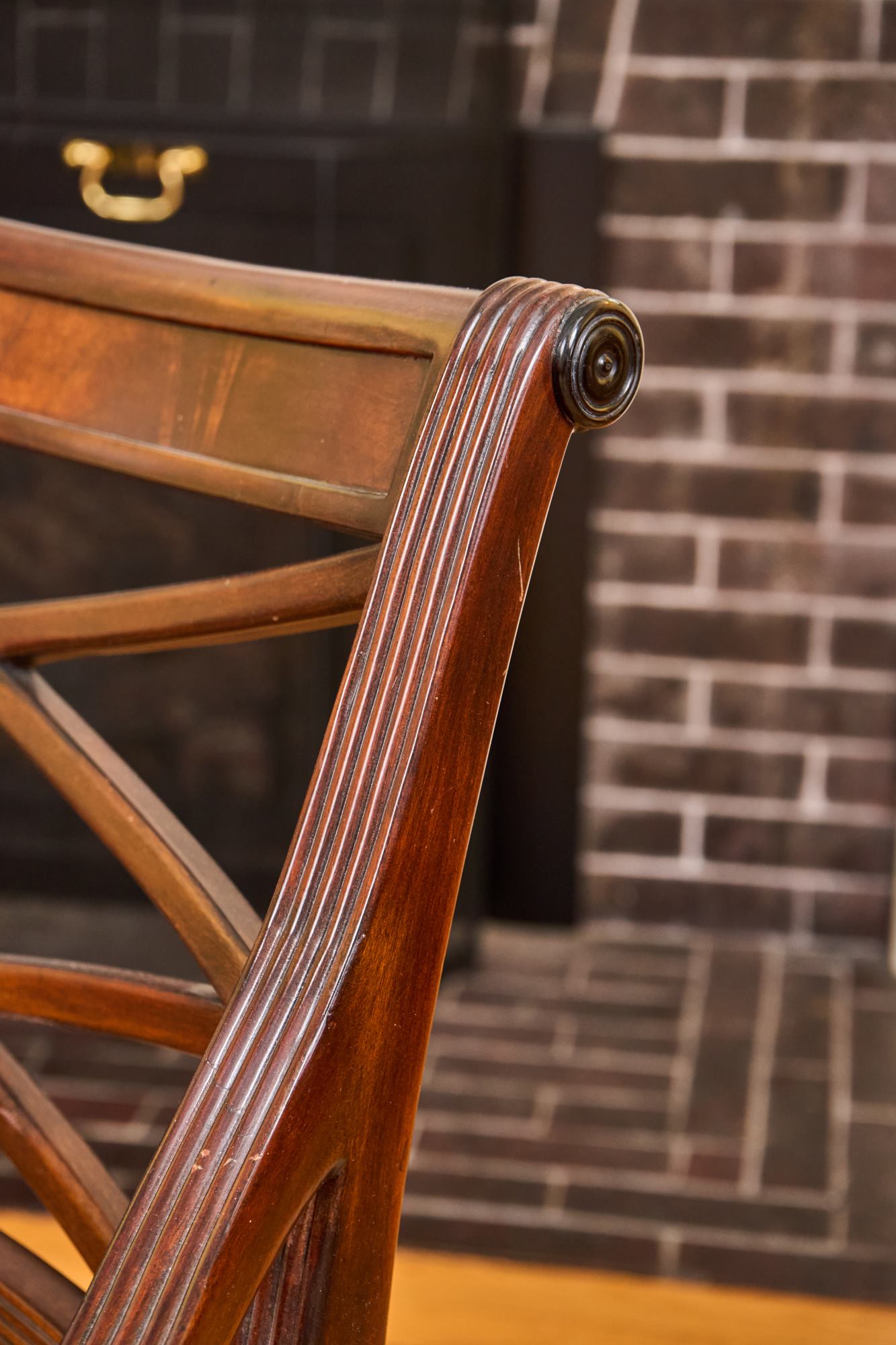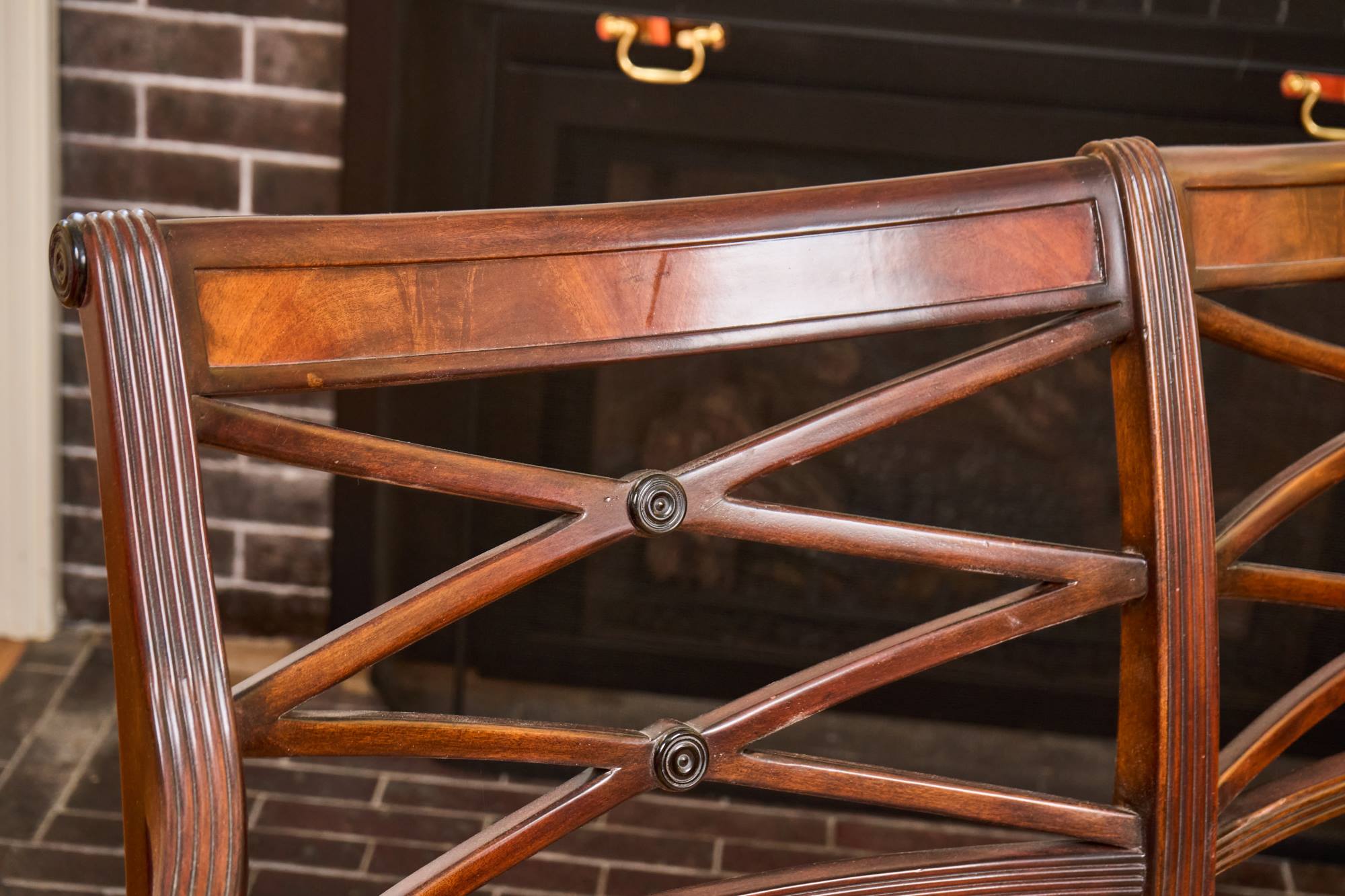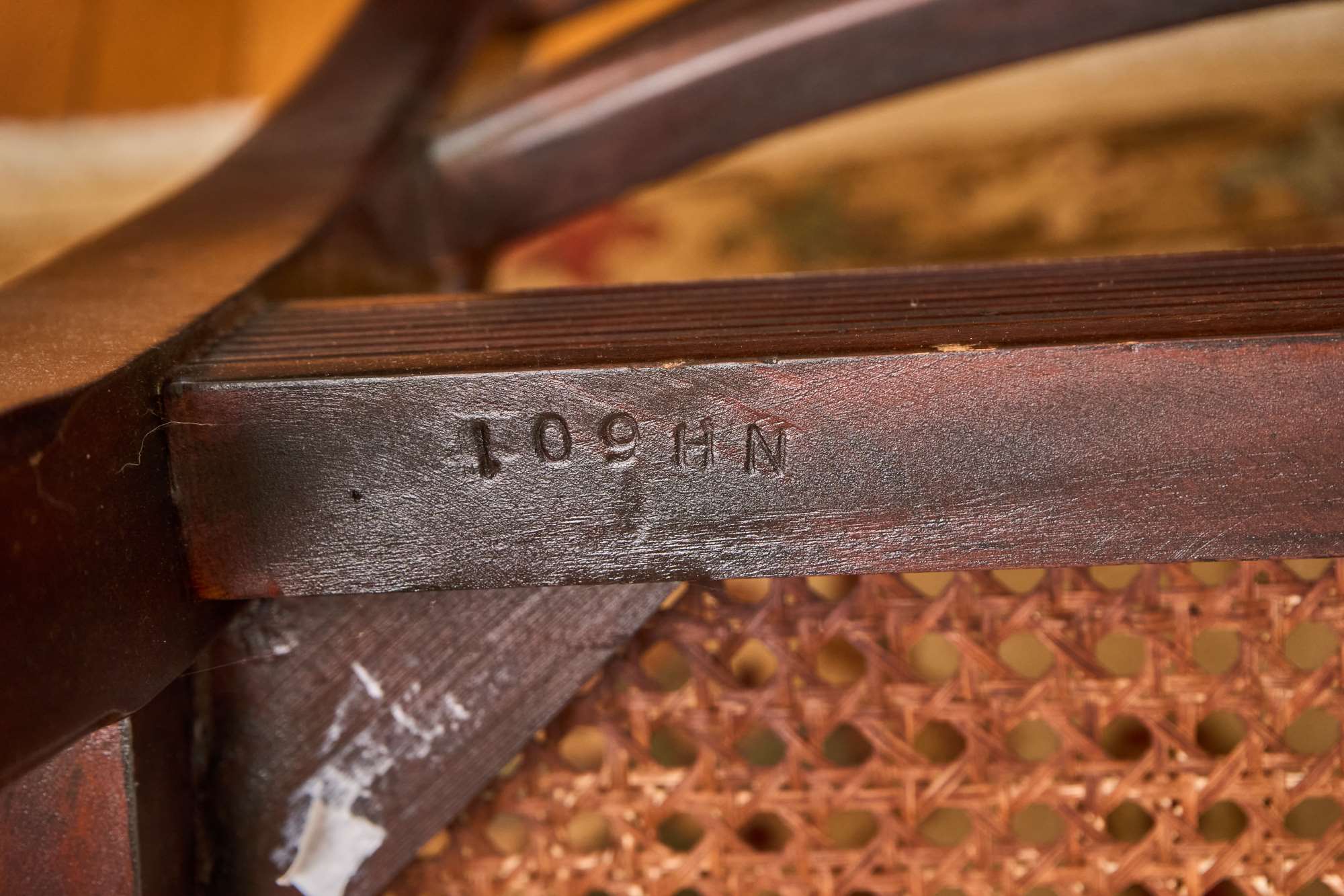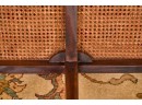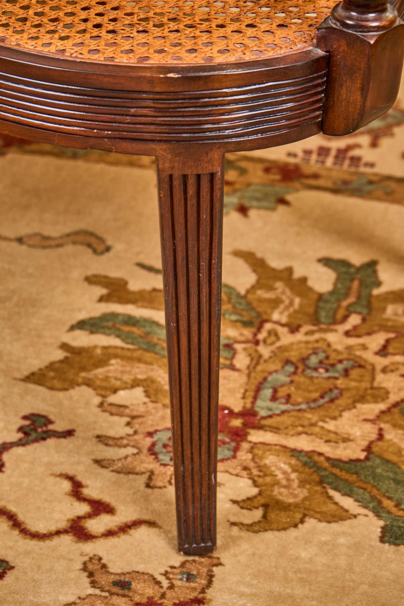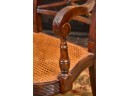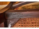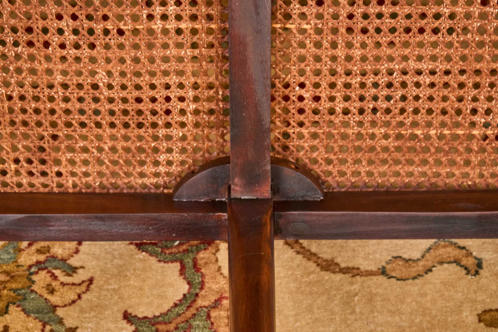 (20th / 21st c) Settee is framed in mahogany with gorgeous wood grains, scrolled arms with turned volutes, caned seat, reeded apron and (6) reeded sabre legs. Unsigned and attributed. 36 x 48 x 22 inches Condition: Good
