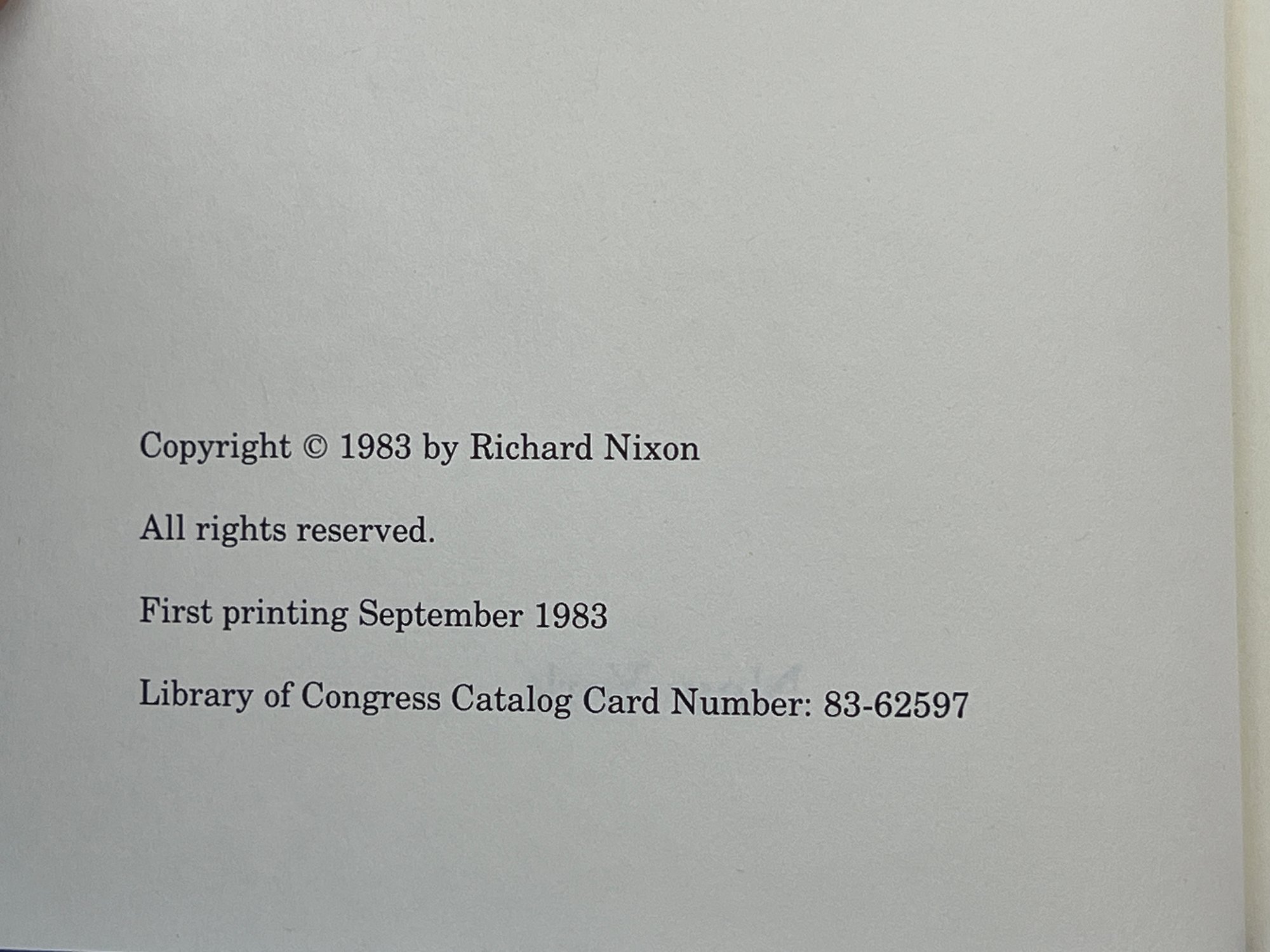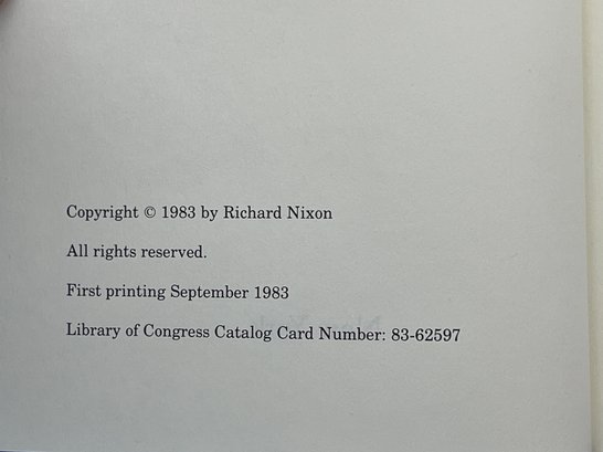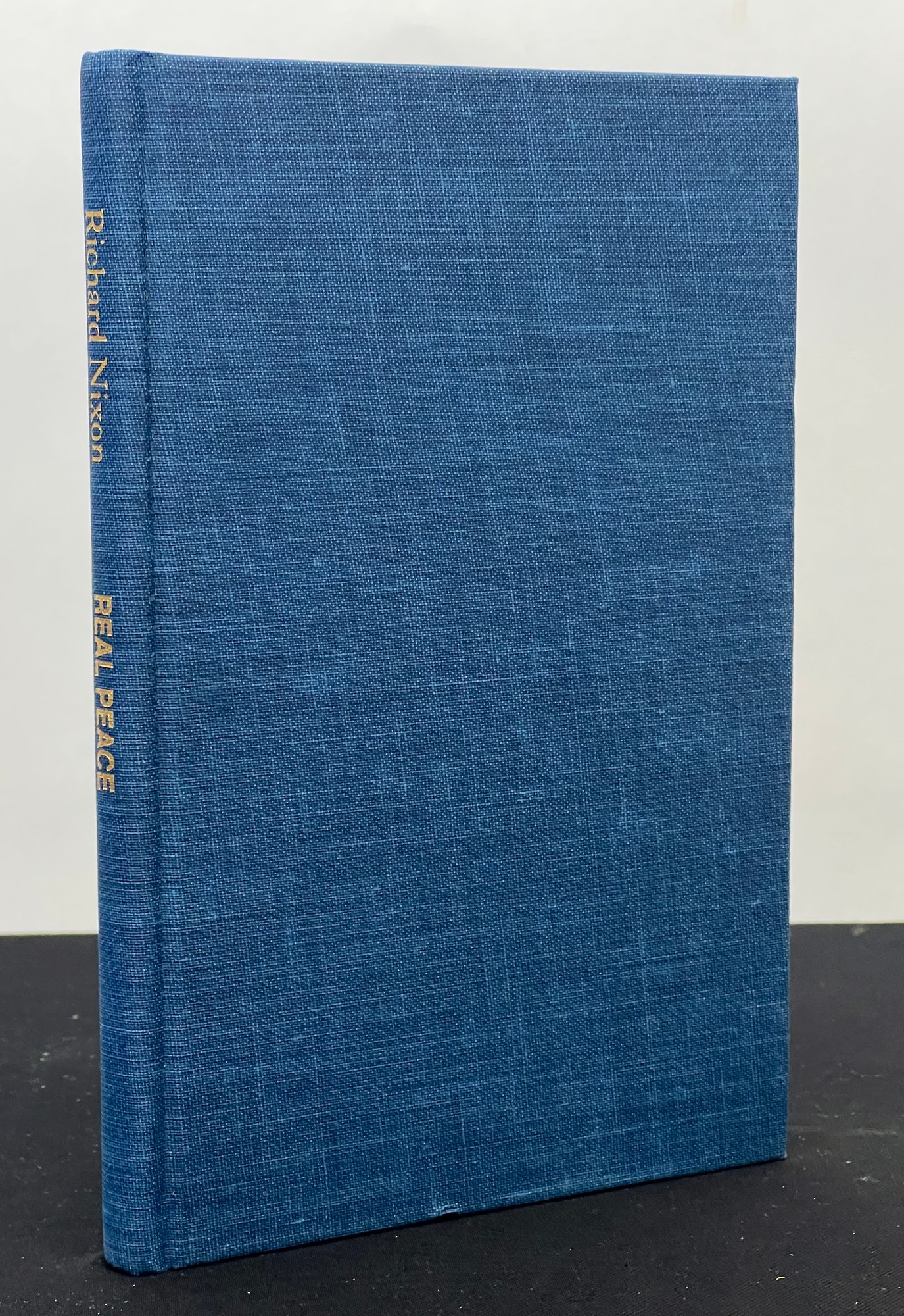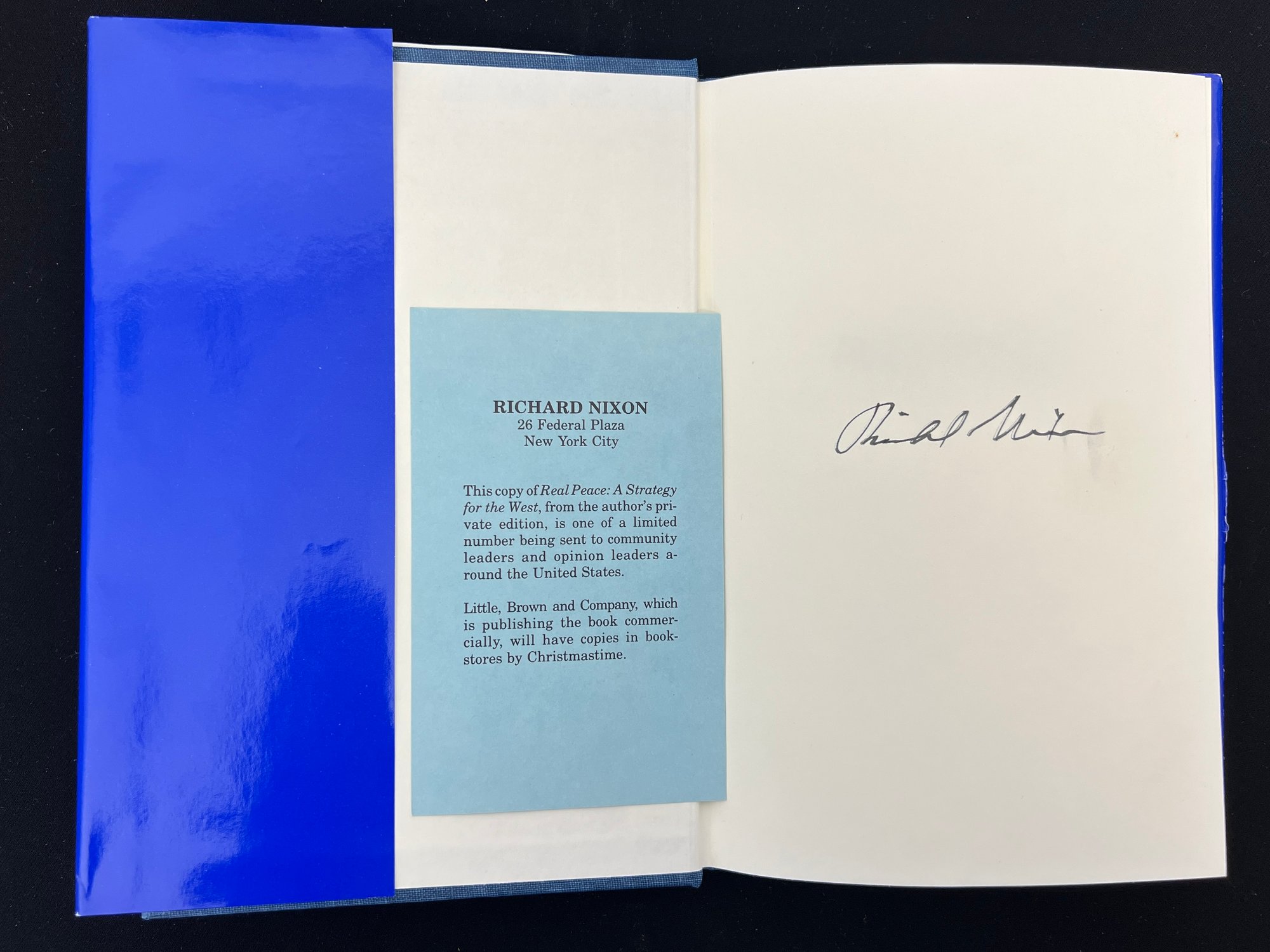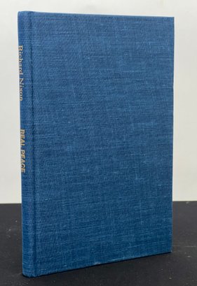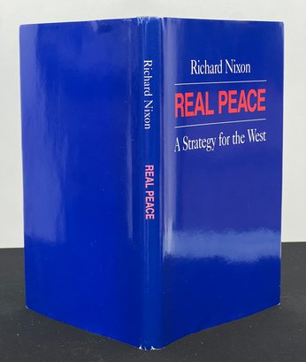 First edition hardcover copy with dust jacket of "Real Peace: A Strategy for the West" signed by Richard Nixon. Note included reads "This copy of Real Peace: A Strategy for the West, from the authors private edition, is one of a limited number being sent to community leaders..." 8 1/2 x 5 1/2 inches.