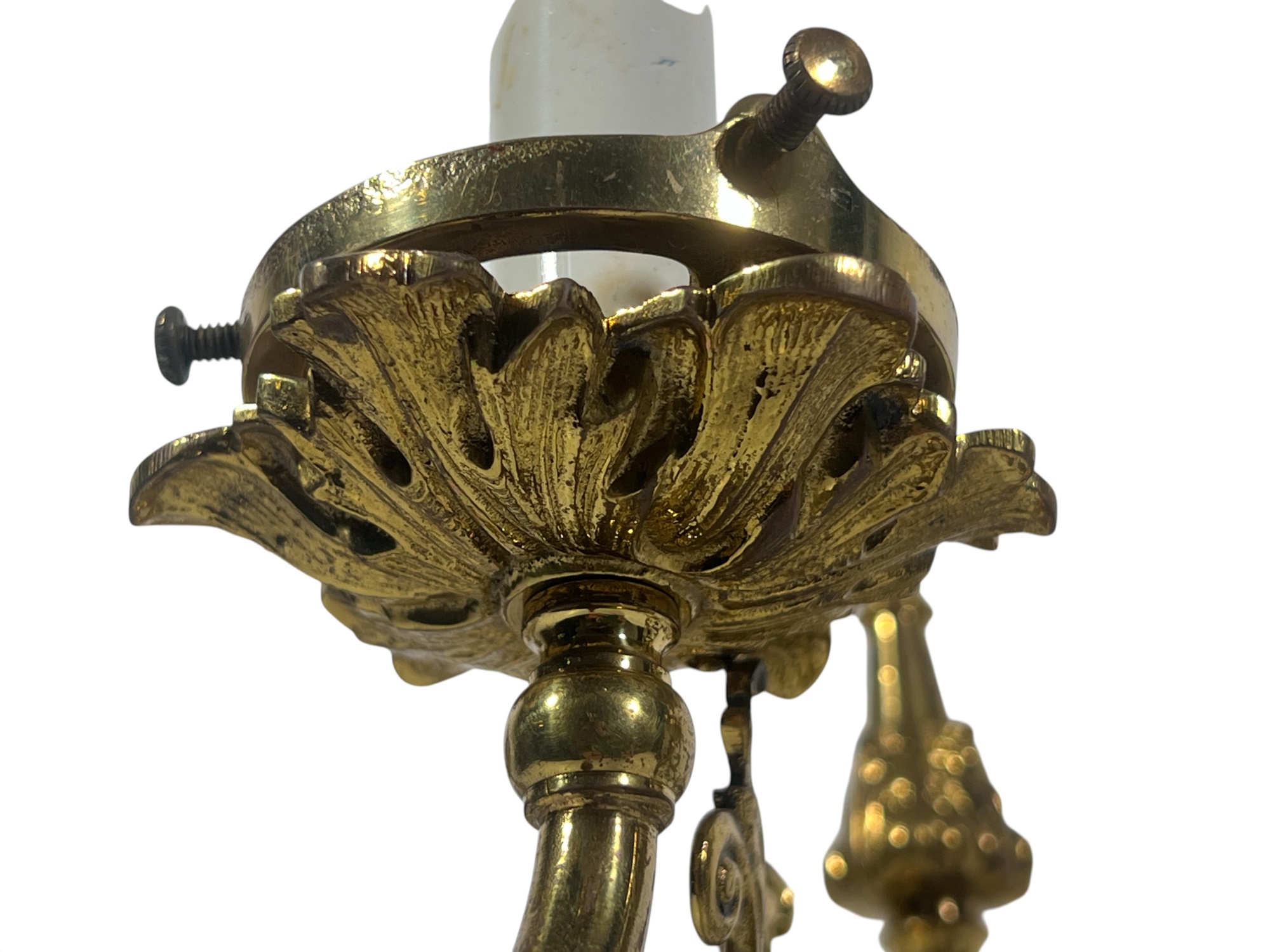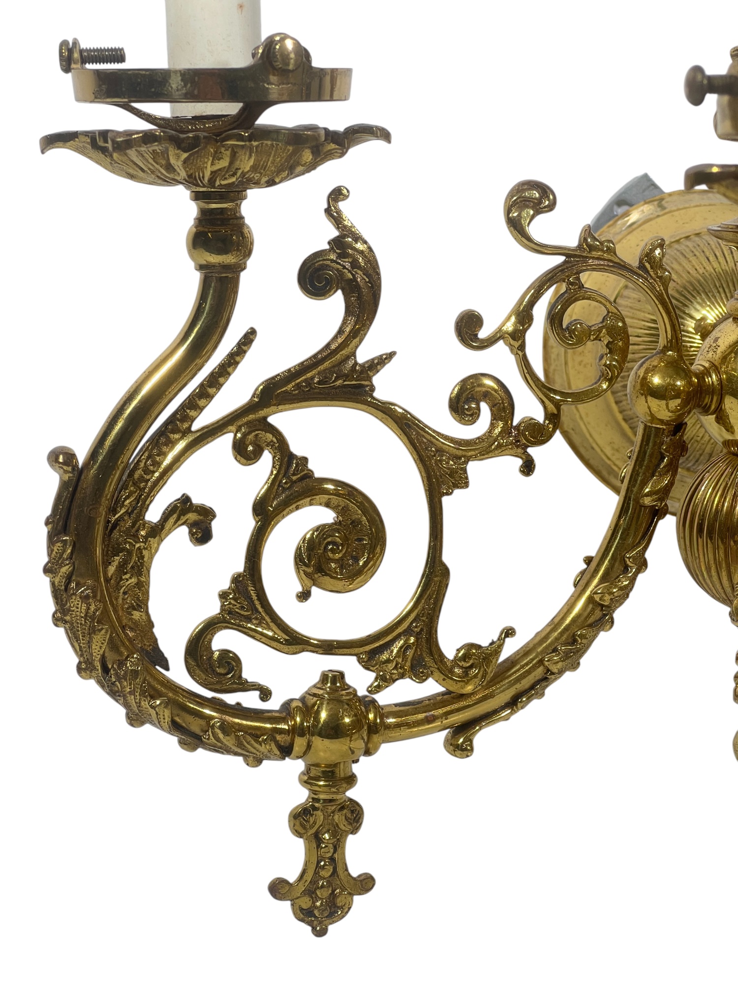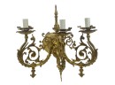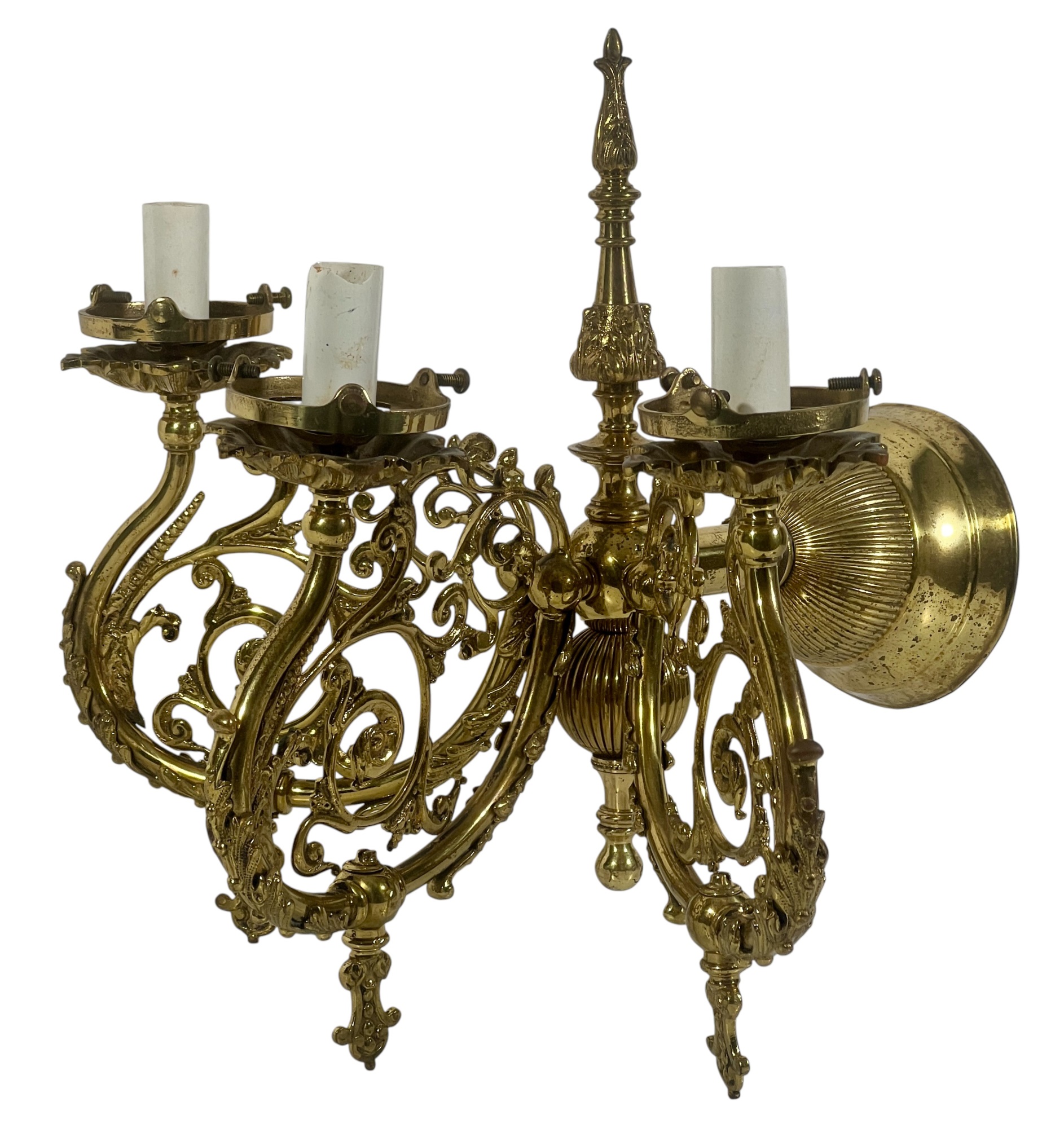 Beautiful Rococo revival (3) light brass wall sconce with scrolled motif and flame finial. 12 x 12 x 13 inches. Condition: (1) small break. Untested. Temp No 8739